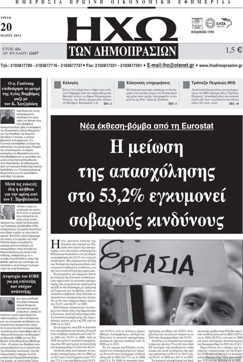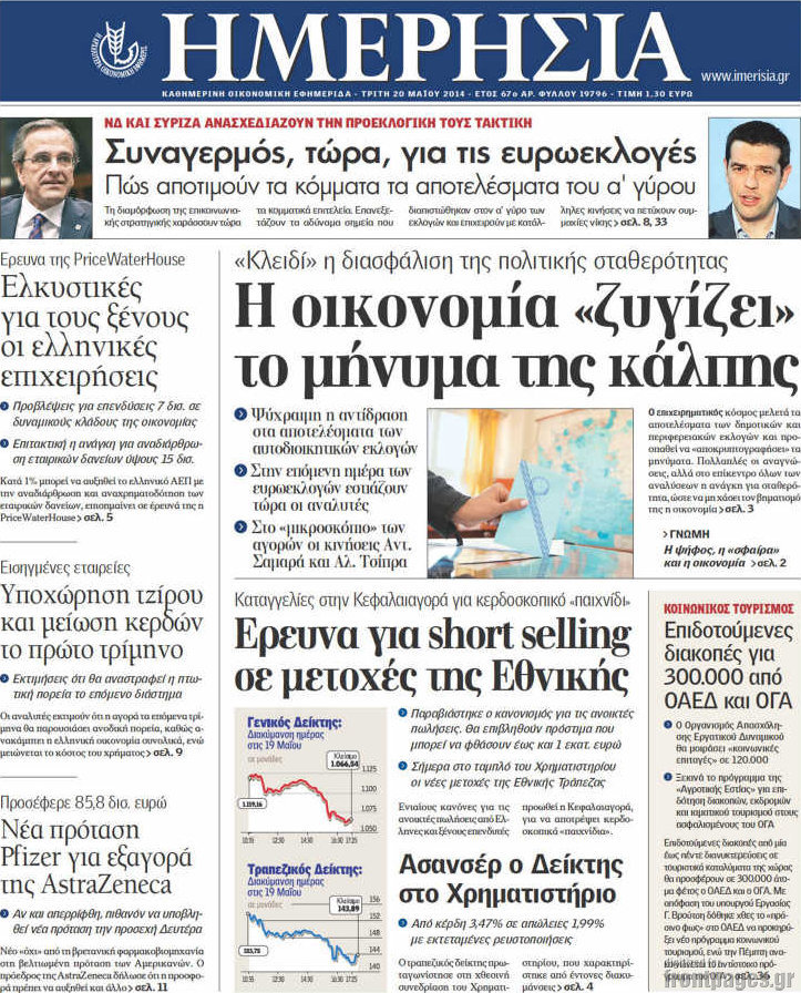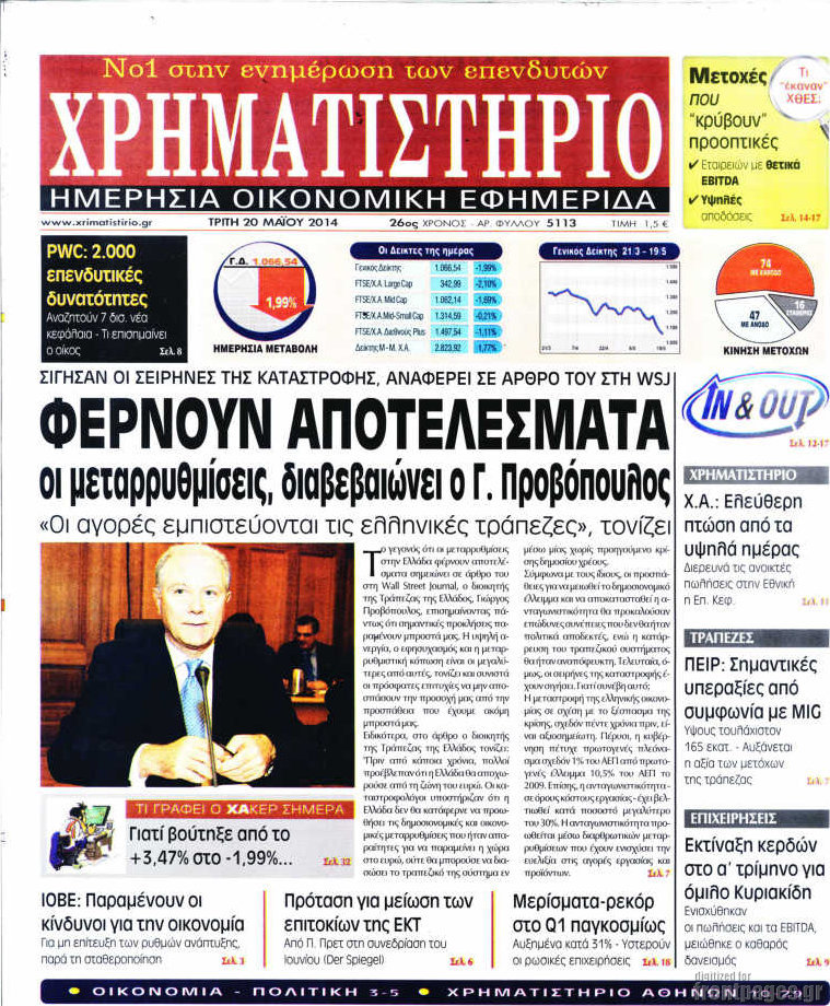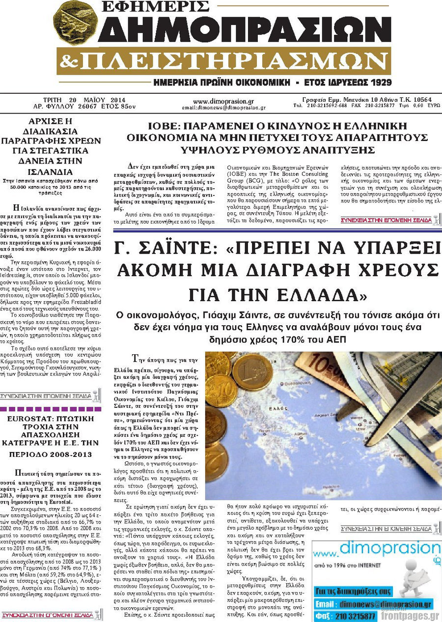 Οι oικονομικές εφημερίδες Enikos Newsroom 08:51, Τρίτη 20 Μαΐου 2014 Media Οι oικονομικές εφημερίδες Διαβάστε τα πρωτοσέλιδα των οικονομικών εφημερίδων: ΕΦΗΜΕΡΙΔΕΣ ΟΙΚΟΝΟΜΙΚΕΣ ΕΦΗΜΕΡΙΔΕΣ ΠΡΩΤΟΣΕΛΙΔΑ Μοιράσου το: σχολίασε κι εσύ (0 σχόλια) Ακολουθήστε το enikos.gr στο Google News και μάθετε πρώτοι όλες τις ειδήσεις Δείτε όλες τις τελευταίες ειδήσεις από την Ελλάδα και τον Κόσμο στο enikos.gr Ειδήσεις Ροή Ειδήσεων 38 λεπτά πριν Έρευνα MRB: Η πρόθεση ψήφου και τα σημαντικότερα προβλήματα – Οι «λέξεις» που εκφράζουν τους πολίτες 30 λεπτά πριν Αλαλούμ με τις πληρωμές στους αγρότες: Δεν καταβλήθηκε η Βασική Ενίσχυση, αλλά έγινε παρακράτηση της εισφοράς στον ΕΛΓΑ – Τι απαντά η κυβέρνηση 1 ώρα πριν Αγρότες: Πολύωροι αποκλεισμοί και σήμερα στα τελωνεία Ευζώνων, Νίκης, Προμαχώνα και Εξοχής 2 ώρες πριν Ρομπ Ράινερ: Το δείπνο με τους Ομπάμα που δεν έγινε ποτέ και νέα στοιχεία για τον «καβγά» στο πάρτι – Βίντεο με τον γιο του να περιφέρεται κοντά στο σπίτι της τραγωδίας 2 ώρες πριν Κυψέλη: Μαθητές κλείδωσαν τους καθηγητές μέσα στο Γυμνάσιο μετά την επίθεση με μαχαίρι 23 λεπτά πριν Τα 4 ζώδια που ξαναβρίσκουν τον εαυτό τους – «Μπαίνετε επιτέλους στην ουσία των πραγμάτων» 5 ώρες πριν Οπτική ψευδαίσθηση: Μόνο αν είσαι ο Σέρλοκ Χολμς θα βρεις τον σκύλο σε 15 δευτερόλεπτα 3 ώρες πριν Νεολιθικός σκύλος βρέθηκε προσεκτικά θαμμένος στον βυθό λίμνης – Δίπλα του βρέθηκε ένα στιλέτο 2 ώρες πριν Έλαβε τελεσίγραφο από τη σύντροφό του – «Μου είπε πως ή θα της κάνω πρόταση στα δύο χρόνια σχέσης ή θα με χωρίσει» 7 λεπτά πριν Καραχάλιος: «Η κυρία Καρυστιανού πρέπει να καταλάβει ότι στην πολιτική κάθε ψέμα κοστίζει» 13 λεπτά πριν Λούκας Γιώρκας: «Έχω δεχθεί παρατραβηγμένες συμπεριφορές – Άφησα τον άνθρωπο να εκτονωθεί και συνέχισα» 17 λεπτά πριν Οι Νιου Γιορκ Νικς κατέκτησαν το NBA Cup – MVP ο Τζέιλεν Μπράνσον με 25 πόντους και 8 ασίστ 23 λεπτά πριν Τα 4 ζώδια που ξαναβρίσκουν τον εαυτό τους – «Μπαίνετε επιτέλους στην ουσία των πραγμάτων» 24 λεπτά πριν «Οδύσσεια»: Νέες εντυπωσιακές φωτογραφίες από το κινηματογραφικό έπος του Κρίστοφερ Νόλαν ENIKOS NETWORK Αδενώματα Υπόφυσης: Μια πάθηση καλοήθης, αλλά όχι αθώα Χρόνια Αναπνευστικά Νοσήματα: 400.000 θάνατοι ετησίως στην Ευρώπη Ειδικό επιδοτούμενο πρόγραμμα κατάρτισης της ΔΥΠΑ για ανέργους: Αρχίζει σήμερα η υποβολή ενστάσεων-Ποιους αφορά Δώρο Χριστουγέννων και επιδόματα της ΔΥΠΑ: Σήμερα αρχίζει η προπληρωμή τους-Ποιους αφορά Σύγχρονος Νοστράδαμος: Προειδοποιεί για «μεγάλο γεγονός» τους επόμενους μήνες που θα συγκλονίσει τη Βρετανία και τον κόσμο Τεστ παρατηρητικότητας: Μπορείτε να βρείτε τις 3 διαφορές στις εικόνες με έναν πιγκουίνο σε 14 δευτερόλεπτα περισσότερα 09:08 , Τετάρτη 17 Δεκεμβρίου 2025 Τηλεθέαση (16/12): Ανακατατάξεις στην πρωινή ψυχαγωγική ζώνη Ξεκάθαρη πρωτιά στην τηλεθέαση για την «Super Κατερίνα» στο δυναμικό κοινό με ποσοστό 18,5%, α... 08:00 , Τετάρτη 17 Δεκεμβρίου 2025 Την Κυριακή με τη Realnews: Δωροεπιταγή 10€ Δωροεπιταγή αξίας 10€ για αγορές άνω των 60€ από τα πολυκαταστήματα FactoryOutlet H προσφορά ι... 07:00 , Τετάρτη 17 Δεκεμβρίου 2025 Την Κυριακή με τη Realnews: Ό,τι και αν αγοράσεις, σκανάρεις και κερδίζεις! Την Κυριακή με τη Realnews: Ό,τι και αν αγοράσεις, σκανάρεις και κερδίζεις! Με το PADU app, το... 05:48 , Τετάρτη 17 Δεκεμβρίου 2025 Οι οικονομικές εφημερίδες 17/12/2025 Διαβάστε τα πρωτοσέλιδα από τις οικονομικές εφημερίδες, σήμερα 17/12/2025. ΤΕΛΕΥΤΑΙΕΣ ΕΙΔΗΣΕΙΣ 7 λεπτά πριν Καραχάλιος: «Η κυρία Καρυστια