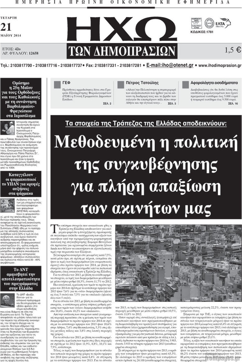 Οι oικονομικές εφημερίδες Enikos Newsroom 08:49, Τετάρτη 21 Μαΐου 2014 Media Οι oικονομικές εφημερίδες Διαβάστε τα πρωτοσέλιδα των οικονομικών εφημερίδων: ΟΙΚΟΝΟΜΙΚΕΣ ΕΦΗΜΕΡΙΔΕΣ ΠΡΩΤΟΣΕΛΙΔΑ Μοιράσου το: σχολίασε κι εσύ (0 σχόλια) Ακολουθήστε το enikos.gr στο Google News και μάθετε πρώτοι όλες τις ειδήσεις Δείτε όλες τις τελευταίες ειδήσεις από την Ελλάδα και τον Κόσμο στο enikos.gr Ειδήσεις Ροή Ειδήσεων 1 ώρα πριν Έκρηξη σε υποκατάστημα τράπεζας στη Θεσσαλονίκη: Ερευνάται ο ακριβής στόχος της επίθεσης και αναζητείται βιντεοληπτικό υλικό – Τι αναφέρουν οι κάτοικοι 1 ώρα πριν Γιορτές στα μπλόκα κάνουν οι αγρότες – Με εκτροπές αλλά χωρίς ιδιαίτερα προβλήματα διεξάγεται η κυκλοφορία ανήμερα των Χριστουγέννων 4 ώρες πριν Σαρωτικοί έλεγχοι αλκοτέστ στο κέντρο της Αθήνας – Μόλις 8 θετικά αποτελέσματα σε 2.000 οδηγούς 4 ώρες πριν Τα 10 γεγονότα που «σφράγισαν» το 2025 5 ώρες πριν Αποσύρονται τα Ticonderoga: Οι ΗΠΑ σχεδιάζουν θωρηκτά – Τα πρώτα μετά τον Β’ Παγκόσμιο Πόλεμο – ΦΩΤΟ 3 ώρες πριν Τα 3 ζώδια που θα νιώσουν ξανά ευτυχισμένα ύστερα από καιρό – «Οι μάχες τελειώνουν και όλα γίνονται πιο εύκολα» 4 ώρες πριν Γυναίκα αρνείται να πάρει άδεια από τη δουλειά της για να πάει στο οικογενειακό τραπέζι – «Τώρα όλοι με κατηγορούν και με λένε εγωίστρια» 2 ώρες πριν Νιώθετε περισσότερη μοναξιά τα Χριστούγεννα; Η ψυχολογία αποκαλύπτει τα 7 χαρακτηριστικά που μάλλον διαθέτετε 42 λεπτά πριν Γυναίκα που διαγνώστηκε με καρκίνο του παχέος εντέρου προειδοποιεί: «Αυτή είναι η πιο ύπουλη πτυχή της νόσου» 6 λεπτά πριν Φρικτός θάνατος για 2χρονη: Έπεσε σε ποτάμι και την κατασπάραξαν πιράνχας 15 λεπτά πριν Αγροτικές κινητοποιήσεις – Άρση προσωρινών κυκλοφοριακών ρυθμίσεων στην Ημαθία 21 λεπτά πριν Jingle Bells από τη… Μογγολία: Χαμός στο διαδίκτυο με τα κάλαντα σε ρυθμό τέκνο – Βίντεο 30 λεπτά πριν Θεσσαλονίκη: 5 συλλήψεις για οδήγηση υπό την επήρεια αλκοόλ το τελευταίο 24ωρο – Ένας εξ’ αυτών ενεπλάκη σε τροχαίο με σοβαρό τραυματισμό πεζής 37 λεπτά πριν Αττική: 3 ληστείες κατά ανηλίκων που είχαν βγει να πουν τα κάλαντα – Τους απείλησαν με μαχαίρι και τους χτύπησαν, αναζητούνται οι δράστες ENIKOS NETWORK Χριστούγεννα: Ψυχολόγος εξηγεί πώς οι γιορτές λειτουργούν συχνά ως «μεγεθυντικός φακός» του ψυχισμού Έχετε χοληστερίνη; Η καλύτερη ώρα να φάτε πρωινό, σύμφωνα με ειδικούς Χριστούγεννα 2025: Τι ισχύει για σήμερα και αύριο για καταστήματα και σούπερ μάρκετ Συνολικά 290 μόνιμες προσλήψεις στην ΟΣΥ: Έως τις 31 Δεκεμβρίου 2025 οι αιτήσεις – Ποιες ειδικότητες αφορά Ο Google Assistant θα παραμείνει λίγο περισσότερο για ορισμένους χρήστες Android Τεστ προσωπικότητας: Το βάζο που θα επιλέξετε αποκαλύπτει πώς λύνετε προβλήματα στη ζωή σας περισσότερα 11:58 , Πέμπτη 25 Δεκεμβρίου 2025 Ρεκόρ Γκίνες: Το White Christmas το πιο επιτυχημένο single όλων των εποχών σε φυσική μορφή – Βίντεο Το «White Christmas» είναι το πιο επιτυχημένο single όλων των εποχών σε φυσική μορφή, με περίπ... 10:11 , Πέμπτη 25 Δεκεμβρίου 2025 Αυτή την Κυριακή με τη Realnews: Το μυστήριο των Χριστουγέννων – Οι γιορτές στη Νέα Υόρκη παίρνουν μια αναπάντεχη τροπή, σε ένα συγκλονιστικό θρίλερ από τη συγγραφέα Vicki Delany Αυτή την Κυριακή με τη Realnews: Το μυστήριο των Χριστουγέννων – Οι γιορτές στη Νέα Υόρκ... 07:05 , Πέμπτη 25 Δεκεμβρίου 2025 Την Κυριακή με τη Realnews: Δωροεπιταγή 10€ Την Κυριακή με τη Realnews: Δωροεπιταγή 10€ Δωροεπιταγή αξίας 10€ για αγορές άνω των 60€ από τ... 20:30 , Τετάρτη 24 Δεκεμβρίου 2025 Rouk Zouk: Όλα θα δούμε στο εορ