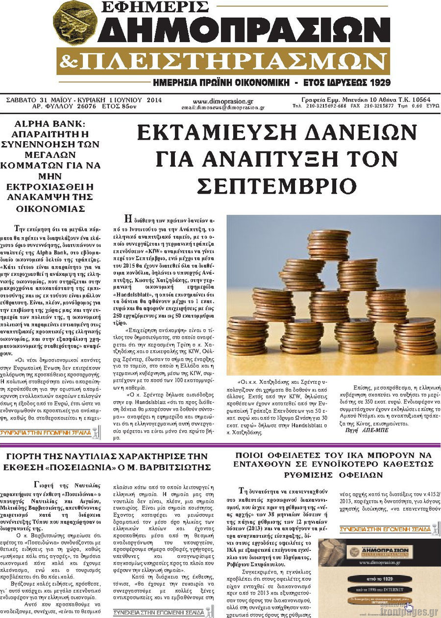 Οι οικονομικές εφημερίδες Enikos Newsroom 09:58, Κυριακή 01 Ιουνίου 2014 Media Οι οικονομικές εφημερίδες Διαβάστε τα πρωτοσέλιδα των οικονομικών εφημερίδων: ΚΥΡΙΑΚΗ ΟΙΚΟΝΟΜΙΚΕΣ ΕΦΗΜΕΡΙΔΕΣ ΠΡΩΤΟΣΕΛΙΔΑ Μοιράσου το: σχολίασε κι εσύ (0 σχόλια) Ακολουθήστε το enikos.gr στο Google News και μάθετε πρώτοι όλες τις ειδήσεις Δείτε όλες τις τελευταίες ειδήσεις από την Ελλάδα και τον Κόσμο στο enikos.gr Ειδήσεις Ροή Ειδήσεων 2 ώρες πριν Στεγαστικό: Όλο το σχέδιο για περισσότερα και φθηνότερα ενοικιαζόμενα σπίτια 1 ώρα πριν Προϋπολογισμός 2026: Τα μηνύματα από την ομιλία Μητσοτάκη και τα «καρφιά» με πολλαπλούς αποδέκτες 2 ώρες πριν Αγρότες: Ορισμένοι ζητούν πιο σκληρή μορφή κινητοποιήσεων – Κρίσιμη η αυριανή σύσκεψη στις Σέρρες 1 ώρα πριν Ρομπ Ράινερ: Το δείπνο με τους Ομπάμα που δεν έγινε ποτέ και νέα στοιχεία για τον «καβγά» στο πάρτι – Βίντεο με τον γιο του να περιφέρεται κοντά στο σπίτι της τραγωδίας 2 ώρες πριν Κανόνια λέιζερ σε φρεγάτες – Το επόμενο άλμα στις ναυτικές επιχειρήσεις – Δείτε βίντεο 3 ώρες πριν Οπτική ψευδαίσθηση: Μόνο αν είσαι ο Σέρλοκ Χολμς θα βρεις τον σκύλο σε 15 δευτερόλεπτα 4 ώρες πριν Τα ζώδια σήμερα, Τετάρτη 17 Δεκεμβρίου: Κριοί, η αυτοπεποίθησή σας ενισχύεται 1 ώρα πριν Νεολιθικός σκύλος βρέθηκε προσεκτικά θαμμένος στον βυθό λίμνης – Δίπλα του βρέθηκε ένα στιλέτο 34 λεπτά πριν Έλαβε τελεσίγραφο από τη σύντροφό του – «Μου είπε πως ή θα της κάνω πρόταση στα δύο χρόνια σχέσης ή θα με χωρίσει» 2 λεπτά πριν Αγρότες: Πολύωροι αποκλεισμοί και σήμερα στα τελωνεία Ευζώνων, Νίκης, Προμαχώνα και Εξοχής 7 λεπτά πριν Σύγκληση του Εθνικού Συμβουλίου Εξωτερικής Πολιτικής για τις εξελίξεις στην Ανατολική Μεσόγειο 12 λεπτά πριν 20 χρόνια τα Χριστούγεννα ξεκινούν στα Public με μεγάλη ποικιλία σε δώρα! 13 λεπτά πριν Βενεζουέλα: Ο Τραμπ σφίγγει τον κλοιό γύρω από τον Μαδούρο με τον «πλήρη αποκλεισμό» δεξαμενόπλοιων – Το «κλεμμένο» πετρέλαιο που τροφοδοτεί τη ρητορική του 17 λεπτά πριν Κυψέλη: Μαθητές κλείδωσαν τους καθηγητές μέσα στο Γυμνάσιο μετά την επίθεση με μαχαίρι ENIKOS NETWORK Δύο συστατικά που είναι καλό να βάλετε στον πρωινό σας καφέ – Βοηθούν στην απώλεια βάρους και τη ρύθμιση του σακχάρου Πρωτοποριακή θεραπεία για το Αλτσχάιμερ: Φως και ήχος μπορεί να επιβραδύνουν την εξέλιξη της νόσου Λεωφορεία: Στάση εργασίας πραγματοποιούν σήμερα οι εργαζόμενοι-Δείτε τις ώρες Έρχεται «νοικοκύρεμα » στα ακίνητα- Τι πρέπει να γνωρίζουν οι πολίτες Σύγχρονος Νοστράδαμος: Προειδοποιεί για «μεγάλο γεγονός» τους επόμενους μήνες που θα συγκλονίσει τη Βρετανία και τον κόσμο Τεστ παρατηρητικότητας: Μπορείτε να βρείτε τις 3 διαφορές στις εικόνες με έναν πιγκουίνο σε 14 δευτερόλεπτα περισσότερα 09:08 , Τετάρτη 17 Δεκεμβρίου 2025 Τηλεθέαση (16/12): Ανακατατάξεις στην πρωινή ψυχαγωγική ζώνη Ξεκάθαρη πρωτιά στην τηλεθέαση για την «Super Κατερίνα» στο δυναμικό κοινό με ποσοστό 18,5%, α... 08:00 , Τετάρτη 17 Δεκεμβρίου 2025 Την Κυριακή με τη Realnews: Δωροεπιταγή 10€ Δωροεπιταγή αξίας 10€ για αγορές άνω των 60€ από τα πολυκαταστήματα FactoryOutlet H προσφορά ι... 07:00 , Τετάρτη 17 Δεκεμβρίου 2025 Την Κυριακή με τη Realnews: Ό,τι και αν αγοράσεις, σκανάρεις και κερδίζεις! Την Κυριακή με τη Realnews: Ό,τι και αν αγοράσεις, σκανάρεις και κερδίζεις! Με το PADU app, το... 05:48 , Τετάρτη 17 Δεκεμβρίου 2025 Οι οικονομικές εφημερίδες 17/12/2025 Διαβάστε τα πρωτοσέλιδα από τις οικονομικές εφημερίδες, σήμερα 17/12/2025. ΤΕΛΕΥΤΑΙΕΣ ΕΙΔΗΣΕΙΣ 7 λεπτά πριν Σύγκληση του Εθνικού Συμ