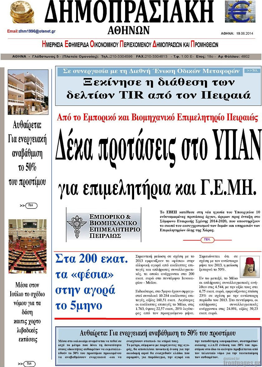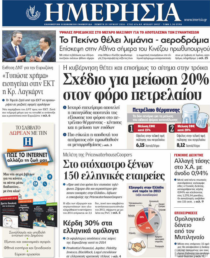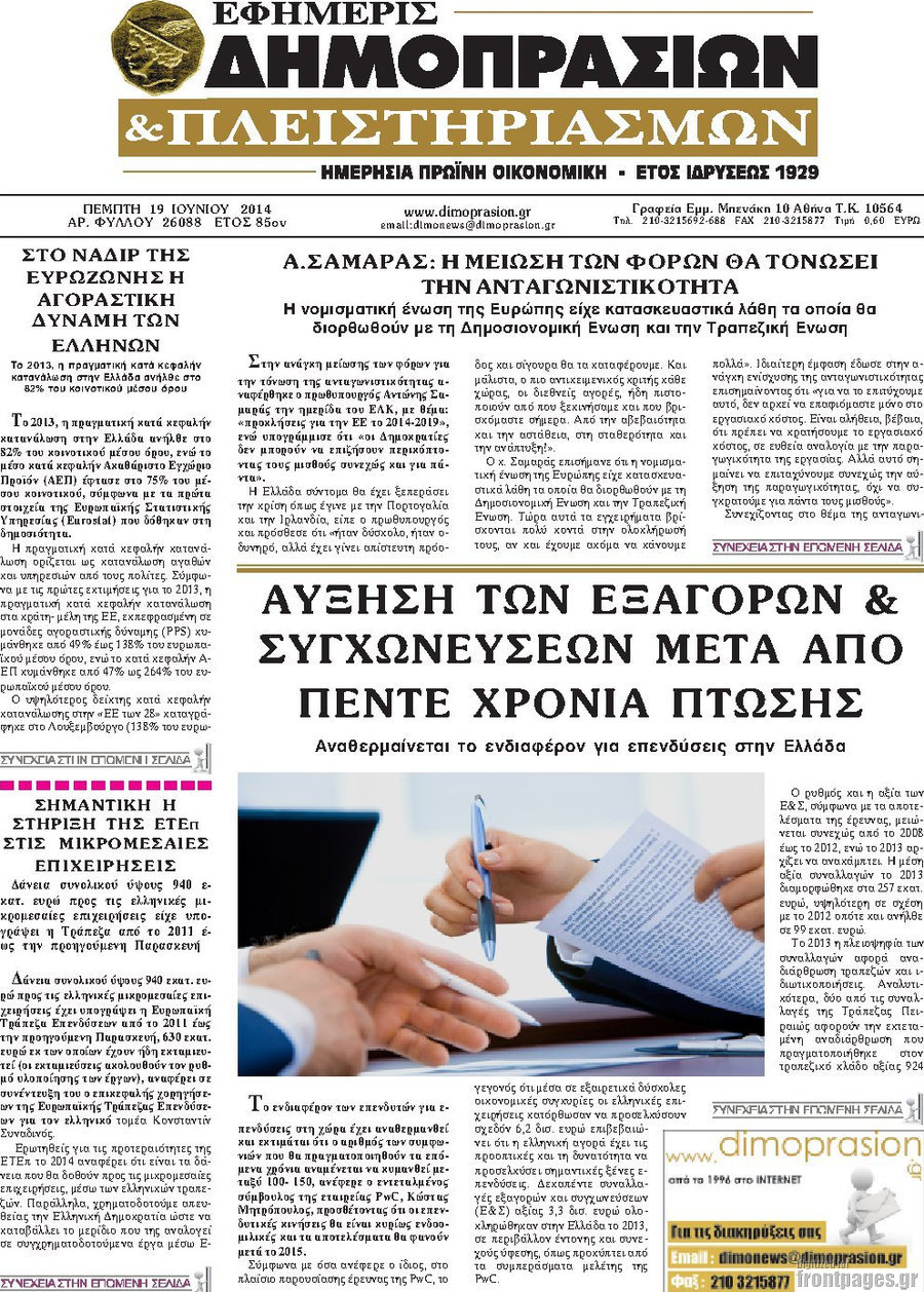 Οι oικονομικές εφημερίδες Enikos Newsroom 08:25, Πέμπτη 19 Ιουνίου 2014 Media Οι oικονομικές εφημερίδες Διαβάστε τα πρωτοσέλιδα των οικονομικών εφημερίδων: ΕΦΗΜΕΡΙΔΕΣ ΟΙΚΟΝΟΜΙΚΕΣ ΕΦΗΜΕΡΙΔΕΣ ΠΡΩΤΟΣΕΛΙΔΑ Μοιράσου το: σχολίασε κι εσύ (0 σχόλια) Ακολουθήστε το enikos.gr στο Google News και μάθετε πρώτοι όλες τις ειδήσεις Δείτε όλες τις τελευταίες ειδήσεις από την Ελλάδα και τον Κόσμο στο enikos.gr Ειδήσεις Ροή Ειδήσεων 2 ώρες πριν Κλιμακώνουν από σήμερα τις κινητοποιήσεις οι αγρότες: Νέα μπλόκα, κλείσιμο παρακαμπτηρίων και άνοιγμα διοδίων – Το νέο μήνυμα Μητσοτάκη 2 ώρες πριν Ευρωπαϊκό Συμβούλιο: Όλες οι λεπτομέρειες για το δάνειο των 90 δισ. ευρώ στην Ουκρανία – Τα συμπεράσματα της Συνόδου Κορυφής 1 ώρα πριν Νίκος Παππάς: Δρομολογήθηκαν οι διαδικασίες για τη διαγραφή του από τον ΣΥΡΙΖΑ μέσα στις γιορτές 3 ώρες πριν Συντάξεις: Οι κερδισμένοι και οι χαμένοι από τις αυξήσεις – Αναλυτικός οδηγός και παραδείγματα 2 ώρες πριν Peter Greene: Ο πρωταγωνιστής του «Pulp Fiction» είχε τραύματα στο σώμα του όταν βρέθηκε νεκρός στο αιματοβαμμένο διαμέρισμα 4 ώρες πριν Κρύα χέρια και πόδια: Γιατρός εξηγεί ποια είναι η αίτια και πότε πρέπει να ανησυχήσετε 2 ώρες πριν Πώς το αρχαίο DNA του κυνηγού – συλλέκτη ξεκλείδωσε τα μυστικά της μακροζωίας 2 ημέρες πριν 20 χρόνια τα Χριστούγεννα ξεκινούν στα Public με μεγάλη ποικιλία σε δώρα! 1 ώρα πριν Ο σύζυγός της συμπεριφέρεται όπως το παιδί τους – «Χρησιμοποιεί αστείες δικαιολογίες για να μην κάνει δουλειές και να ξοδεύει λεφτά» 3 λεπτά πριν Ελένη Χατζίδου: «Έχω δεχτεί σεξουαλική παρενόχληση, δεν ήμουν αρκετά γενναία για να το καταγγείλω» – Η αποκάλυψη που σόκαρε τους συνεργάτες της 7 λεπτά πριν Τα νούμερα τηλεθέασης της πρωινής ζώνης – Πρώτο το «Super Κατερίνα» 12 λεπτά πριν Αλλαγή σελίδας για 3 ζώδια – «Μία δύσκολη περίοδος φτάνει στο τέλος της» 21 λεπτά πριν Κρούσμα μηνιγγίτιδας σε Λύκειο των Χανίων – Στο νοσοκομείο μια μαθήτρια 26 λεπτά πριν Αλέξανδρος Εξάρχου: Προσκεκλημένος του Ντόναλντ Τραμπ στο Κένεντι Σέντερ ο ισχυρός άνδρας του ομίλου AKTOR ENIKOS NETWORK Πότε μπορεί το χλωμό δέρμα να σχετίζεται με σοβαρή νόσο Ενίσχυση του μεταβολισμού: Η Νο1 άσκηση που πρέπει να κάνουν οι γυναίκες μετά τα 35 Συντάξεις: Οι κερδισμένοι και οι χαμένοι από τις αυξήσεις – Αναλυτικός οδηγός Στεγαστικό: Τι λέει η ΠΟΜΙΔΑ για τα νέα μέτρα που ανακοίνωσε ο Κυριάκος Μητσοτάκης Χαρτογραφώντας το «σημείο χωρίς επιστροφή»: Για πρώτη φορά αποκαλύπτεται με λεπτομέρεια το ακανθώδες όριο της ατμόσφαιρας τ... Η Google καταργεί τη λειτουργία «dark web report» – Πώς θα μπορούν οι χρήστες να διαγράφουν τα δεδομένα τους περισσότερα 08:00 , Παρασκευή 19 Δεκεμβρίου 2025 Την Κυριακή με τη Realnews: Δωροεπιταγή 10€ Δωροεπιταγή αξίας 10€ για αγορές άνω των 60€ από τα πολυκαταστήματα FactoryOutlet H προσφορά ι... 05:48 , Παρασκευή 19 Δεκεμβρίου 2025 Οι οικονομικές εφημερίδες 19/12/2025 Διαβάστε τα πρωτοσέλιδα από τις οικονομικές εφημερίδες, σήμερα 19/12/2025. 05:43 , Παρασκευή 19 Δεκεμβρίου 2025 Οι αθλητικές εφημερίδες 19/12/2025 Διαβάστε τα πρωτοσέλιδα από τις αθλητικές εφημερίδες, σήμερα 19/12/2025. 05:38 , Παρασκευή 19 Δεκεμβρίου 2025 Οι πολιτικές εφημερίδες 19/12/2025 Διαβάστε τα πρωτοσέλιδα από τις πολιτικές εφημερίδες, σήμερα 19/12/2025. ΤΕΛΕΥΤΑΙΕΣ ΕΙΔΗΣΕΙΣ 3 λεπτά πριν Ελένη Χατζίδου: «Έχω δεχτεί σεξουαλική παρενόχληση,... 7 λεπτά πριν Τα νούμερα τηλεθέασης της πρωινής ζώνης – Πρώτο το... 12 λεπτά πριν Αλλαγή σελίδας για 3 ζώδια – «Μία δύσκολη περίοδος... 21 λεπτά πριν Κρού