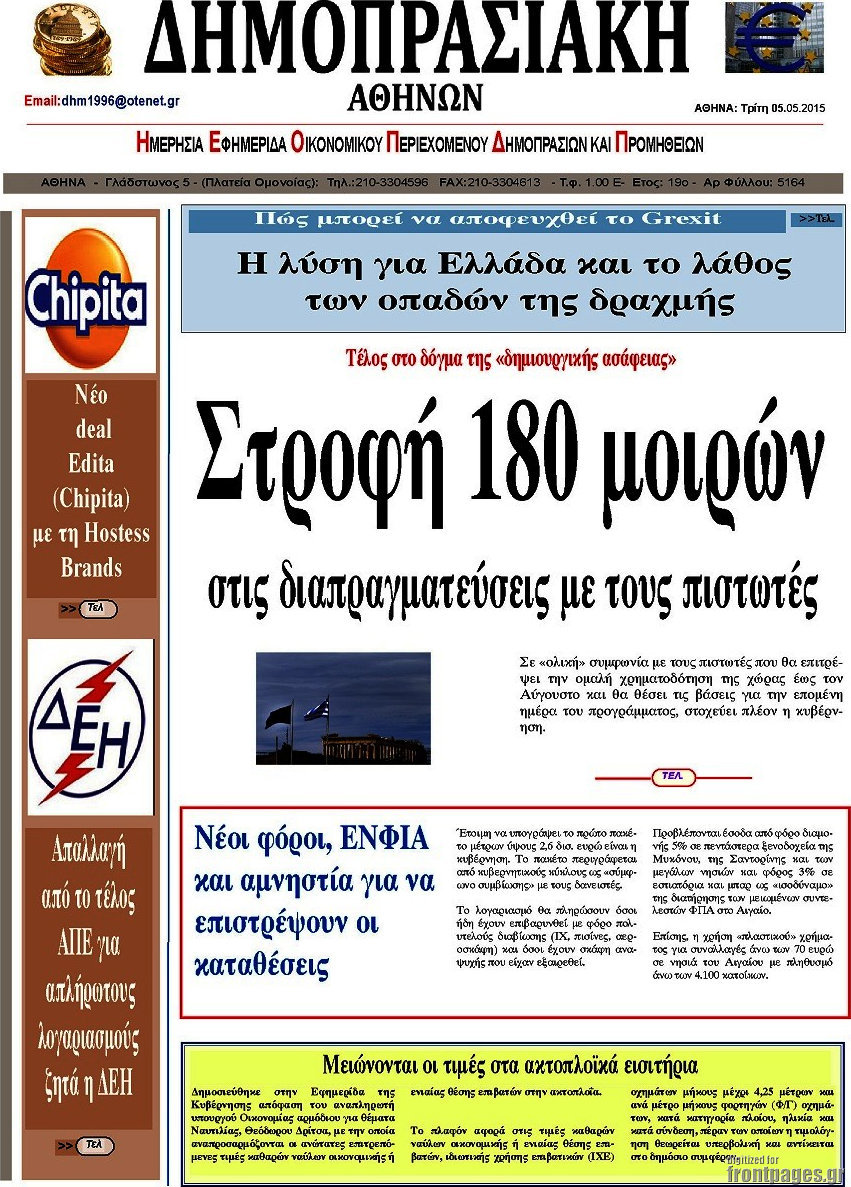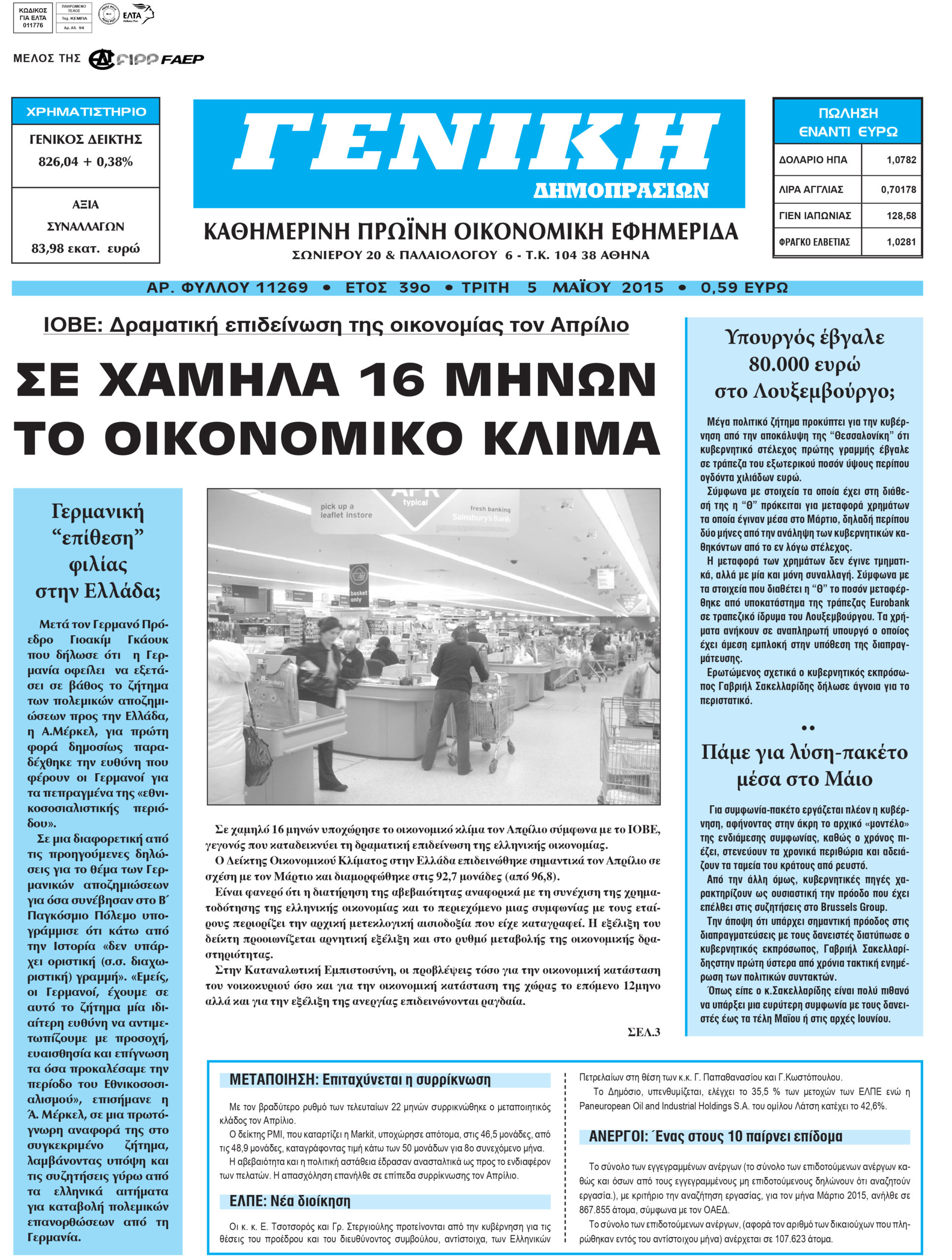Οι οικονομικές εφημερίδες 5/5/2015 Enikos Newsroom 07:22, Τρίτη 05 Μαΐου 2015 Media Διαβάστε τα σημερινά πρωτοσέλιδα των οικονομικών εφημερίδων: ΟΙΚΟΝΟΜΙΚΕΣ ΕΦΗΜΕΡΙΔΕΣ ΠΡΩΤΟΣΕΛΙΔΑ Μοιράσου το: σχολίασε κι εσύ (0 σχόλια) Ακολουθήστε το enikos.gr στο Google News και μάθετε πρώτοι όλες τις ειδήσεις Δείτε όλες τις τελευταίες ειδήσεις από την Ελλάδα και τον Κόσμο στο enikos.gr Ειδήσεις Ροή Ειδήσεων 35 λεπτά πριν Έρευνα MRB: Η πρόθεση ψήφου και τα σημαντικότερα προβλήματα – Οι «λέξεις» που εκφράζουν τους πολίτες 27 λεπτά πριν Αλαλούμ με τις πληρωμές στους αγρότες: Δεν καταβλήθηκε η Βασική Ενίσχυση, αλλά έγινε παρακράτηση της εισφοράς στον ΕΛΓΑ – Τι απαντά η κυβέρνηση 1 ώρα πριν Αγρότες: Πολύωροι αποκλεισμοί και σήμερα στα τελωνεία Ευζώνων, Νίκης, Προμαχώνα και Εξοχής 2 ώρες πριν Ρομπ Ράινερ: Το δείπνο με τους Ομπάμα που δεν έγινε ποτέ και νέα στοιχεία για τον «καβγά» στο πάρτι – Βίντεο με τον γιο του να περιφέρεται κοντά στο σπίτι της τραγωδίας 1 ώρα πριν Κυψέλη: Μαθητές κλείδωσαν τους καθηγητές μέσα στο Γυμνάσιο μετά την επίθεση με μαχαίρι 20 λεπτά πριν Τα 4 ζώδια που ξαναβρίσκουν τον εαυτό τους – «Μπαίνετε επιτέλους στην ουσία των πραγμάτων» 4 ώρες πριν Οπτική ψευδαίσθηση: Μόνο αν είσαι ο Σέρλοκ Χολμς θα βρεις τον σκύλο σε 15 δευτερόλεπτα 3 ώρες πριν Νεολιθικός σκύλος βρέθηκε προσεκτικά θαμμένος στον βυθό λίμνης – Δίπλα του βρέθηκε ένα στιλέτο 2 ώρες πριν Έλαβε τελεσίγραφο από τη σύντροφό του – «Μου είπε πως ή θα της κάνω πρόταση στα δύο χρόνια σχέσης ή θα με χωρίσει» 3 λεπτά πριν Καραχάλιος: «Η κυρία Καρυστιανού πρέπει να καταλάβει ότι στην πολιτική κάθε ψέμα κοστίζει» 9 λεπτά πριν Λούκας Γιώρκας: «Έχω δεχθεί παρατραβηγμένες συμπεριφορές – Άφησα τον άνθρωπο να εκτονωθεί και συνέχισα» 14 λεπτά πριν Οι Νιου Γιορκ Νικς κατέκτησαν το NBA Cup – MVP ο Τζέιλεν Μπράνσον με 25 πόντους και 8 ασίστ 20 λεπτά πριν Τα 4 ζώδια που ξαναβρίσκουν τον εαυτό τους – «Μπαίνετε επιτέλους στην ουσία των πραγμάτων» 20 λεπτά πριν «Οδύσσεια»: Νέες εντυπωσιακές φωτογραφίες από το κινηματογραφικό έπος του Κρίστοφερ Νόλαν ENIKOS NETWORK Αδενώματα Υπόφυσης: Μια πάθηση καλοήθης, αλλά όχι αθώα Χρόνια Αναπνευστικά Νοσήματα: 400.000 θάνατοι ετησίως στην Ευρώπη Ειδικό επιδοτούμενο πρόγραμμα κατάρτισης της ΔΥΠΑ για ανέργους: Αρχίζει σήμερα η υποβολή ενστάσεων-Ποιους αφορά Δώρο Χριστουγέννων και επιδόματα της ΔΥΠΑ: Σήμερα αρχίζει η προπληρωμή τους-Ποιους αφορά Σύγχρονος Νοστράδαμος: Προειδοποιεί για «μεγάλο γεγονός» τους επόμενους μήνες που θα συγκλονίσει τη Βρετανία και τον κόσμο Τεστ παρατηρητικότητας: Μπορείτε να βρείτε τις 3 διαφορές στις εικόνες με έναν πιγκουίνο σε 14 δευτερόλεπτα περισσότερα 09:08 , Τετάρτη 17 Δεκεμβρίου 2025 Τηλεθέαση (16/12): Ανακατατάξεις στην πρωινή ψυχαγωγική ζώνη Ξεκάθαρη πρωτιά στην τηλεθέαση για την «Super Κατερίνα» στο δυναμικό κοινό με ποσοστό 18,5%, α... 08:00 , Τετάρτη 17 Δεκεμβρίου 2025 Την Κυριακή με τη Realnews: Δωροεπιταγή 10€ Δωροεπιταγή αξίας 10€ για αγορές άνω των 60€ από τα πολυκαταστήματα FactoryOutlet H προσφορά ι... 07:00 , Τετάρτη 17 Δεκεμβρίου 2025 Την Κυριακή με τη Realnews: Ό,τι και αν αγοράσεις, σκανάρεις και κερδίζεις! Την Κυριακή με τη Realnews: Ό,τι και αν αγοράσεις, σκανάρεις και κερδίζεις! Με το PADU app, το... 05:48 , Τετάρτη 17 Δεκεμβρίου 2025 Οι οικονομικές εφημερίδες 17/12/2025 Διαβάστε τα πρωτοσέλιδα από τις οικονομικές εφημερίδες, σήμερα 17/12/2025. ΤΕΛΕΥΤΑΙΕΣ ΕΙΔΗΣΕΙΣ 3 λεπτά πριν Καραχάλιος: «Η κυρία Καρυστιανού πρέπει να καταλάβει...