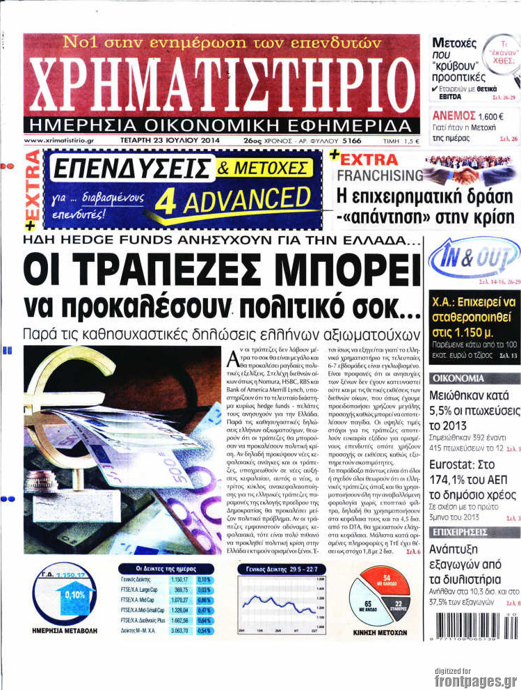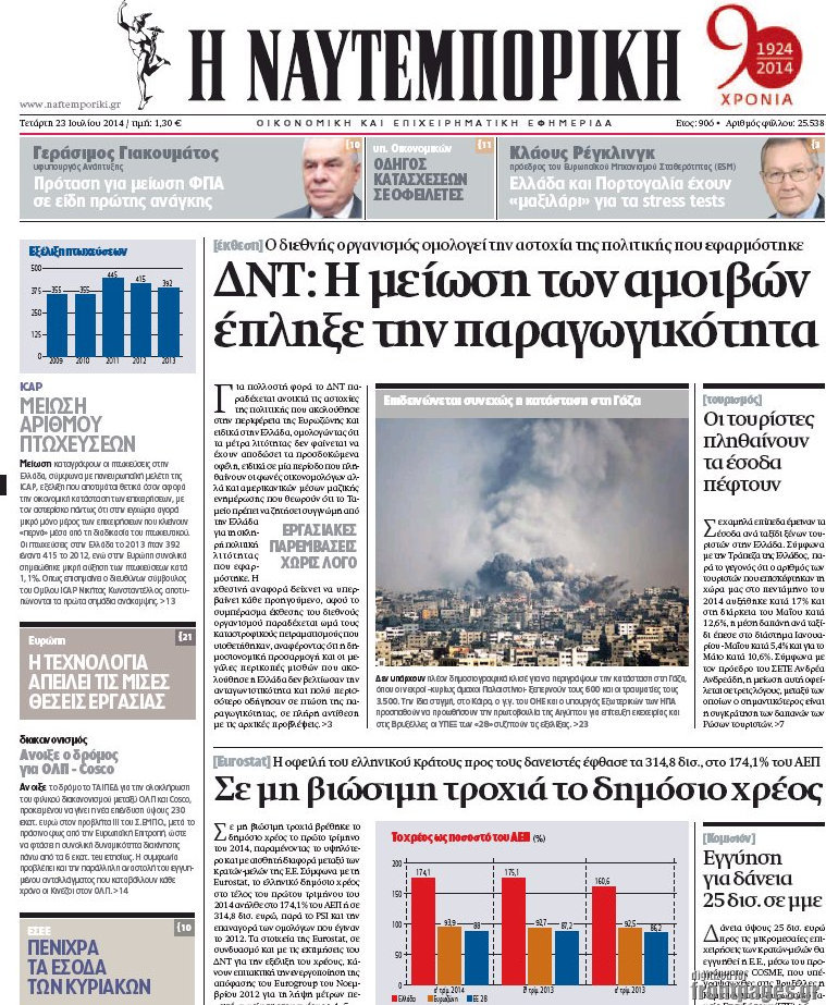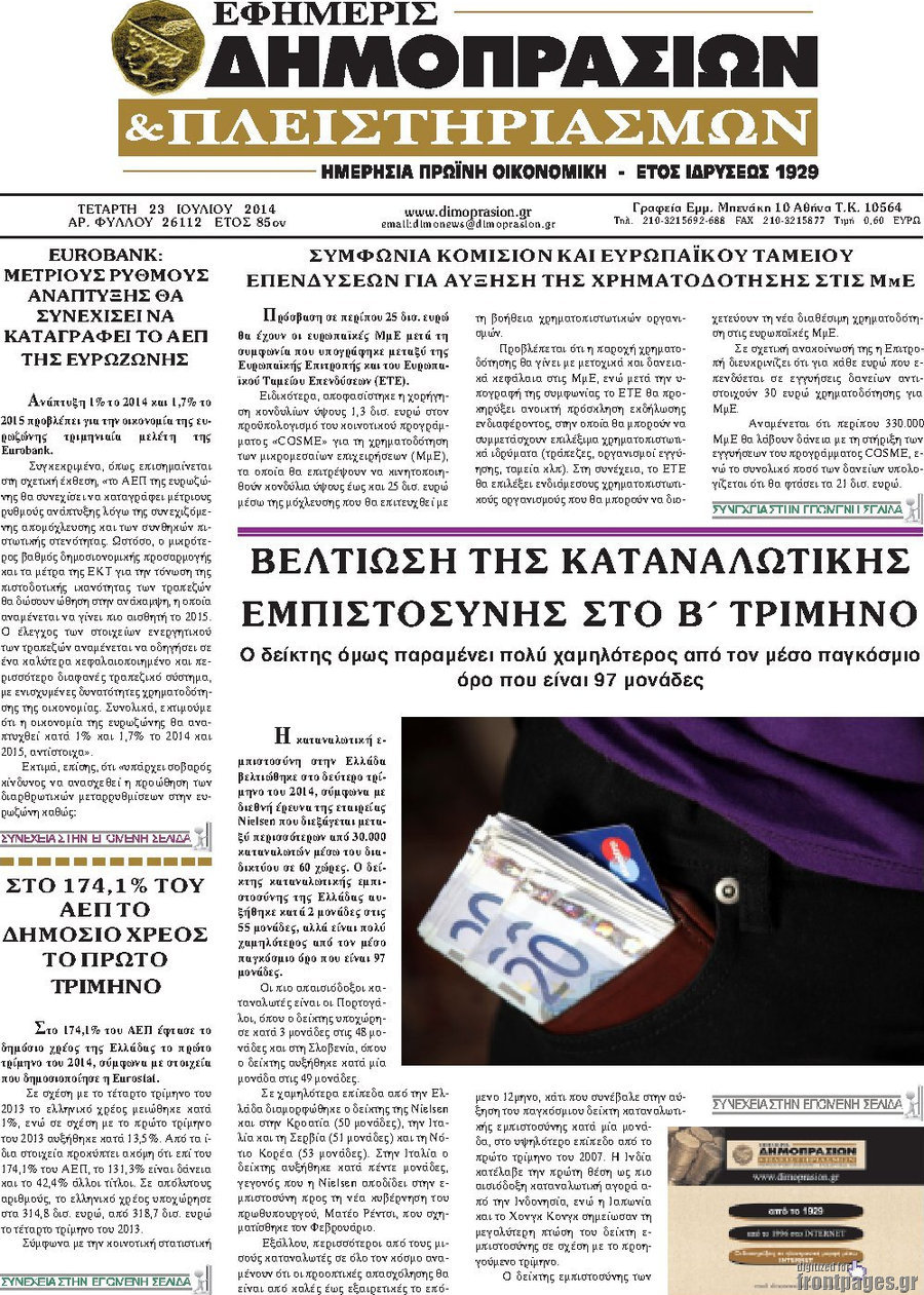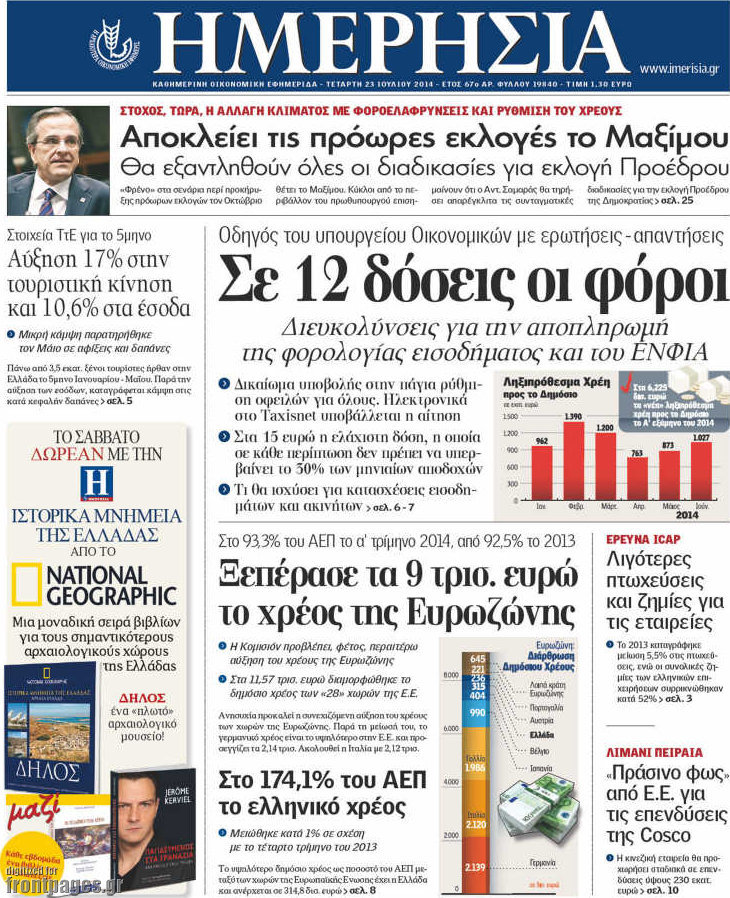 Οι οικονομικές εφημερίδες Enikos Newsroom 08:08, Τετάρτη 23 Ιουλίου 2014 Media Οι οικονομικές εφημερίδες Διαβάστε τα πρωτοσέλιδα των οικονομικών εφημερίδων. ΟΙΚΟΝΟΜΙΚΕΣ ΕΦΗΜΕΡΙΔΕΣ ΠΡΩΤΟΣΕΛΙΔΑ Μοιράσου το: σχολίασε κι εσύ (0 σχόλια) Ακολουθήστε το enikos.gr στο Google News και μάθετε πρώτοι όλες τις ειδήσεις Δείτε όλες τις τελευταίες ειδήσεις από την Ελλάδα και τον Κόσμο στο enikos.gr Ειδήσεις Ροή Ειδήσεων 1 ώρα πριν Χριστούγεννα στα μπλόκα: Επιμένουν στις κινητοποιήσεις τους οι αγρότες – Ανοίγουν τα διόδια το Σαββατοκύριακο 2 ώρες πριν Ουκρανία: Η άνευ προηγουμένου επίθεση σε ρωσικό τάνκερ στη Μεσόγειο και το μήνυμα προς στον Πούτιν – Το «μακρύ χέρι» του Κιέβου 1 ώρα πριν Πούτιν: Τα μηνύματα σε Ευρώπη και ΝΑΤΟ από το μαραθώνιο «σόου» του – Η απαίτηση για «σεβασμό» και η ειρήνη «με τους όρους» της Μόσχας 2 ώρες πριν Τραμπ: Δεν αποκλείει την πιθανότητα ενός πολέμου στη Βενεζουέλα – «Ο Μαδούρο ξέρει καλύτερα από τον καθένα τι ακριβώς θέλω» 3 ώρες πριν Συνεχίζει να προκαλεί ο Μίτσκοσκι: «Για μένα το όνομα Μακεδονία είναι ιερό» 1 ώρα πριν Ανακαλύφθηκαν αρχαία χρυσά νομίσματα 2.200 ετών που απεικονίζουν τον θεό Απόλλωνα – Η άγνωστη σύνδεση με τον Φίλιππο Β΄ της Μακεδονίας 2 ώρες πριν Ύπνος: Μια κρυφή κατάσταση του εγκεφάλου πριν από τον ύπνο μπορεί να είναι το “κλειδί” για υψηλή ευφυΐα και δημιουργικότητα 3 ώρες πριν Αριθμολογία: Οι άνθρωποι που έχουν γεννηθεί αυτές τις 4 ημερομηνίες, συχνά παρεξηγούνται – «Η καλοσύνη τους κρύβει τεράστια δύναμη» 4 ώρες πριν Ξεχάστε το καθάρισμα το Σαββατοκύριακο: Ο «κανόνας των 20 λεπτών» που θα σας λύσει τα χέρια 1 λεπτό πριν Πόλεμος στην Ουκρανία: Εφτά νεκροί από ρωσική πυραυλική επίθεση στο λιμάνι της Οδησσού 5 λεπτά πριν ΗΠΑ: Η κυβέρνηση του Ντόναλντ Τραμπ άρχισε να δημοσιοποιεί τα αρχεία Έπσταϊν 16 λεπτά πριν Σάμος: Άνοιξε το μπλόκο των αγροτών στον κόμβο Κοκκαρίου – Σε νέα συνεδρίαση θα καθορίσουν την στάση τους 24 λεπτά πριν Άνω Λιόσια: Πυροβολισμοί σε επιχείρηση με χαλιά – Εντοπίστηκαν 10 κάλυκες 32 λεπτά πριν Γάζα: Ισραηλινό πλήγμα σε σχολείο που είχαν καταφύγει εκτοπισμένοι – Τουλάχιστον έξι νεκροί ENIKOS NETWORK Το ΕΚΑΒ τιμήθηκε από την Ακαδημία Αθηνών για τα 40 χρόνια προσφοράς του Έχετε πραγματικά μεγάλη καρδιά; 10 χαρακτηριστικά όσων έχουν καλοσύνη Αναστολή μέτρων αναγκαστικής εκτέλεσης για κτηνοτρόφους που πλήττονται από την ευλογιά των αιγοπροβάτων Πλήρης επάρκεια προϊόντων στις λαϊκές της Αττικής, παρά τις αγροτικές κινητοποιήσεις – Τι απαντούν οι πωλητές Χαρτογραφώντας το «σημείο χωρίς επιστροφή»: Για πρώτη φορά αποκαλύπτεται με λεπτομέρεια το ακανθώδες όριο της ατμόσφαιρας τ... Η Google καταργεί τη λειτουργία «dark web report» – Πώς θα μπορούν οι χρήστες να διαγράφουν τα δεδομένα τους περισσότερα 22:42 , Παρασκευή 19 Δεκεμβρίου 2025 Γιώργος Γιαννόπουλος για “Το σόι σου”: “Είναι ευτυχία και ευλογία αυτή η σειρά” «Είναι ευτυχία και ευλογία η συγκυρία αυτής της σειράς», θα πει ο Γιώργος Γιαννόπουλος -ο αγαπ... 20:37 , Παρασκευή 19 Δεκεμβρίου 2025 Don’t Forget The Lyrics: Η Έλλη Κοκκίνου υποδέχεται 4 παίκτες που θα κάνουν τα πάντα για να μη χάσουν ούτε… μισή λέξη από τους στίχους Το «Don’t Forget The Lyrics» επιστρέφει απόψε, Παρασκευή 19 Δεκεμβρίου, στις 21:00 με νέο επει... 19:31 , Παρασκευή 19 Δεκεμβρίου 2025 GNTM: Απόψε ο μεγάλος τελικός για τους 4 φιναλίστ Έπειτα από μήνες γεμάτους μόδα, δημιουργία και έντονες αναμετρήσεις, το GNTM 2025 κορυφώνεται,... 18:11 , Παρασκευή 19 Δεκεμβρίου 20