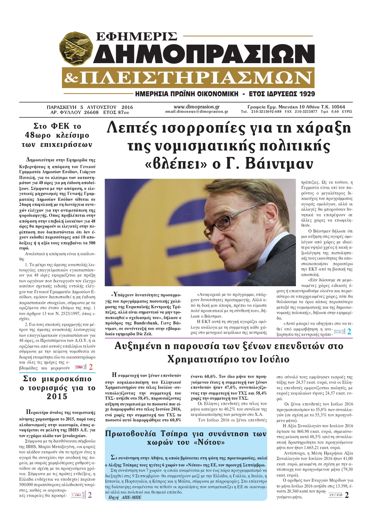 Οι οικονομικές εφημερίδες 5/8/2016 Enikos Newsroom 05:08, Παρασκευή 05 Αυγούστου 2016 Media Διαβάστε τα σημερινά πρωτοσέλιδα των οικονομικών εφημερίδων: ΟΙΚΟΝΟΜΙΚΕΣ ΕΦΗΜΕΡΙΔΕΣ ΠΡΩΤΟΣΕΛΙΔΑ Μοιράσου το: σχολίασε κι εσύ (0 σχόλια) Ακολουθήστε το enikos.gr στο Google News και μάθετε πρώτοι όλες τις ειδήσεις Δείτε όλες τις τελευταίες ειδήσεις από την Ελλάδα και τον Κόσμο στο enikos.gr Ειδήσεις Ροή Ειδήσεων 4 ώρες πριν Μεσόγειος: Η διαδρομή του ρωσικού τάνκερ «Qendil» και η στοχευμένη επίθεση της Ουκρανίας με drone – Ο Πούτιν προειδοποίησε για αντίποινα 18 λεπτά πριν Αγρότες: Έκλεισαν για μία ώρα την παρακαμπτήρια της Ιόνιας Οδού στη θέση Χαλίκι 2 ώρες πριν Εμπλοκή και αερομαχίες με οπλισμένα τουρκικά F-16 στο Αιγαίο 2 ώρες πριν Πούτιν: «Ναι, είμαι ερωτευμένος» – Βίντεο από τη σπάνια προσωπική παραδοχή του 21 λεπτά πριν Ανδρέας Λυκουρέντζος: Υπέβαλε την παραίτησή του ο πρόεδρος του ΕΛΓΑ, αλλά δεν έγινε δεκτή – Όλο το παρασκήνιο 32 λεπτά πριν Αριθμολογία: Οι άνθρωποι που έχουν γεννηθεί αυτές τις 4 ημερομηνίες, συχνά παρεξηγούνται – «Η καλοσύνη τους κρύβει τεράστια δύναμη» 3 ώρες πριν Μήπως έχετε χάσει τον εαυτό σας στη σχέση σας; 7 «αθόρυβες» υποχωρήσεις που μάλλον κάνατε, χωρίς να το συνειδητοποιήσετε 2 ώρες πριν Ξεχάστε το καθάρισμα το Σαββατοκύριακο: Ο «κανόνας των 20 λεπτών» που θα σας λύσει τα χέρια 4 ώρες πριν Κουίζ για την παλιά Αθήνα: Αναγνωρίζετε την περιοχή; Έχετε περάσει 100% από εκεί 2 λεπτά πριν Συνεχίζει να προκαλεί ο Μίτσκοσκι: «Για μένα το όνομα Μακεδονία είναι ιερό» 12 λεπτά πριν Ο Γιάννης Κακλέας σκηνοθετεί Βερόνικα Δαβάκη και Ιβάν Σβιτάιλο στη «Locandiera» 18 λεπτά πριν Αγρότες: Έκλεισαν για μία ώρα την παρακαμπτήρια της Ιόνιας Οδού στη θέση Χαλίκι 21 λεπτά πριν Ανδρέας Λυκουρέντζος: Υπέβαλε την παραίτησή του ο πρόεδρος του ΕΛΓΑ, αλλά δεν έγινε δεκτή – Όλο το παρασκήνιο 26 λεπτά πριν Ηράκλειο: «Ιπτάμενοι» Άγιοι Βασίληδες μοίρασαν δώρα και χαμόγελα στα παιδιά στο ΠΑΓΝΗ – Δείτε βίντεο ENIKOS NETWORK Το ΕΚΑΒ τιμήθηκε από την Ακαδημία Αθηνών για τα 40 χρόνια προσφοράς του Έχετε πραγματικά μεγάλη καρδιά; 10 χαρακτηριστικά όσων έχουν καλοσύνη Έρχονται νέες προσλήψεις σε Δήμο – Όλες οι λεπτομέρειες Επίδομα παιδιού: Πότε ανοίγει ξανά η πλατφόρμα για τις αιτήσεις Χαρτογραφώντας το «σημείο χωρίς επιστροφή»: Για πρώτη φορά αποκαλύπτεται με λεπτομέρεια το ακανθώδες όριο της ατμόσφαιρας τ... Η Google καταργεί τη λειτουργία «dark web report» – Πώς θα μπορούν οι χρήστες να διαγράφουν τα δεδομένα τους περισσότερα 20:37 , Παρασκευή 19 Δεκεμβρίου 2025 Don’t Forget The Lyrics: Η Έλλη Κοκκίνου υποδέχεται 4 παίκτες που θα κάνουν τα πάντα για να μη χάσουν ούτε… μισή λέξη από τους στίχους Το «Don’t Forget The Lyrics» επιστρέφει απόψε, Παρασκευή 19 Δεκεμβρίου, στις 21:00 με νέο επει... 19:31 , Παρασκευή 19 Δεκεμβρίου 2025 GNTM: Απόψε ο μεγάλος τελικός για τους 4 φιναλίστ Έπειτα από μήνες γεμάτους μόδα, δημιουργία και έντονες αναμετρήσεις, το GNTM 2025 κορυφώνεται,... 18:11 , Παρασκευή 19 Δεκεμβρίου 2025 Το σόι σου: Ο Άρης έρχεται στην Ελλάδα για τις γιορτές των Χριστουγέννων – Τι θα δούμε στο αποψινό εορταστικό επεισόδιο Ένα απολαυστικό, εορταστικό επεισόδιο της σειράς “Το σόι σου”, γεμάτο ευτράπελα αλ... 15:15 , Παρασκευή 19 Δεκεμβρίου 2025 Την Κυριακή με τη Realnews: Ό,τι και αν αγοράσεις, σκανάρεις και κερδίζεις! Την Κυριακή με τη Realnews: Ό,τι και αν αγοράσεις, σκανάρεις και κερδίζεις! Με το PADU app, το... ΤΕΛΕΥΤΑΙΕΣ ΕΙΔΗΣΕΙΣ 2 λεπτά πριν Συνεχίζει να προκαλεί ο Μίτσκοσκι: «Για μένα τ