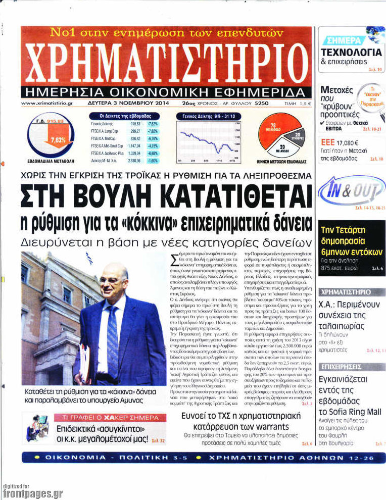 Οι οικονομικές εφημερίδες Enikos Newsroom 07:36, Δευτέρα 03 Νοεμβρίου 2014 Media Οι οικονομικές εφημερίδες Διαβάστε τα πρωτοσέλιδα των οικονομικών εφημερίδων: ΟΙΚΟΝΟΜΙΚΕΣ ΕΦΗΜΕΡΙΔΕΣ ΠΡΩΤΟΣΕΛΙΔΑ Μοιράσου το: σχολίασε κι εσύ (0 σχόλια) Ακολουθήστε το enikos.gr στο Google News και μάθετε πρώτοι όλες τις ειδήσεις Δείτε όλες τις τελευταίες ειδήσεις από την Ελλάδα και τον Κόσμο στο enikos.gr Ειδήσεις Ροή Ειδήσεων 8 ώρες πριν Μητσοτάκης: Αναγκαία η μεταρρύθμιση του πρωτογενούς τομέα – Τα 6 νέα μέτρα για το στεγαστικό και οι αναφορές σε «Ιθάκη» και «πολιτικούς του καναπέ» 8 ώρες πριν Δάνεια σε ελβετικό φράγκο: Τα βασικά σημεία της ρύθμισης – ανάσας για 40.000 δανειολήπτες – Αναλυτικός οδηγός με ερωτήσεις και απαντήσεις 7 ώρες πριν Κυψέλη: Εξιτήριο πήρε η 14χρονη μαθήτρια που μαχαιρώθηκε από την 16χρονη σε σχολείο – «Θέλω να βοηθήσω το παιδί, έχει μπλέξει με κακές παρέες» 7 ώρες πριν Τραμπ: Γιατί κατέθεσε τώρα την αγωγή κατά του BBC – Πώς η κίνησή του εξυπηρετεί το νέο δόγμα του για «αντίσταση» στην Ευρώπη, υπέρ των συντηρητικών 8 ώρες πριν ΟΠΕΚΕΠΕ – Παράνομες επιδοτήσεις: Ελεύθεροι με περιοριστικούς όρους και οι 7 κατηγορούμενοι που απολογήθηκαν σήμερα 7 ώρες πριν Ανακαλύφθηκε βυθισμένη πέτρινη κατασκευή ανοιχτά της Κριμαίας – Αποτελεί μέρος αρχαίας ελληνικής αποικίας 8 ώρες πριν Ύπνος: Αυτό μπορεί να είναι το χειρότερο λάθος για το βιολογικό ρολόι σας, σύμφωνα με ειδικό 9 ώρες πριν Αριθμολογία: Οι άνθρωποι που έχουν γεννηθεί αυτές τις 3 ημερομηνίες, προσελκύουν μεγάλη τύχη πριν από το τέλος του 2025 11 ώρες πριν Οι 7 συμπεριφορές που μαρτυρούν ότι ένας άνδρας επενδύει μακροπρόθεσμα σε μια σχέση 5 λεπτά πριν Σαν σήμερα 17 Δεκεμβρίου: Τα σημαντικότερα γεγονότα της ημέρας 11 λεπτά πριν Οι οικονομικές εφημερίδες 17/12/2025 16 λεπτά πριν Οι αθλητικές εφημερίδες 17/12/2025 21 λεπτά πριν Οι πολιτικές εφημερίδες 17/12/2025 29 λεπτά πριν Τα ζώδια σήμερα, Τετάρτη 17 Δεκεμβρίου: Κριοί, η αυτοπεποίθησή σας ενισχύεται ENIKOS NETWORK Αίτημα ΙΣΑ για την εξαίρεση των προσωπικών γιατρών από τις κατ’ οίκον επισκέψεις Η σκανδιναβική μέθοδος στον ύπνο που μπορεί να σώσει έναν γάμο Πιερρακάκης: Ο προϋπολογισμός συμβάλλει ουσιαστικά στην ενίσχυση της αγοραστικής δύναμης της πλειονότητας των εργαζομένων e-ΕΦΚΑ: Παρατείνεται η προθεσμία για την υποβολή ΑΠΔ – Ποιους αφορά Σύγχρονος Νοστράδαμος: Προειδοποιεί για «μεγάλο γεγονός» τους επόμενους μήνες που θα συγκλονίσει τη Βρετανία και τον κόσμο Τεστ παρατηρητικότητας: Μπορείτε να βρείτε τις 3 διαφορές στις εικόνες με έναν πιγκουίνο σε 14 δευτερόλεπτα περισσότερα 05:48 , Τετάρτη 17 Δεκεμβρίου 2025 Οι οικονομικές εφημερίδες 17/12/2025 Διαβάστε τα πρωτοσέλιδα από τις οικονομικές εφημερίδες, σήμερα 17/12/2025. 05:43 , Τετάρτη 17 Δεκεμβρίου 2025 Οι αθλητικές εφημερίδες 17/12/2025 Διαβάστε τα πρωτοσέλιδα από τις αθλητικές εφημερίδες, σήμερα 17/12/2025. 05:38 , Τετάρτη 17 Δεκεμβρίου 2025 Οι πολιτικές εφημερίδες 17/12/2025 Διαβάστε τα πρωτοσέλιδα από τις πολιτικές εφημερίδες, σήμερα 17/12/2025. 20:06 , Τρίτη 16 Δεκεμβρίου 2025 Ο ΣΚΑΙ καταγγέλλει τον ΕΚΚΟΜΕΔ Επιστολή με την οποία καταγράφει την έντονη διαμαρτυρία του προς τον διευθύνοντα σύμβουλο του... ΤΕΛΕΥΤΑΙΕΣ ΕΙΔΗΣΕΙΣ 5 λεπτά πριν Σαν σήμερα 17 Δεκεμβρίου: Τα σημαντικότερα γεγονότα... 11 λεπτά πριν Οι οικονομικές εφημερίδες 17/12/2025 16 λεπτά πριν Οι αθλητικές εφημερίδες 17/12/2025 21 λεπτά πριν Οι πολιτικές εφημερίδες 17/12/2025 29 λεπτά πριν Τα ζώδια σήμερα, Τετάρτη 17 Δεκεμβρίου: Κριοί, η... 37 λε