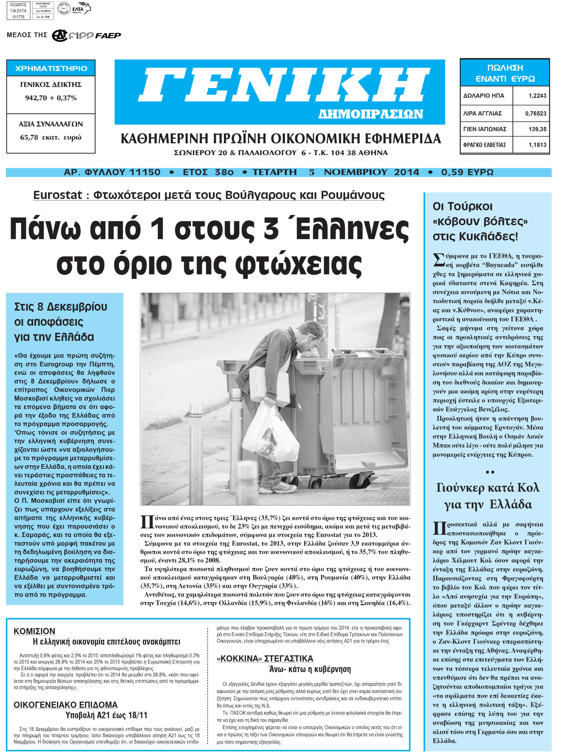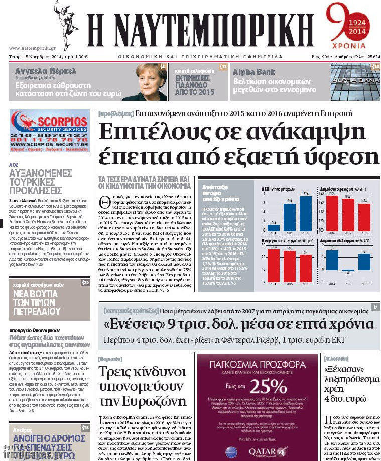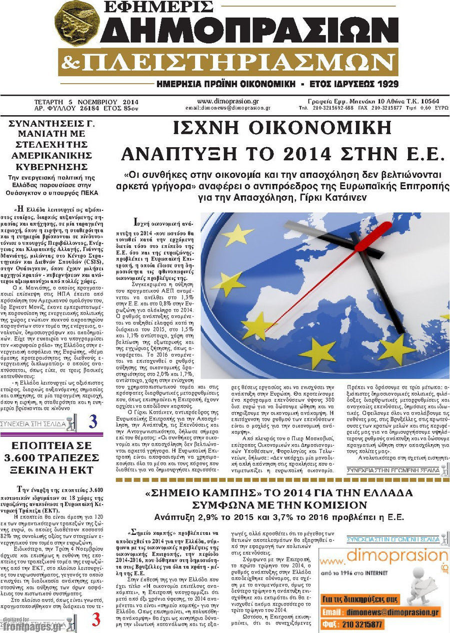 Οι οικονομικές εφημερίδες Enikos Newsroom 07:21, Τετάρτη 05 Νοεμβρίου 2014 Media Οι οικονομικές εφημερίδες Διαβάστε τα πρωτοσέλιδα των οικονομικών εφημερίδων: ΟΙΚΟΝΟΜΙΚΕΣ ΕΦΗΜΕΡΙΔΕΣ ΠΡΩΤΟΣΕΛΙΔΑ Μοιράσου το: σχολίασε κι εσύ (0 σχόλια) Ακολουθήστε το enikos.gr στο Google News και μάθετε πρώτοι όλες τις ειδήσεις Δείτε όλες τις τελευταίες ειδήσεις από την Ελλάδα και τον Κόσμο στο enikos.gr Ειδήσεις Ροή Ειδήσεων 2 ώρες πριν Εκτός ευρωομάδας ΣΥΡΙΖΑ ο Νίκος Παππάς μετά την επίθεση στον δημοσιογράφο Νίκο Γιαννόπουλο – Η μήνυση και οι νέες δηλώσεις 2 ώρες πριν «Αγριεύουν» οι αγρότες: «Δεν συντρέχει λόγος συνάντησης με τον πρωθυπουργό» – Ώρα αποφάσεων στη σύσκεψη της Πέμπτης 2 ώρες πριν Κυψέλη: Χωρίς την οικογένειά της δίπλα της απολογήθηκε η 16χρονη – «Της είχε επιτεθεί κάποιος για να την βιάσει, φοβήθηκε και κυκλοφορούσε με μαχαίρι» 1 ώρα πριν Politico: Το πρόβλημα της Ευρώπης δεν είναι το Βέλγιο αλλά ο Ντόναλντ Τραμπ 3 ώρες πριν Αλεξανδρούπολη: Πολυοργανική ανεπάρκεια λόγω υποσιτισμού η αιτία θανάτου του 3χρονου αγοριού 2 ώρες πριν Μυστήριο με τεράστιες κυκλικές πέτρες 200 κιλών – Ανακαλύφθηκαν τυχαία κατά τη διάρκεια οδικών έργων και κανείς δεν ξέρει από πού προέρχονται 3 ώρες πριν Ύπνος: Ειδικός εξηγεί τον πραγματικό λόγο που ξυπνάτε στις 4 τα ξημερώματα – Ο ρόλος των ορμονών και του κιρκάδιου ρυθμού 4 ώρες πριν Αριθμολογία: Οι άνθρωποι που έχουν γεννηθεί αυτές τις 4 ημερομηνίες, είναι τρυφεροί και αγαπούν ανιδιοτελώς 15 ώρες πριν 20 χρόνια τα Χριστούγεννα ξεκινούν στα Public με μεγάλη ποικιλία σε δώρα! 13 λεπτά πριν Βέλγους πολιτικούς και επικεφαλής χρηματοπιστωτικών ιδρυμάτων στοχοποιεί η Μόσχα για τα κατασχεθέντα περιουσιακά στοιχεία 28 λεπτά πριν ΗΠΑ: Αναζητείται δεύτερος ύποπτος για την επίθεση στο πανεπιστήμιο Μπράουν 43 λεπτά πριν Λεωφόρος Αλεξάνδρας: Δεν εντοπίστηκε βόμβα έξω από το κολλέγιο – Προσήχθη άνδρας για το προειδοποιητικό σημείωμα 59 λεπτά πριν Ελένη Κρίτα για το reunion του «Παρά Πέντε»: «Ήταν πραγματικά σαν να μην είχαμε χαθεί ποτέ» 1 ώρα πριν Κύπελλο Ελλάδας: Αυτά είναι τα ζευγάρια στα νοκ-άουτ, οι διασταυρώσεις στους «8» κι ο δρόμος προς τον τελικό ENIKOS NETWORK Αϋπνία: Το κόλπο που θα σας βοηθήσει να κοιμηθείτε απόψε – Είναι απλό και έχει αποτέλεσμα 2,6 εκατομμύρια πολίτες έχουν ήδη εμβολιαστεί κατά της γρίπης ΕΛΣΤΑΤ: Τι δείχνουν τα νέα στοιχεία για τις ηλεκτρονικές παραγγελίες των επιχειρήσεων ΚΕΠΕ: Οι 3 διακριτές συμβολές των ΜμΕ και της μεταποίησης στην ελληνική οικονομία Χαρτογραφώντας το «σημείο χωρίς επιστροφή»: Για πρώτη φορά αποκαλύπτεται με λεπτομέρεια το ακανθώδες όριο της ατμόσφαιρας τ... Η Google καταργεί τη λειτουργία «dark web report» – Πώς θα μπορούν οι χρήστες να διαγράφουν τα δεδομένα τους περισσότερα 22:24 , Τετάρτη 17 Δεκεμβρίου 2025 Το Σπίτι Δίπλα Στο Ποτάμι: Σε κίνδυνο η υγεία του Απόστολου – Τι θα δούμε απόψε “Το Σπίτι Δίπλα στο Ποτάμι” ξετυλίγει το νήμα της ζωής των πέντε αδελφών με καταισ... 21:14 , Τετάρτη 17 Δεκεμβρίου 2025 Παιχνίδια Εκδίκησης: Θα καταφέρει ο Χρήστος να κλονίσει την εμπιστοσύνη της Μάγιας απέναντι στον Άγη; Τα «Παιχνίδια Εκδίκησης» έρχονται απόψε στις 22:30, στον Αντ1, με το τελευταίο επεισόδιο της χ... 20:57 , Τετάρτη 17 Δεκεμβρίου 2025 Άγιος Έρωτας: Η Χλόη καταθέτει εναντίον του πατέρα της και ο Χάρης αποκαλύπτει στον Κλεάνθη ότι δεν είναι ο βιολογικός του πατέρας. Γεμάτο αποκαλύψεις είναι το νέο επεισόδιο της σειράς “Άγιος Έρωτας” απόψε στις 21:... 20:15