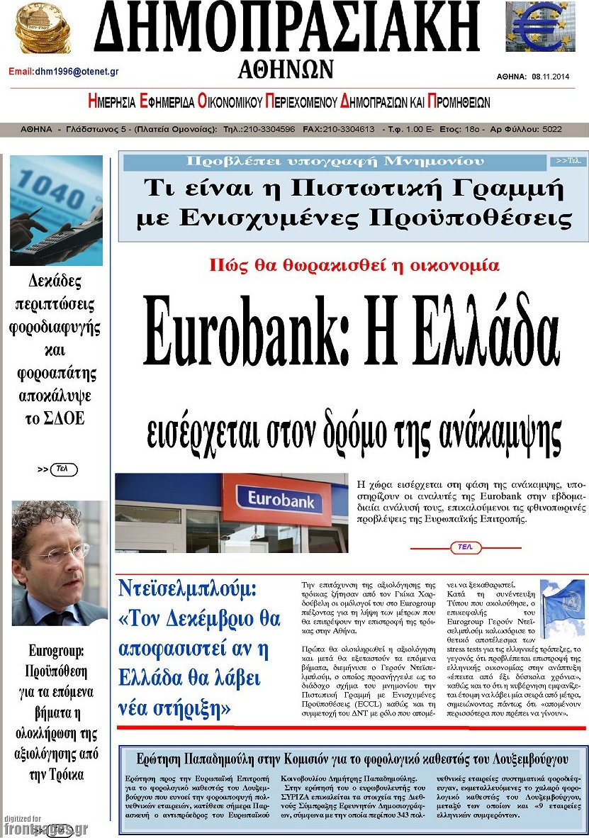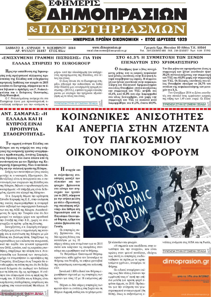 Οι oικονομικές εφημερίδες Enikos Newsroom 07:35, Σάββατο 08 Νοεμβρίου 2014 Media Οι oικονομικές εφημερίδες Διαβάστε τα πρωτοσέλιδα των οικονομικών εφημερίδων: 3 ΕΦΗΜΕΡΙΔΕΣ ΟΙΚΟΝΟΜΙΚΕΣ ΕΦΗΜΕΡΙΔΕΣ ΠΡΩΤΟΣΕΛΙΔΑ Μοιράσου το: σχολίασε κι εσύ (0 σχόλια) Ακολουθήστε το enikos.gr στο Google News και μάθετε πρώτοι όλες τις ειδήσεις Δείτε όλες τις τελευταίες ειδήσεις από την Ελλάδα και τον Κόσμο στο enikos.gr Ειδήσεις Ροή Ειδήσεων 2 ώρες πριν Αγρότες: Πολύωροι αποκλεισμοί στα τελωνεία Προμαχώνα, Εξοχής, Ευζώνων και Νίκης – Κλείνουν τον κόμβο Φιλώτα οι παραγωγοί στη Δυτική Μακεδονία 1 ώρα πριν Νίκος Παππάς: Ζητώ συγγνώμη για αυτό το επεισόδιο – Δεν τον γρονθοκόπησα 3 ώρες πριν Ευρωπαϊκό Συμβούλιο: Όλες οι λεπτομέρειες για το δάνειο των 90 δισ. ευρώ στην Ουκρανία – Τα συμπεράσματα της Συνόδου Κορυφής 3 ώρες πριν Αίγιο: 22χρονη κατήγγειλε ότι έπεσε θύμα βιασμού και ληστείας από συγγενικά της πρόσωπα 1 ώρα πριν Τρομακτικό βίντεο: Η στιγμή της έκρηξης στο τζετ που μετέφερε τον οδηγό του NASCAR, Γκρεγκ Μπιφλ και την οικογένειά του 2 ώρες πριν Αλλαγή σελίδας για 3 ζώδια – «Μία δύσκολη περίοδος φτάνει στο τέλος της» 2 ημέρες πριν 20 χρόνια τα Χριστούγεννα ξεκινούν στα Public με μεγάλη ποικιλία σε δώρα! 3 ώρες πριν Ο σύζυγός της συμπεριφέρεται όπως το παιδί τους – «Χρησιμοποιεί αστείες δικαιολογίες για να μην κάνει δουλειές και να ξοδεύει λεφτά» 1 ώρα πριν Γεμάτος νεροχύτης; 5 σοβαρές ευθύνες που «φοβίζουν» όσους αφήνουν άπλυτα πιάτα 9 λεπτά πριν Γονείς για πρώτη φορά ο Πιτ Ντέιβιντσον και η Έλσι Χιούιτ 15 λεπτά πριν Πούτιν: Η Ουκρανία δεν είναι έτοιμη για ειρηνευτικές συνομιλίες – ο ρωσικός στρατός προελαύνει σε όλα τα μέτωπα 20 λεπτά πριν Βουλή: Αποσύρθηκε προσθήκη για έργα του Ταμειακού Προγράμματος Ανάπτυξης της Γ.Γ. Αθλητισμού μετά τις αντιδράσεις της αντιπολίτευσης 26 λεπτά πριν Νορβηγία: Η πριγκίπισσα Μέτε-Μάριτ πιθανότατα θα υποβληθεί σε μεταμόσχευση πνεύμονα 37 λεπτά πριν Ενίσχυση δρομολογίων του Μετρό τις Κυριακές 21 και 28 Δεκεμβρίου – Κυκλοφοριακές ρυθμίσεις αύριο στη Γραμμή 7 του τραμ λόγω εορταστικών εκδηλώσεων ENIKOS NETWORK Κίνδυνος παραπλάνησης από διαφημίσεις οδοντικών εμφυτευμάτων Καρκίνος του πνεύμονα: Έως 8.000 ζωές μπορούν να σωθούν με την έγκαιρη διάγνωση Επιδόματα και παροχές από τον ΟΠΕΚΑ: Τι πιστώνεται σήμερα στους τραπεζικούς λογαριασμούς Απειλή για τον Προϋπολογισμό τα ληξιπρόθεσμα χρέη των ιδιωτών προς την εφορία – Τι δείχνουν τα στοιχεία Χαρτογραφώντας το «σημείο χωρίς επιστροφή»: Για πρώτη φορά αποκαλύπτεται με λεπτομέρεια το ακανθώδες όριο της ατμόσφαιρας τ... Η Google καταργεί τη λειτουργία «dark web report» – Πώς θα μπορούν οι χρήστες να διαγράφουν τα δεδομένα τους περισσότερα 08:00 , Παρασκευή 19 Δεκεμβρίου 2025 Την Κυριακή με τη Realnews: Δωροεπιταγή 10€ Δωροεπιταγή αξίας 10€ για αγορές άνω των 60€ από τα πολυκαταστήματα FactoryOutlet H προσφορά ι... 05:48 , Παρασκευή 19 Δεκεμβρίου 2025 Οι οικονομικές εφημερίδες 19/12/2025 Διαβάστε τα πρωτοσέλιδα από τις οικονομικές εφημερίδες, σήμερα 19/12/2025. 05:43 , Παρασκευή 19 Δεκεμβρίου 2025 Οι αθλητικές εφημερίδες 19/12/2025 Διαβάστε τα πρωτοσέλιδα από τις αθλητικές εφημερίδες, σήμερα 19/12/2025. 05:38 , Παρασκευή 19 Δεκεμβρίου 2025 Οι πολιτικές εφημερίδες 19/12/2025 Διαβάστε τα πρωτοσέλιδα από τις πολιτικές εφημερίδες, σήμερα 19/12/2025. ΤΕΛΕΥΤΑΙΕΣ ΕΙΔΗΣΕΙΣ 9 λεπτά πριν Γονείς για πρώτη φορά ο Πιτ Ντέιβιντσον και η Έλσι... 15 λεπτά πριν Πούτιν: Η Ουκρανία δεν είναι έτοιμη για ειρηνευτικές... 20 λε