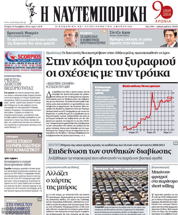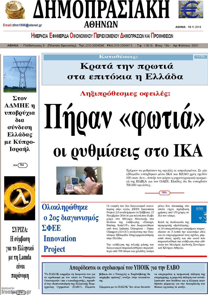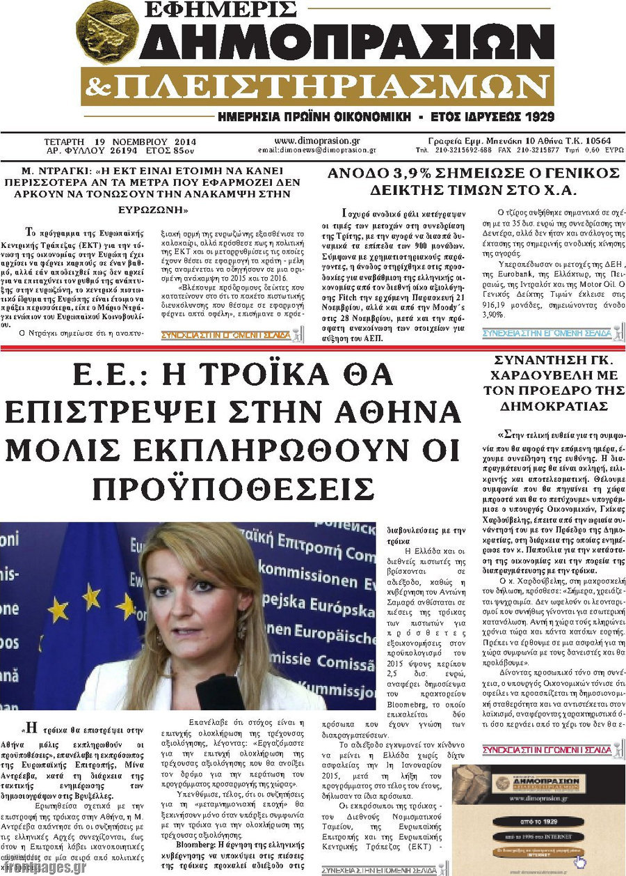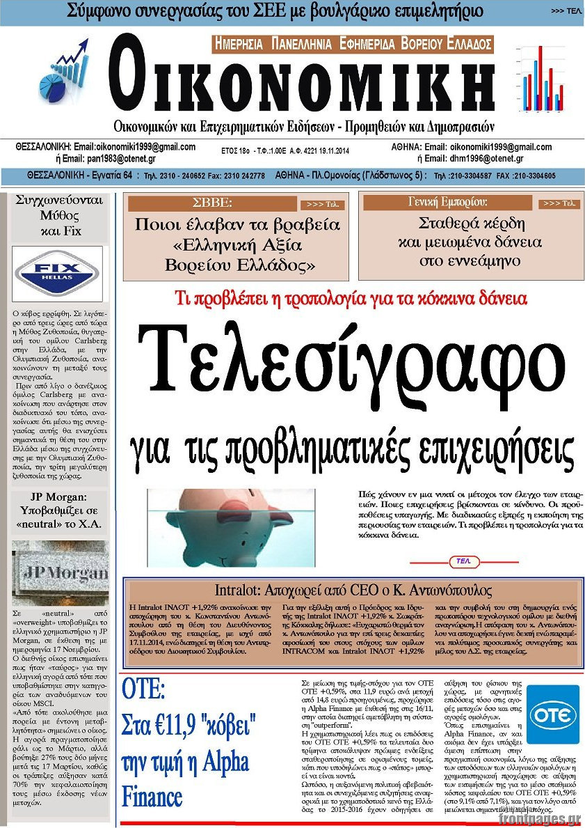 Οι οικονομικές εφημερίδες Enikos Newsroom 07:31, Τετάρτη 19 Νοεμβρίου 2014 Media Οι οικονομικές εφημερίδες Διαβάστε τα πρωτοσέλιδα των οικονομικών εφημερίδων: ΟΙΚΟΝΟΜΙΚΕΣ ΕΦΗΜΕΡΙΔΕΣ ΠΡΩΤΟΣΕΛΙΔΑ Μοιράσου το: σχολίασε κι εσύ (0 σχόλια) Ακολουθήστε το enikos.gr στο Google News και μάθετε πρώτοι όλες τις ειδήσεις Δείτε όλες τις τελευταίες ειδήσεις από την Ελλάδα και τον Κόσμο στο enikos.gr Ειδήσεις Ροή Ειδήσεων 8 ώρες πριν Μητσοτάκης: Αναγκαία η μεταρρύθμιση του πρωτογενούς τομέα – Τα 6 νέα μέτρα για το στεγαστικό και οι αναφορές σε «Ιθάκη» και «πολιτικούς του καναπέ» 7 ώρες πριν Δάνεια σε ελβετικό φράγκο: Τα βασικά σημεία της ρύθμισης – ανάσας για 40.000 δανειολήπτες – Αναλυτικός οδηγός με ερωτήσεις και απαντήσεις 7 ώρες πριν Κυψέλη: Εξιτήριο πήρε η 14χρονη μαθήτρια που μαχαιρώθηκε από την 16χρονη σε σχολείο – «Θέλω να βοηθήσω το παιδί, έχει μπλέξει με κακές παρέες» 6 ώρες πριν Τραμπ: Γιατί κατέθεσε τώρα την αγωγή κατά του BBC – Πώς η κίνησή του εξυπηρετεί το νέο δόγμα του για «αντίσταση» στην Ευρώπη, υπέρ των συντηρητικών 7 ώρες πριν ΟΠΕΚΕΠΕ – Παράνομες επιδοτήσεις: Ελεύθεροι με περιοριστικούς όρους και οι 7 κατηγορούμενοι που απολογήθηκαν σήμερα 6 ώρες πριν Ανακαλύφθηκε βυθισμένη πέτρινη κατασκευή ανοιχτά της Κριμαίας – Αποτελεί μέρος αρχαίας ελληνικής αποικίας 7 ώρες πριν Ύπνος: Αυτό μπορεί να είναι το χειρότερο λάθος για το βιολογικό ρολόι σας, σύμφωνα με ειδικό 8 ώρες πριν Αριθμολογία: Οι άνθρωποι που έχουν γεννηθεί αυτές τις 3 ημερομηνίες, προσελκύουν μεγάλη τύχη πριν από το τέλος του 2025 10 ώρες πριν Οι 7 συμπεριφορές που μαρτυρούν ότι ένας άνδρας επενδύει μακροπρόθεσμα σε μια σχέση 5 λεπτά πριν Κόστα Ρίκα: Το Κογκρέσο απέρριψε το αίτημα για άρση της ασυλίας του προέδρου Τσάβες 13 λεπτά πριν Κολομβία: Νεκροί τέσσερις αστυνομικοί σε βομβιστικές επιθέσεις ανταρτών 21 λεπτά πριν Στάση εργασίας 11:00 – 17:00 σήμερα στα λεωφορεία του ΟΑΣΑ – Ποιες γραμμές θα λειτουργήσουν 36 λεπτά πριν Παλαιστινιακό: «Η λύση των δύο κρατών είναι ο μόνος βιώσιμος δρόμος», τόνισε η Ελλάδα στο Συμβούλιο Ασφαλείας του ΟΗΕ 44 λεπτά πριν Ελένη Καρακάση: «Ένιωθα πολύ αδικημένη, δεν μπορούσα να ελέγξω τον εαυτό μου σε δύσκολες στιγμές» ENIKOS NETWORK Αίτημα ΙΣΑ για την εξαίρεση των προσωπικών γιατρών από τις κατ’ οίκον επισκέψεις Η σκανδιναβική μέθοδος στον ύπνο που μπορεί να σώσει έναν γάμο Πιερρακάκης: Ο προϋπολογισμός συμβάλλει ουσιαστικά στην ενίσχυση της αγοραστικής δύναμης της πλειονότητας των εργαζομένων e-ΕΦΚΑ: Παρατείνεται η προθεσμία για την υποβολή ΑΠΔ – Ποιους αφορά Σύγχρονος Νοστράδαμος: Προειδοποιεί για «μεγάλο γεγονός» τους επόμενους μήνες που θα συγκλονίσει τη Βρετανία και τον κόσμο Τεστ παρατηρητικότητας: Μπορείτε να βρείτε τις 3 διαφορές στις εικόνες με έναν πιγκουίνο σε 14 δευτερόλεπτα περισσότερα 20:06 , Τρίτη 16 Δεκεμβρίου 2025 Ο ΣΚΑΙ καταγγέλλει τον ΕΚΚΟΜΕΔ Επιστολή με την οποία καταγράφει την έντονη διαμαρτυρία του προς τον διευθύνοντα σύμβουλο του... 17:40 , Τρίτη 16 Δεκεμβρίου 2025 Eurovision: Στις 4 Ιανουαρίου αποκαλύπτονται τα 28 τραγούδια του ελληνικού τελικού Η αγωνία τελειώνει, η γιορτή της Eurovision αρχίζει στην ΕΡΤ από τις πρώτες ημέρες της νέας χρ... 17:09 , Τρίτη 16 Δεκεμβρίου 2025 Alter Ego Media: Βαθύτατη θλίψη και ειλικρινή συλλυπητήρια για την απώλεια της Ειρήνης Μαρινάκη Τη βαθύτατη θλίψη και τα ειλικρινή συλλυπητήριά της εκφράζει η Alter Ego Media για τον θάνατο ... 13:00 , Τρίτη 16 Δεκεμβρίου 2025 «Στο Παρά Πέντε 