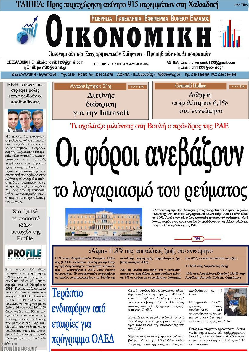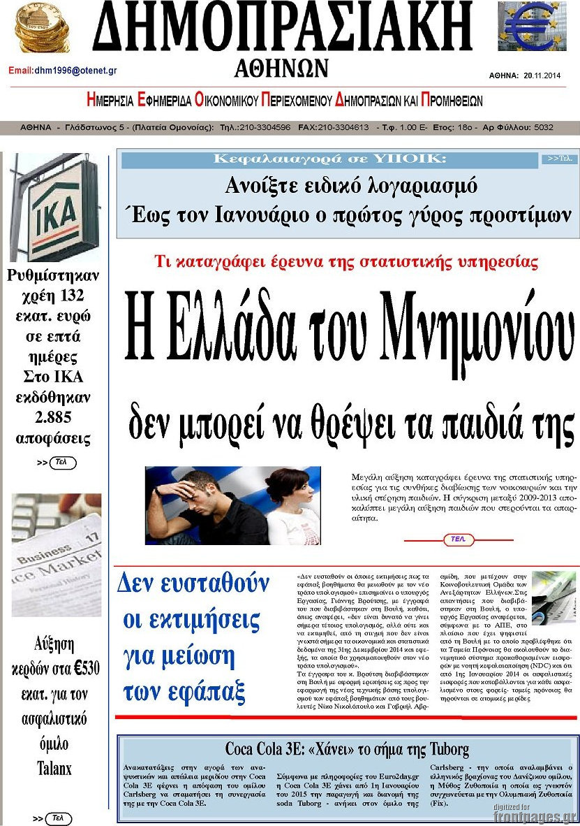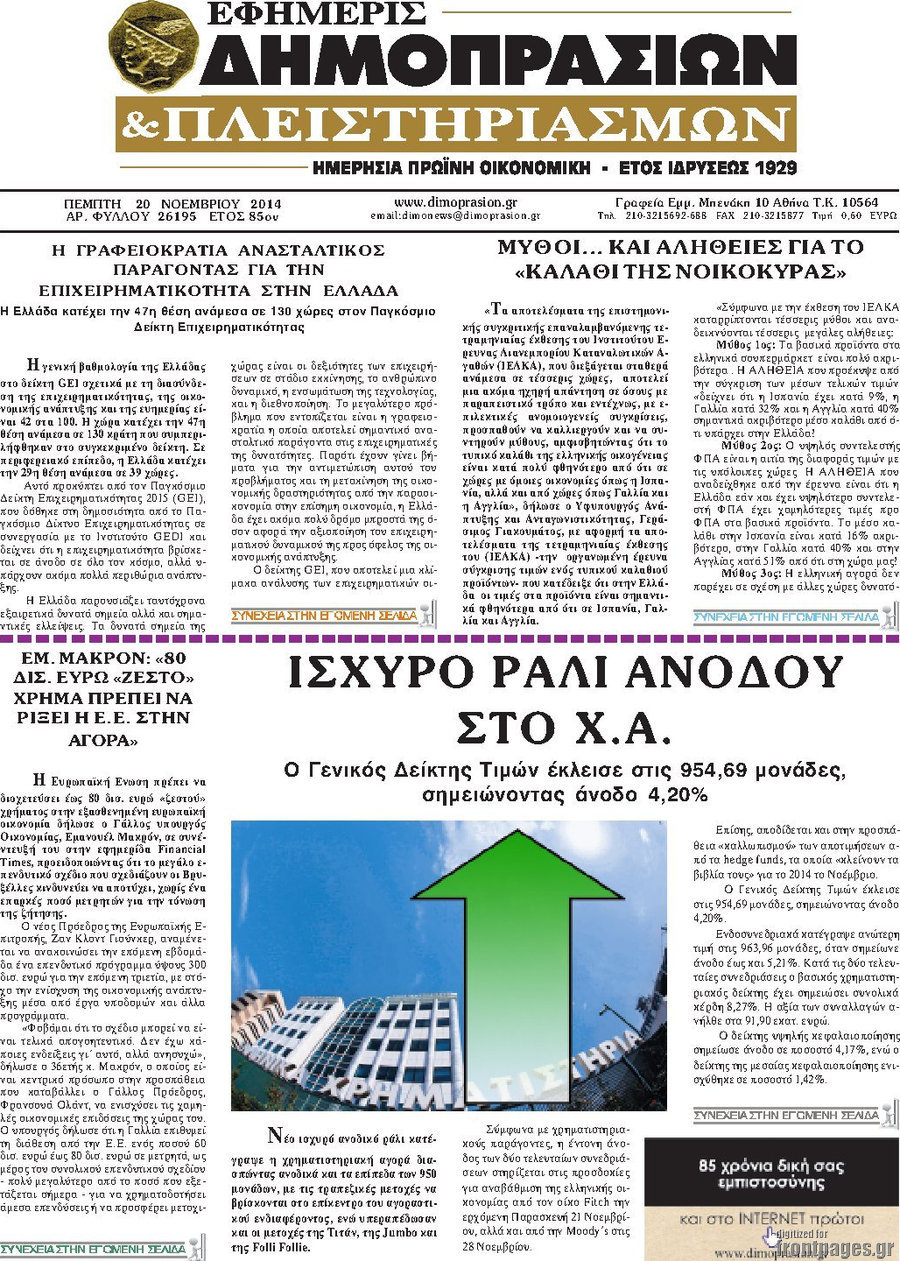 Οι οικονομικές εφημερίδες Enikos Newsroom 07:33, Πέμπτη 20 Νοεμβρίου 2014 Media Οι οικονομικές εφημερίδες Διαβάστε τα πρωτοσέλιδα των οικονομικών εφημερίδων: ΟΙΚΟΝΟΜΙΚΕΣ ΕΦΗΜΕΡΙΔΕΣ ΠΡΩΤΟΣΕΛΙΔΑ Μοιράσου το: σχολίασε κι εσύ (0 σχόλια) Ακολουθήστε το enikos.gr στο Google News και μάθετε πρώτοι όλες τις ειδήσεις Δείτε όλες τις τελευταίες ειδήσεις από την Ελλάδα και τον Κόσμο στο enikos.gr Ειδήσεις Ροή Ειδήσεων 53 λεπτά πριν Πούτιν: «Ανοησίες» και «υστερίες» οι ισχυρισμοί της Ευρώπης για πιθανή σύγκρουση με τη Ρωσία – «Κάνουν πλύση εγκεφάλου» 5 ώρες πριν Έρευνα MRB: Η πρόθεση ψήφου και τα σημαντικότερα προβλήματα – Οι «λέξεις» που εκφράζουν τους πολίτες 2 ώρες πριν Αμοργός: «Θα προσπαθήσω να το κάνω κάθε μέρα» – Ποιος είναι ο αγρότης που έστησε μόνος του το πρώτο μπλόκο στο νησί 2 λεπτά πριν Τραγωδία στην Αλεξανδρούπολη: Παιδάκι 3 ετών μεταφέρθηκε νεκρό από τη μητέρα του στο νοσοκομείο 42 λεπτά πριν Συνάντηση Μητσοτάκη με την Κ.Ο. της ΝΔ: Οι αφίξεις των βουλευτών, τα γλυκά και τα «πηγαδάκια» 5 ώρες πριν Τα 4 ζώδια που ξαναβρίσκουν τον εαυτό τους – «Μπαίνετε επιτέλους στην ουσία των πραγμάτων» 6 ώρες πριν 20 χρόνια τα Χριστούγεννα ξεκινούν στα Public με μεγάλη ποικιλία σε δώρα! 4 ώρες πριν «Δεν είχα κλάψει από τότε που διαγνώστηκα με καρκίνο, ώσπου ένα τηλεφώνημα με έκανε να λυγίσω» – Η συγκλονιστική εξομολόγηση ενός άνδρα 3 ώρες πριν Τα 7 σπάνια χαρακτηριστικά που κάνουν κάποιους ανθρώπους ακαταμάχητους 10 δευτερόλεπτα πριν Χριστουγεννιάτικη γιορτή με τον Σάκη Ρούβα στον ξενώνα «Μαριάννα Β. Βαρδινογιάννη-ΕΛΠΙΔΑ» 2 λεπτά πριν Τραγωδία στην Αλεξανδρούπολη: Παιδάκι 3 ετών μεταφέρθηκε νεκρό από τη μητέρα του στο νοσοκομείο 2 λεπτά πριν Βουλή: Άρση της ασυλίας της Ζωής Κωνσταντοπούλου για μήνυση συκοφαντικής δυσφήμισης 8 λεπτά πριν Ο σπάνιος σεισμός που έλυσε τα χέρια των επιστημόνων – Αποκάλυψε ακριβώς όσα αναζητούσαν 12 λεπτά πριν Τζιτζικώστας από το Στρασβούργο: «Σανίδα σωτηρίας για την ευρωπαϊκή αυτοκινητοβιομηχανία η νέα δέσμη μέτρων που υιοθετήσαμε – Κινητήρες εσωτερικής καύσης και υβριδικά οχήματα και μετά το 2035» ENIKOS NETWORK 5 πράγματα που αποφεύγει γαστρεντερολόγος για να μειώσει τον κίνδυνο καρκίνου του εντέρου Ανησυχητική αύξηση της υπέρτασης στα παιδιά – Πώς θα τα προστατέψουμε; «IRIS Παντού»: Στην κορυφή της Ευρώπης η Ελλάδα με 120 εκατ. ευρώ συναλλαγές το 2025 – Η σύγκριση με τις άλλες χώρες της Ευ... Αδειοδωρόσημο Χριστουγέννων 2025: Πότε γίνεται η καταβολή του και σε ποιους Σύγχρονος Νοστράδαμος: Προειδοποιεί για «μεγάλο γεγονός» τους επόμενους μήνες που θα συγκλονίσει τη Βρετανία και τον κόσμο Τεστ παρατηρητικότητας: Μπορείτε να βρείτε τις 3 διαφορές στις εικόνες με έναν πιγκουίνο σε 14 δευτερόλεπτα περισσότερα 12:35 , Τετάρτη 17 Δεκεμβρίου 2025 Μίρκα Παπακωνσταντίνου: «Δεν ήμουν αισιόδοξη για τα νούμερα – Είμαι ρεαλίστρια» Στα γυρίσματα του εορταστικού επεισοδίου της αγαπημένης σειράς “Το Σόι Σου”, βρέθηκε η κάμερα ... 12:12 , Τετάρτη 17 Δεκεμβρίου 2025 Ακούστε την εκπομπή του Νίκου Χατζηνικολάου 17/12/2025 Ακούστε την εκπομπή του Νίκου Χατζηνικολάου στον ραδιοφωνικό σταθμό RealFm 97,8, την Τετάρτη 1... 11:35 , Τετάρτη 17 Δεκεμβρίου 2025 Home Alone: Το σπίτι της ταινίας θα ανακαινιστεί – Επιστροφή στην αισθητική της δεκαετίας του ’90 Οι νέοι ιδιοκτήτες του πραγματικού σπιτιού που παρουσιάζεται στην κλασική ταινία του 1990 «Hom... 11:25 , Τετάρτη 17 Δεκεμβρίου 2025 Grand Hotel: Απόψε το τελευταίο επεισόδιο της χρονιά