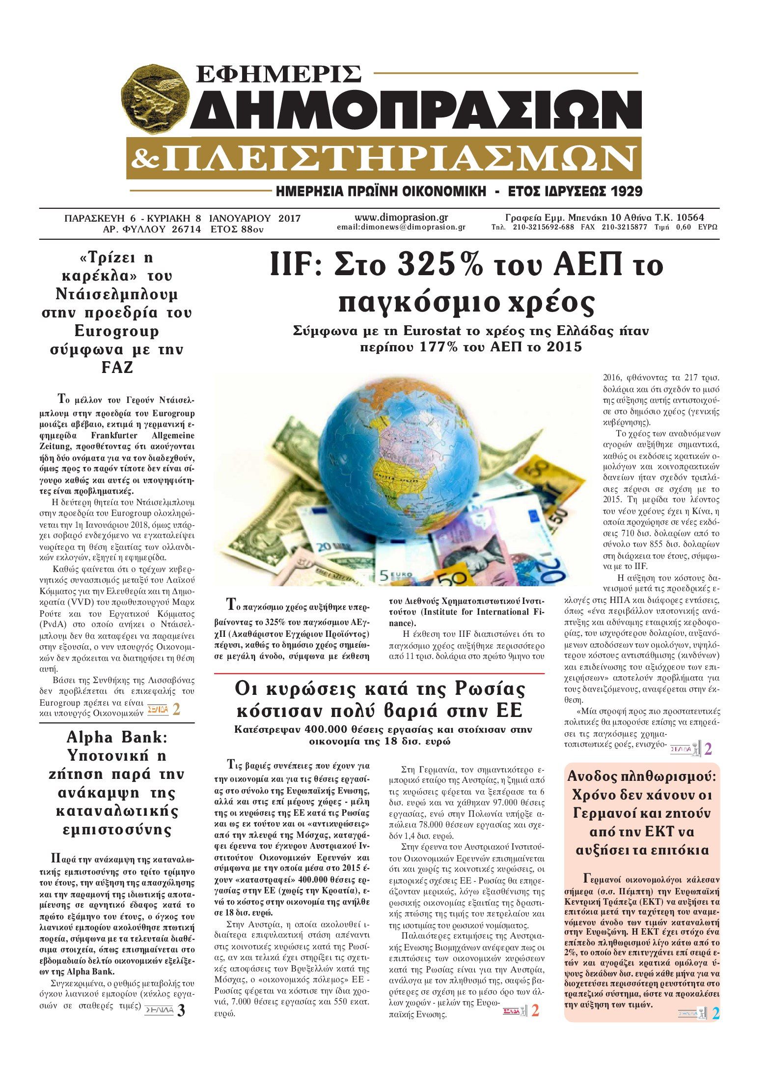 Οι οικονομικές εφημερίδες 6/1/2017 Enikos Newsroom 01:24, Παρασκευή 06 Ιανουαρίου 2017 Media Διαβάστε τα σημερινά πρωτοσέλιδα των οικονομικών εφημερίδων: ΟΙΚΟΝΟΜΙΚΕΣ ΕΦΗΜΕΡΙΔΕΣ ΠΡΩΤΟΣΕΛΙΔΑ Μοιράσου το: σχολίασε κι εσύ (0 σχόλια) Ακολουθήστε το enikos.gr στο Google News και μάθετε πρώτοι όλες τις ειδήσεις Δείτε όλες τις τελευταίες ειδήσεις από την Ελλάδα και τον Κόσμο στο enikos.gr Ειδήσεις Ροή Ειδήσεων 4 ώρες πριν Αυξάνουν την πίεση προς την κυβέρνηση οι αγρότες: Κλείνουν παρακαμπτήριους και ανοίγουν διόδια – Τι θα γίνει τις γιορτές 3 ώρες πριν ΟΠΕΚΕΠΕ: Προφυλακιστέος ο φερόμενος αρχηγός και ο λογιστής της εγκληματικής οργάνωσης 4 ώρες πριν Φοινικούντα: Το Σάββατο απολογείται ο 30χρονος γιος γνωστού επιχειρηματία της Πλάκας που παραδόθηκε – Όσα είπε στους αστυνομικούς και ο ρόλος του στο έγκλημα 4 ώρες πριν Μπορεί ο Μαδούρο να αντέξει τον αποκλεισμό του Τραμπ; Τι θα χρειαστεί η Ουάσινγκτον για να τον ανατρέψει 3 ώρες πριν ΑΕΚ – Κραϊόβα 3-2: Επική ανατροπή και πρόκριση στους «16» του Conference League η Ένωση 4 ώρες πριν Αρχαιολόγοι ανακάλυψαν ρωμαϊκά τεχνουργήματα από μια πόλη που δεν υπήρξε ποτέ – Τα τρία εντυπωσιακά κτίρια και ο αμφορέας με τις… σαρδέλες 5 ώρες πριν Ύπνος: Η απλή βραδινή ρουτίνα για να προστατεύσετε τα μαλλιά σας από το κρύο κατά τη διάρκεια του χειμώνα 6 ώρες πριν Manifesting: Πώς να συναντήσετε τον σύντροφο της ζωής σας, ανάλογα με τον μήνα γέννησής σας 2 ημέρες πριν 20 χρόνια τα Χριστούγεννα ξεκινούν στα Public με μεγάλη ποικιλία σε δώρα! 11 λεπτά πριν GNTM: «Κλείδωσαν» οι τέσσερις φιναλίστ – Μεγάλη ανατροπή στις τελευταίες αποχωρήσεις 25 λεπτά πριν Γιώργος Μαζωνάκης: Αποθεώθηκε στην πρεμιέρα του στην «Ακτή Πειραιώς» λίγες ώρες μετά τις καταγγελίες – «Είμαι αληθινός», είπε με νόημα 41 λεπτά πριν Πόλεμος στην Ουκρανία: Ρωσικά drones έπληξαν την Οδησσό – Μία νεκρή και ζημιές σε ενεργειακές υποδομές 48 λεπτά πριν ΑΕΚ-Κραϊόβα: Τα highlights της μυθικής ανατροπής της «Ένωσης» 1 ώρα πριν Μιχάλης Χρυσοχοΐδης από την Κωνσταντινούπολη: Κοινές επιχειρήσεις Ελλάδας – Τουρκίας ενάντια στο οργανωμένο έγκλημα ENIKOS NETWORK Σε περίοδο αυξημένης δραστηριότητας η γρίπη στην Ελλάδα-Μέτρα προστασίας από τον ΕΟΔΥ Σκέφτεστε συνέχεια συζητήσεις που έχετε κάνει; Τι σημαίνει αυτό, σύμφωνα με ειδικό Στεγαστικό: Τι λέει η ΠΟΜΙΔΑ για τα νέα μέτρα που ανακοίνωσε ο Κυριάκος Μητσοτάκης Λαγκάρντ: Αισιόδοξη για την ανάπτυξη της Ευρωζώνης, αβέβαιη για τον πληθωρισμό Χαρτογραφώντας το «σημείο χωρίς επιστροφή»: Για πρώτη φορά αποκαλύπτεται με λεπτομέρεια το ακανθώδες όριο της ατμόσφαιρας τ... Η Google καταργεί τη λειτουργία «dark web report» – Πώς θα μπορούν οι χρήστες να διαγράφουν τα δεδομένα τους περισσότερα 02:50 , Παρασκευή 19 Δεκεμβρίου 2025 GNTM: «Κλείδωσαν» οι τέσσερις φιναλίστ – Μεγάλη ανατροπή στις τελευταίες αποχωρήσεις Για προτελευταία φορά εμφανίστηκαν στο πλατό του GNTM οι φιναλίστ του φετινού κύκλου, το βράδυ... 17:45 , Πέμπτη 18 Δεκεμβρίου 2025 ROUK ZOUK: Εορταστικό επεισόδιο με καλεσμένους τους πρωταγωνιστές του «Γιατί ρε πατέρα» Το Σάββατο 20 Δεκεμβρίου στις 21:00, η Ζέτα Μακρυπούλια υποδέχεται εκλεκτούς ηθοποιούς που όλο... 17:20 , Πέμπτη 18 Δεκεμβρίου 2025 Άγιος έρωτας: Η Χριστίνα εξομολογείται στον πατέρα Νικόλαο, απόψε στις 21:00 στον Alpha Η Νότα αποφασίζει να εκδικηθεί τον Πέτρο και τον Στέφανο, για χάρη του Λούη, όμως τα πράγματα ... 16:50 , Πέμπτη 18 Δεκεμβρίου 2025 Να μ’ αγαπάς: Ζωή και Φωτεινή συμφιλιώνονται ως μάνα με κόρη, απόψε στις 2