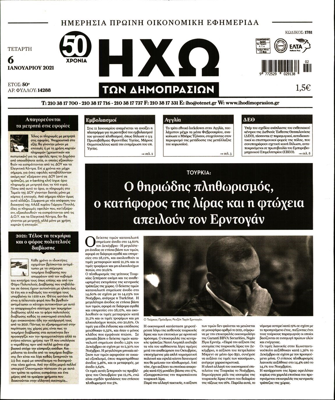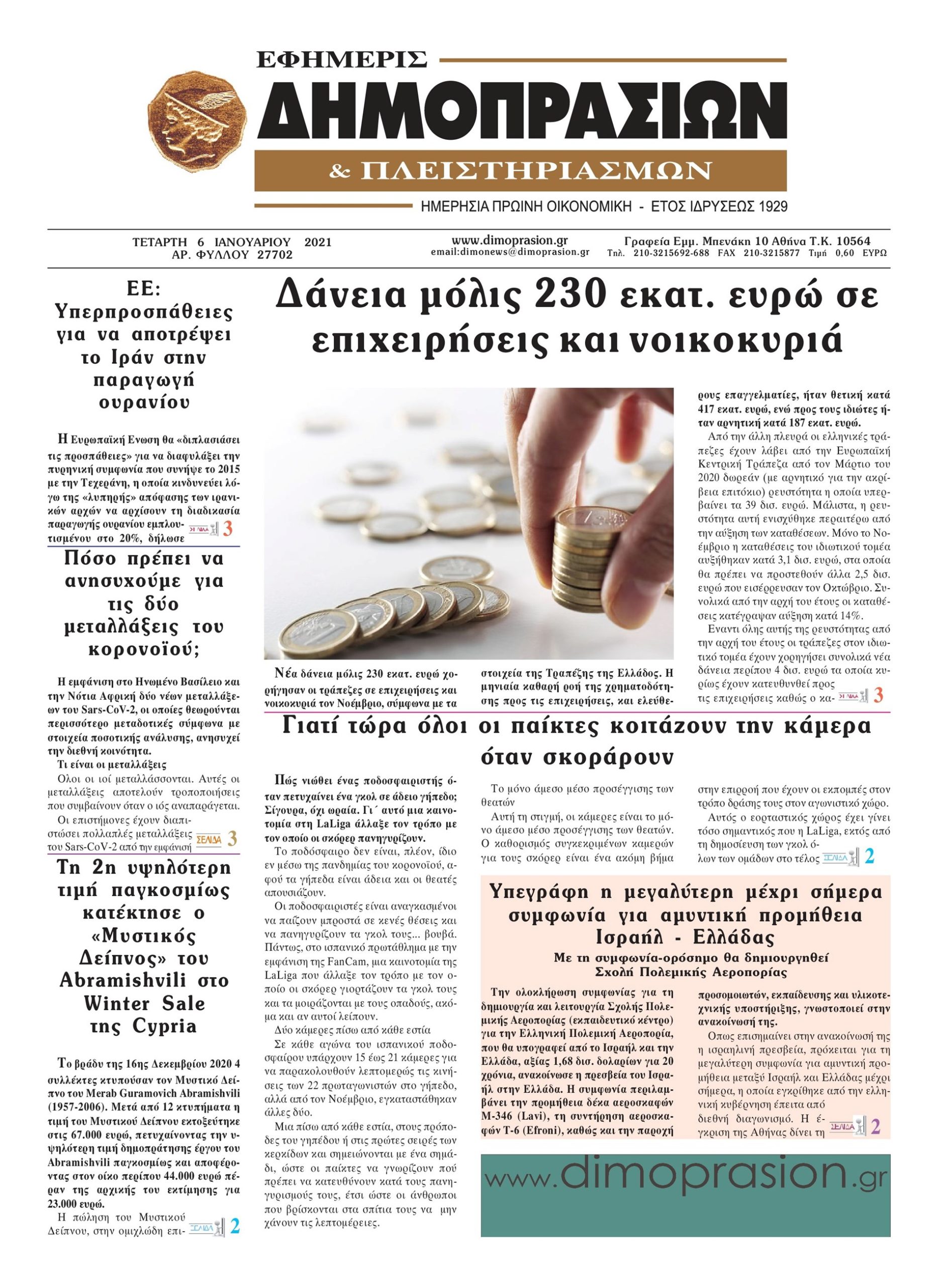Οι οικονομικές εφημερίδες 6/1/2021 Διονύσης Νίκκας 06:33, Τετάρτη 06 Ιανουαρίου 2021 Media Διαβάστε τα πρωτοσέλιδα των οικονομικών εφημερίδων… ΟΙΚΟΝΟΜΙΚΕΣ ΕΦΗΜΕΡΙΔΕΣ Μοιράσου το: σχολίασε κι εσύ (0 σχόλια) Ακολουθήστε το enikos.gr στο Google News και μάθετε πρώτοι όλες τις ειδήσεις Δείτε όλες τις τελευταίες ειδήσεις από την Ελλάδα και τον Κόσμο στο enikos.gr Ειδήσεις Ροή Ειδήσεων 45 λεπτά πριν Ευρωπαϊκή Ένωση: Χωρίς συμφωνία, για την μακροπρόθεσμη χρηματοδότηση της Ουκρανίας, ολοκληρώθηκε η Σύνοδος Κορυφής στις Βρυξέλλες 4 ώρες πριν ΟΠΕΚΕΠΕ: Προφυλακιστέος ο φερόμενος αρχηγός και ο λογιστής της εγκληματικής οργάνωσης 5 ώρες πριν Αυξάνουν την πίεση προς την κυβέρνηση οι αγρότες: Κλείνουν παρακαμπτήριους και ανοίγουν διόδια – Τι θα γίνει τις γιορτές 5 ώρες πριν Φοινικούντα: Το Σάββατο απολογείται ο 30χρονος γιος γνωστού επιχειρηματία της Πλάκας που παραδόθηκε – Όσα είπε στους αστυνομικούς και ο ρόλος του στο έγκλημα 4 ώρες πριν ΑΕΚ – Κραϊόβα 3-2: Επική ανατροπή και πρόκριση στους «16» του Conference League η Ένωση 5 ώρες πριν Αρχαιολόγοι ανακάλυψαν ρωμαϊκά τεχνουργήματα από μια πόλη που δεν υπήρξε ποτέ – Τα τρία εντυπωσιακά κτίρια και ο αμφορέας με τις… σαρδέλες 6 ώρες πριν Ύπνος: Η απλή βραδινή ρουτίνα για να προστατεύσετε τα μαλλιά σας από το κρύο κατά τη διάρκεια του χειμώνα 7 ώρες πριν Manifesting: Πώς να συναντήσετε τον σύντροφο της ζωής σας, ανάλογα με τον μήνα γέννησής σας 2 ημέρες πριν 20 χρόνια τα Χριστούγεννα ξεκινούν στα Public με μεγάλη ποικιλία σε δώρα! 26 δευτερόλεπτα πριν Στη Φλόριντα σήμερα οι διαβουλεύσεις σχετικά με τα επόμενα στάδια για τη Λωρίδα της Γάζας 5 λεπτά πριν Σίσσυ Τουμάση: «Είμαι ασθενοφοβική πάρα πολύ και με πιάνει μια παράνοια μ’ αυτό» 29 λεπτά πριν Ντόναλντ Τραμπ: Δεν χρειάζομαι την έγκριση του Κογκρέσου για να διατάξω στρατιωτικά πλήγματα στη Βενεζουέλα 45 λεπτά πριν Ευρωπαϊκή Ένωση: Χωρίς συμφωνία, για την μακροπρόθεσμη χρηματοδότηση της Ουκρανίας, ολοκληρώθηκε η Σύνοδος Κορυφής στις Βρυξέλλες 60 λεπτά πριν GNTM: «Κλείδωσαν» οι τέσσερις φιναλίστ – Μεγάλη ανατροπή στις τελευταίες αποχωρήσεις ENIKOS NETWORK Σε περίοδο αυξημένης δραστηριότητας η γρίπη στην Ελλάδα-Μέτρα προστασίας από τον ΕΟΔΥ Σκέφτεστε συνέχεια συζητήσεις που έχετε κάνει; Τι σημαίνει αυτό, σύμφωνα με ειδικό Στεγαστικό: Τι λέει η ΠΟΜΙΔΑ για τα νέα μέτρα που ανακοίνωσε ο Κυριάκος Μητσοτάκης Λαγκάρντ: Αισιόδοξη για την ανάπτυξη της Ευρωζώνης, αβέβαιη για τον πληθωρισμό Χαρτογραφώντας το «σημείο χωρίς επιστροφή»: Για πρώτη φορά αποκαλύπτεται με λεπτομέρεια το ακανθώδες όριο της ατμόσφαιρας τ... Η Google καταργεί τη λειτουργία «dark web report» – Πώς θα μπορούν οι χρήστες να διαγράφουν τα δεδομένα τους περισσότερα 02:50 , Παρασκευή 19 Δεκεμβρίου 2025 GNTM: «Κλείδωσαν» οι τέσσερις φιναλίστ – Μεγάλη ανατροπή στις τελευταίες αποχωρήσεις Για προτελευταία φορά εμφανίστηκαν στο πλατό του GNTM οι φιναλίστ του φετινού κύκλου, το βράδυ... 17:45 , Πέμπτη 18 Δεκεμβρίου 2025 ROUK ZOUK: Εορταστικό επεισόδιο με καλεσμένους τους πρωταγωνιστές του «Γιατί ρε πατέρα» Το Σάββατο 20 Δεκεμβρίου στις 21:00, η Ζέτα Μακρυπούλια υποδέχεται εκλεκτούς ηθοποιούς που όλο... 17:20 , Πέμπτη 18 Δεκεμβρίου 2025 Άγιος έρωτας: Η Χριστίνα εξομολογείται στον πατέρα Νικόλαο, απόψε στις 21:00 στον Alpha Η Νότα αποφασίζει να εκδικηθεί τον Πέτρο και τον Στέφανο, για χάρη του Λούη, όμως τα πράγματα ... 16:50 , Πέμπτη 18 Δεκεμβρίου 2025 Να μ’ αγαπάς: Ζωή και Φωτεινή συμφιλιώνονται ως μ