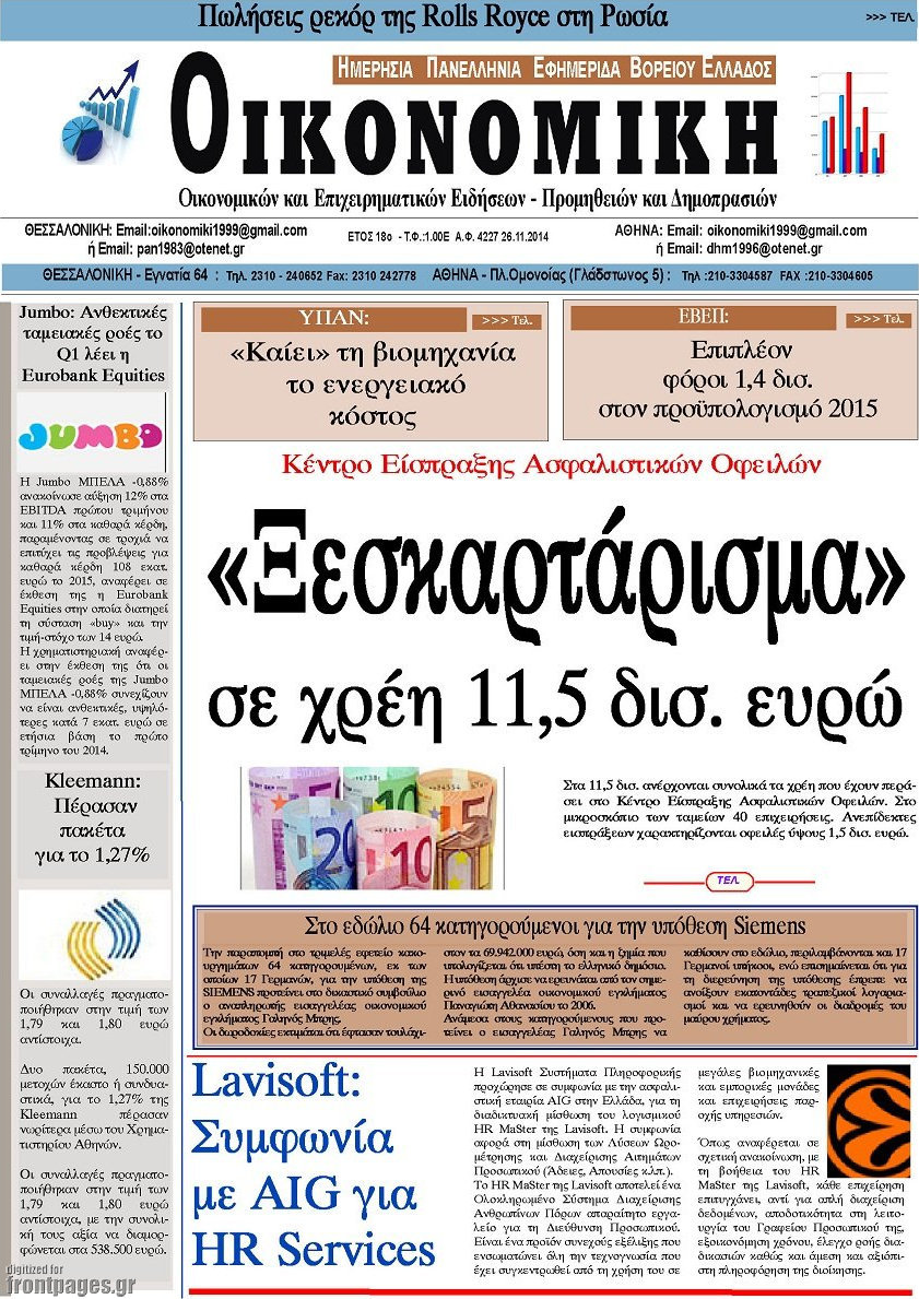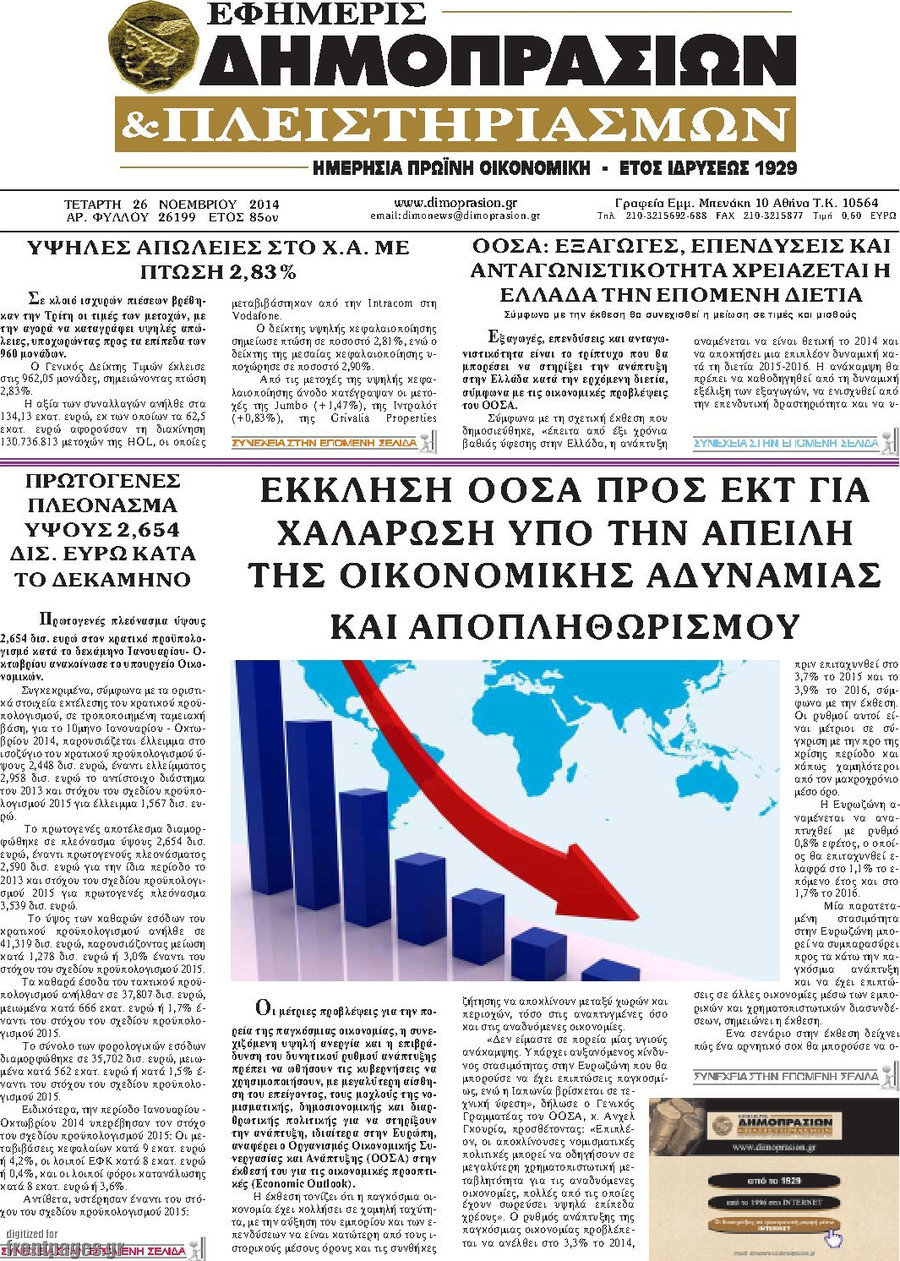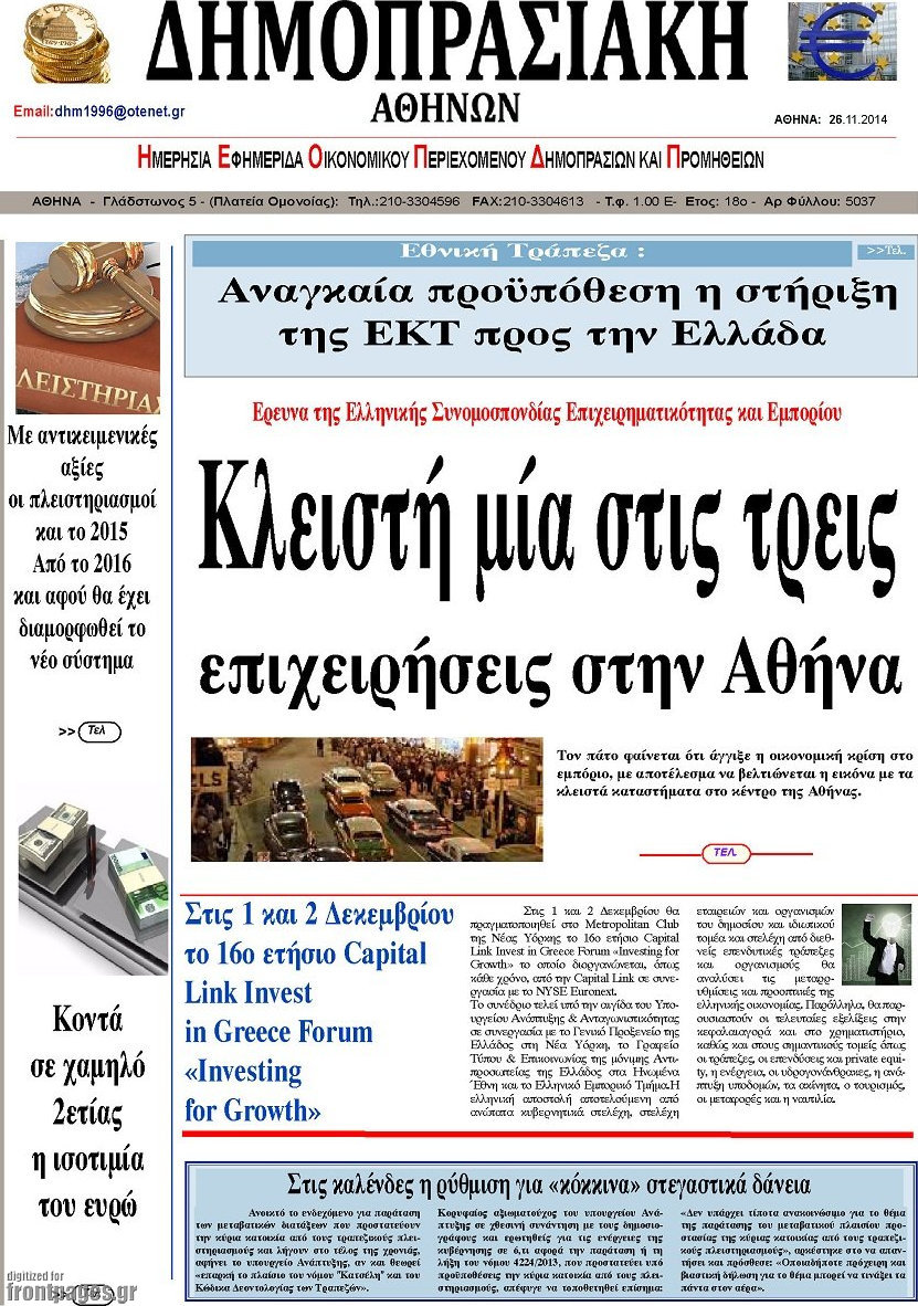 Οι οικονομικές εφημερίδες Enikos Newsroom 07:21, Τετάρτη 26 Νοεμβρίου 2014 Media Οι οικονομικές εφημερίδες Διαβάστε τα πρωτοσέλιδα των οικονομικών εφημερίδων: ΟΙΚΟΝΟΜΙΚΕΣ ΕΦΗΜΕΡΙΔΕΣ ΠΡΩΤΟΣΕΛΙΔΑ Μοιράσου το: σχολίασε κι εσύ (0 σχόλια) Ακολουθήστε το enikos.gr στο Google News και μάθετε πρώτοι όλες τις ειδήσεις Δείτε όλες τις τελευταίες ειδήσεις από την Ελλάδα και τον Κόσμο στο enikos.gr Ειδήσεις Ροή Ειδήσεων 3 ώρες πριν Νίκος Παππάς: «Είχα λάθος αντίδραση στη δική του δράση-πρόκληση – Δεν θα αναλύσω σε τι κατάσταση ήταν ο δημοσιογράφος» 59 λεπτά πριν Νίκος Γιαννόπουλος για Νίκο Παππά: «Είναι επικίνδυνος, θα του κάνω ασφαλιστικά» – ΒΙΝΤΕΟ 2 ώρες πριν Αλεξανδρούπολη: Πολυοργανική ανεπάρκεια λόγω υποσιτισμού η αιτία θανάτου του 3χρονου αγοριού 2 ώρες πριν Δημοσκόπηση Pulse: Η διαφορά ΝΔ-ΠΑΣΟΚ – Με ποια κριτήρια θα ψηφίσουν οι πολίτες στις επόμενες εκλογές 4 ώρες πριν Συγκλονιστικό βίντεο: Τρόμος για τουρίστες που σώθηκαν την τελευταία στιγμή από λεωφορείο που κατρακυλούσε σε φαράγγι 1 ώρα πριν Ύπνος: Ειδικός εξηγεί τον πραγματικό λόγο που ξυπνάτε στις 4 τα ξημερώματα – Ο ρόλος των ορμονών και του κιρκάδιου ρυθμού 2 ώρες πριν Αριθμολογία: Οι άνθρωποι που έχουν γεννηθεί αυτές τις 4 ημερομηνίες, είναι τρυφεροί και αγαπούν ανιδιοτελώς 3 ώρες πριν Καθρέφτες μπάνιου: Το απλό κόλπο με την οδοντόκρεμα για να μην θολώνουν 14 ώρες πριν 20 χρόνια τα Χριστούγεννα ξεκινούν στα Public με μεγάλη ποικιλία σε δώρα! 18 δευτερόλεπτα πριν Εκτός ευρωομάδας ΣΥΡΙΖΑ ο Νίκος Παππάς μετά την επίθεση στον δημοσιογράφο Νίκο Γιαννόπουλο – Η μήνυση και οι νέες δηλώσεις 34 δευτερόλεπτα πριν Κύπελλο Ελλάδας: Η Μαρκό έστειλε τον ΠΑΟΚ στον Ολυμπιακό… μέσω Ατρόμητου 4 λεπτά πριν Άκης Σκέρτσος: Μήνυση και αγωγή κατά της Ζωής Κωνσταντοπούλου θα καταθέσει ο υπουργός Επικρατείας 13 λεπτά πριν Μυστήριο με τεράστιες κυκλικές πέτρες 200 κιλών – Ανακαλύφθηκαν τυχαία κατά τη διάρκεια οδικών έργων και κανείς δεν ξέρει από πού προέρχονται 16 λεπτά πριν Τάκης Ζαχαράτος και Έλενα Παπαρίζου μαζί στη σκηνή – Πότε κάνουν πρεμιέρα; ENIKOS NETWORK Αϋπνία: Το κόλπο που θα σας βοηθήσει να κοιμηθείτε απόψε – Είναι απλό και έχει αποτέλεσμα 2,6 εκατομμύρια πολίτες έχουν ήδη εμβολιαστεί κατά της γρίπης ΚΕΠΕ: Οι 3 διακριτές συμβολές των ΜμΕ και της μεταποίησης στην ελληνική οικονομία Χειμερινές εκπτώσεις: Πότε αρχίζουν και τι πρέπει να προσέξουν οι καταναλωτές Χαρτογραφώντας το «σημείο χωρίς επιστροφή»: Για πρώτη φορά αποκαλύπτεται με λεπτομέρεια το ακανθώδες όριο της ατμόσφαιρας τ... Η Google καταργεί τη λειτουργία «dark web report» – Πώς θα μπορούν οι χρήστες να διαγράφουν τα δεδομένα τους περισσότερα 22:24 , Τετάρτη 17 Δεκεμβρίου 2025 Το Σπίτι Δίπλα Στο Ποτάμι: Σε κίνδυνο η υγεία του Απόστολου – Τι θα δούμε απόψε “Το Σπίτι Δίπλα στο Ποτάμι” ξετυλίγει το νήμα της ζωής των πέντε αδελφών με καταισ... 21:14 , Τετάρτη 17 Δεκεμβρίου 2025 Παιχνίδια Εκδίκησης: Θα καταφέρει ο Χρήστος να κλονίσει την εμπιστοσύνη της Μάγιας απέναντι στον Άγη; Τα «Παιχνίδια Εκδίκησης» έρχονται απόψε στις 22:30, στον Αντ1, με το τελευταίο επεισόδιο της χ... 20:57 , Τετάρτη 17 Δεκεμβρίου 2025 Άγιος Έρωτας: Η Χλόη καταθέτει εναντίον του πατέρα της και ο Χάρης αποκαλύπτει στον Κλεάνθη ότι δεν είναι ο βιολογικός του πατέρας. Γεμάτο αποκαλύψεις είναι το νέο επεισόδιο της σειράς “Άγιος Έρωτας” απόψε στις 21:... 20:15 , Τετάρτη 17 Δεκεμβρίου 2025 Η ανακοίνωση της ΕΣΗΕΑ για την επίθεση του Ευρωβουλευτή Νίκου Παπ
