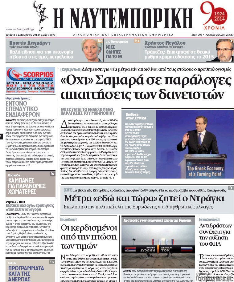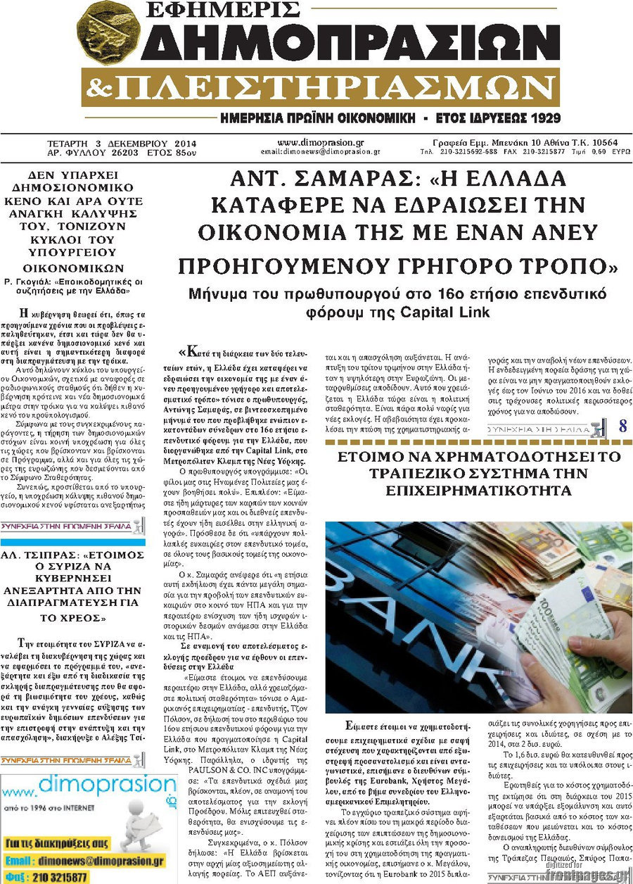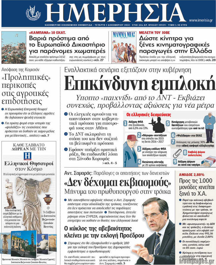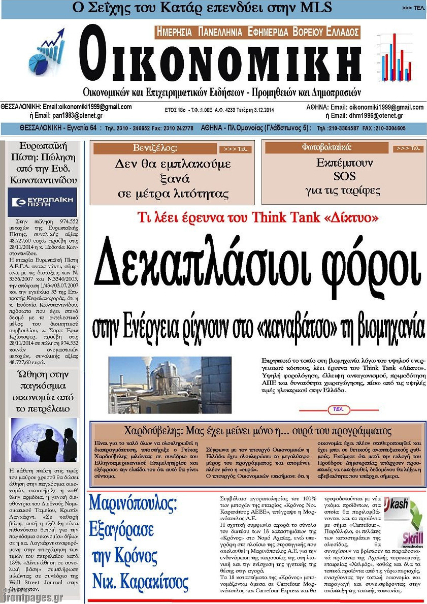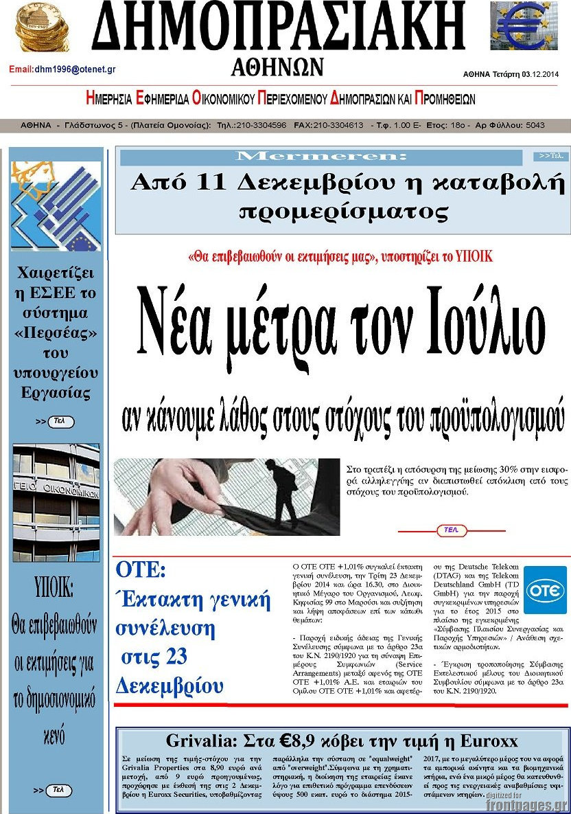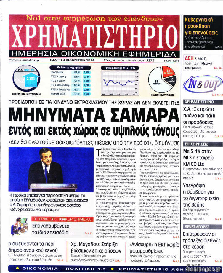 Οι οικονομικές εφημερίδες Enikos Newsroom 08:05, Τετάρτη 03 Δεκεμβρίου 2014 Media Οι οικονομικές εφημερίδες Διαβάστε τα πρωτοσέλιδα των οικονομικών εφημερίδων: ΟΙΚΟΝΟΜΙΚΕΣ ΕΦΗΜΕΡΙΔΕΣ ΠΡΩΤΟΣΕΛΙΔΑ Μοιράσου το: σχολίασε κι εσύ (0 σχόλια) Ακολουθήστε το enikos.gr στο Google News και μάθετε πρώτοι όλες τις ειδήσεις Δείτε όλες τις τελευταίες ειδήσεις από την Ελλάδα και τον Κόσμο στο enikos.gr Ειδήσεις Ροή Ειδήσεων 8 ώρες πριν Μητσοτάκης: Αναγκαία η μεταρρύθμιση του πρωτογενούς τομέα – Τα 6 νέα μέτρα για το στεγαστικό και οι αναφορές σε «Ιθάκη» και «πολιτικούς του καναπέ» 7 ώρες πριν Δάνεια σε ελβετικό φράγκο: Τα βασικά σημεία της ρύθμισης – ανάσας για 40.000 δανειολήπτες – Αναλυτικός οδηγός με ερωτήσεις και απαντήσεις 7 ώρες πριν Κυψέλη: Εξιτήριο πήρε η 14χρονη μαθήτρια που μαχαιρώθηκε από την 16χρονη σε σχολείο – «Θέλω να βοηθήσω το παιδί, έχει μπλέξει με κακές παρέες» 6 ώρες πριν Τραμπ: Γιατί κατέθεσε τώρα την αγωγή κατά του BBC – Πώς η κίνησή του εξυπηρετεί το νέο δόγμα του για «αντίσταση» στην Ευρώπη, υπέρ των συντηρητικών 7 ώρες πριν ΟΠΕΚΕΠΕ – Παράνομες επιδοτήσεις: Ελεύθεροι με περιοριστικούς όρους και οι 7 κατηγορούμενοι που απολογήθηκαν σήμερα 6 ώρες πριν Ανακαλύφθηκε βυθισμένη πέτρινη κατασκευή ανοιχτά της Κριμαίας – Αποτελεί μέρος αρχαίας ελληνικής αποικίας 7 ώρες πριν Ύπνος: Αυτό μπορεί να είναι το χειρότερο λάθος για το βιολογικό ρολόι σας, σύμφωνα με ειδικό 8 ώρες πριν Αριθμολογία: Οι άνθρωποι που έχουν γεννηθεί αυτές τις 3 ημερομηνίες, προσελκύουν μεγάλη τύχη πριν από το τέλος του 2025 10 ώρες πριν Οι 7 συμπεριφορές που μαρτυρούν ότι ένας άνδρας επενδύει μακροπρόθεσμα σε μια σχέση 2 λεπτά πριν Εφημερεύοντα φαρμακεία σε Αθήνα και Θεσσαλονίκη (17/12) 7 λεπτά πριν Κόστα Ρίκα: Το Κογκρέσο απέρριψε το αίτημα για άρση της ασυλίας του προέδρου Τσάβες 15 λεπτά πριν Κολομβία: Νεκροί τέσσερις αστυνομικοί σε βομβιστικές επιθέσεις ανταρτών 23 λεπτά πριν Στάση εργασίας 11:00 – 17:00 σήμερα στα λεωφορεία του ΟΑΣΑ – Ποιες γραμμές θα λειτουργήσουν 39 λεπτά πριν Παλαιστινιακό: «Η λύση των δύο κρατών είναι ο μόνος βιώσιμος δρόμος», τόνισε η Ελλάδα στο Συμβούλιο Ασφαλείας του ΟΗΕ ENIKOS NETWORK Αίτημα ΙΣΑ για την εξαίρεση των προσωπικών γιατρών από τις κατ’ οίκον επισκέψεις Η σκανδιναβική μέθοδος στον ύπνο που μπορεί να σώσει έναν γάμο Πιερρακάκης: Ο προϋπολογισμός συμβάλλει ουσιαστικά στην ενίσχυση της αγοραστικής δύναμης της πλειονότητας των εργαζομένων e-ΕΦΚΑ: Παρατείνεται η προθεσμία για την υποβολή ΑΠΔ – Ποιους αφορά Σύγχρονος Νοστράδαμος: Προειδοποιεί για «μεγάλο γεγονός» τους επόμενους μήνες που θα συγκλονίσει τη Βρετανία και τον κόσμο Τεστ παρατηρητικότητας: Μπορείτε να βρείτε τις 3 διαφορές στις εικόνες με έναν πιγκουίνο σε 14 δευτερόλεπτα περισσότερα 20:06 , Τρίτη 16 Δεκεμβρίου 2025 Ο ΣΚΑΙ καταγγέλλει τον ΕΚΚΟΜΕΔ Επιστολή με την οποία καταγράφει την έντονη διαμαρτυρία του προς τον διευθύνοντα σύμβουλο του... 17:40 , Τρίτη 16 Δεκεμβρίου 2025 Eurovision: Στις 4 Ιανουαρίου αποκαλύπτονται τα 28 τραγούδια του ελληνικού τελικού Η αγωνία τελειώνει, η γιορτή της Eurovision αρχίζει στην ΕΡΤ από τις πρώτες ημέρες της νέας χρ... 17:09 , Τρίτη 16 Δεκεμβρίου 2025 Alter Ego Media: Βαθύτατη θλίψη και ειλικρινή συλλυπητήρια για την απώλεια της Ειρήνης Μαρινάκη Τη βαθύτατη θλίψη και τα ειλικρινή συλλυπητήριά της εκφράζει η Alter Ego Media για τον θάνατο ... 13:00 , Τρίτη 16 Δεκεμβρίου 2025 «Στο Παρά Πέντε – 20 Χρόνια Μετά»: Κυκλοφόρησε το τρέιλερ του