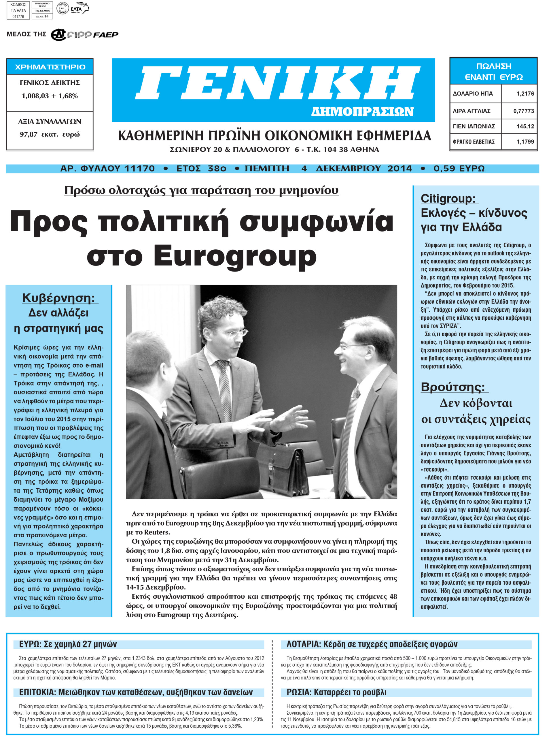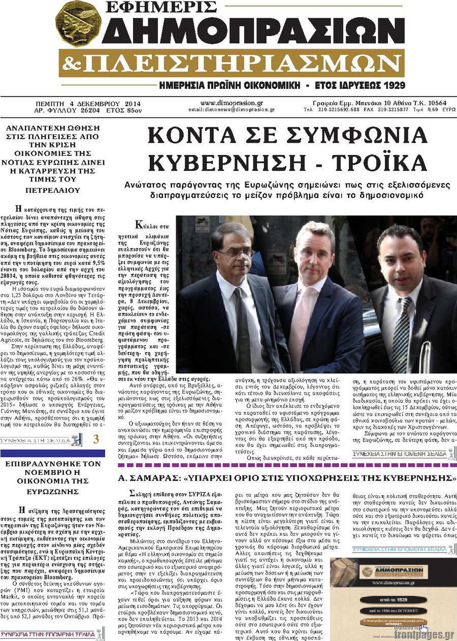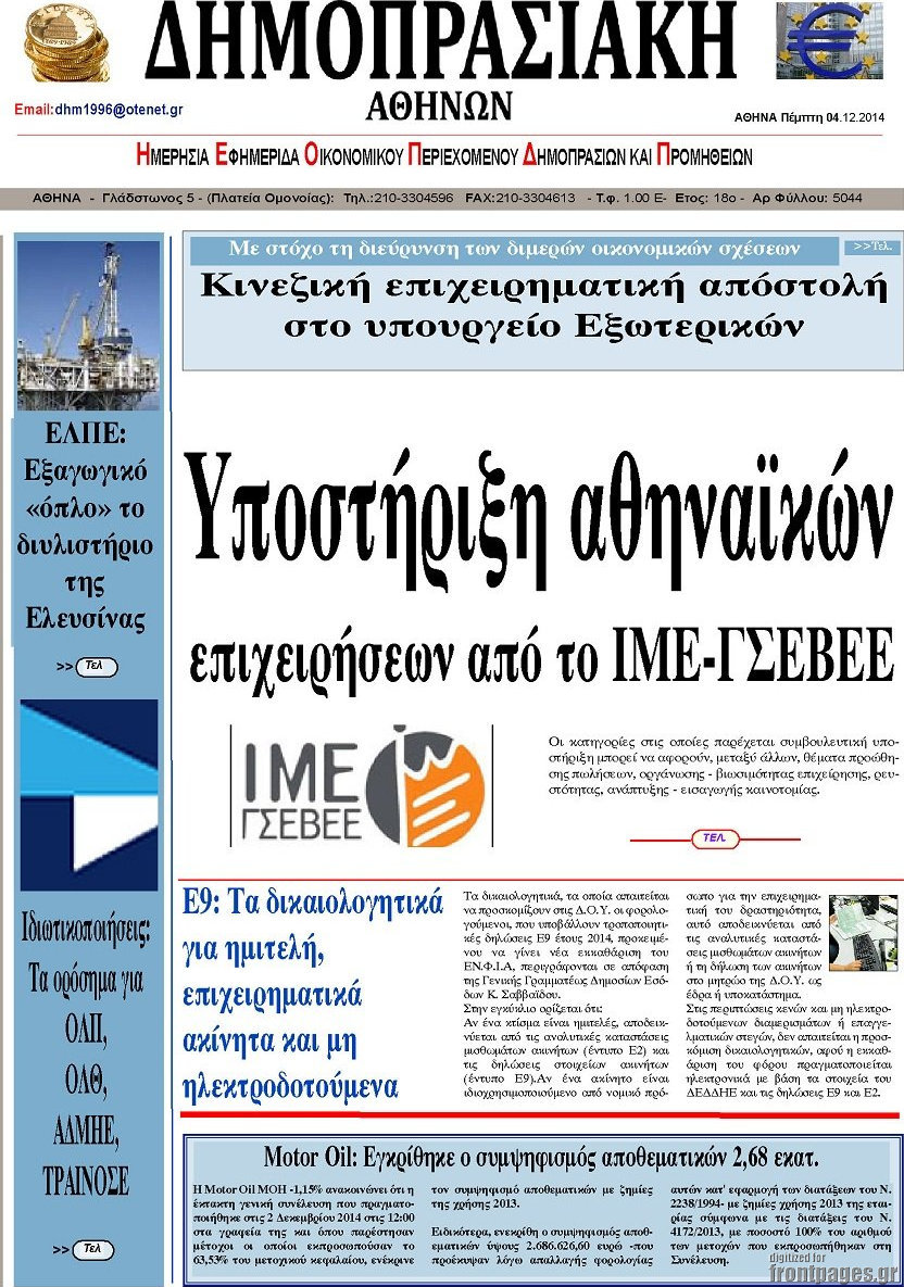 Οι οικονομικές εφημερίδες Enikos Newsroom 07:30, Πέμπτη 04 Δεκεμβρίου 2014 Media Οι οικονομικές εφημερίδες Διαβάστε τα πρωτοσέλιδα των οικονομικών εφημερίδων: ΠΡΩΤΟΣΕΛΙΔΑ Μοιράσου το: σχολίασε κι εσύ (0 σχόλια) Ακολουθήστε το enikos.gr στο Google News και μάθετε πρώτοι όλες τις ειδήσεις Δείτε όλες τις τελευταίες ειδήσεις από την Ελλάδα και τον Κόσμο στο enikos.gr Ειδήσεις Ροή Ειδήσεων 7 ώρες πριν Νέα Πέραμος: Πού στρέφονται οι έρευνες των αρχών για το άγριο έγκλημα με θύμα τον 27χρονο επιχειρηματία – «Δεν είχε πειράξει κανέναν» λένε οι γονείς του 7 ώρες πριν Μητσοτάκης για τη συνταγματική αναθεώρηση: «Φιλοδοξία μου είναι το 2030 να έχουμε κλείσει όλες τις εκκρεμότητες με το πελατειακό κράτος» 6 ώρες πριν Εξαφάνιση Λόρας: Ο πατέρας της ήταν αυτός που αποκάλυψε ότι ταξίδεψε στη Γερμανία – Το πρόσωπο-«κλειδί», η νέα μαρτυρία και οι «στοχευμένες» κινήσεις της ανήλικης 9 ώρες πριν Δημοσκόπηση Alco: Στις 13 μονάδες η διαφορά ΝΔ-ΠΑΣΟΚ – Πώς αξιολογούν οι πολίτες τις νέες πολιτικές κινήσεις; 6 ώρες πριν The Washington Post: Τι έχουμε μάθει ως τώρα από τα νέα στοιχεία στην υπόθεση Επστάιν – «Η αλήθεια να φτάσει στο κόκκαλο» 2 ώρες πριν Τα ζώδια σήμερα, Τρίτη 3 Φεβρουαρίου 2026: Τοξότες, σας εξαντλεί να είστε συνεχώς «στην τσίτα» και ψάχνετε κάτι διαφορετικό 8 ώρες πριν Ποιος είναι ο έρωτας της ζωή σας; Ανακαλύψτε την αδελφή-ψυχή σας με βάση τον μήνα γέννησή σας 10 ώρες πριν Λευκές περσίδες ξανά: Η απλή μέθοδος για να εξαφανίσετε την κιτρινίλα χωρίς τρίψιμο 7 ώρες πριν Ύπνος: Η βραδινή ρουτίνα που εγγυάται 8 ώρες ξεκούρασης, σύμφωνα με ειδικό 21 λεπτά πριν Γερμανία: Eνίσχυση της ευρωπαϊκής αυτονομίας «επειγόντως» και υλοποίηση Mercosur ζήτησε ο καγκελάριος Φρίντριχ Μερτς 27 λεπτά πριν Υπόθεση Έπσταϊν: Συμφώνησαν να καταθέσουν ο Μπιλ και η Χίλαρι Κλίντον 42 λεπτά πριν Παναθηναϊκός: Σε πρώτο πλάνο ο 28χρονος Αριάγα της Λεβάντε για τη θέση στο «6» 57 λεπτά πριν Τραμπ: «Θα γίνουν κακά πράγματα» αν δεν κλειστεί συμφωνία με Ιράν – Διμερείς διαπραγματεύσεις την Παρασκευή στην Τουρκία αναφέρουν αραβικές πηγές 1 ώρα πριν Ελληνική Λύση: Η συνέντευξη του πρωθυπουργού επιβεβαίωσε το αδιέξοδο της κυβερνητικής πολιτικής ENIKOS NETWORK 5 πράγματα που κάνουν μαζί τα ευτυχισμένα ζευγάρια Δύο παιδιά με γρίπη στις ΜΕΘ – Συνεχίζεται η απειλή των εποχικών λοιμώξεων Επιθεώρηση Εργασίας: Αυξήθηκαν κατά 4% οι έλεγχοι το 2025 – Στα 53,4 εκατ. ευρώ τα πρόστιμα Τα ξενοδοχεία κατέθεσαν αγωγή κατά της Booking για παράνομες ρήτρες Ευπάθεια στο moltbook ai αποκαλύπτει email, tokens σύνδεσης και api keys Αυτός είναι ο ρόλος της μικρής τρύπας στους νυχοκόπτες – «Είμαι ο μόνος που δεν το ήξερε;»» περισσότερα 18:18 , Δευτέρα 02 Φεβρουαρίου 2026 Άγιος Έρωτας: Η μικρή Ελευθερία δεν θέλει τους νέους της γονείς και η Χλόη καταφεύγει στον πατέρα Νικόλαο Όσα θα δούμε απόψε στο νέο επεισόδιο της σειράς “Άγιος Έρωτας” στις 22:00 στον Alp... 18:07 , Δευτέρα 02 Φεβρουαρίου 2026 MasterChef 10: Το πρώτο Mystery Box έχει την παιχνιδιάρικη υπογραφή του Πάνου Ιωαννίδη Μετά τις πρώτες εβδομάδες και τις διαδικασίες, που προηγήθηκαν, 14 διαγωνιζόμενοι της πρώτης μ... 17:45 , Δευτέρα 02 Φεβρουαρίου 2026 Grand Hotel: Ο Πέτρος και η Αλίκη είναι και πάλι μαζί Καταιγιστικές οι εξελίξεις στο νέο διπλό επεισόδιο της σειράς “Grand Hotel” στις 2... 17:15 , Δευτέρα 02 Φεβρουαρίου 2026 Να μ’ αγαπάς: Η Φωτεινή ανακοινώνει στη Ζωή πως είναι έγκυος, απόψε στις 20:00, με διπλό επεισόδιο Ο Θεόφιλος λαμβάνει τα αποτελέσματα του τεστ DΝA, στο νέο διπλό επεισ