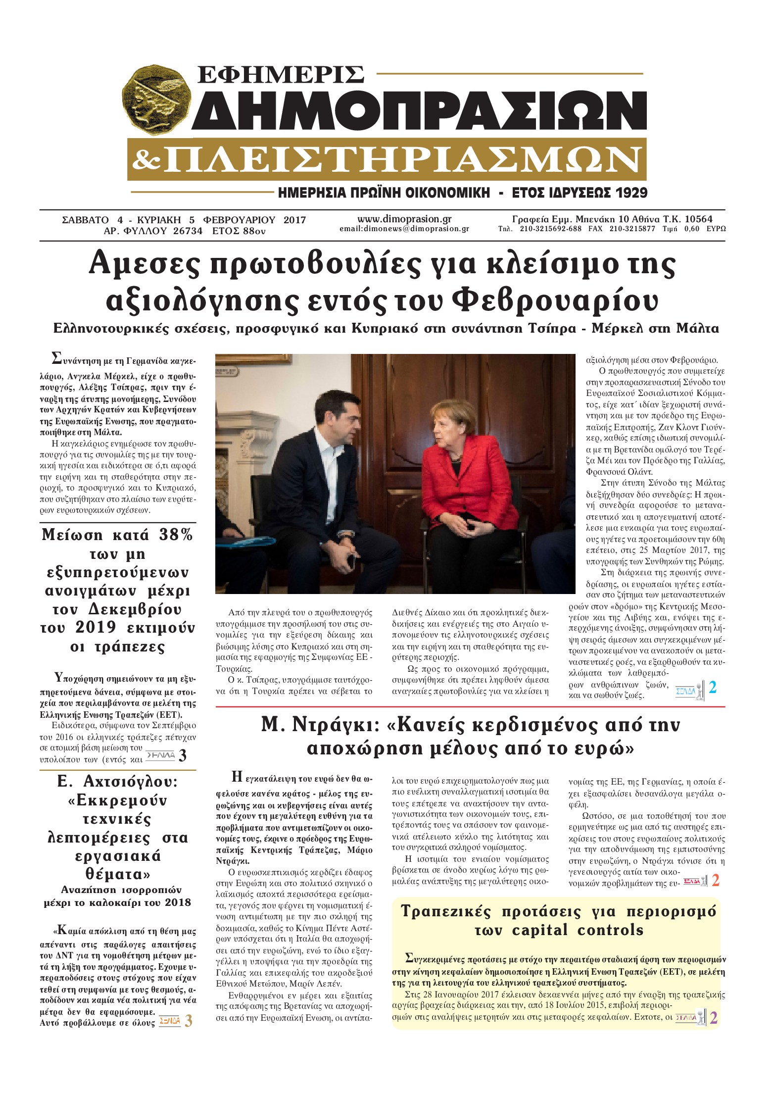 Οι οικονομικές εφημερίδες 6/2/2017 Enikos Newsroom 05:48, Δευτέρα 06 Φεβρουαρίου 2017 Media Διαβάστε τα σημερινά πρωτοσέλιδα των οικονομικών εφημερίδων: ΟΙΚΟΝΟΜΙΚΕΣ ΕΦΗΜΕΡΙΔΕΣ ΠΡΩΤΟΣΕΛΙΔΑ Μοιράσου το: σχολίασε κι εσύ (0 σχόλια) Ακολουθήστε το enikos.gr στο Google News και μάθετε πρώτοι όλες τις ειδήσεις Δείτε όλες τις τελευταίες ειδήσεις από την Ελλάδα και τον Κόσμο στο enikos.gr Ειδήσεις Ροή Ειδήσεων 3 ώρες πριν Νίκος Παππάς: «Είχα λάθος αντίδραση στη δική του δράση-πρόκληση – Δεν θα αναλύσω σε τι κατάσταση ήταν ο δημοσιογράφος» 41 λεπτά πριν Νίκος Γιαννόπουλος για Νίκο Παππά: «Είναι επικίνδυνος, θα του κάνω ασφαλιστικά» – ΒΙΝΤΕΟ 1 ώρα πριν Αλεξανδρούπολη: Πολυοργανική ανεπάρκεια λόγω υποσιτισμού η αιτία θανάτου του 3χρονου αγοριού 2 ώρες πριν Δημοσκόπηση Pulse: Η διαφορά ΝΔ-ΠΑΣΟΚ – Με ποια κριτήρια θα ψηφίσουν οι πολίτες στις επόμενες εκλογές 3 ώρες πριν Συγκλονιστικό βίντεο: Τρόμος για τουρίστες που σώθηκαν την τελευταία στιγμή από λεωφορείο που κατρακυλούσε σε φαράγγι 56 λεπτά πριν Ύπνος: Ειδικός εξηγεί τον πραγματικό λόγο που ξυπνάτε στις 4 τα ξημερώματα – Ο ρόλος των ορμονών και του κιρκάδιου ρυθμού 2 ώρες πριν Αριθμολογία: Οι άνθρωποι που έχουν γεννηθεί αυτές τις 4 ημερομηνίες, είναι τρυφεροί και αγαπούν ανιδιοτελώς 3 ώρες πριν Καθρέφτες μπάνιου: Το απλό κόλπο με την οδοντόκρεμα για να μην θολώνουν 14 ώρες πριν 20 χρόνια τα Χριστούγεννα ξεκινούν στα Public με μεγάλη ποικιλία σε δώρα! 6 λεπτά πριν Κυψέλη: Χωρίς την οικογένειά της δίπλα της απολογήθηκε η 16χρονη – «Της είχε επιτεθεί κάποιος για να την βιάσει, φοβήθηκε και κυκλοφορούσε με μαχαίρι» 12 λεπτά πριν «Αγριεύουν» οι αγρότες: «Δεν συντρέχει λόγος συνάντησης με τον πρωθυπουργό» – Ώρα αποφάσεων στη σύσκεψη της Πέμπτης 17 λεπτά πριν Χρίστος Αντωνιάδης: «Όποιος δεν έχει κάνει δίδυμα, δεν δικαιούται διά να ομιλεί» 26 λεπτά πριν Ρούτε: Η μεγαλύτερη επιτυχία εξωτερικής πολιτικής του Τραμπ είναι η δέσμευση των χωρών του ΝΑΤΟ για τις αμυντικές δαπάνες 32 λεπτά πριν Το Σπίτι Δίπλα Στο Ποτάμι: Σε κίνδυνο η υγεία του Απόστολου – Τι θα δούμε απόψε ENIKOS NETWORK Αϋπνία: Το κόλπο που θα σας βοηθήσει να κοιμηθείτε απόψε – Είναι απλό και έχει αποτέλεσμα 2,6 εκατομμύρια πολίτες έχουν ήδη εμβολιαστεί κατά της γρίπης Χειμερινές εκπτώσεις: Πότε αρχίζουν και τι πρέπει να προσέξουν οι καταναλωτές ΑΑΔΕ: Καταβλήθηκε η τέταρτη δόση επιστροφής ΕΦΚ αγροτικού πετρελαίου – Οδηγίες για τη διόρθωση παραστατικών Χαρτογραφώντας το «σημείο χωρίς επιστροφή»: Για πρώτη φορά αποκαλύπτεται με λεπτομέρεια το ακανθώδες όριο της ατμόσφαιρας τ... Η Google καταργεί τη λειτουργία «dark web report» – Πώς θα μπορούν οι χρήστες να διαγράφουν τα δεδομένα τους περισσότερα 22:24 , Τετάρτη 17 Δεκεμβρίου 2025 Το Σπίτι Δίπλα Στο Ποτάμι: Σε κίνδυνο η υγεία του Απόστολου – Τι θα δούμε απόψε “Το Σπίτι Δίπλα στο Ποτάμι” ξετυλίγει το νήμα της ζωής των πέντε αδελφών με καταισ... 21:14 , Τετάρτη 17 Δεκεμβρίου 2025 Παιχνίδια Εκδίκησης: Θα καταφέρει ο Χρήστος να κλονίσει την εμπιστοσύνη της Μάγιας απέναντι στον Άγη; Τα «Παιχνίδια Εκδίκησης» έρχονται απόψε στις 22:30, στον Αντ1, με το τελευταίο επεισόδιο της χ... 20:57 , Τετάρτη 17 Δεκεμβρίου 2025 Άγιος Έρωτας: Η Χλόη καταθέτει εναντίον του πατέρα της και ο Χάρης αποκαλύπτει στον Κλεάνθη ότι δεν είναι ο βιολογικός του πατέρας. Γεμάτο αποκαλύψεις είναι το νέο επεισόδιο της σειράς “Άγιος Έρωτας” απόψε στις 21:... 20:15 , Τετάρτη 17 Δεκεμβρίου 2025 Η ανακοίνωση της ΕΣΗΕΑ γι