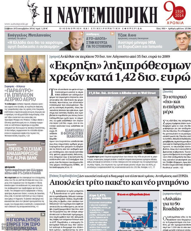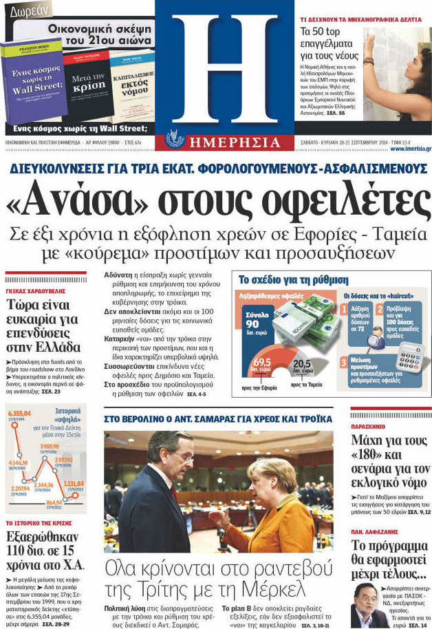 Οι οικονομικές εφημερίδες Enikos Newsroom 07:48, Σάββατο 20 Σεπτεμβρίου 2014 Media Οι οικονομικές εφημερίδες Διαβάστε τα πρωτοσέλιδα των οικονομικών εφημερίδων. Μοιράσου το: σχολίασε κι εσύ (0 σχόλια) Ακολουθήστε το enikos.gr στο Google News και μάθετε πρώτοι όλες τις ειδήσεις Δείτε όλες τις τελευταίες ειδήσεις από την Ελλάδα και τον Κόσμο στο enikos.gr Ειδήσεις Ροή Ειδήσεων 59 λεπτά πριν Μητσοτάκης: Η τριμερής Ελλάδας – Κύπρου – Ισραήλ ενισχύει τη σταθερότητα και την ασφάλεια στην ανατολική Μεσόγειο 50 λεπτά πριν Αλεξανδρούπολη: Μήνυση υπέβαλε ο παππούς του 3χρονου που πέθανε από ασιτία – Αναζητούνται οι δράστες που τον ξυλοκόπησαν 2 ώρες πριν Αγρότες: Ανοίγουν το τελωνείο των Κήπων και για τα φορτηγά από απόψε έως και την Παρασκευή 2 ώρες πριν Προκλήσεις: Έστειλαν πάλι οπλισμένα F-16 στο Αιγαίο οι Τούρκοι – Παραβιάσεις και αερομαχίες 2 ώρες πριν Ποινική δίωξη για δύο κακουργήματα άσκησε ο Εισαγγελέας σε 3 αγρότες 2 ώρες πριν Τα μυστικά του «αόρατου» φλερτ: 7 τρόποι για να δείξετε το ενδιαφέρον σας για κάποιον χωρίς να αποκαλυφθούν οι προθέσεις σας 5 ώρες πριν Αυτό το ζώδιο θα ξαναγεννηθεί το 2026 – «Αφήνετε τις δυσκολίες στο παρελθόν και κάνετε restart» 2 ημέρες πριν Enerwave: Το νέο «ρεύμα» στη λιανική ενέργειας που αλλάζει την εμπειρία του καταναλωτή 57 λεπτά πριν Το έξυπνο κόλπο για να μην χαλάσετε τους τοίχους σας από τα αυτοκόλλητα άγκιστρα 48 δευτερόλεπτα πριν «Οδύσσεια»: Κυκλοφόρησε το επίσημο τρέιλερ της πολυαναμενόμενης ταινίας του Κρίστοφερ Νόλαν – Δείτε βίντεο 4 λεπτά πριν “Qatargate” στο Ισραήλ: Ο πρώην Πρωθυπουργός Μπένετ κατηγορεί το γραφείο του Νετανιάχου για «προδοσία» – Ζητεί την παραίτησή του 10 λεπτά πριν Σέρρες: Νεκρός οδηγός ηλεκτρικού πατινιού – Τον παρέσυρε αυτοκίνητο 14 λεπτά πριν Υπεγράφη η σύμβαση για 23 νέα τρένα – «Γυρίζουμε μια νέα σελίδα για τον ελληνικό σιδηρόδρομο» 24 λεπτά πριν Γιαννάκος: Μόνο σε δύο νοσοκομεία της Αττικής κάθε χρόνο νοσηλεύονται 100 παιδιά μετά τη χρήση ναρκωτικών ENIKOS NETWORK Στέλνετε ακόμα Χριστουγεννιάτικες κάρτες; Τι μπορεί να δείχνει για την προσωπικότητά σας Ενεργειακή αναβάθμιση του νοσοκομείου Πατρών «Ο Άγιος Ανδρέας» Αναδρομικά σε 970.000 συνταξιούχους – Ποιοι θα πάρουν έως 16.500 ευρώ Συνάντηση Παπασταύρου – Γκιλφόιλ: Στο επίκεντρο ο ρόλος της Ελλάδας ως περιφερειακού ενεργειακού κόμβου Ο Google Assistant θα παραμείνει λίγο περισσότερο για ορισμένους χρήστες Android Τεστ προσωπικότητας: Το βάζο που θα επιλέξετε αποκαλύπτει πώς λύνετε προβλήματα στη ζωή σας περισσότερα 20:16 , Δευτέρα 22 Δεκεμβρίου 2025 «Το παιδί από την αρχή»: Special edition επεισόδια της επιτυχημένης σειράς αρχίζουν από σήμερα στην ΕΡΤ1 «Το παιδί», η ξεχωριστή σειρά της ΕΡΤ1 με στοιχεία μαύρης κωμωδίας, που φέρει την υπογραφή του... 19:41 , Δευτέρα 22 Δεκεμβρίου 2025 Porto Leone: Στη γειτονιά με τα κόκκινα φανάρια – Η Αλεξάνδρα ανακαλύπτει το μυστικό της Γαλήνης και της στήνει παγίδα Απόψε στις 22:30 στον Alpha η συγκλονιστική συνέχεια της δραματικής σειράς του Apha «Porto Leo... 19:16 , Δευτέρα 22 Δεκεμβρίου 2025 Άγιος έρωτας: Η Πετρούλα αφήνει την τελευταία της πνοή Καθηλώνει το προτελευταίο επεισόδιο της χρονιάς της σειράς “Άγιος Έρωτας” απόψε στ... 18:39 , Δευτέρα 22 Δεκεμβρίου 2025 Να μ’αγαπάς: Ο Θεόφιλος απειλεί να καταστρέψει τη Ζωή Σοκαριστικές αποκαλύψεις έρχονται στο νέο επεισόδιο της σειράς “Να μ΄αγαπάς” απόψε... ΤΕΛΕΥΤΑΙΕΣ ΕΙΔΗΣΕΙΣ 4 λεπτά πριν “Qatargate” στο Ισραήλ: Ο πρώην Πρωθυπουργός Μπένετ... 10 λεπ