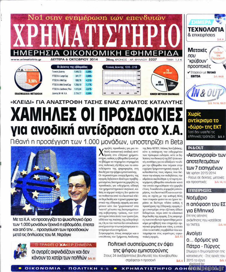 Οι οικονομικές εφημερίδες Enikos Newsroom 08:28, Δευτέρα 06 Οκτωβρίου 2014 Media Οι οικονομικές εφημερίδες Διαβάστε τα πρωτοσέλιδα των οικονομικών εφημερίδων: ΕΦΗΜΕΡΙΔΕΣ ΟΙΚΟΝΟΜΙΚΕΣ ΕΦΗΜΕΡΙΔΕΣ ΠΡΩΤΟΣΕΛΙΔΑ Μοιράσου το: σχολίασε κι εσύ (0 σχόλια) Ακολουθήστε το enikos.gr στο Google News και μάθετε πρώτοι όλες τις ειδήσεις Δείτε όλες τις τελευταίες ειδήσεις από την Ελλάδα και τον Κόσμο στο enikos.gr Ειδήσεις Ροή Ειδήσεων 3 ώρες πριν Από το Ορμένιο ως τα Μάλγαρα κι από τη Σιάτιστα μέχρι τη Νίκαια: Μπλόκα σε όλη την Ελλάδα – Το Σάββατο ανοίγουν τα διόδια οι αγρότες 44 λεπτά πριν Εμπλοκή και αερομαχίες με οπλισμένα τουρκικά F-16 στο Αιγαίο 2 ώρες πριν Αττική: Θρίλερ με νεκρό βρέφος 5 μηνών – Κοιμόταν στο ίδιο κρεβάτι με τους γονείς του 34 λεπτά πριν Πούτιν: «Ναι, είμαι ερωτευμένος» – Βίντεο από τη σπάνια προσωπική παραδοχή του 2 ώρες πριν Μεσόγειος: Η διαδρομή του ρωσικού τάνκερ «Qendil» και η στοχευμένη επίθεση της Ουκρανίας με drone – Ο Πούτιν προειδοποίησε για αντίποινα 4 ώρες πριν Τα 5 ζώδια που ευνοούνται στην ερωτική ζωή τους την επόμενη εβδομάδα – «Η ενέργεια του Αιγόκερου φέρνει αγάπη και σταθερότητα» 5 ώρες πριν Αυτό το έξυπνο μαθηματικό κόλπο θα μπορούσε να αλλάξει τον τρόπο με τον οποίο οι επιστήμονες μελετούν τους σεισμούς 1 ώρα πριν Μήπως έχετε χάσει τον εαυτό σας στη σχέση σας; 7 «αθόρυβες» υποχωρήσεις που μάλλον κάνατε, χωρίς να το συνειδητοποιήσετε 3 ώρες πριν Κουίζ για την παλιά Αθήνα: Αναγνωρίζετε την περιοχή; Έχετε περάσει 100% από εκεί 7 λεπτά πριν Νίκος Γιαννόπουλος: «Μου επιτέθηκε ο Παππάς – Ήμουν νηφάλιος, δεν τον προκάλεσα» – ΒΙΝΤΕΟ 15 λεπτά πριν Γιώργος Τράγκας: Ανατροπή από το Πριγκιπάτο του Μονακό για την υπόθεση της κληρονομιάς – Η ανακοίνωση της δικηγόρου της Μαρίας Καρρά 22 λεπτά πριν Ξεχάστε το καθάρισμα το Σαββατοκύριακο: Ο «κανόνας των 20 λεπτών» που θα σας λύσει τα χέρια 23 λεπτά πριν Αγρότες: Έκλεισαν την υψηλή γέφυρα της Χαλκίδας – ΒΙΝΤΕΟ 27 λεπτά πριν Ρούμπιο: Έχει υπάρξει πρόοδος στις συνομιλίες για την Ουκρανία – Τα τελευταία ζητήματα είναι τα πιο δύσκολα ENIKOS NETWORK Έχετε πραγματικά μεγάλη καρδιά; 10 χαρακτηριστικά όσων έχουν καλοσύνη «Η σούπερ» γρίπη εξαπλώνεται στην Ευρώπη-Στοιχεία από το ECDC για την αποτελεσματικότητα του εμβολίου Επίδομα παιδιού: Πότε ανοίγει ξανά η πλατφόρμα για τις αιτήσεις Προκήρυξη ΑΣΕΠ για 397 μόνιμες προσλήψεις στο Δημόσιο: Βγήκαν τα προσωρινά αποτελέσματα – Πότε αρχίζει η υποβολή ενστάσεων Χαρτογραφώντας το «σημείο χωρίς επιστροφή»: Για πρώτη φορά αποκαλύπτεται με λεπτομέρεια το ακανθώδες όριο της ατμόσφαιρας τ... Η Google καταργεί τη λειτουργία «dark web report» – Πώς θα μπορούν οι χρήστες να διαγράφουν τα δεδομένα τους περισσότερα 19:31 , Παρασκευή 19 Δεκεμβρίου 2025 GNTM: Απόψε ο μεγάλος τελικός για τους 4 φιναλίστ Έπειτα από μήνες γεμάτους μόδα, δημιουργία και έντονες αναμετρήσεις, το GNTM 2025 κορυφώνεται,... 18:11 , Παρασκευή 19 Δεκεμβρίου 2025 Το σόι σου: Ο Άρης έρχεται στην Ελλάδα για τις γιορτές των Χριστουγέννων – Τι θα δούμε στο αποψινό εορταστικό επεισόδιο Ένα απολαυστικό, εορταστικό επεισόδιο της σειράς “Το σόι σου”, γεμάτο ευτράπελα αλ... 15:15 , Παρασκευή 19 Δεκεμβρίου 2025 Την Κυριακή με τη Realnews: Ό,τι και αν αγοράσεις, σκανάρεις και κερδίζεις! Την Κυριακή με τη Realnews: Ό,τι και αν αγοράσεις, σκανάρεις και κερδίζεις! Με το PADU app, το... 08:00 , Παρασκευή 19 Δεκεμβρίου 2025 Την Κυριακή με τη Realnews: Δωροεπιταγή 10€ Δωροεπιταγή αξίας 10€ για αγορές άνω των 60€ απ