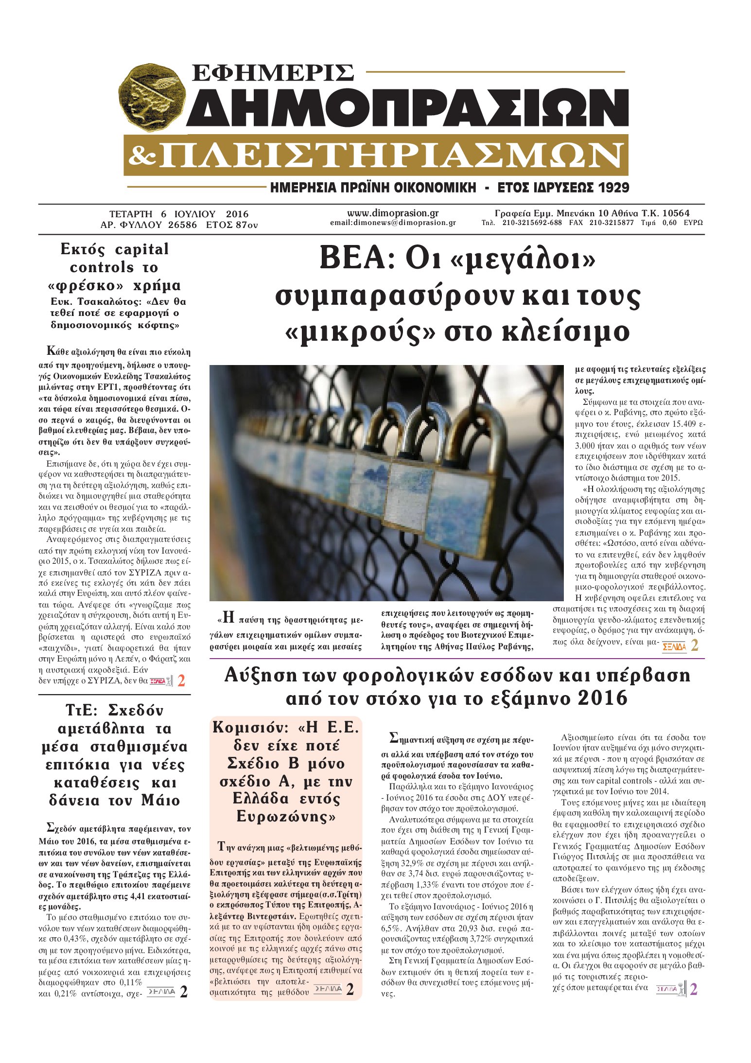 Οι οικονομικές εφημερίδες 6/7/2016 Enikos Newsroom 04:56, Τετάρτη 06 Ιουλίου 2016 Media Διαβάστε τα σημερινά πρωτοσέλιδα των οικονομικών εφημερίδων: ΟΙΚΟΝΟΜΙΚΕΣ ΕΦΗΜΕΡΙΔΕΣ ΠΡΩΤΟΣΕΛΙΔΑ Μοιράσου το: σχολίασε κι εσύ (0 σχόλια) Ακολουθήστε το enikos.gr στο Google News και μάθετε πρώτοι όλες τις ειδήσεις Δείτε όλες τις τελευταίες ειδήσεις από την Ελλάδα και τον Κόσμο στο enikos.gr Ειδήσεις Ροή Ειδήσεων 5 λεπτά πριν Ευρωπαϊκή Ένωση: Συμφωνία για δάνειο 90 δισ. ευρώ στην Ουκρανία τη διετία 2026-2027 5 ώρες πριν ΟΠΕΚΕΠΕ: Προφυλακιστέος ο φερόμενος αρχηγός και ο λογιστής της εγκληματικής οργάνωσης 6 ώρες πριν Αυξάνουν την πίεση προς την κυβέρνηση οι αγρότες: Κλείνουν παρακαμπτήριους και ανοίγουν διόδια – Τι θα γίνει τις γιορτές 6 ώρες πριν Φοινικούντα: Το Σάββατο απολογείται ο 30χρονος γιος γνωστού επιχειρηματία της Πλάκας που παραδόθηκε – Όσα είπε στους αστυνομικούς και ο ρόλος του στο έγκλημα 4 ώρες πριν ΑΕΚ – Κραϊόβα 3-2: Επική ανατροπή και πρόκριση στους «16» του Conference League η Ένωση 5 ώρες πριν Αρχαιολόγοι ανακάλυψαν ρωμαϊκά τεχνουργήματα από μια πόλη που δεν υπήρξε ποτέ – Τα τρία εντυπωσιακά κτίρια και ο αμφορέας με τις… σαρδέλες 6 ώρες πριν Ύπνος: Η απλή βραδινή ρουτίνα για να προστατεύσετε τα μαλλιά σας από το κρύο κατά τη διάρκεια του χειμώνα 7 ώρες πριν Manifesting: Πώς να συναντήσετε τον σύντροφο της ζωής σας, ανάλογα με τον μήνα γέννησής σας 2 ημέρες πριν 20 χρόνια τα Χριστούγεννα ξεκινούν στα Public με μεγάλη ποικιλία σε δώρα! 5 λεπτά πριν Ευρωπαϊκή Ένωση: Συμφωνία για δάνειο 90 δισ. ευρώ στην Ουκρανία τη διετία 2026-2027 28 λεπτά πριν Αιματηρή βομβιστική επίθεση στην Υεμένη: Τουλάχιστον τρεις νεκροί και 13 τραυματίες 32 λεπτά πριν Στη Φλόριντα σήμερα οι διαβουλεύσεις σχετικά με τα επόμενα στάδια για τη Λωρίδα της Γάζας 36 λεπτά πριν Σίσσυ Τουμάση: «Είμαι ασθενοφοβική πάρα πολύ και με πιάνει μια παράνοια μ’ αυτό» 1 ώρα πριν Ντόναλντ Τραμπ: Δεν χρειάζομαι την έγκριση του Κογκρέσου για να διατάξω στρατιωτικά πλήγματα στη Βενεζουέλα ENIKOS NETWORK Σε περίοδο αυξημένης δραστηριότητας η γρίπη στην Ελλάδα-Μέτρα προστασίας από τον ΕΟΔΥ Σκέφτεστε συνέχεια συζητήσεις που έχετε κάνει; Τι σημαίνει αυτό, σύμφωνα με ειδικό Στεγαστικό: Τι λέει η ΠΟΜΙΔΑ για τα νέα μέτρα που ανακοίνωσε ο Κυριάκος Μητσοτάκης Λαγκάρντ: Αισιόδοξη για την ανάπτυξη της Ευρωζώνης, αβέβαιη για τον πληθωρισμό Χαρτογραφώντας το «σημείο χωρίς επιστροφή»: Για πρώτη φορά αποκαλύπτεται με λεπτομέρεια το ακανθώδες όριο της ατμόσφαιρας τ... Η Google καταργεί τη λειτουργία «dark web report» – Πώς θα μπορούν οι χρήστες να διαγράφουν τα δεδομένα τους περισσότερα 02:50 , Παρασκευή 19 Δεκεμβρίου 2025 GNTM: «Κλείδωσαν» οι τέσσερις φιναλίστ – Μεγάλη ανατροπή στις τελευταίες αποχωρήσεις Για προτελευταία φορά εμφανίστηκαν στο πλατό του GNTM οι φιναλίστ του φετινού κύκλου, το βράδυ... 17:45 , Πέμπτη 18 Δεκεμβρίου 2025 ROUK ZOUK: Εορταστικό επεισόδιο με καλεσμένους τους πρωταγωνιστές του «Γιατί ρε πατέρα» Το Σάββατο 20 Δεκεμβρίου στις 21:00, η Ζέτα Μακρυπούλια υποδέχεται εκλεκτούς ηθοποιούς που όλο... 17:20 , Πέμπτη 18 Δεκεμβρίου 2025 Άγιος έρωτας: Η Χριστίνα εξομολογείται στον πατέρα Νικόλαο, απόψε στις 21:00 στον Alpha Η Νότα αποφασίζει να εκδικηθεί τον Πέτρο και τον Στέφανο, για χάρη του Λούη, όμως τα πράγματα ... 16:50 , Πέμπτη 18 Δεκεμβρίου 2025 Να μ’ αγαπάς: Ζωή και Φωτεινή συμφιλιώνονται ως μάνα με κόρη, απόψε στις 20:00 Η ταυτότητα του Άγγελου αποκαλύπτεται στο νέο επεισόδιο της σειράς “Να μ’ αγαπάς...