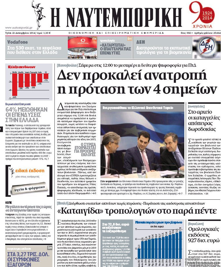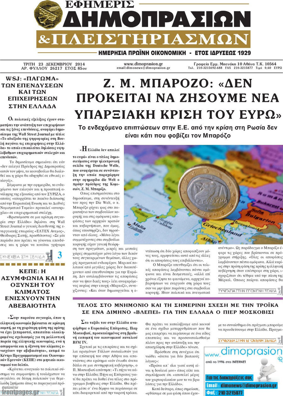 Οι οικονομικές εφημερίδες Enikos Newsroom 07:26, Τρίτη 23 Δεκεμβρίου 2014 Media Διαβάστε τα πρωτοσέλιδα των οικονομικών εφημερίδων: ΟΙΚΟΝΟΜΙΚΕΣ ΕΦΗΜΕΡΙΔΕΣ ΠΡΩΤΟΣΕΛΙΔΑ Μοιράσου το: σχολίασε κι εσύ (0 σχόλια) Ακολουθήστε το enikos.gr στο Google News και μάθετε πρώτοι όλες τις ειδήσεις Δείτε όλες τις τελευταίες ειδήσεις από την Ελλάδα και τον Κόσμο στο enikos.gr Ειδήσεις Ροή Ειδήσεων 2 ώρες πριν Κυριάκος Μητσοτάκης: «Κάποιοι αγρότες δεν αισθάνονται την ανάγκη να διαφωνήσουν με τις προτάσεις της κυβέρνησης, η Ευρώπη στέκεται στο πλευρό της Ουκρανίας» 7 ώρες πριν ΟΠΕΚΕΠΕ: Προφυλακιστέος ο φερόμενος αρχηγός και ο λογιστής της εγκληματικής οργάνωσης 8 ώρες πριν Αυξάνουν την πίεση προς την κυβέρνηση οι αγρότες: Κλείνουν παρακαμπτήριους και ανοίγουν διόδια – Τι θα γίνει τις γιορτές 8 ώρες πριν Φοινικούντα: Το Σάββατο απολογείται ο 30χρονος γιος γνωστού επιχειρηματία της Πλάκας που παραδόθηκε – Όσα είπε στους αστυνομικούς και ο ρόλος του στο έγκλημα 7 ώρες πριν ΑΕΚ – Κραϊόβα 3-2: Επική ανατροπή και πρόκριση στους «16» του Conference League η Ένωση 8 ώρες πριν Αρχαιολόγοι ανακάλυψαν ρωμαϊκά τεχνουργήματα από μια πόλη που δεν υπήρξε ποτέ – Τα τρία εντυπωσιακά κτίρια και ο αμφορέας με τις… σαρδέλες 9 ώρες πριν Ύπνος: Η απλή βραδινή ρουτίνα για να προστατεύσετε τα μαλλιά σας από το κρύο κατά τη διάρκεια του χειμώνα 10 ώρες πριν Manifesting: Πώς να συναντήσετε τον σύντροφο της ζωής σας, ανάλογα με τον μήνα γέννησής σας 2 ημέρες πριν 20 χρόνια τα Χριστούγεννα ξεκινούν στα Public με μεγάλη ποικιλία σε δώρα! 6 λεπτά πριν ΔΕΔΔΗΕ: Διακοπές ρεύματος σήμερα (19/12) στην Αθήνα και σε άλλες 12 περιοχές της Αττικής 21 λεπτά πριν Φρίντριχ Μερτς: Χορήγηση άτοκου δανείου στην Ουκρανία συμφώνησαν τα κράτη – μέλη της ΕΕ 29 λεπτά πριν Απειλή για το Προϋπολογισμό τα ληξιπρόθεσμα χρέη των ιδιωτών προς την εφορία 29 λεπτά πριν Πέντε νεκροί σε πλήγματα των ΗΠΑ κατά δύο σκαφών που φέρεται να μετέφεραν ναρκωτικά στον Ανατολικό Ειρηνικό 37 λεπτά πριν ΕΥΔΑΠ: Αλλάζουν τα τιμολόγια του νερού ENIKOS NETWORK Μόνο όσοι σκανάρουν με ταχύτητα ΑΙ μπορούν να εντοπίσουν τον διαφορετικό αριθμό ανάμεσα στο πλέγμα των 68 και να λύσουν το ... Η τροφή του πόθου που μπορεί να ανακουφίσει από ενοχλήσεις στο στομάχι και από τα συμπτώματα του Raynaud Στεγαστικό: Τι λέει η ΠΟΜΙΔΑ για τα νέα μέτρα που ανακοίνωσε ο Κυριάκος Μητσοτάκης Λαγκάρντ: Αισιόδοξη για την ανάπτυξη της Ευρωζώνης, αβέβαιη για τον πληθωρισμό Χαρτογραφώντας το «σημείο χωρίς επιστροφή»: Για πρώτη φορά αποκαλύπτεται με λεπτομέρεια το ακανθώδες όριο της ατμόσφαιρας τ... Η Google καταργεί τη λειτουργία «dark web report» – Πώς θα μπορούν οι χρήστες να διαγράφουν τα δεδομένα τους περισσότερα 05:48 , Παρασκευή 19 Δεκεμβρίου 2025 Οι οικονομικές εφημερίδες 19/12/2025 Διαβάστε τα πρωτοσέλιδα από τις οικονομικές εφημερίδες, σήμερα 19/12/2025. 05:43 , Παρασκευή 19 Δεκεμβρίου 2025 Οι αθλητικές εφημερίδες 19/12/2025 Διαβάστε τα πρωτοσέλιδα από τις αθλητικές εφημερίδες, σήμερα 19/12/2025. 05:38 , Παρασκευή 19 Δεκεμβρίου 2025 Οι πολιτικές εφημερίδες 19/12/2025 Διαβάστε τα πρωτοσέλιδα από τις πολιτικές εφημερίδες, σήμερα 19/12/2025. 02:50 , Παρασκευή 19 Δεκεμβρίου 2025 GNTM: «Κλείδωσαν» οι τέσσερις φιναλίστ – Μεγάλη ανατροπή στις τελευταίες αποχωρήσεις Για προτελευταία φορά εμφανίστηκαν στο πλατό του GNTM οι φιναλίστ του φετινού κύκλου, το βράδυ... ΤΕΛΕΥΤΑΙΕΣ ΕΙΔΗΣΕΙΣ 6 λεπτά πριν ΔΕΔΔΗΕ: Διακοπές ρεύματος σήμερα (19/12) στην Αθήνα και... 21 λεπτά πριν Φρίντριχ Μερτς: Χορήγησ
