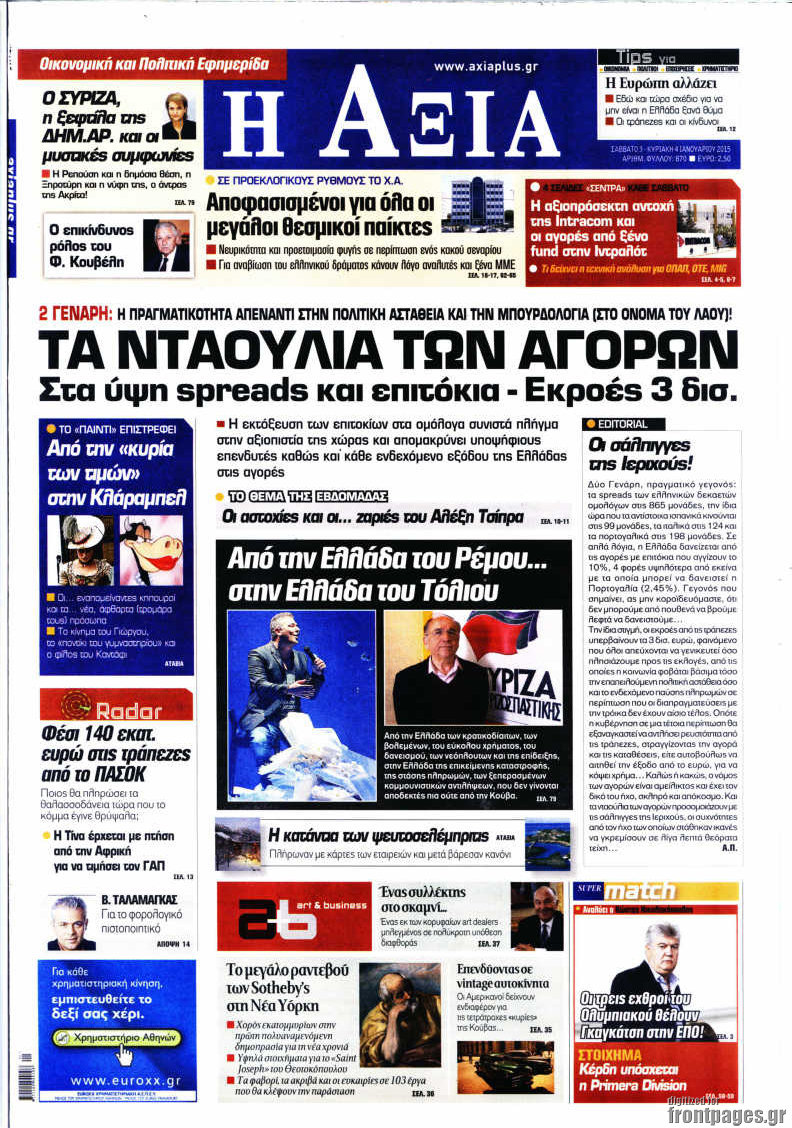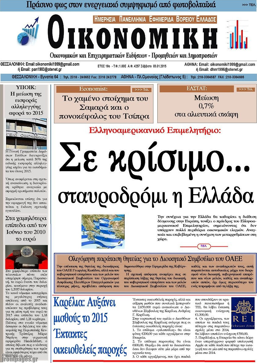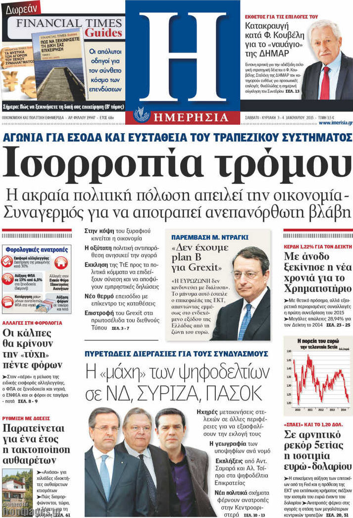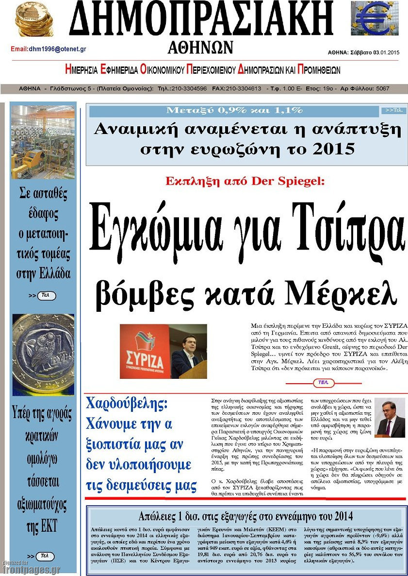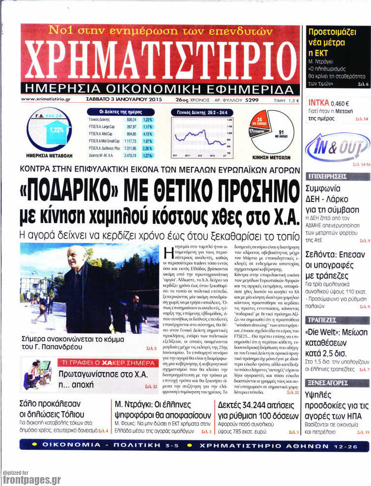 Οι oικονομικές εφημερίδες Enikos Newsroom 08:57, Σάββατο 03 Ιανουαρίου 2015 Media Διαβάστε τα πρωτοσέλιδα των οικονομικών εφημερίδων: ΕΦΗΜΕΡΙΔΕΣ ΟΙΚΟΝΟΜΙΚΕΣ ΕΦΗΜΕΡΙΔΕΣ ΠΡΩΤΟΣΕΛΙΔΑ Μοιράσου το: σχολίασε κι εσύ (0 σχόλια) Ακολουθήστε το enikos.gr στο Google News και μάθετε πρώτοι όλες τις ειδήσεις Δείτε όλες τις τελευταίες ειδήσεις από την Ελλάδα και τον Κόσμο στο enikos.gr Ειδήσεις Ροή Ειδήσεων 38 λεπτά πριν Νίκος Παππάς: Το παρασκήνιο της αποπομπής του – Οι μπουνιές, τα μηνύματα μετά την επίθεση και η διαγραφή από τον ΣΥΡΙΖΑ 2 ώρες πριν Φοροδιαφυγή: Ποιοι φορολογούμενοι κινδυνεύουν να πληρώσουν «τσουχτερά» πρόστιμα 1 ώρα πριν Φοινικούντα: Παραδόθηκε 30χρονος στην Καλαμάτα για τη διπλή δολοφονία 1 ώρα πριν Αγρότες: Ανυποχώρητοι στα μπλόκα – Στις Σέρρες σήμερα η κρίσιμη συνεδρίαση της Πανελλαδικής Επιτροπής 2 ώρες πριν Τα επίσημα χρονοδιαγράμματα που η Τουρκία θα παραλάβει τα Eurofighter 3 ώρες πριν Καούρα: Το μπαχαρικό που είναι «εξίσου αποτελεσματικό» με την ομεπραζόλη, σύμφωνα με ειδικούς 4 ώρες πριν Τα ζώδια σήμερα, Πέμπτη 18 Δεκεμβρίου: Λέοντες, η καρδιά σας θέλει να εκφραστεί 3 ώρες πριν Οπτική ψευδαίσθηση: Μόνο οι πιο έξυπνοι άνθρωποι θα βρουν 7 ξωτικά 15 δευτερόλεπτα 24 ώρες πριν 20 χρόνια τα Χριστούγεννα ξεκινούν στα Public με μεγάλη ποικιλία σε δώρα! 47 δευτερόλεπτα πριν Η σύζυγός του παραπονιέται για τα χρήματα που της δίνει για ψώνια κάθε μήνα – «Λέει ότι νιώθει φτωχή και της είπα να βρει δουλειά» 10 λεπτά πριν Άστατος ο καιρός τα Χριστούγεννα: Βαρομετρικό χαμηλό από τον κόλπο της Σύρτης «ξεκλειδώνει» κακοκαιρίες – Πώς θα εξελιχθεί έως την Πρωτοχρονιά 13 λεπτά πριν Γρίπη: Η υπουργός Υγείας της Γαλλίας καλεί τους πολίτες να ξαναφορέσουν τις μάσκες τους 22 λεπτά πριν Μαρία Αλιφέρη: «Καλή σου ξεκούραση ακριβέ μου φίλε και αδελφέ» – Η συγκινητική ανάρτηση για τον Αλμπέρτο Εσκενάζυ 26 λεπτά πριν Οφειλές προς το Δημόσιο: Τι απαντά το υπουργείο στα σενάρια για νέα ρύθμιση ENIKOS NETWORK 5 ασκήσεις που εξαφανίζουν το «σωσίβιο» πιο γρήγορα από τους κοιλιακούς μετά τα 50 «Έκανα χρόνια μανικιούρ με τζελ μέχρι που κινδύνευσαν να πέσουν» – Πώς ήταν το σημάδι στο νύχι που την προειδοποίησε Οφειλές προς το Δημόσιο: «Φρένο» στα σενάρια για νέα ρύθμιση – Τι απαντά το υπουργείο Εθνικής Οικονομίας και Οικονομικών Φοροδιαφυγή: Ποιοι φορολογούμενοι κινδυνεύουν να πληρώσουν «τσουχτερά» πρόστιμα Χαρτογραφώντας το «σημείο χωρίς επιστροφή»: Για πρώτη φορά αποκαλύπτεται με λεπτομέρεια το ακανθώδες όριο της ατμόσφαιρας τ... Η Google καταργεί τη λειτουργία «dark web report» – Πώς θα μπορούν οι χρήστες να διαγράφουν τα δεδομένα τους περισσότερα 08:00 , Πέμπτη 18 Δεκεμβρίου 2025 Την Κυριακή με τη Realnews: Δωροεπιταγή 10€ Δωροεπιταγή αξίας 10€ για αγορές άνω των 60€ από τα πολυκαταστήματα FactoryOutlet H προσφορά ι... 07:50 , Πέμπτη 18 Δεκεμβρίου 2025 «Το σόι σου»: Backstage στα γυρίσματα για το εορταστικό επεισόδιο «Το σόι σου» φορά τα γιορτινά του για τα Χριστούγεννα και η Όλγα Λαφαζάνη, με την κάμερα του «... 07:36 , Πέμπτη 18 Δεκεμβρίου 2025 Οι αθλητικές μεταδόσεις 18/12/2025 – Πού θα δείτε τον αγώνα της ΑΕΚ με την Κραϊόβα για το Conference League Τα ματς ΑΕΚ – Ουνιβερσιτάτεα Κραϊόβα για το Conference League και Παναθηναϊκός – Χάποελ Τελ Αβ... 05:48 , Πέμπτη 18 Δεκεμβρίου 2025 Οι οικονομικές εφημερίδες 18/12/2025 Διαβάστε τα πρωτοσέλιδα από τις οικονομικές εφημερίδες, σήμερα 18/12/2025. ΤΕΛΕΥΤΑΙΕΣ ΕΙΔΗΣΕΙΣ 10 λεπτά πριν Άστατος ο καιρός τα Χριστούγεννα: Βαρομετρικό χαμηλό... 13 λεπτά 