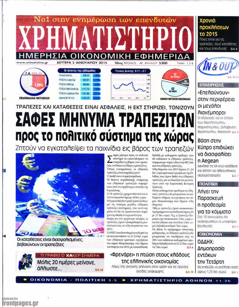 Οι οικονομικές εφημερίδες Enikos Newsroom 07:53, Δευτέρα 05 Ιανουαρίου 2015 Media Διαβάστε τα πρωτοσέλιδα των οικονομικών εφημερίδων: ΟΙΚΟΝΟΜΙΚΕΣ ΕΦΗΜΕΡΙΔΕΣ ΠΡΩΤΟΣΕΛΙΔΑ Μοιράσου το: σχολίασε κι εσύ (0 σχόλια) Ακολουθήστε το enikos.gr στο Google News και μάθετε πρώτοι όλες τις ειδήσεις Δείτε όλες τις τελευταίες ειδήσεις από την Ελλάδα και τον Κόσμο στο enikos.gr Ειδήσεις Ροή Ειδήσεων 5 ώρες πριν Νέα Πέραμος: Πού στρέφονται οι έρευνες των αρχών για το άγριο έγκλημα με θύμα τον 27χρονο επιχειρηματία – «Δεν είχε πειράξει κανέναν» λένε οι γονείς του 5 ώρες πριν Μητσοτάκης για τη συνταγματική αναθεώρηση: «Φιλοδοξία μου είναι το 2030 να έχουμε κλείσει όλες τις εκκρεμότητες με το πελατειακό κράτος» 5 ώρες πριν Εξαφάνιση Λόρας: Ο πατέρας της ήταν αυτός που αποκάλυψε ότι ταξίδεψε στη Γερμανία – Το πρόσωπο-«κλειδί», η νέα μαρτυρία και οι «στοχευμένες» κινήσεις της ανήλικης 8 ώρες πριν Δημοσκόπηση Alco: Στις 13 μονάδες η διαφορά ΝΔ-ΠΑΣΟΚ – Πώς αξιολογούν οι πολίτες τις νέες πολιτικές κινήσεις; 4 ώρες πριν The Washington Post: Τι έχουμε μάθει ως τώρα από τα νέα στοιχεία στην υπόθεση Επστάιν – «Η αλήθεια να φτάσει στο κόκκαλο» 35 λεπτά πριν Τα ζώδια σήμερα, Τρίτη 3 Φεβρουαρίου 2026: Τοξότες, σας εξαντλεί να είστε συνεχώς «στην τσίτα» και ψάχνετε κάτι διαφορετικό 7 ώρες πριν Ποιος είναι ο έρωτας της ζωή σας; Ανακαλύψτε την αδελφή-ψυχή σας με βάση τον μήνα γέννησή σας 9 ώρες πριν Λευκές περσίδες ξανά: Η απλή μέθοδος για να εξαφανίσετε την κιτρινίλα χωρίς τρίψιμο 6 ώρες πριν Ύπνος: Η βραδινή ρουτίνα που εγγυάται 8 ώρες ξεκούρασης, σύμφωνα με ειδικό 16 λεπτά πριν Η Κούβα «αδειάζει» τον Τραμπ: Δεν υπάρχει επίσημος διάλογος με τις ΗΠΑ, μόνο διπλωματικές «ανταλλαγές» 35 λεπτά πριν Τα ζώδια σήμερα, Τρίτη 3 Φεβρουαρίου 2026: Τοξότες, σας εξαντλεί να είστε συνεχώς «στην τσίτα» και ψάχνετε κάτι διαφορετικό 41 λεπτά πριν Λαβρόφ: Θεμιτοί στόχοι οι ξένες στρατιωτικές δυνάμεις στην Ουκρανία 58 λεπτά πριν Δημήτρης Νατσιός: Η μονιμότητα των δημοσίων αποτελεί κόκκινη γραμμή για εμάς – Η «Νίκη» θα κατέβει αυτόνομα στις εκλογές 1 ώρα πριν Ουκρανία: Tο Κίεβο δέχεται πυραυλική επίθεση – Ισχυρές εκρήξεις ENIKOS NETWORK 5 πράγματα που κάνουν μαζί τα ευτυχισμένα ζευγάρια Δύο παιδιά με γρίπη στις ΜΕΘ – Συνεχίζεται η απειλή των εποχικών λοιμώξεων Επιθεώρηση Εργασίας: Αυξήθηκαν κατά 4% οι έλεγχοι το 2025 – Στα 53,4 εκατ. ευρώ τα πρόστιμα Τα ξενοδοχεία κατέθεσαν αγωγή κατά της Booking για παράνομες ρήτρες Ευπάθεια στο moltbook ai αποκαλύπτει email, tokens σύνδεσης και api keys Αυτός είναι ο ρόλος της μικρής τρύπας στους νυχοκόπτες – «Είμαι ο μόνος που δεν το ήξερε;»» περισσότερα 18:18 , Δευτέρα 02 Φεβρουαρίου 2026 Άγιος Έρωτας: Η μικρή Ελευθερία δεν θέλει τους νέους της γονείς και η Χλόη καταφεύγει στον πατέρα Νικόλαο Όσα θα δούμε απόψε στο νέο επεισόδιο της σειράς “Άγιος Έρωτας” στις 22:00 στον Alp... 18:07 , Δευτέρα 02 Φεβρουαρίου 2026 MasterChef 10: Το πρώτο Mystery Box έχει την παιχνιδιάρικη υπογραφή του Πάνου Ιωαννίδη Μετά τις πρώτες εβδομάδες και τις διαδικασίες, που προηγήθηκαν, 14 διαγωνιζόμενοι της πρώτης μ... 17:45 , Δευτέρα 02 Φεβρουαρίου 2026 Grand Hotel: Ο Πέτρος και η Αλίκη είναι και πάλι μαζί Καταιγιστικές οι εξελίξεις στο νέο διπλό επεισόδιο της σειράς “Grand Hotel” στις 2... 17:15 , Δευτέρα 02 Φεβρουαρίου 2026 Να μ’ αγαπάς: Η Φωτεινή ανακοινώνει στη Ζωή πως είναι έγκυος, απόψε στις 20:00, με διπλό επεισόδιο Ο Θεόφιλος λαμβάνει τα αποτελέσματα του τεστ DΝA, στο νέο διπλό επεισόδιο της σειράς “Να... ΤΕΛΕΥΤ