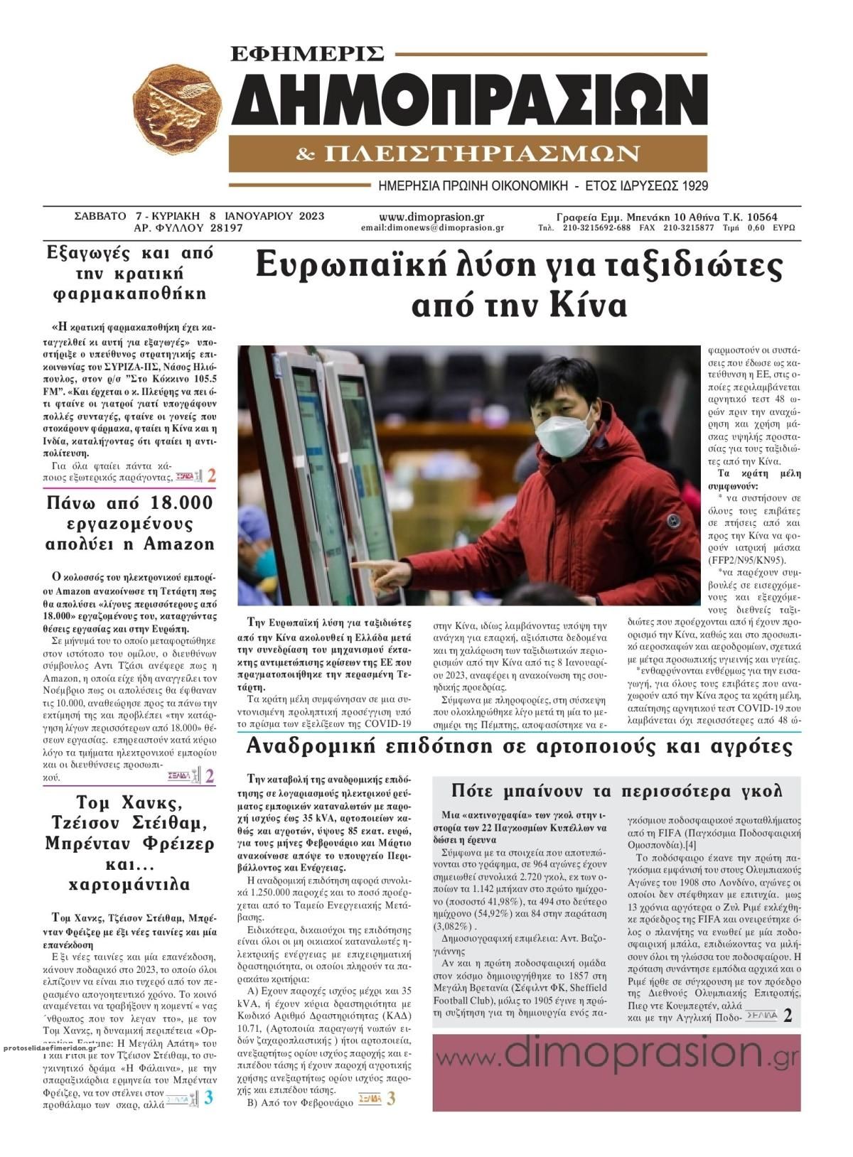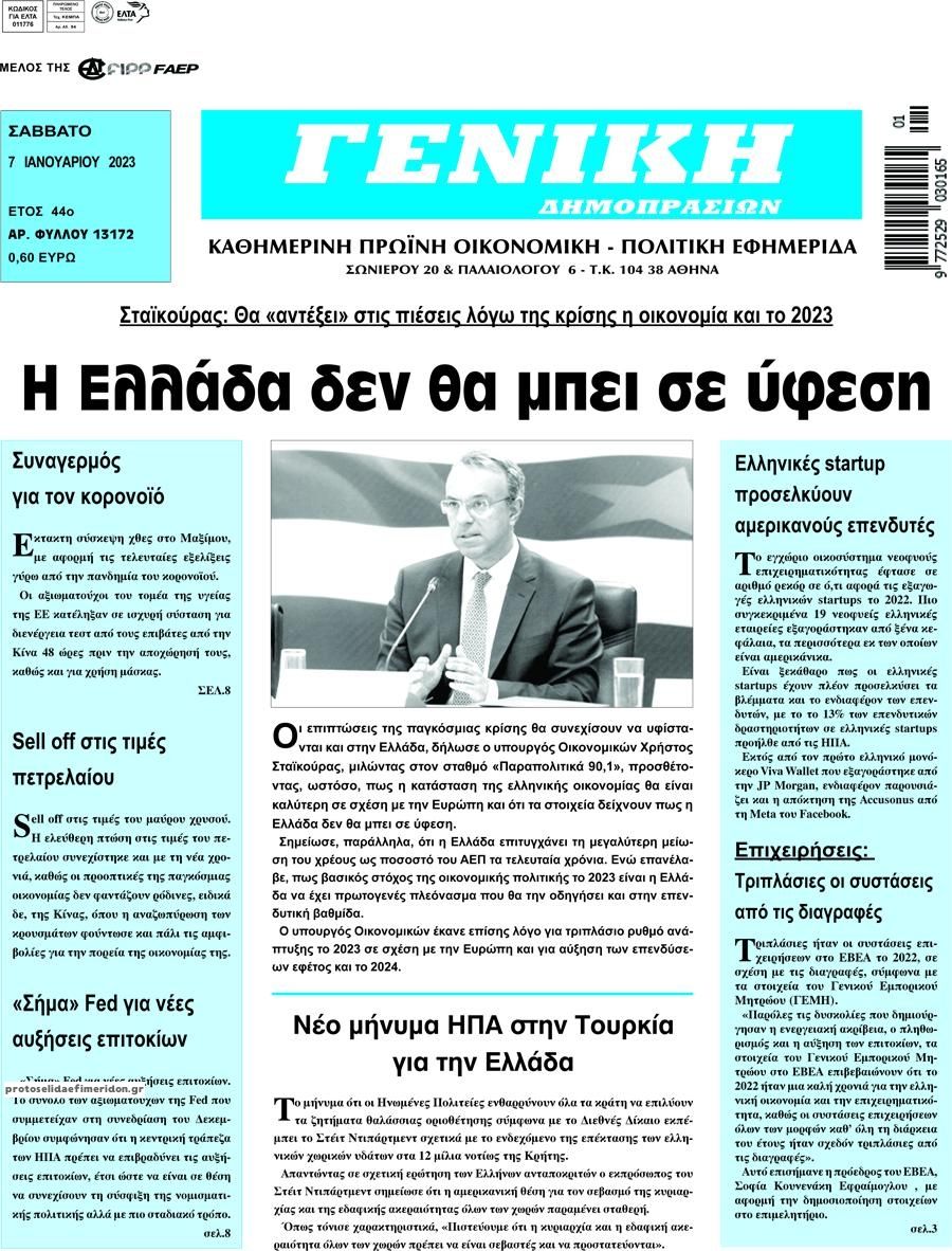 Οι οικονομικές εφημερίδες 7/1/2023 Enikos Newsroom 07:11, Σάββατο 07 Ιανουαρίου 2023 Media Διαβάστε τα πρωτοσέλιδα από τις οικονομικές εφημερίδες, σήμερα 7/1/2023.Οι οικονομικές εφημερίδες 5/1/2023 Σχετικά Άρθρα Οι οικονομικές εφημερίδες 4/1/2023Οι οικονομικές εφημερίδες 3/1/2023 ΕΦΗΜΕΡΙΔΕΣ ΟΙΚΟΝΟΜΙΚΕΣ ΕΦΗΜΕΡΙΔΕΣ ΠΡΩΤΟΣΕΛΙΔΑ Μοιράσου το: σχολίασε κι εσύ (0 σχόλια) Ακολουθήστε το enikos.gr στο Google News και μάθετε πρώτοι όλες τις ειδήσεις Δείτε όλες τις τελευταίες ειδήσεις από την Ελλάδα και τον Κόσμο στο enikos.gr Ειδήσεις Ροή Ειδήσεων 1 ώρα πριν ΣΥΡΙΖΑ: Διαγράφεται ο ευρωβουλευτής Νίκος Παππάς μετά την μήνυση δημοσιογράφου για ξυλοδαρμό 11 λεπτά πριν Τουρκία: Επιδιώκει την επιστροφή των S-400 στη Ρωσία – Οι αμερικανικές πιέσεις 22 λεπτά πριν ΟΠΕΚΕΠΕ: Ελεύθερες με όρους η σύζυγος και η αδελφή του φερόμενου αρχηγού – Τι υποστήριξαν 2 ώρες πριν Πώς στήθηκε η επιχείρηση «Ίπαλλος» που οδήγησε στη σύλληψη του «Έλληνα Εσκομπάρ» – «Ο πόλεμος ενάντια στους εμπόρους ναρκωτικών θα συνεχιστεί» 2 ώρες πριν Κυψέλη: Στη φυλακή η 16χρονη που μαχαίρωσε συμμαθήτριά της 2 ώρες πριν Τα 3 ζώδια που θα δουν τη ζωή τους να αλλάζει ριζικά το 2026 – «Όλα γίνονται καλύτερα σταδιακά» 7 ώρες πριν «Δεν είχα κλάψει από τότε που διαγνώστηκα με καρκίνο, ώσπου ένα τηλεφώνημα με έκανε να λυγίσω» – Η συγκλονιστική εξομολόγηση ενός άνδρα 3 ώρες πριν Ο σπάνιος σεισμός που έλυσε τα χέρια των επιστημόνων – Αποκάλυψε ακριβώς όσα αναζητούσαν 9 ώρες πριν 20 χρόνια τα Χριστούγεννα ξεκινούν στα Public με μεγάλη ποικιλία σε δώρα! 6 λεπτά πριν Γκίλφοϊλ για την επιχείρηση «Ίπαλλος»: Μια σημαντική νίκη στον συνεχιζόμενο αγώνα κατά του εμπορίου ναρκωτικών – Βαθιά ευγνώμων ο Τραμπ 11 λεπτά πριν Τουρκία: Επιδιώκει την επιστροφή των S-400 στη Ρωσία – Οι αμερικανικές πιέσεις 17 λεπτά πριν Στις Βρυξέλλες ο Κυριάκος Μητσοτάκης για τη Σύνοδο Κορυφής ΕΕ-Δυτικών Βαλκανίων και τη συνεδρίαση του Ευρωπαϊκού Συμβουλίου 22 λεπτά πριν ΟΠΕΚΕΠΕ: Ελεύθερες με όρους η σύζυγος και η αδελφή του φερόμενου αρχηγού – Τι υποστήριξαν 25 λεπτά πριν Υπουργείο Εργασίας: Οι 5 άξονες του σχεδίου δράσης για την ενίσχυση των συλλογικών συμβάσεων – Δείτε την Υπουργική Απόφαση ENIKOS NETWORK Γιατί αναζητούμε τα Χριστούγεννα όλο και νωρίτερα; Ποιοι οι ψυχολογικοί και οι συναισθηματικοί λόγοι Σοβαροί κίνδυνοι από τη λάθος χορήγηση φαρμάκου για τις αιμορραγίες-Συστάσεις προς τους γιατρούς Έρχεται νέα ενίσχυση 17.500 ευρώ από τη ΔΥΠΑ για ανέργους- Όλες οι λεπτομέρειες «Αναταράξεις» στην εφοδιαστική αλυσίδα από τα μπλόκα: Επιστολή του Συνδέσμου Θεσσαλικών Βιομηχανιών στον πρωθυπουργό -Τι αν... Χαρτογραφώντας το «σημείο χωρίς επιστροφή»: Για πρώτη φορά αποκαλύπτεται με λεπτομέρεια το ακανθώδες όριο της ατμόσφαιρας τ... Η Google καταργεί τη λειτουργία «dark web report» – Πώς θα μπορούν οι χρήστες να διαγράφουν τα δεδομένα τους περισσότερα 12:35 , Τετάρτη 17 Δεκεμβρίου 2025 Μίρκα Παπακωνσταντίνου: «Δεν ήμουν αισιόδοξη για τα νούμερα – Είμαι ρεαλίστρια» Στα γυρίσματα του εορταστικού επεισοδίου της αγαπημένης σειράς “Το Σόι Σου”, βρέθηκε η κάμερα ... 12:12 , Τετάρτη 17 Δεκεμβρίου 2025 Ακούστε την εκπομπή του Νίκου Χατζηνικολάου 17/12/2025 Ακούστε την εκπομπή του Νίκου Χατζηνικολάου στον ραδιοφωνικό σταθμό RealFm 97,8, την Τετάρτη 1... 11:35 , Τετάρτη 17 Δεκεμβρίου 2025 Home Alone: Το σπίτι της ταινίας θα ανακαινιστεί – Επιστροφή στην αισθητική της δεκαετίας του ’90 Οι νέοι ιδιοκτήτες του πραγματικού σπιτιού που παρουσιάζετ