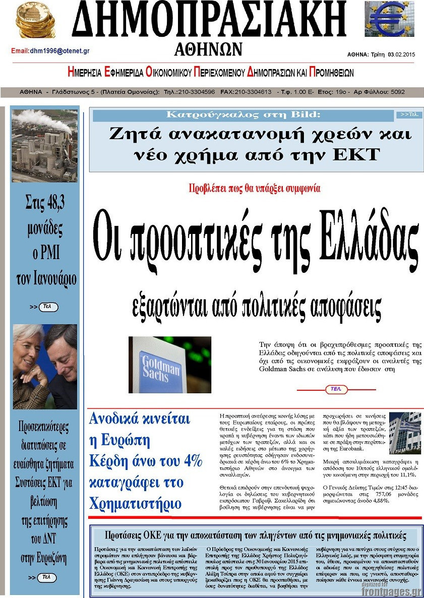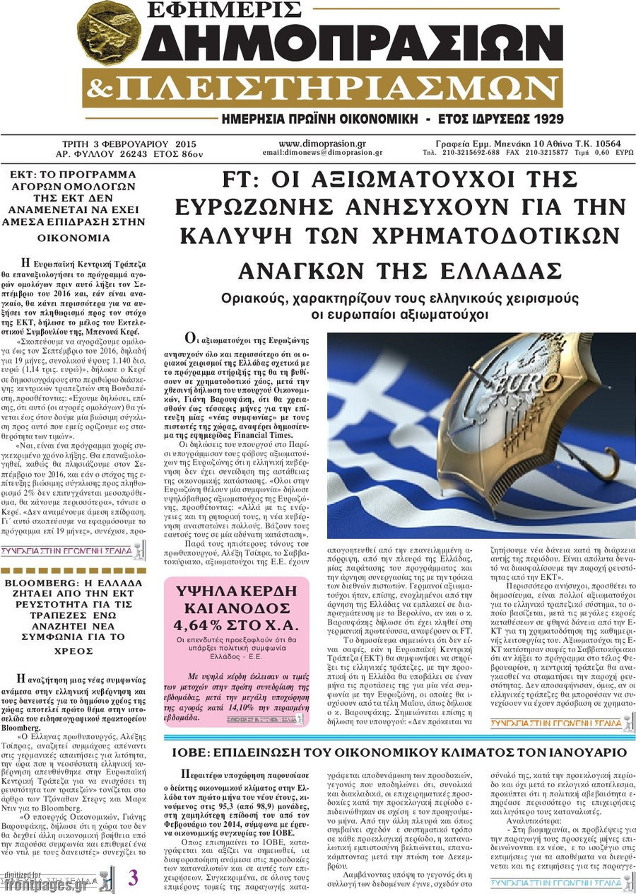 Οι οικονομικές εφημερίδες Enikos Newsroom 07:53, Τρίτη 03 Φεβρουαρίου 2015 Media Διαβάστε τα πρωτοσέλιδα των οικονομικών εφημερίδων: ΟΙΚΟΝΟΜΙΚΕΣ ΕΦΗΜΕΡΙΔΕΣ ΠΡΩΤΟΣΕΛΙΔΑ Μοιράσου το: σχολίασε κι εσύ (0 σχόλια) Ακολουθήστε το enikos.gr στο Google News και μάθετε πρώτοι όλες τις ειδήσεις Δείτε όλες τις τελευταίες ειδήσεις από την Ελλάδα και τον Κόσμο στο enikos.gr Ειδήσεις Ροή Ειδήσεων 5 ώρες πριν Μητσοτάκης: Αναγκαία η μεταρρύθμιση του πρωτογενούς τομέα – Τα 6 νέα μέτρα για το στεγαστικό και οι αναφορές σε «Ιθάκη» και «πολιτικούς του καναπέ» 4 ώρες πριν Δάνεια σε ελβετικό φράγκο: Τα βασικά σημεία της ρύθμισης – ανάσας για 40.000 δανειολήπτες – Αναλυτικός οδηγός με ερωτήσεις και απαντήσεις 4 ώρες πριν Κυψέλη: Εξιτήριο πήρε η 14χρονη μαθήτρια που μαχαιρώθηκε από την 16χρονη σε σχολείο – «Θέλω να βοηθήσω το παιδί, έχει μπλέξει με κακές παρέες» 4 ώρες πριν Τραμπ: Γιατί κατέθεσε τώρα την αγωγή κατά του BBC – Πώς η κίνησή του εξυπηρετεί το νέο δόγμα του για «αντίσταση» στην Ευρώπη, υπέρ των συντηρητικών 5 ώρες πριν ΟΠΕΚΕΠΕ – Παράνομες επιδοτήσεις: Ελεύθεροι με περιοριστικούς όρους και οι 7 κατηγορούμενοι που απολογήθηκαν σήμερα 4 ώρες πριν Ανακαλύφθηκε βυθισμένη πέτρινη κατασκευή ανοιχτά της Κριμαίας – Αποτελεί μέρος αρχαίας ελληνικής αποικίας 5 ώρες πριν Ύπνος: Αυτό μπορεί να είναι το χειρότερο λάθος για το βιολογικό ρολόι σας, σύμφωνα με ειδικό 6 ώρες πριν Αριθμολογία: Οι άνθρωποι που έχουν γεννηθεί αυτές τις 3 ημερομηνίες, προσελκύουν μεγάλη τύχη πριν από το τέλος του 2025 8 ώρες πριν Οι 7 συμπεριφορές που μαρτυρούν ότι ένας άνδρας επενδύει μακροπρόθεσμα σε μια σχέση 11 λεπτά πριν Ντόναλντ Τραμπ: Κάλυψε απόλυτα την προσωπάρχη του Λευκού Οίκου: «Ναι, έχω προσωπικότητα αλκοολικού» 26 λεπτά πριν ΗΠΑ: Στην αγορά δύο Boeing 747-8 προχωρά η Πολεμική Αεροπορία για την υποστήριξη του προεδρικού στόλου 40 λεπτά πριν Ιταλία: Λεωφορείο έπεσε πάνω σε βιτρίνα καταστήματος στο Τορίνο – Τρεις τραυματίες 56 λεπτά πριν Χαλάνδρι: Καθηγητής έπιασε με κόφτη τα δάχτυλα μαθητή σε κατάληψη – «Μου έχεις πιάσει το χέρι» 1 ώρα πριν Ουκρανία: Εκρήξεις στο Κίεβο ύστερα από προειδοποίηση για επιδρομή drones ENIKOS NETWORK Αίτημα ΙΣΑ για την εξαίρεση των προσωπικών γιατρών από τις κατ’ οίκον επισκέψεις Η σκανδιναβική μέθοδος στον ύπνο που μπορεί να σώσει έναν γάμο Πιερρακάκης: Ο προϋπολογισμός συμβάλλει ουσιαστικά στην ενίσχυση της αγοραστικής δύναμης της πλειονότητας των εργαζομένων e-ΕΦΚΑ: Παρατείνεται η προθεσμία για την υποβολή ΑΠΔ – Ποιους αφορά Σύγχρονος Νοστράδαμος: Προειδοποιεί για «μεγάλο γεγονός» τους επόμενους μήνες που θα συγκλονίσει τη Βρετανία και τον κόσμο Τεστ παρατηρητικότητας: Μπορείτε να βρείτε τις 3 διαφορές στις εικόνες με έναν πιγκουίνο σε 14 δευτερόλεπτα περισσότερα 20:06 , Τρίτη 16 Δεκεμβρίου 2025 Ο ΣΚΑΙ καταγγέλλει τον ΕΚΚΟΜΕΔ Επιστολή με την οποία καταγράφει την έντονη διαμαρτυρία του προς τον διευθύνοντα σύμβουλο του... 17:40 , Τρίτη 16 Δεκεμβρίου 2025 Eurovision: Στις 4 Ιανουαρίου αποκαλύπτονται τα 28 τραγούδια του ελληνικού τελικού Η αγωνία τελειώνει, η γιορτή της Eurovision αρχίζει στην ΕΡΤ από τις πρώτες ημέρες της νέας χρ... 17:09 , Τρίτη 16 Δεκεμβρίου 2025 Alter Ego Media: Βαθύτατη θλίψη και ειλικρινή συλλυπητήρια για την απώλεια της Ειρήνης Μαρινάκη Τη βαθύτατη θλίψη και τα ειλικρινή συλλυπητήριά της εκφράζει η Alter Ego Media για τον θάνατο ... 13:00 , Τρίτη 16 Δεκεμβρίου 2025 «Στο Παρά Πέντε – 20 Χρόνια Μετά»: Κυκλοφόρησε το τρέιλερ τ