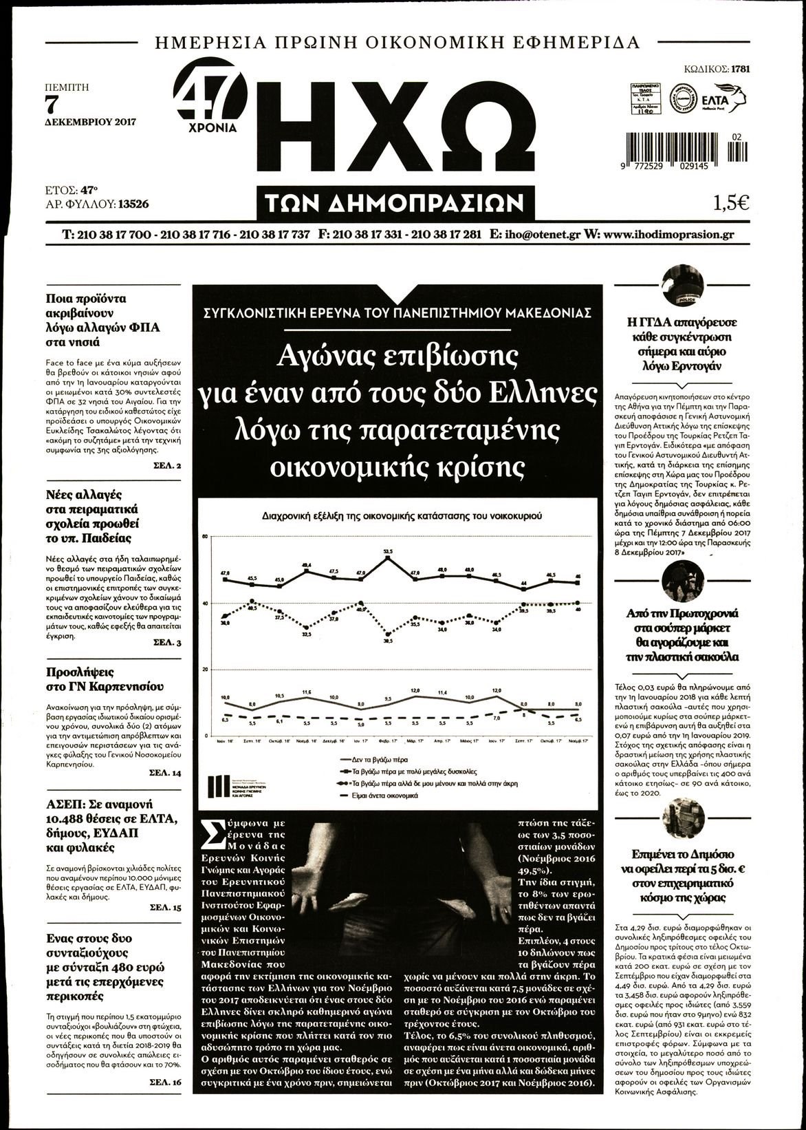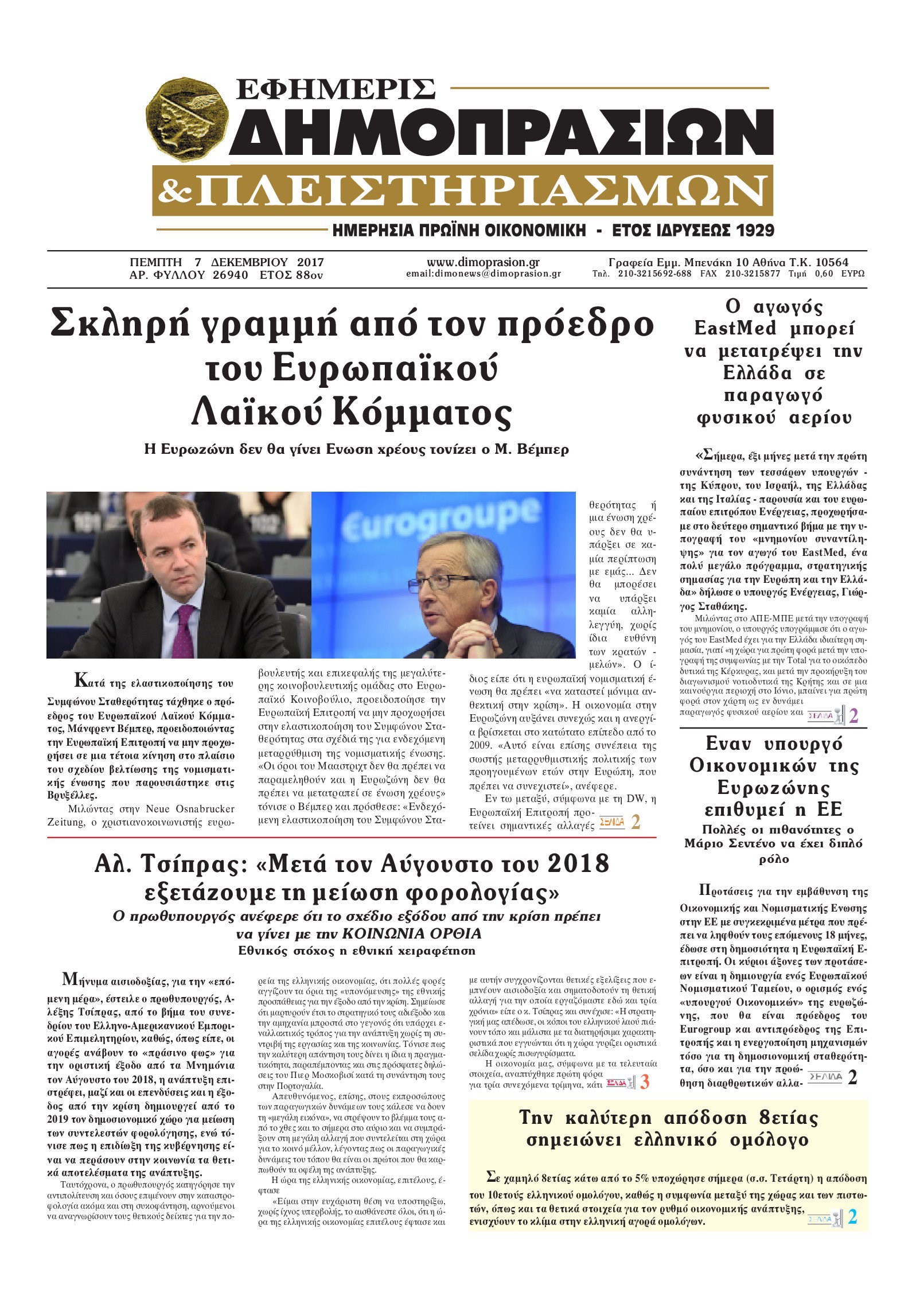 Οι οικονομικές εφημερίδες 7/12/2017 Enikos Newsroom 07:07, Πέμπτη 07 Δεκεμβρίου 2017 Media Διαβάστε τα σημερινά πρωτοσέλιδα των οικονομικών εφημερίδων: ΟΙΚΟΝΟΜΙΚΕΣ ΕΦΗΜΕΡΙΔΕΣ ΠΡΩΤΟΣΕΛΙΔΑ Μοιράσου το: σχολίασε κι εσύ (0 σχόλια) Ακολουθήστε το enikos.gr στο Google News και μάθετε πρώτοι όλες τις ειδήσεις Δείτε όλες τις τελευταίες ειδήσεις από την Ελλάδα και τον Κόσμο στο enikos.gr Ειδήσεις Ροή Ειδήσεων 57 λεπτά πριν Δίκη Βαλυράκη: Καταθέτει ο βασικός αυτόπτης μάρτυρας – «Δέχτηκα πιέσεις να μη μιλήσω, πήγα να ψωνίσω και αυτοκίνητο με χτύπησε στο πόδι» 2 ώρες πριν Γιώργος Μαζωνάκης: «Δεν ζήτησα χρήματα, παρά μόνο ηθική δικαίωση» – Οι πρώτες δηλώσεις του 22χρονου μετά την κατάθεση της μήνυσης 47 λεπτά πριν Ώρα αποφάσεων για τους αγρότες – Ξεκίνησε η πανελλαδική σύσκεψη μπλόκων στις Σέρρες – ΦΩΤΟ 5 ώρες πριν Συναγερμός και στην Ελλάδα για τη «σούπερ γρίπη»: Πόσο σοβαρή είναι και ποιοι θεωρούνται πιο ευάλωτοι – 3 ειδικοί μιλούν στο enikos.gr 2 ώρες πριν Γαλλία: Η οργή των αγροτών – Αναμένεται η ομιλία του Μακρόν, τα τρακτέρ συγκεντρώνονται μαζικά στις Βρυξέλλες 6 ώρες πριν Τα 4 ζώδια που λαμβάνουν ένα ισχυρό σημάδι από το σύμπαν – «Αποκαλύπτεται κάτι που μπορεί να αλλάξει τη ζωή μας» 5 ώρες πριν Αν κάνετε συνεχώς αυτά τα 8 πράγματα με τα κατοικίδιά σας, σας λείπει η ανθρώπινη επαφή 1 ώρα πριν Αυτό που κρύβεται κάτω από τη Γροιλανδία θα μπορούσε να ανατρέψει όσα γνωρίζουμε για την άνοδο της στάθμης των θαλασσών 1 ημέρα πριν 20 χρόνια τα Χριστούγεννα ξεκινούν στα Public με μεγάλη ποικιλία σε δώρα! 5 λεπτά πριν Ευλογιά αιγοπροβάτων: Νέες αποζημιώσεις ύψους 26 εκατ. ευρώ σε κτηνοτρόφους – Η κατανομή ανά Περιφέρεια 10 λεπτά πριν Το Σπίτι Δίπλα Στο Ποτάμι: Το καθηλωτικό τελευταίο επεισόδιο για το 2025 απόψε στις 22:30 14 λεπτά πριν Βραζιλία: Νεκρή 25χρονη influencer που έπεσε από τον 10ο όροφο έπειτα από καβγά με τον σύζυγό της – Συνελήφθη ο 40χρονος – ΒΙΝΤΕΟ-σοκ 19 λεπτά πριν Μεσολόγγι: Εγκατέλειψαν κουτάβια δίπλα από αυλάκι – Τα έσωσε η Πυροσβεστική – ΒΙΝΤΕΟ 24 λεπτά πριν Τσουκαλάς: Η κυβέρνηση του «δεν ξέρω-δεν είδα-δεν άκουσα» νομίζει ότι θα βυθιστεί σε αμνησία όλη η ελληνική κοινωνία για το σκάνδαλο στον ΟΠΕΚΕΠΕ ENIKOS NETWORK 100 χρόνια ΠΙΣ: Ένας αιώνας προσφοράς στην Ιατρική και την κοινωνία Ένα ποτήρι την ημέρα από αυτόν τον χυμό μειώνει τη χοληστερίνη, τη φλεγμονή και την πίεση Αυτόματη απόδοση ΦΠΑ: Τα δύο σενάρια που επεξεργάζεται η ΑΑΔΕ ΑΑΔΕ: Έρχεται το… ΔΕΟΣ – Όλες οι λεπτομέρειες για τον ενιαίο ελεγκτικό μηχανισμό για το οικονομικό έγκλημα Χαρτογραφώντας το «σημείο χωρίς επιστροφή»: Για πρώτη φορά αποκαλύπτεται με λεπτομέρεια το ακανθώδες όριο της ατμόσφαιρας τ... Η Google καταργεί τη λειτουργία «dark web report» – Πώς θα μπορούν οι χρήστες να διαγράφουν τα δεδομένα τους περισσότερα 15:52 , Πέμπτη 18 Δεκεμβρίου 2025 Το Σπίτι Δίπλα Στο Ποτάμι: Το καθηλωτικό τελευταίο επεισόδιο για το 2025 απόψε στις 22:30 Καθηλώνει το σημερινό επεισόδιο της σειράς “Το Σπίτι Δίπλα Στο Ποτάμι” που έρχεται... 15:20 , Πέμπτη 18 Δεκεμβρίου 2025 Άγιος έρωτας – Η Ελευθερία Αρβανιτάκη τραγουδά και ο Γιάννης Τσορτέκης καθηλώνει με τον χορό του Ο Κλεάνθης χορεύει στους ήχους της Ελευθερίας Αρβανιτάκη στη σειρά “Άγιος Έρωτας“.... 08:00 , Πέμπτη 18 Δεκεμβρίου 2025 Την Κυριακή με τη Realnews: Δωροεπιταγή 10€ Δωροεπιταγή αξίας 10€ για αγορές άνω των 60€ από τα πολυκαταστήματα FactoryOutlet H προσφορά ι... 07:50 , Πέμπτη 18 Δεκεμβρίου 2025 «Το σόι σου»: Backstage στα γυρίσματα για το εορταστ