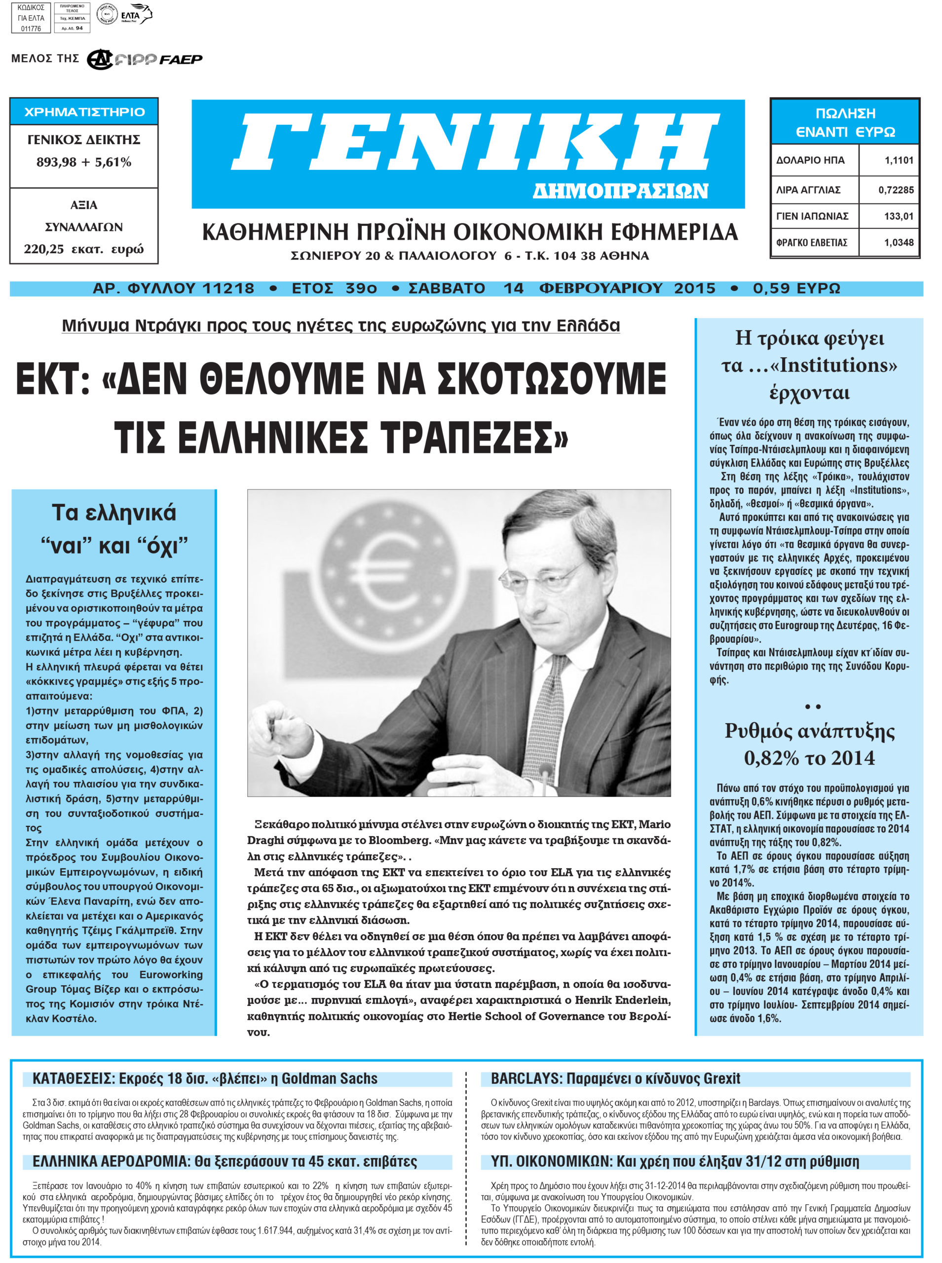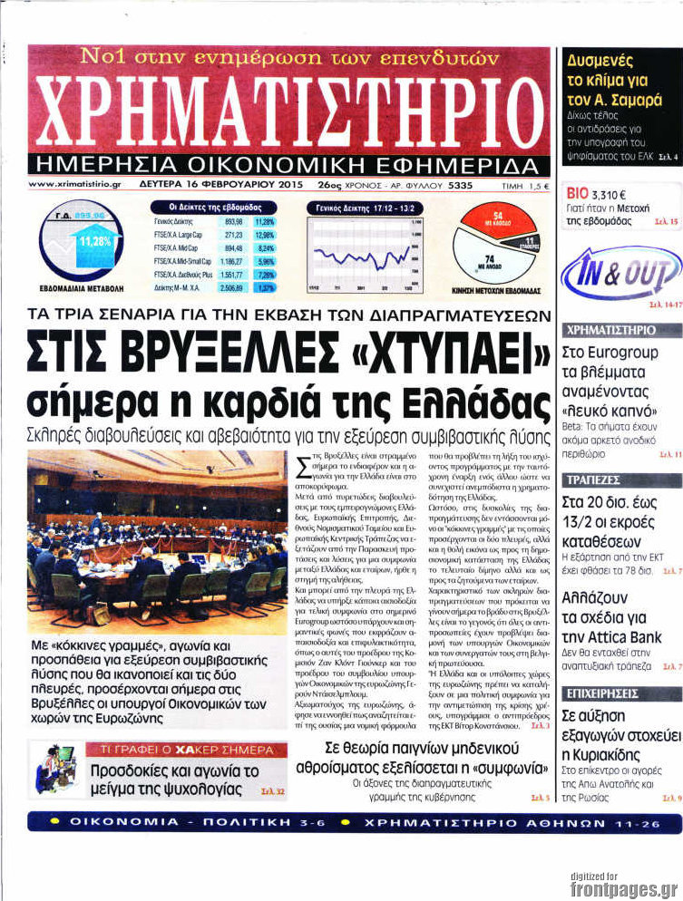 Οι οικονομικές εφημερίδες Enikos Newsroom 08:25, Δευτέρα 16 Φεβρουαρίου 2015 Media Διαβάστε τα σημερινά πρωτοσέλιδα των οικονομικών εφημερίδων: ΕΦΗΜΕΡΙΔΕΣ ΟΙΚΟΝΟΜΙΚΕΣ ΕΦΗΜΕΡΙΔΕΣ ΠΡΩΤΟΣΕΛΙΔΑ Μοιράσου το: σχολίασε κι εσύ (0 σχόλια) Ακολουθήστε το enikos.gr στο Google News και μάθετε πρώτοι όλες τις ειδήσεις Δείτε όλες τις τελευταίες ειδήσεις από την Ελλάδα και τον Κόσμο στο enikos.gr Ειδήσεις Ροή Ειδήσεων 7 ώρες πριν Μητσοτάκης: Αναγκαία η μεταρρύθμιση του πρωτογενούς τομέα – Τα 6 νέα μέτρα για το στεγαστικό και οι αναφορές σε «Ιθάκη» και «πολιτικούς του καναπέ» 7 ώρες πριν Δάνεια σε ελβετικό φράγκο: Τα βασικά σημεία της ρύθμισης – ανάσας για 40.000 δανειολήπτες – Αναλυτικός οδηγός με ερωτήσεις και απαντήσεις 6 ώρες πριν Κυψέλη: Εξιτήριο πήρε η 14χρονη μαθήτρια που μαχαιρώθηκε από την 16χρονη σε σχολείο – «Θέλω να βοηθήσω το παιδί, έχει μπλέξει με κακές παρέες» 6 ώρες πριν Τραμπ: Γιατί κατέθεσε τώρα την αγωγή κατά του BBC – Πώς η κίνησή του εξυπηρετεί το νέο δόγμα του για «αντίσταση» στην Ευρώπη, υπέρ των συντηρητικών 7 ώρες πριν ΟΠΕΚΕΠΕ – Παράνομες επιδοτήσεις: Ελεύθεροι με περιοριστικούς όρους και οι 7 κατηγορούμενοι που απολογήθηκαν σήμερα 6 ώρες πριν Ανακαλύφθηκε βυθισμένη πέτρινη κατασκευή ανοιχτά της Κριμαίας – Αποτελεί μέρος αρχαίας ελληνικής αποικίας 7 ώρες πριν Ύπνος: Αυτό μπορεί να είναι το χειρότερο λάθος για το βιολογικό ρολόι σας, σύμφωνα με ειδικό 8 ώρες πριν Αριθμολογία: Οι άνθρωποι που έχουν γεννηθεί αυτές τις 3 ημερομηνίες, προσελκύουν μεγάλη τύχη πριν από το τέλος του 2025 10 ώρες πριν Οι 7 συμπεριφορές που μαρτυρούν ότι ένας άνδρας επενδύει μακροπρόθεσμα σε μια σχέση 12 λεπτά πριν Παλαιστινιακό: «Η λύση των δύο κρατών είναι ο μόνος βιώσιμος δρόμος», τόνισε η Ελλάδα στο Συμβούλιο Ασφαλείας του ΟΗΕ 20 λεπτά πριν Ελένη Καρακάση: «Ένιωθα πολύ αδικημένη, δεν μπορούσα να ελέγξω τον εαυτό μου σε δύσκολες στιγμές» 28 λεπτά πριν Κλαούδια Σέινμπαουμ προς Ντόναλντ Τραμπ για φαιντανύλη: Να επιτεθούμε στα αίτια κατανάλωσης αντί να την κατατάσσουμε στα «όπλα μαζικής καταστροφής» 36 λεπτά πριν Ρωσία: Ουκρανική επίθεση με drones στο Κρασνοντάρ – Δύο τραυματίες, ζημιές σε σπίτια και διακοπή ρεύματος 44 λεπτά πριν Αντόνιο Ταγιάνι: Νομικά εμπόδια για τη χρήση των ρωσικών κεφαλαίων υπέρ της Ουκρανίας ENIKOS NETWORK Αίτημα ΙΣΑ για την εξαίρεση των προσωπικών γιατρών από τις κατ’ οίκον επισκέψεις Η σκανδιναβική μέθοδος στον ύπνο που μπορεί να σώσει έναν γάμο Πιερρακάκης: Ο προϋπολογισμός συμβάλλει ουσιαστικά στην ενίσχυση της αγοραστικής δύναμης της πλειονότητας των εργαζομένων e-ΕΦΚΑ: Παρατείνεται η προθεσμία για την υποβολή ΑΠΔ – Ποιους αφορά Σύγχρονος Νοστράδαμος: Προειδοποιεί για «μεγάλο γεγονός» τους επόμενους μήνες που θα συγκλονίσει τη Βρετανία και τον κόσμο Τεστ παρατηρητικότητας: Μπορείτε να βρείτε τις 3 διαφορές στις εικόνες με έναν πιγκουίνο σε 14 δευτερόλεπτα περισσότερα 20:06 , Τρίτη 16 Δεκεμβρίου 2025 Ο ΣΚΑΙ καταγγέλλει τον ΕΚΚΟΜΕΔ Επιστολή με την οποία καταγράφει την έντονη διαμαρτυρία του προς τον διευθύνοντα σύμβουλο του... 17:40 , Τρίτη 16 Δεκεμβρίου 2025 Eurovision: Στις 4 Ιανουαρίου αποκαλύπτονται τα 28 τραγούδια του ελληνικού τελικού Η αγωνία τελειώνει, η γιορτή της Eurovision αρχίζει στην ΕΡΤ από τις πρώτες ημέρες της νέας χρ... 17:09 , Τρίτη 16 Δεκεμβρίου 2025 Alter Ego Media: Βαθύτατη θλίψη και ειλικρινή συλλυπητήρια για την απώλεια της Ειρήνης Μαρινάκη Τη βαθύτατη θλίψη και τα ειλικρινή συλλυ