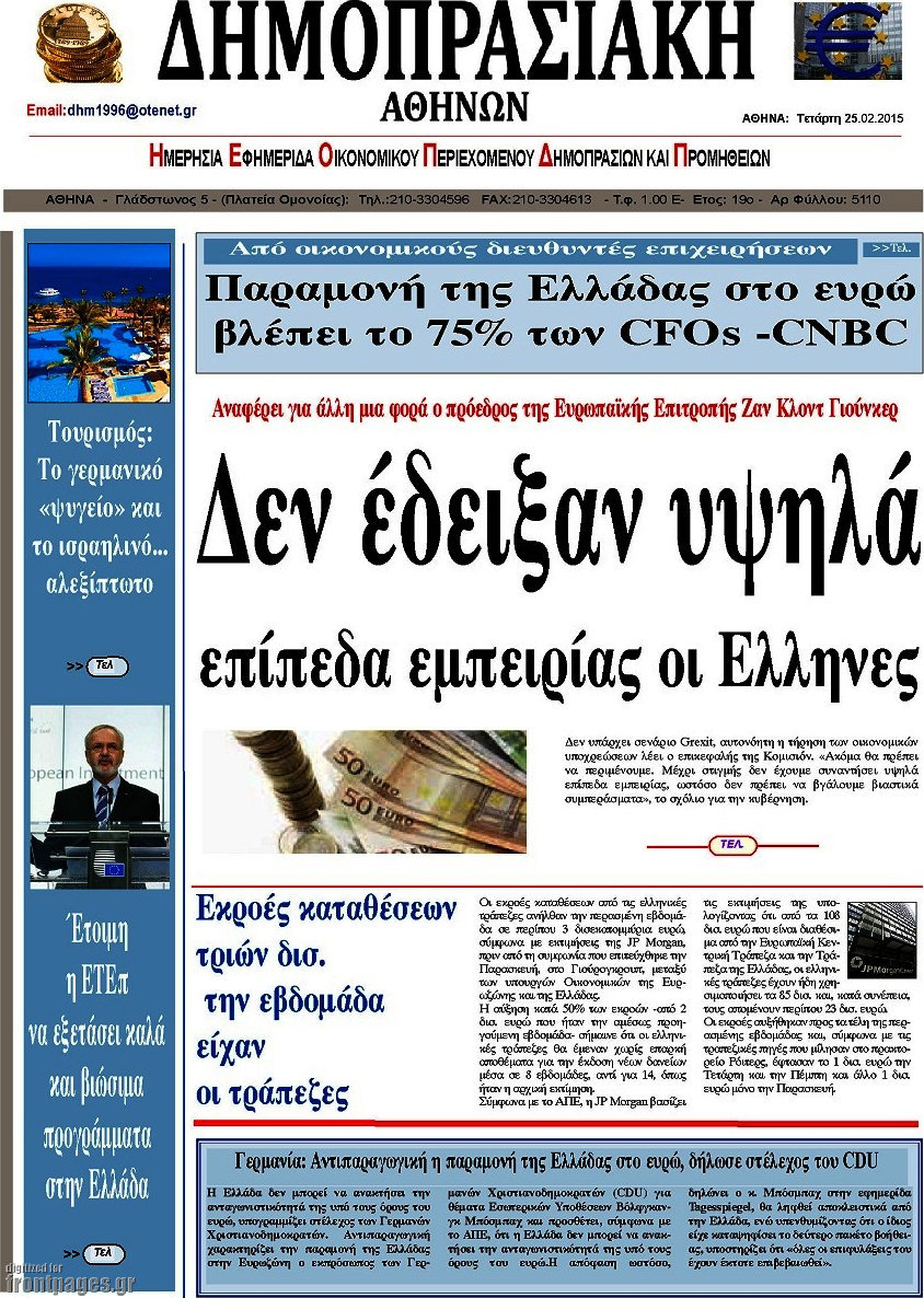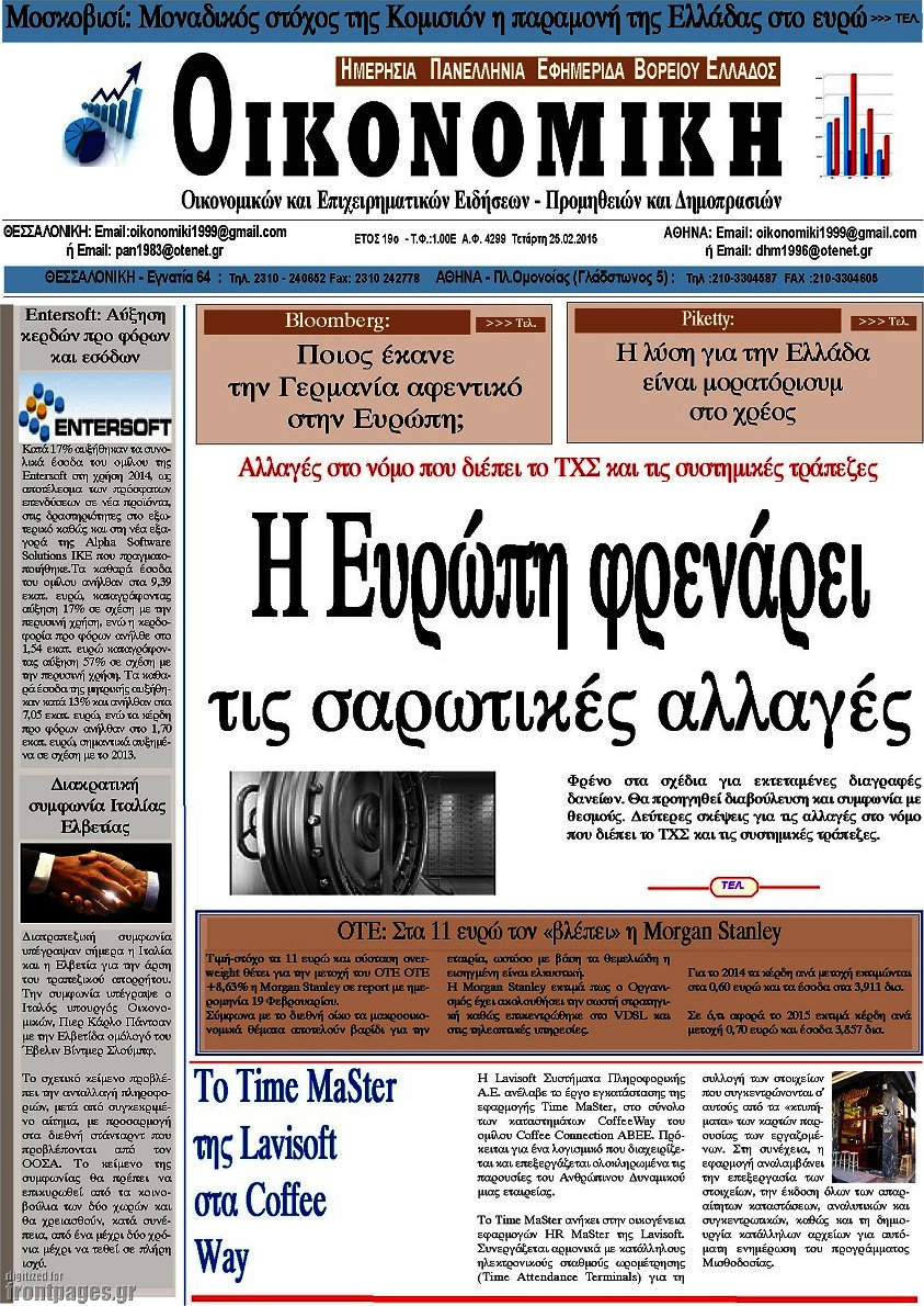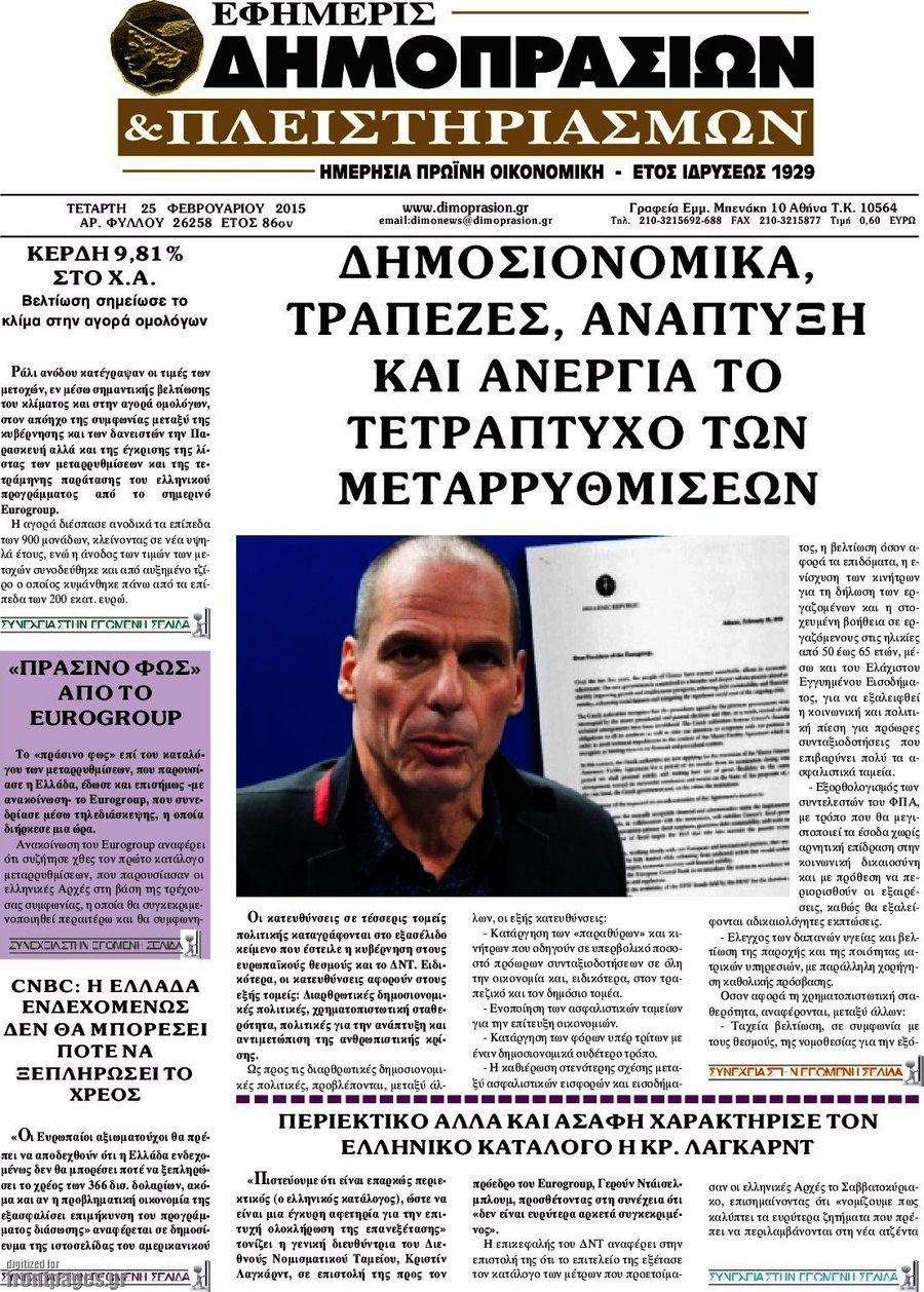 Οι οικονομικές εφημερίδες Enikos Newsroom 07:28, Τετάρτη 25 Φεβρουαρίου 2015 Media Διαβάστε τα σημερινά πρωτοσέλιδα των οικονομικών εφημερίδων: ΟΙΚΟΝΟΜΙΚΕΣ ΕΦΗΜΕΡΙΔΕΣ ΠΡΩΤΟΣΕΛΙΔΑ Μοιράσου το: σχολίασε κι εσύ (0 σχόλια) Ακολουθήστε το enikos.gr στο Google News και μάθετε πρώτοι όλες τις ειδήσεις Δείτε όλες τις τελευταίες ειδήσεις από την Ελλάδα και τον Κόσμο στο enikos.gr Ειδήσεις Ροή Ειδήσεων 5 ώρες πριν Εκτός ευρωομάδας ΣΥΡΙΖΑ ο Νίκος Παππάς μετά την επίθεση στον δημοσιογράφο Νίκο Γιαννόπουλο – Η μήνυση και οι νέες δηλώσεις 5 ώρες πριν «Αγριεύουν» οι αγρότες: «Δεν συντρέχει λόγος συνάντησης με τον πρωθυπουργό» – Ώρα αποφάσεων στη σύσκεψη της Πέμπτης 5 ώρες πριν Κυψέλη: Χωρίς την οικογένειά της δίπλα της απολογήθηκε η 16χρονη – «Της είχε επιτεθεί κάποιος για να την βιάσει, φοβήθηκε και κυκλοφορούσε με μαχαίρι» 5 ώρες πριν Politico: Το πρόβλημα της Ευρώπης δεν είναι το Βέλγιο αλλά ο Ντόναλντ Τραμπ 6 ώρες πριν Αλεξανδρούπολη: Πολυοργανική ανεπάρκεια λόγω υποσιτισμού η αιτία θανάτου του 3χρονου αγοριού 5 ώρες πριν Μυστήριο με τεράστιες κυκλικές πέτρες 200 κιλών – Ανακαλύφθηκαν τυχαία κατά τη διάρκεια οδικών έργων και κανείς δεν ξέρει από πού προέρχονται 6 ώρες πριν Ύπνος: Ειδικός εξηγεί τον πραγματικό λόγο που ξυπνάτε στις 4 τα ξημερώματα – Ο ρόλος των ορμονών και του κιρκάδιου ρυθμού 7 ώρες πριν Αριθμολογία: Οι άνθρωποι που έχουν γεννηθεί αυτές τις 4 ημερομηνίες, είναι τρυφεροί και αγαπούν ανιδιοτελώς 19 ώρες πριν 20 χρόνια τα Χριστούγεννα ξεκινούν στα Public με μεγάλη ποικιλία σε δώρα! 9 λεπτά πριν GNTM: Με δάκρυα τον αποχαιρέτησε η Ηλιάνα Παπαγεωργίου πριν από τον ημιτελικό – «Αισθάνομαι πολύ παράξενα» 24 λεπτά πριν Αμερικανικά στρατεύματα στον Ισημερινό για «προσωρινή» επιχείρηση κατά των ναρκωτικών 40 λεπτά πριν Βραζιλία: Το Κογκρέσο ενέκρινε σχέδιο νόμου για τη μείωση της ποινής του πρώην προέδρου Μπολσονάρου 54 λεπτά πριν Ένταση στο περιφερειακό συμβούλιο Δυτικής Μακεδονίας: Φωνές, σπρωξιές και διακοπή – Δείτε βίντεο 1 ώρα πριν Σουδάν: Επιδρομή drone σε χωριό του Νότιου Κορντοφάν – Οκτώ νεκροί ENIKOS NETWORK Αϋπνία: Το κόλπο που θα σας βοηθήσει να κοιμηθείτε απόψε – Είναι απλό και έχει αποτέλεσμα 2,6 εκατομμύρια πολίτες έχουν ήδη εμβολιαστεί κατά της γρίπης ΕΛΣΤΑΤ: Τι δείχνουν τα νέα στοιχεία για τις ηλεκτρονικές παραγγελίες των επιχειρήσεων ΚΕΠΕ: Οι 3 διακριτές συμβολές των ΜμΕ και της μεταποίησης στην ελληνική οικονομία Χαρτογραφώντας το «σημείο χωρίς επιστροφή»: Για πρώτη φορά αποκαλύπτεται με λεπτομέρεια το ακανθώδες όριο της ατμόσφαιρας τ... Η Google καταργεί τη λειτουργία «dark web report» – Πώς θα μπορούν οι χρήστες να διαγράφουν τα δεδομένα τους περισσότερα 02:30 , Πέμπτη 18 Δεκεμβρίου 2025 Αλ Τσαντίρι Νιουζ: Η κόρη της Πάολα στο κοινό – Η ατάκα Λαζόπουλου που την έκανε να «κοκκινήσει» Γιορτινή διάθεση και ευχάριστες στιγμές γέμισε η αποψινή, τελευταία για το 2025, εκπομπή του «... 22:24 , Τετάρτη 17 Δεκεμβρίου 2025 Το Σπίτι Δίπλα Στο Ποτάμι: Σε κίνδυνο η υγεία του Απόστολου – Τι θα δούμε απόψε “Το Σπίτι Δίπλα στο Ποτάμι” ξετυλίγει το νήμα της ζωής των πέντε αδελφών με καταισ... 21:14 , Τετάρτη 17 Δεκεμβρίου 2025 Παιχνίδια Εκδίκησης: Θα καταφέρει ο Χρήστος να κλονίσει την εμπιστοσύνη της Μάγιας απέναντι στον Άγη; Τα «Παιχνίδια Εκδίκησης» έρχονται απόψε στις 22:30, στον Αντ1, με το τελευταίο επεισόδιο της χ... 20:57 , Τετάρτη 17 Δεκεμβρίου 2025 Άγιος Έρωτας: Η Χλόη καταθέτει εναντίον του πατέρα της και ο Χάρης απ