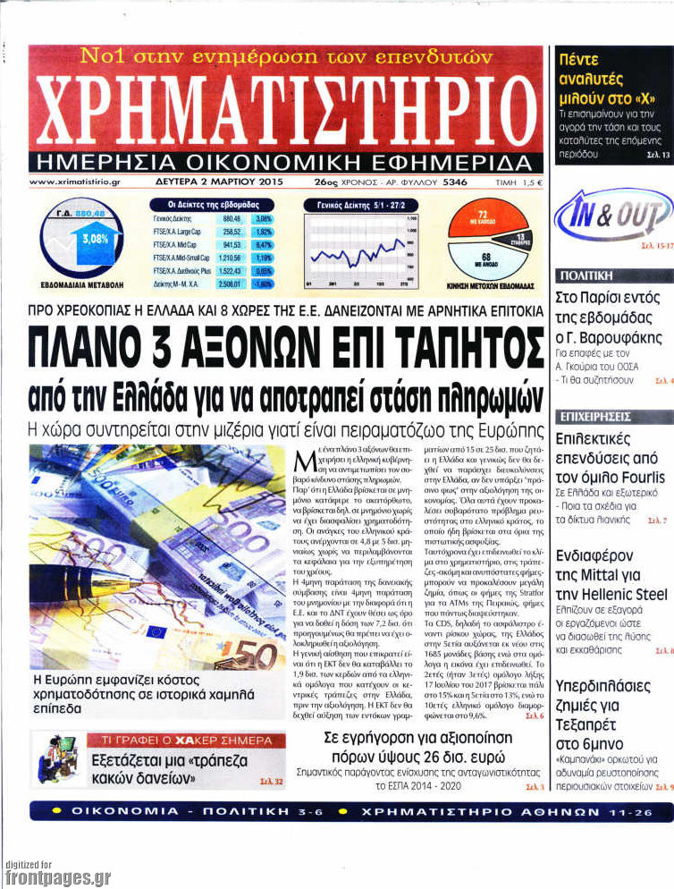 Οι οικονομικές εφημερίδες Enikos Newsroom 07:42, Δευτέρα 02 Μαρτίου 2015 Media Διαβάστε τα σημερινά πρωτοσέλιδα των οικονομικών εφημερίδων: ΟΙΚΟΝΟΜΙΚΕΣ ΕΦΗΜΕΡΙΔΕΣ ΠΡΩΤΟΣΕΛΙΔΑ Μοιράσου το: σχολίασε κι εσύ (0 σχόλια) Ακολουθήστε το enikos.gr στο Google News και μάθετε πρώτοι όλες τις ειδήσεις Δείτε όλες τις τελευταίες ειδήσεις από την Ελλάδα και τον Κόσμο στο enikos.gr Ειδήσεις Ροή Ειδήσεων 1 ώρα πριν ΣΥΡΙΖΑ: Διαγράφεται ο ευρωβουλευτής Νίκος Παππάς μετά την μήνυση δημοσιογράφου για ξυλοδαρμό 2 ώρες πριν Πώς στήθηκε η επιχείρηση «Ίπαλλος» που οδήγησε στη σύλληψη του «Έλληνα Εσκομπάρ» – «Ο πόλεμος ενάντια στους εμπόρους ναρκωτικών θα συνεχιστεί» 2 ώρες πριν Δίκη Χρυσής Αυγής: Την ενοχή και των 42 κατηγορουμένων ζητά η εισαγγελέας 2 ώρες πριν Κυψέλη: Στη φυλακή η 16χρονη που μαχαίρωσε συμμαθήτριά της 5 ώρες πριν Αμοργός: «Θα προσπαθήσω να το κάνω κάθε μέρα» – Ποιος είναι ο αγρότης που έστησε μόνος του το πρώτο μπλόκο στο νησί 2 ώρες πριν Τα 3 ζώδια που θα δουν τη ζωή τους να αλλάζει ριζικά το 2026 – «Όλα γίνονται καλύτερα σταδιακά» 7 ώρες πριν «Δεν είχα κλάψει από τότε που διαγνώστηκα με καρκίνο, ώσπου ένα τηλεφώνημα με έκανε να λυγίσω» – Η συγκλονιστική εξομολόγηση ενός άνδρα 3 ώρες πριν Ο σπάνιος σεισμός που έλυσε τα χέρια των επιστημόνων – Αποκάλυψε ακριβώς όσα αναζητούσαν 9 ώρες πριν 20 χρόνια τα Χριστούγεννα ξεκινούν στα Public με μεγάλη ποικιλία σε δώρα! 3 λεπτά πριν Τουρκία: Επιδιώκει την επιστροφή των S-400 στη Ρωσία – Οι αμερικανικές πιέσεις 8 λεπτά πριν Στις Βρυξέλλες ο Κυριάκος Μητσοτάκης για τη Σύνοδο Κορυφής ΕΕ-Δυτικών Βαλκανίων και τη συνεδρίαση του Ευρωπαϊκού Συμβουλίου 14 λεπτά πριν ΟΠΕΚΕΠΕ: Ελεύθερες με όρους η σύζυγος και η αδελφή του φερόμενου αρχηγού – Τι υποστήριξαν 16 λεπτά πριν Υπουργείο Εργασίας: Οι 5 άξονες του σχεδίου δράσης για την ενίσχυση των συλλογικών συμβάσεων – Δείτε την Υπουργική Απόφαση 20 λεπτά πριν Καβάλα: Βίντεο ντοκουμέντο από διάρρηξη σε καφετέρια – Έσπασαν την τζαμαρία, άρπαξαν το συρτάρι του ταμείου και έγιναν καπνός ENIKOS NETWORK Γιατί αναζητούμε τα Χριστούγεννα όλο και νωρίτερα; Ποιοι οι ψυχολογικοί και οι συναισθηματικοί λόγοι Σοβαροί κίνδυνοι από τη λάθος χορήγηση φαρμάκου για τις αιμορραγίες-Συστάσεις προς τους γιατρούς Έρχεται νέα ενίσχυση 17.500 ευρώ από τη ΔΥΠΑ για ανέργους- Όλες οι λεπτομέρειες «Αναταράξεις» στην εφοδιαστική αλυσίδα από τα μπλόκα: Επιστολή του Συνδέσμου Θεσσαλικών Βιομηχανιών στον πρωθυπουργό -Τι αν... Χαρτογραφώντας το «σημείο χωρίς επιστροφή»: Για πρώτη φορά αποκαλύπτεται με λεπτομέρεια το ακανθώδες όριο της ατμόσφαιρας τ... Η Google καταργεί τη λειτουργία «dark web report» – Πώς θα μπορούν οι χρήστες να διαγράφουν τα δεδομένα τους περισσότερα 12:35 , Τετάρτη 17 Δεκεμβρίου 2025 Μίρκα Παπακωνσταντίνου: «Δεν ήμουν αισιόδοξη για τα νούμερα – Είμαι ρεαλίστρια» Στα γυρίσματα του εορταστικού επεισοδίου της αγαπημένης σειράς “Το Σόι Σου”, βρέθηκε η κάμερα ... 12:12 , Τετάρτη 17 Δεκεμβρίου 2025 Ακούστε την εκπομπή του Νίκου Χατζηνικολάου 17/12/2025 Ακούστε την εκπομπή του Νίκου Χατζηνικολάου στον ραδιοφωνικό σταθμό RealFm 97,8, την Τετάρτη 1... 11:35 , Τετάρτη 17 Δεκεμβρίου 2025 Home Alone: Το σπίτι της ταινίας θα ανακαινιστεί – Επιστροφή στην αισθητική της δεκαετίας του ’90 Οι νέοι ιδιοκτήτες του πραγματικού σπιτιού που παρουσιάζεται στην κλασική ταινία του 1990 «Hom... 11:25 , Τετάρτη 17 Δεκεμβρίου 2025 Grand Hotel: Απόψε το τελευταίο επεισόδιο της χρονιάς – Όλα τα μυστικά μ