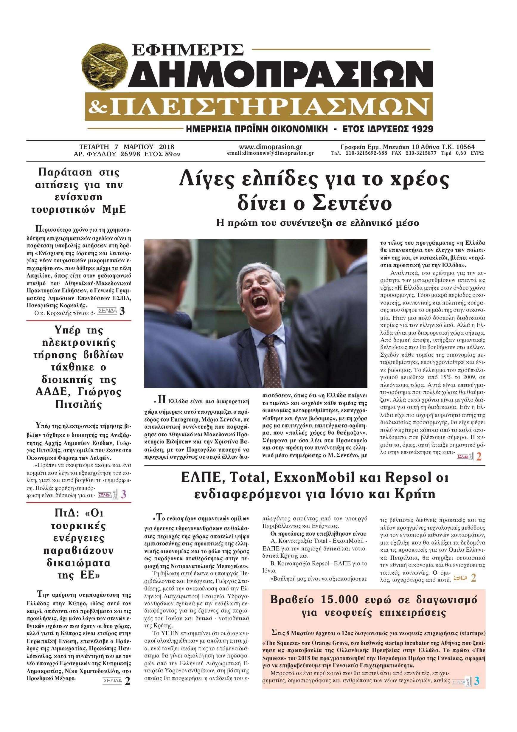 Οι οικονομικές εφημερίδες 7/3/2018 Κώστας Τεό 06:36, Τετάρτη 07 Μαρτίου 2018 Media Διαβάστε τα σημερινά πρωτοσέλιδα των οικονομικών εφημερίδων: ΟΙΚΟΝΟΜΙΚΕΣ ΕΦΗΜΕΡΙΔΕΣ ΠΡΩΤΟΣΕΛΙΔΑ Μοιράσου το: σχολίασε κι εσύ (0 σχόλια) Ακολουθήστε το enikos.gr στο Google News και μάθετε πρώτοι όλες τις ειδήσεις Δείτε όλες τις τελευταίες ειδήσεις από την Ελλάδα και τον Κόσμο στο enikos.gr Ειδήσεις Ροή Ειδήσεων 16 λεπτά πριν Αγρότες: «Όχι στον διάλογο, μας εμπαίζει η κυβέρνηση» – Αποφάσισαν κλιμάκωση των κινητοποιήσεων 44 λεπτά πριν Την πρώτη Belharra παρέλαβε η χώρα μας, υψώθηκε η ελληνική σημαία στη φρεγάτα «Κίμων» – Δένδιας: «Το ισχυρότερο Πολεμικό Ναυτικό που είχε ποτέ ο ελληνισμός» 3 ώρες πριν Γιώργος Μαζωνάκης: «Δεν ζήτησα χρήματα, παρά μόνο ηθική δικαίωση» – Οι πρώτες δηλώσεις του 21χρονου μετά την κατάθεση της μήνυσης 2 ώρες πριν Δίκη Βαλυράκη: Καταθέτει ο βασικός αυτόπτης μάρτυρας – «Δέχτηκα πιέσεις να μη μιλήσω, πήγα να ψωνίσω και αυτοκίνητο με χτύπησε στο πόδι» 6 ώρες πριν Συναγερμός και στην Ελλάδα για τη «σούπερ γρίπη»: Πόσο σοβαρή είναι και ποιοι θεωρούνται πιο ευάλωτοι – 3 ειδικοί μιλούν στο enikos.gr 1 ώρα πριν Τα 5 ζώδια που θα ευνοηθούν στα οικονομικά τους το 2026 – «Τραβούν το χρήμα σαν μαγνήτες» 6 ώρες πριν Αν κάνετε συνεχώς αυτά τα 8 πράγματα με τα κατοικίδιά σας, σας λείπει η ανθρώπινη επαφή 2 ώρες πριν Αυτό που κρύβεται κάτω από τη Γροιλανδία θα μπορούσε να ανατρέψει όσα γνωρίζουμε για την άνοδο της στάθμης των θαλασσών 1 ημέρα πριν 20 χρόνια τα Χριστούγεννα ξεκινούν στα Public με μεγάλη ποικιλία σε δώρα! 1 λεπτό πριν Μιχάλης Χουρδάκης: «Είμαι διαθέσιμος να συμβάλω στην προσωρινή κάλυψη του ιατρείου της Ψερίμου» – Η επιστολή στον Άδωνι Γεωργιάδη 6 λεπτά πριν Κουίζ για την παλιά Αθήνα: Αναγνωρίζετε την περιοχή; Είναι από τις πιο γνωστές 11 λεπτά πριν Λάμπρος Κωνσταντάρας για τα φετινά Χριστούγεννα: «Θα είναι πάρα πολύ δύσκολα, γιατί θα είναι τα πρώτα χωρίς τον πατέρα μου» 16 λεπτά πριν Αγρότες: «Όχι στον διάλογο, μας εμπαίζει η κυβέρνηση» – Αποφάσισαν κλιμάκωση των κινητοποιήσεων 19 λεπτά πριν Να μ’ αγαπάς: Ζωή και Φωτεινή συμφιλιώνονται ως μάνα με κόρη, απόψε στις 20:00 ENIKOS NETWORK 100 χρόνια ΠΙΣ: Ένας αιώνας προσφοράς στην Ιατρική και την κοινωνία Ένα ποτήρι την ημέρα από αυτόν τον χυμό μειώνει τη χοληστερίνη, τη φλεγμονή και την πίεση Κρατική επιχορήγηση έως 14.500 ευρώ: Ποιοι θα λάβουν από σήμερα την προκαταβολή στον τραπεζικό λογαριασμό τους Αυτόματη απόδοση ΦΠΑ: Τα δύο σενάρια που επεξεργάζεται η ΑΑΔΕ Χαρτογραφώντας το «σημείο χωρίς επιστροφή»: Για πρώτη φορά αποκαλύπτεται με λεπτομέρεια το ακανθώδες όριο της ατμόσφαιρας τ... Η Google καταργεί τη λειτουργία «dark web report» – Πώς θα μπορούν οι χρήστες να διαγράφουν τα δεδομένα τους περισσότερα 16:50 , Πέμπτη 18 Δεκεμβρίου 2025 Να μ’ αγαπάς: Ζωή και Φωτεινή συμφιλιώνονται ως μάνα με κόρη, απόψε στις 20:00 Η ταυτότητα του Άγγελου αποκαλύπτεται στο νέο επεισόδιο της σειράς “Να μ’ αγαπάς... 15:52 , Πέμπτη 18 Δεκεμβρίου 2025 Το Σπίτι Δίπλα Στο Ποτάμι: Το καθηλωτικό τελευταίο επεισόδιο για το 2025 απόψε στις 22:30 Καθηλώνει το σημερινό επεισόδιο της σειράς “Το Σπίτι Δίπλα Στο Ποτάμι” που έρχεται... 15:20 , Πέμπτη 18 Δεκεμβρίου 2025 Άγιος έρωτας – Η Ελευθερία Αρβανιτάκη τραγουδά και ο Γιάννης Τσορτέκης καθηλώνει με τον χορό του Ο Κλεάνθης χορεύει στους ήχους της Ελευθερίας Αρβανιτάκη στη σειρά “Άγιος Έρωτας“.... 08:00 , Πέμπτη 18 Δεκεμβρίου 2025 Την Κυριακή με τη Realnews: Δωροεπιτα