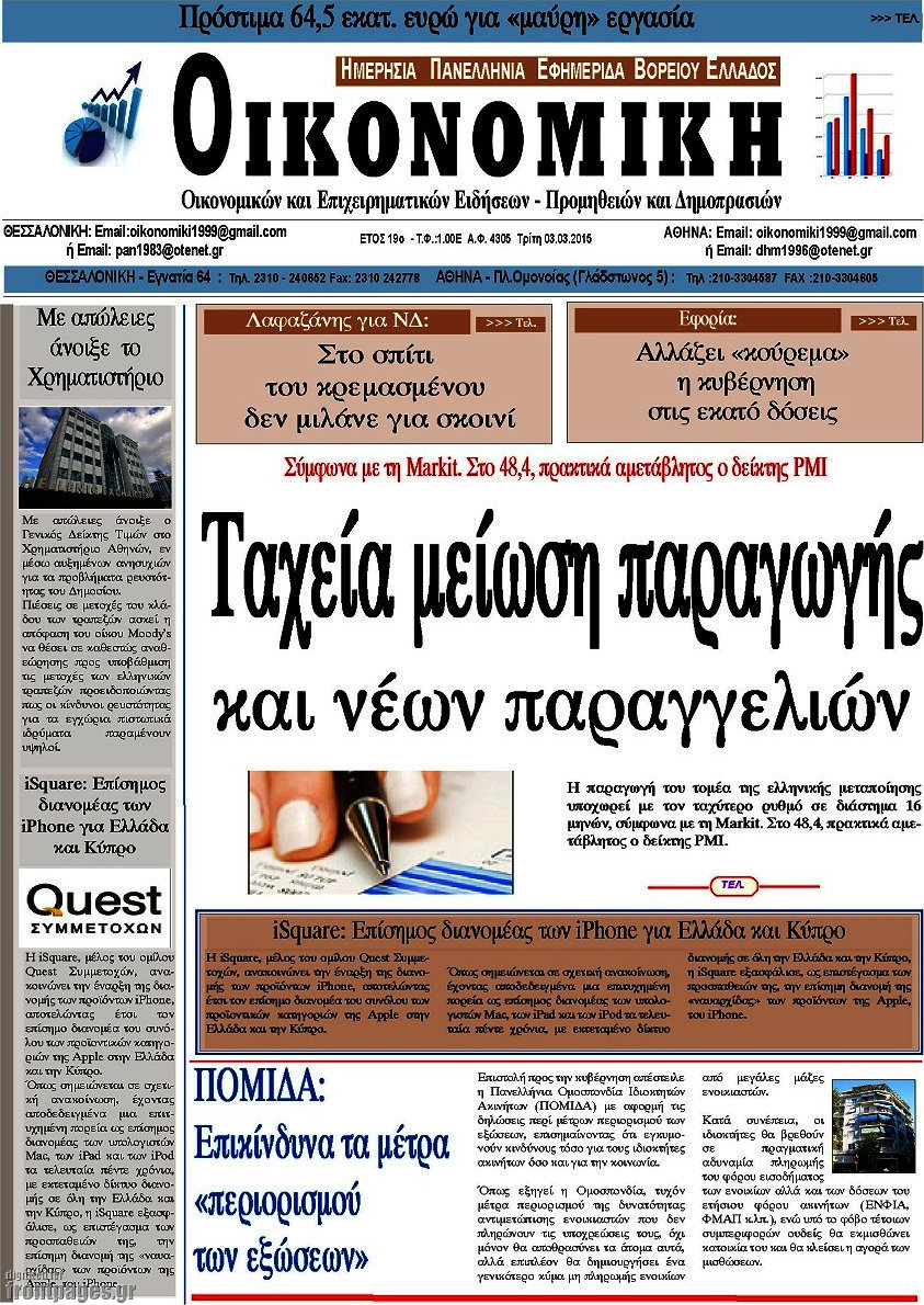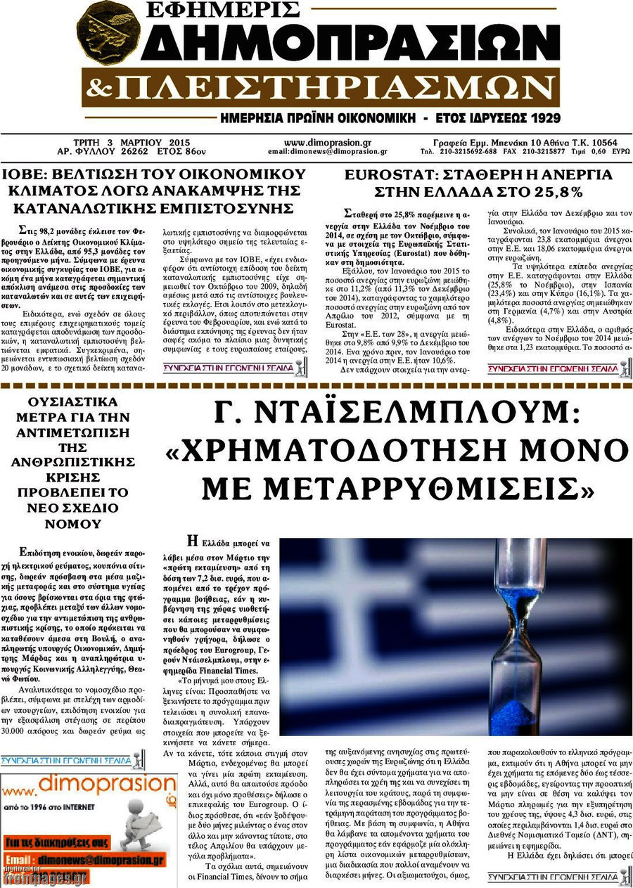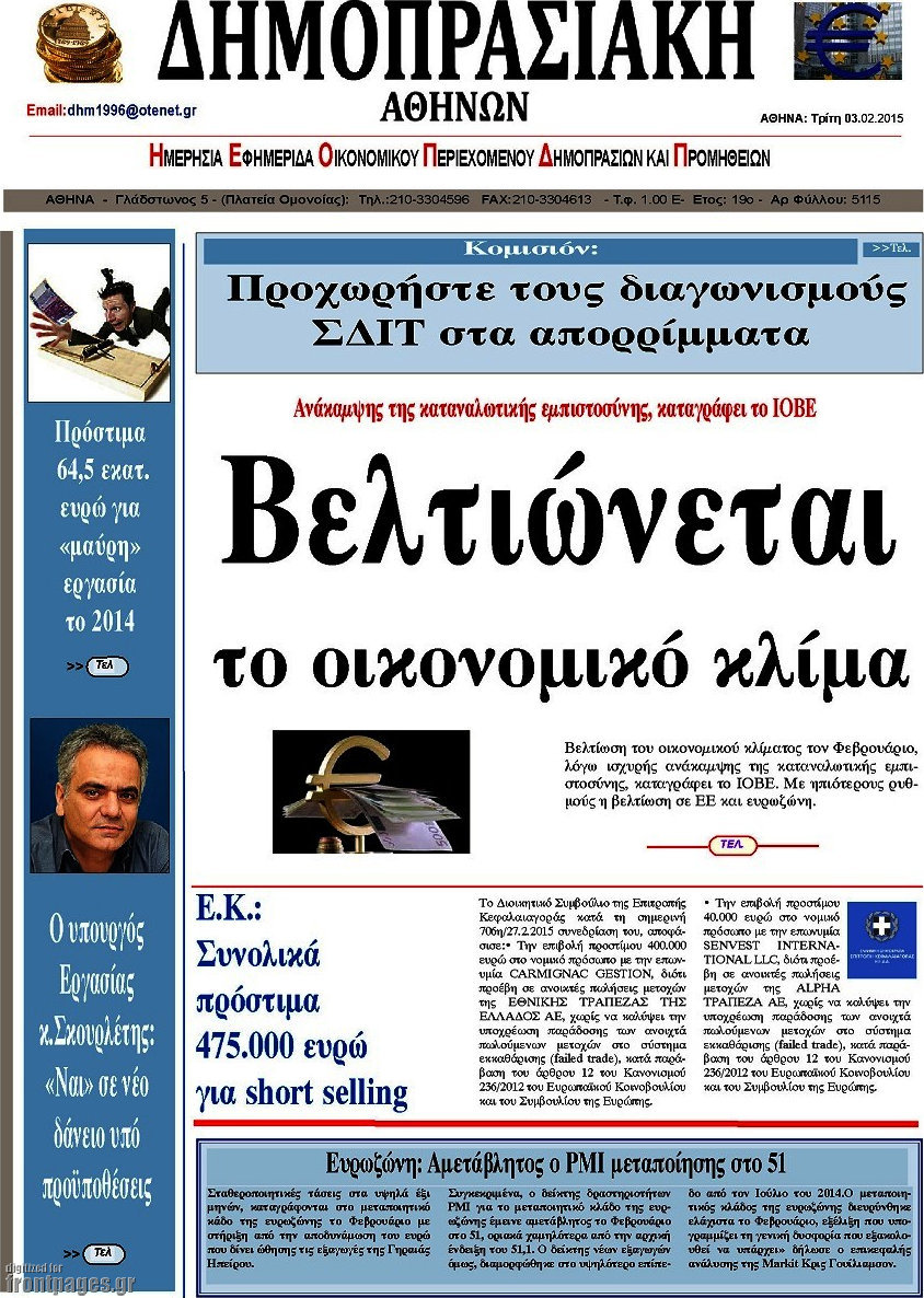 Οι οικονομικές εφημερίδες Enikos Newsroom 07:31, Τρίτη 03 Μαρτίου 2015 Media Διαβάστε τα σημερινά πρωτοσέλιδα των οικονομικών εφημερίδων: ΟΙΚΟΝΟΜΙΚΕΣ ΕΦΗΜΕΡΙΔΕΣ ΠΡΩΤΟΣΕΛΙΔΑ Μοιράσου το: σχολίασε κι εσύ (0 σχόλια) Ακολουθήστε το enikos.gr στο Google News και μάθετε πρώτοι όλες τις ειδήσεις Δείτε όλες τις τελευταίες ειδήσεις από την Ελλάδα και τον Κόσμο στο enikos.gr Ειδήσεις Ροή Ειδήσεων 2 ώρες πριν ΣΥΡΙΖΑ: Διαγράφεται ο ευρωβουλευτής Νίκος Παππάς μετά την μήνυση δημοσιογράφου για ξυλοδαρμό 38 λεπτά πριν Τουρκία: Επιδιώκει την επιστροφή των S-400 στη Ρωσία – Οι αμερικανικές πιέσεις 49 λεπτά πριν ΟΠΕΚΕΠΕ: Ελεύθερες με όρους η σύζυγος και η αδελφή του φερόμενου αρχηγού – Τι υποστήριξαν 3 ώρες πριν Πώς στήθηκε η επιχείρηση «Ίπαλλος» που οδήγησε στη σύλληψη του «Έλληνα Εσκομπάρ» – «Ο πόλεμος ενάντια στους εμπόρους ναρκωτικών θα συνεχιστεί» 3 ώρες πριν Κυψέλη: Στη φυλακή η 16χρονη που μαχαίρωσε συμμαθήτριά της 3 ώρες πριν Τα 3 ζώδια που θα δουν τη ζωή τους να αλλάζει ριζικά το 2026 – «Όλα γίνονται καλύτερα σταδιακά» 8 ώρες πριν «Δεν είχα κλάψει από τότε που διαγνώστηκα με καρκίνο, ώσπου ένα τηλεφώνημα με έκανε να λυγίσω» – Η συγκλονιστική εξομολόγηση ενός άνδρα 4 ώρες πριν Ο σπάνιος σεισμός που έλυσε τα χέρια των επιστημόνων – Αποκάλυψε ακριβώς όσα αναζητούσαν 10 ώρες πριν 20 χρόνια τα Χριστούγεννα ξεκινούν στα Public με μεγάλη ποικιλία σε δώρα! 5 λεπτά πριν Μητσοτάκης: Το γούρι με τα αρχικά του για το 2026 που έδωσε στους βουλευτές της ΝΔ – ΦΩΤΟ 9 λεπτά πριν Καβάλα – Παναθηναϊκός 1-2: Ο Ταμπόρδα έστειλε τους Πράσινους απευθείας στα προημιτελικά του Κυπέλλου Ελλάδας 14 λεπτά πριν Δημήτρης Ήμελλος: Η συγκινητική ανάρτηση της αδελφής του, για τον ένα χρόνο από τον θάνατό του – «Πήγες στον Θεό για να μας θυμίσεις…» 19 λεπτά πριν Κρήτη: Η ανακοίνωση της ΕΛΑΣ για την σύλληψη του 54χρονου – Ζήτησε 5.000 ευρώ από την οικογένεια του 33χρονου γιατρού για να τον βρει μέσω «κβαντικής τεχνολογίας» 24 λεπτά πριν Διπλωματικές πηγές: Το πρώτο τρίμηνο του 2026 το Ανώτατο Συμβούλιο Συνεργασίας Ελλάδας-Τουρκίας ENIKOS NETWORK 2,6 εκατομμύρια πολίτες έχουν ήδη εμβολιαστεί κατά της γρίπης Σοβαροί κίνδυνοι από τη λάθος χορήγηση φαρμάκου για τις αιμορραγίες-Συστάσεις προς τους γιατρούς Έρχεται νέα ενίσχυση 17.500 ευρώ από τη ΔΥΠΑ για ανέργους- Όλες οι λεπτομέρειες «Αναταράξεις» στην εφοδιαστική αλυσίδα από τα μπλόκα: Επιστολή του Συνδέσμου Θεσσαλικών Βιομηχανιών στον πρωθυπουργό -Τι αν... Χαρτογραφώντας το «σημείο χωρίς επιστροφή»: Για πρώτη φορά αποκαλύπτεται με λεπτομέρεια το ακανθώδες όριο της ατμόσφαιρας τ... Η Google καταργεί τη λειτουργία «dark web report» – Πώς θα μπορούν οι χρήστες να διαγράφουν τα δεδομένα τους περισσότερα 12:35 , Τετάρτη 17 Δεκεμβρίου 2025 Μίρκα Παπακωνσταντίνου: «Δεν ήμουν αισιόδοξη για τα νούμερα – Είμαι ρεαλίστρια» Στα γυρίσματα του εορταστικού επεισοδίου της αγαπημένης σειράς “Το Σόι Σου”, βρέθηκε η κάμερα ... 12:12 , Τετάρτη 17 Δεκεμβρίου 2025 Ακούστε την εκπομπή του Νίκου Χατζηνικολάου 17/12/2025 Ακούστε την εκπομπή του Νίκου Χατζηνικολάου στον ραδιοφωνικό σταθμό RealFm 97,8, την Τετάρτη 1... 11:35 , Τετάρτη 17 Δεκεμβρίου 2025 Home Alone: Το σπίτι της ταινίας θα ανακαινιστεί – Επιστροφή στην αισθητική της δεκαετίας του ’90 Οι νέοι ιδιοκτήτες του πραγματικού σπιτιού που παρουσιάζεται στην κλασική ταινία του 1990 «Hom... 11:25 , Τετάρτη 17 Δεκεμβρίου 2025 Grand Hotel: Απόψε το τελευταίο επεισόδιο της χρονιάς – Όλα τα μυστικά μένουν εδώ Το τελευ