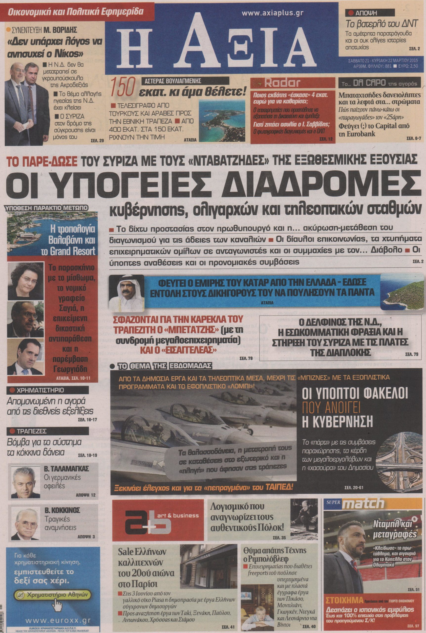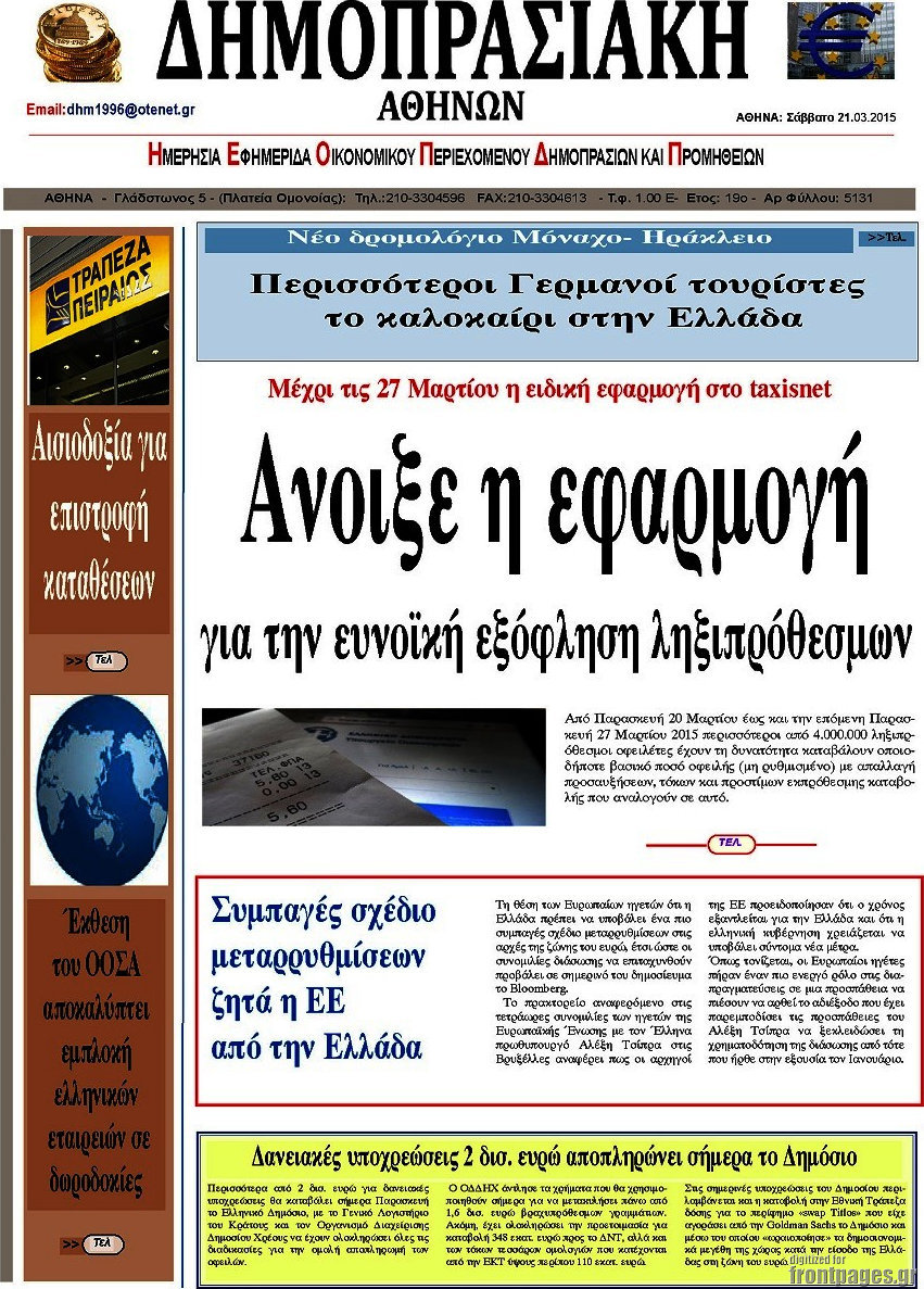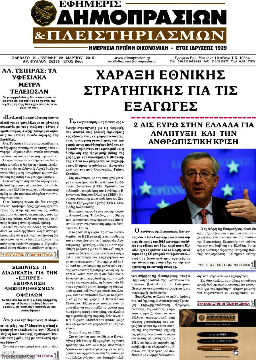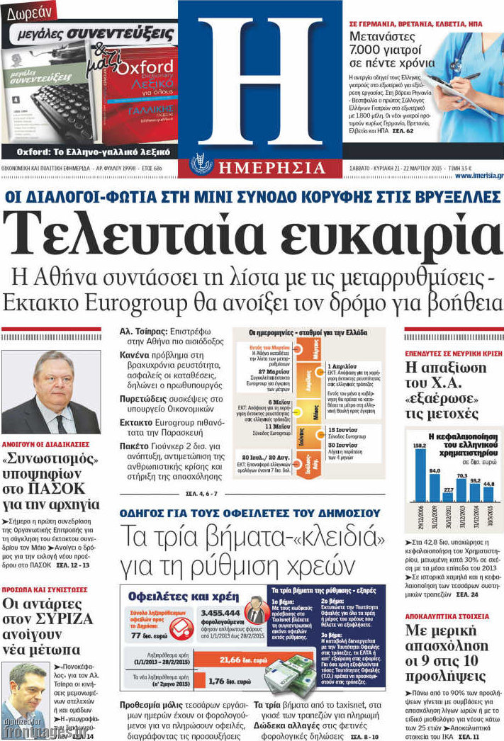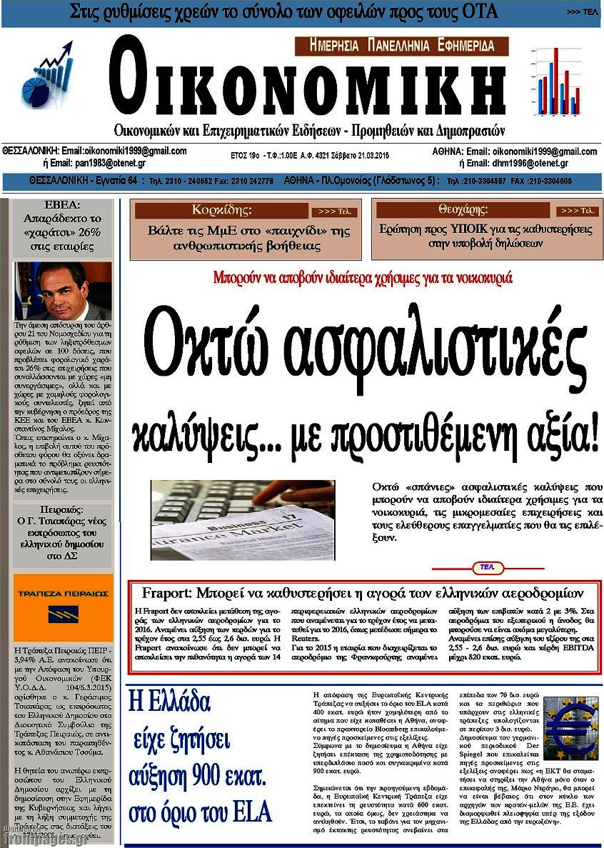 Οι οικονομικές εφημερίδες Enikos Newsroom 07:46, Σάββατο 21 Μαρτίου 2015 Media Μοιράσου το: σχολίασε κι εσύ (0 σχόλια) Ακολουθήστε το enikos.gr στο Google News και μάθετε πρώτοι όλες τις ειδήσεις Δείτε όλες τις τελευταίες ειδήσεις από την Ελλάδα και τον Κόσμο στο enikos.gr Ειδήσεις Ροή Ειδήσεων 2 ώρες πριν Κύκλωμα διακίνησης ναρκωτικών σε σχολεία: Βίντεο ντοκουμέντο από τα βασανιστήρια στους ανήλικους – Συζητούσαν για το πώς θα κάνουν «ξέπλυμα χρήματος» 1 ώρα πριν Κλιμακώνουν τις κινητοποιήσεις τους οι αγρότες: Κλείνουν τη Δευτέρα τις σήραγγες των Τεμπών για τα φορτηγά – Ανοίγουν την Τρίτη τους δρόμους για τους εκδρομείς 2 ώρες πριν Αιματηρό επεισόδιο στον Άγιο Παντελεήμονα – Δύο τραυματίες, αναζητείται ο δράστης 1 ώρα πριν ΗΠΑ: Αυξάνουν την πίεση στην Βενεζουέλα – Το νέο ρεσάλτο σε τάνκερ και ο στόχος του Τραμπ 2 ώρες πριν Κασσελάκης για παραίτηση Μάλαμα: «Η πορεία μας δεν θα καθοριστεί από μεμονωμένα πρόσωπα, μηχανισμούς και προσωπικές ατζέντες» 2 ώρες πριν Ύπνος: Τι είναι ο «κανόνας 3-3-3» που χρησιμοποιεί ένας γιατρός για να ξεχωρίσει την κόπωση από την αϋπνία 3 ώρες πριν Αριθμολογία: Οι άνθρωποι που έχουν γεννηθεί αυτές τις 4 ημερομηνίες, είναι οι πιο πιστοί και αφοσιωμένοι σύντροφοι 1 ώρα πριν Αρχαιολογικό θρίλερ στην καρδιά της Ευρώπης: Παράξενο θραύσμα με ανάγλυφα και σφηνοειδή γραφή ανακαλύφθηκε σε μέρος που δεν περίμενε κανείς 2 ημέρες πριν Enerwave: Το νέο «ρεύμα» στη λιανική ενέργειας που αλλάζει την εμπειρία του καταναλωτή 10 λεπτά πριν Περιστέρι: Έφοδος της Αστυνομίας σε νυχτερινό κέντρο που σέρβιρε αλκοόλ σε ανήλικους – Μία σύλληψη 19 λεπτά πριν Γουατεμάλα: 12 νεκροί κοντά στην πρωτεύουσα – Για ξεκαθάρισμα λογαριασμών κάνουν λόγο οι Αρχές 32 λεπτά πριν Μαρόκο – Κομόρες 2-0: Ιδανική πρεμιέρα στο Copa Africa με… αριστούργημα του Ελ Κααμπί – Δείτε Βίντεο 49 λεπτά πριν Super League: Καλά… ΑΕΚούγεννα με «κιτρινόμαυρη» κορυφή, σε απόσταση αναπνοής ο Ολυμπιακός, στο -2 ο ΠΑΟΚ – Τα αποτελέσματα και η βαθμολογία 1 ώρα πριν ΑΕΚ – ΟΦΗ 2-1: Γιορτές στην κορυφή με… ανατροπή ENIKOS NETWORK Οι γυναίκες έχουν βρει μια νέα απόλαυση στην κρεβατοκάμαρα που οι περισσότεροι άνδρες αγνοούν Christmas glow: 5 χρυσές συμβουλές για επιδερμίδα που λάμπει από ομορφιά τα Χριστούγεννα Νέο έτος ρεκόρ για τον ελληνικό τουρισμό το 2025: «Είμαστε μέσα στους 10 πλέον επισκέψιμους προορισμούς παγκοσμίως» λέει η ... Τιμές καυσίμων: Πόσο θα πληρώσουν οι εκδρομείς των Χριστουγέννων – Το κόστος μετακινήσεων σε δημοφιλείς προορισμούς Χαρτογραφώντας το «σημείο χωρίς επιστροφή»: Για πρώτη φορά αποκαλύπτεται με λεπτομέρεια το ακανθώδες όριο της ατμόσφαιρας τ... Η Google καταργεί τη λειτουργία «dark web report» – Πώς θα μπορούν οι χρήστες να διαγράφουν τα δεδομένα τους περισσότερα 21:30 , Κυριακή 21 Δεκεμβρίου 2025 Ο Δικαστής: Στα χέρια της Αστυνομίας βίντεο, που ανατρέπει όλα τα δεδομένα – Στενεύει ο κλοιός γύρω από τον Δικαστή Καταιγιστικές εξελίξεις στο τελευταίο επεισόδιο της χρονιάς της σειράς “Ο Δικαστής”... 17:18 , Κυριακή 21 Δεκεμβρίου 2025 «Η Μεγάλη Χίμαιρα»: Μάγεψε το κοινό κατά την avant-première της προβολής της Την Πρωτοχρονιά (Πέμπτη 1η Ιανουαρίου 2026) στο ERTFLIX θα γίνει η πρεμιέρα της πολυαναμενόμεν... 15:08 , Κυριακή 21 Δεκεμβρίου 2025 Μια νύχτα μόνο: Η Αρετή και ο Οδυσσέας έρχονται και πάλι κοντά Το νέο επεισόδιο της δραματικής σειράς του MEGA «Μια νύχτα μόνο», θα προβληθεί απόψε Κυριακή 2... 14:24 , Κυριακή 21 Δεκεμβρίου 2025 IQ 160: Ο φάκελος με το τεστ πατρότη