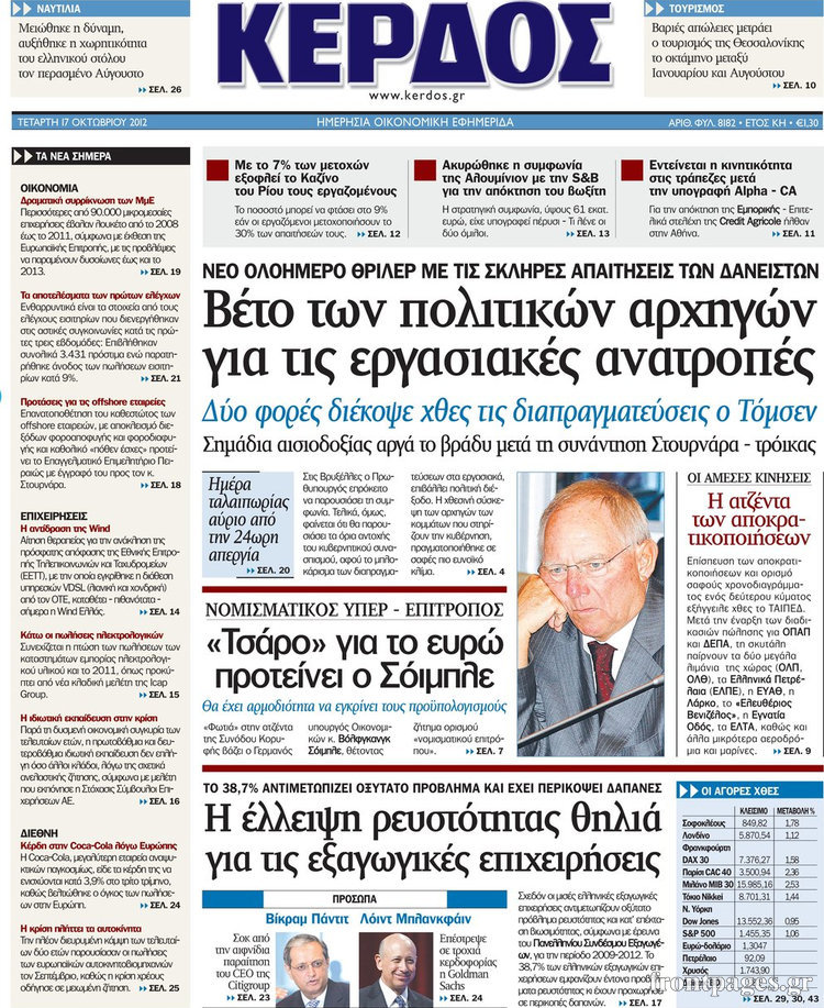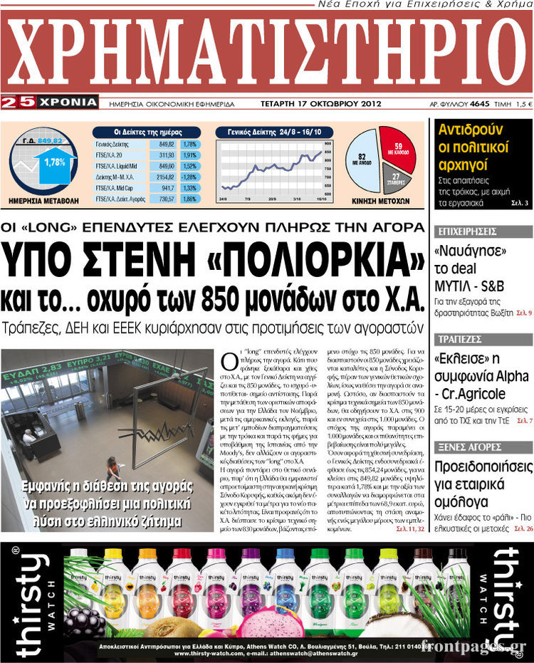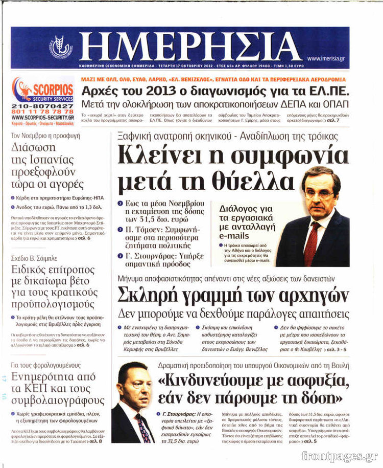 Οι οικονομικές εφημερίδες Enikos Newsroom 08:56, Τετάρτη 17 Οκτωβρίου 2012 Media Τα σημερινά πρωτοσέλιδα των οικονομικών εφημερίδων. ΟΙΚΟΝΟΜΙΚΕΣ ΕΦΗΜΕΡΙΔΕΣ Μοιράσου το: σχολίασε κι εσύ (0 σχόλια) Ακολουθήστε το enikos.gr στο Google News και μάθετε πρώτοι όλες τις ειδήσεις Δείτε όλες τις τελευταίες ειδήσεις από την Ελλάδα και τον Κόσμο στο enikos.gr Ειδήσεις Ροή Ειδήσεων 4 ώρες πριν Μακελειό στο Σίδνεϊ: Πατέρας και γιος οι δράστες της τρομοκρατικής επίθεσης – Γιατί η Αυστραλία βάζει στο στόχαστρο το Ιράν 5 ώρες πριν Μακελειό στην Αυστραλία: «Πέρασαν οι σφαίρες πάνω από το αυτοκίνητο» – Συγκλονίζει η μαρτυρία Έλληνα που ζει στο Σίδνεϊ 3 ώρες πριν Όλα τα αιτήματα αγροτών, κτηνοτρόφων και μελισσοκόμων προς την κυβέρνηση – Παραμένουν στα μπλόκα και προαναγγέλλουν κλιμάκωση 8 ώρες πριν Τραγική εξέλιξη στο Αίγιο: Πέθανε ο 43χρονος που γρονθοκόπησε γιατρό στο νοσοκομείο 6 ώρες πριν Λακωνία: Βίντεο ντοκουμέντο από την επιχείρηση διάσωσης της 13χρονης που έπεσε σε πηγάδι – Ποια ήταν τα πρώτα λόγια της 5 ώρες πριν Ύπνος: 5 λόγοι για τους οποίους ξυπνάτε κουρασμένοι το πρωί κατά τη διάρκεια του χειμώνα 8 ώρες πριν Οι 7 βραδινές συνήθειες που μαρτυρούν ότι κάποιος υποφέρει από βαθιά μοναξιά, σύμφωνα με την ψυχολογία 16 ώρες πριν Τα 8 πράγματα που τα ευτυχισμένα ζευγάρια δεν κάνουν ποτέ μπροστά στα παιδιά τους 7 ώρες πριν Κουζίνα: Η καθημερινή συνήθεια των ανθρώπων που την διατηρούν πάντα καθαρή 18 λεπτά πριν Νότια Κορέα: Έφοδος της αστυνομίας στα γραφεία της Ενωτικής Εκκλησίας στη Σεούλ 34 λεπτά πριν Serie A: Ήττα σοκ για την Φιορεντίνα στο ντέρμπι των ουραγών, κορυφή για την Ίντερ, στο «κόλπο» ξανά η Γιούβε – Τα αποτελέσματα και η βαθμολογία 48 λεπτά πριν Λίβανος: Οι IDF ανέφεραν ότι σκότωσαν τρία μέλη της Χεζμπολάχ 1 ώρα πριν Ρωσία: Στο στόχαστρο της Μόσχας η Deutsche Welle – «Δεν θα μας φιμώσουν», δηλώνει η Διεύθυνση 1 ώρα πριν Συγκίνησε η Ντορέττα Παπαδημητρίου: «Κλείνουν 11 χρόνια από όταν έφυγε από τη ζωή, ήταν πολύ ξαφνικό όπως έγινε και αυτό μας συσπείρωσε» ENIKOS NETWORK 8 κορυφαίες συμβουλές για άνδρες που θέλουν φλογερή σεξουαλική ζωή, σύμφωνα με ειδικό Baby botox: Ποια τα οφέλη και οι κίνδυνοι του να ξεκινήσει κάποιος τις ενέσεις πριν εμφανιστούν ρυτίδες Τέλος οι διώξεις για χρέη σε Εφορία και ΕΦΚΑ – Τι προβλέπει νέα διάταξη μετά την πτώχευση Υπουργείο Αγροτικής Ανάπτυξης: Ενισχύσεις de minimis ύψους 2,1 εκατ. ευρώ – Οι δικαιούχοι Σύγχρονος Νοστράδαμος: Προειδοποιεί για «μεγάλο γεγονός» τους επόμενους μήνες που θα συγκλονίσει τη Βρετανία και τον κόσμο Τεστ παρατηρητικότητας: Μπορείτε να βρείτε τις 3 διαφορές στις εικόνες με έναν πιγκουίνο σε 14 δευτερόλεπτα περισσότερα 21:34 , Κυριακή 14 Δεκεμβρίου 2025 Ο Δικαστής: Η Λέττα είναι αποφασισμένη να αποκαλύψει την αλήθεια για το τροχαίο, απόψε στις 21:45 στον ΑΝΤ1 Ραγδαίες οι εξελίξεις στο νέο επεισόδιο της σειράς “Ο Δικαστής” απόψε στις 21:45 σ... 17:38 , Κυριακή 14 Δεκεμβρίου 2025 Τηλεθέαση (13/12): Τα ποσοστά για το βράδυ του Σαββάτου Η «μάχη» της prime time για την τηλεθέαση, συνεχίστηκε δυναμικά το βράδυ του Σαββάτου (13/12).... 16:32 , Κυριακή 14 Δεκεμβρίου 2025 Τηλεθέαση (13/12): Πώς κινήθηκαν οι εκπομπές στην πρωινή ζώνη το Σάββατο Με αμείωτη ένταση συνεχίστηκε η μάχη για την τηλεθέαση στην πρωινή ζώνη των τηλεοπτικών καναλι... 15:07 , Κυριακή 14 Δεκεμβρίου 2025 IQ160: Η Μαρίνα στέλνει το φούτερ του Τηλέμαχου για το τεστ πατρότητας Η Πηνελόπη αποφασίζει να κάνει αμνιοπαρακέντηση, για να βεβαιωθεί γ