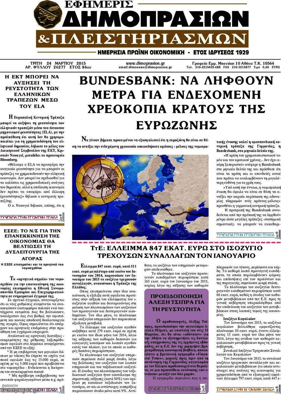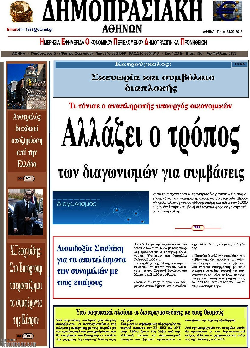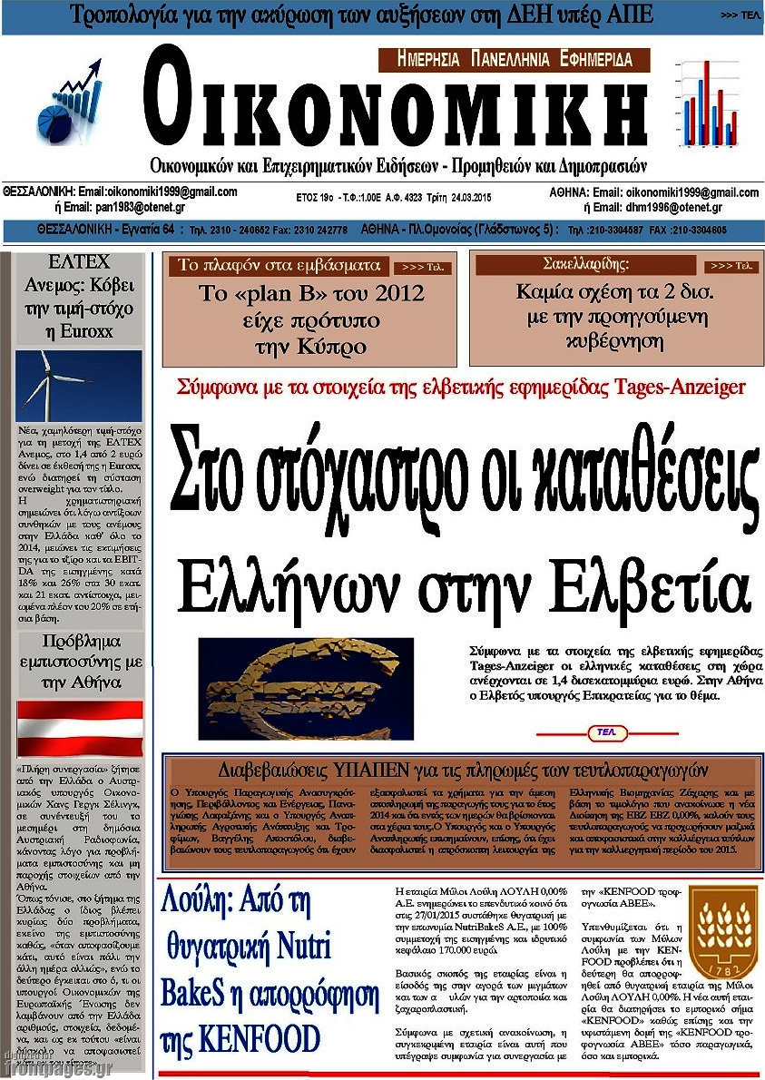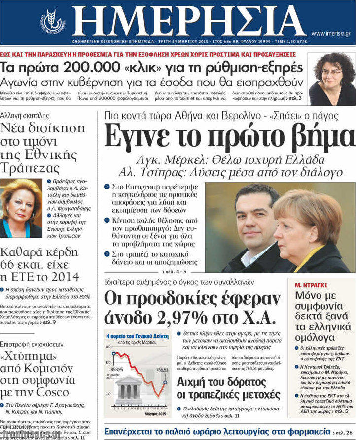 Οι οικονομικές εφημερίδες Enikos Newsroom 07:50, Τρίτη 24 Μαρτίου 2015 Media Διαβάστε τα σημερινά πρωτοσέλιδα των οικονομικών εφημερίδων: ΟΙΚΟΝΟΜΙΚΕΣ ΕΦΗΜΕΡΙΔΕΣ Μοιράσου το: σχολίασε κι εσύ (0 σχόλια) Ακολουθήστε το enikos.gr στο Google News και μάθετε πρώτοι όλες τις ειδήσεις Δείτε όλες τις τελευταίες ειδήσεις από την Ελλάδα και τον Κόσμο στο enikos.gr Ειδήσεις Ροή Ειδήσεων 7 ώρες πριν Μητσοτάκης: Αναγκαία η μεταρρύθμιση του πρωτογενούς τομέα – Τα 6 νέα μέτρα για το στεγαστικό και οι αναφορές σε «Ιθάκη» και «πολιτικούς του καναπέ» 6 ώρες πριν Δάνεια σε ελβετικό φράγκο: Τα βασικά σημεία της ρύθμισης – ανάσας για 40.000 δανειολήπτες – Αναλυτικός οδηγός με ερωτήσεις και απαντήσεις 6 ώρες πριν Κυψέλη: Εξιτήριο πήρε η 14χρονη μαθήτρια που μαχαιρώθηκε από την 16χρονη σε σχολείο – «Θέλω να βοηθήσω το παιδί, έχει μπλέξει με κακές παρέες» 6 ώρες πριν Τραμπ: Γιατί κατέθεσε τώρα την αγωγή κατά του BBC – Πώς η κίνησή του εξυπηρετεί το νέο δόγμα του για «αντίσταση» στην Ευρώπη, υπέρ των συντηρητικών 7 ώρες πριν ΟΠΕΚΕΠΕ – Παράνομες επιδοτήσεις: Ελεύθεροι με περιοριστικούς όρους και οι 7 κατηγορούμενοι που απολογήθηκαν σήμερα 6 ώρες πριν Ανακαλύφθηκε βυθισμένη πέτρινη κατασκευή ανοιχτά της Κριμαίας – Αποτελεί μέρος αρχαίας ελληνικής αποικίας 7 ώρες πριν Ύπνος: Αυτό μπορεί να είναι το χειρότερο λάθος για το βιολογικό ρολόι σας, σύμφωνα με ειδικό 8 ώρες πριν Αριθμολογία: Οι άνθρωποι που έχουν γεννηθεί αυτές τις 3 ημερομηνίες, προσελκύουν μεγάλη τύχη πριν από το τέλος του 2025 10 ώρες πριν Οι 7 συμπεριφορές που μαρτυρούν ότι ένας άνδρας επενδύει μακροπρόθεσμα σε μια σχέση 8 λεπτά πριν Παλαιστινιακό: «Η λύση των δύο κρατών είναι ο μόνος βιώσιμος δρόμος», τόνισε η Ελλάδα στο Συμβούλιο Ασφαλείας του ΟΗΕ 15 λεπτά πριν Ελένη Καρακάση: «Ένιωθα πολύ αδικημένη, δεν μπορούσα να ελέγξω τον εαυτό μου σε δύσκολες στιγμές» 23 λεπτά πριν Κλαούδια Σέινμπαουμ προς Ντόναλντ Τραμπ για φαιντανύλη: Να επιτεθούμε στα αίτια κατανάλωσης αντί να την κατατάσσουμε στα «όπλα μαζικής καταστροφής» 31 λεπτά πριν Ρωσία: Ουκρανική επίθεση με drones στο Κρασνοντάρ – Δύο τραυματίες, ζημιές σε σπίτια και διακοπή ρεύματος 39 λεπτά πριν Αντόνιο Ταγιάνι: Νομικά εμπόδια για τη χρήση των ρωσικών κεφαλαίων υπέρ της Ουκρανίας ENIKOS NETWORK Αίτημα ΙΣΑ για την εξαίρεση των προσωπικών γιατρών από τις κατ’ οίκον επισκέψεις Η σκανδιναβική μέθοδος στον ύπνο που μπορεί να σώσει έναν γάμο Πιερρακάκης: Ο προϋπολογισμός συμβάλλει ουσιαστικά στην ενίσχυση της αγοραστικής δύναμης της πλειονότητας των εργαζομένων e-ΕΦΚΑ: Παρατείνεται η προθεσμία για την υποβολή ΑΠΔ – Ποιους αφορά Σύγχρονος Νοστράδαμος: Προειδοποιεί για «μεγάλο γεγονός» τους επόμενους μήνες που θα συγκλονίσει τη Βρετανία και τον κόσμο Τεστ παρατηρητικότητας: Μπορείτε να βρείτε τις 3 διαφορές στις εικόνες με έναν πιγκουίνο σε 14 δευτερόλεπτα περισσότερα 20:06 , Τρίτη 16 Δεκεμβρίου 2025 Ο ΣΚΑΙ καταγγέλλει τον ΕΚΚΟΜΕΔ Επιστολή με την οποία καταγράφει την έντονη διαμαρτυρία του προς τον διευθύνοντα σύμβουλο του... 17:40 , Τρίτη 16 Δεκεμβρίου 2025 Eurovision: Στις 4 Ιανουαρίου αποκαλύπτονται τα 28 τραγούδια του ελληνικού τελικού Η αγωνία τελειώνει, η γιορτή της Eurovision αρχίζει στην ΕΡΤ από τις πρώτες ημέρες της νέας χρ... 17:09 , Τρίτη 16 Δεκεμβρίου 2025 Alter Ego Media: Βαθύτατη θλίψη και ειλικρινή συλλυπητήρια για την απώλεια της Ειρήνης Μαρινάκη Τη βαθύτατη θλίψη και τα ειλικρινή συλλυπητήριά της εκφράζει η Alter Ego Media