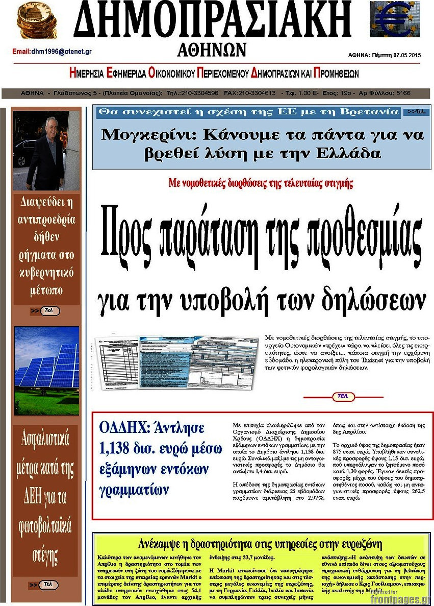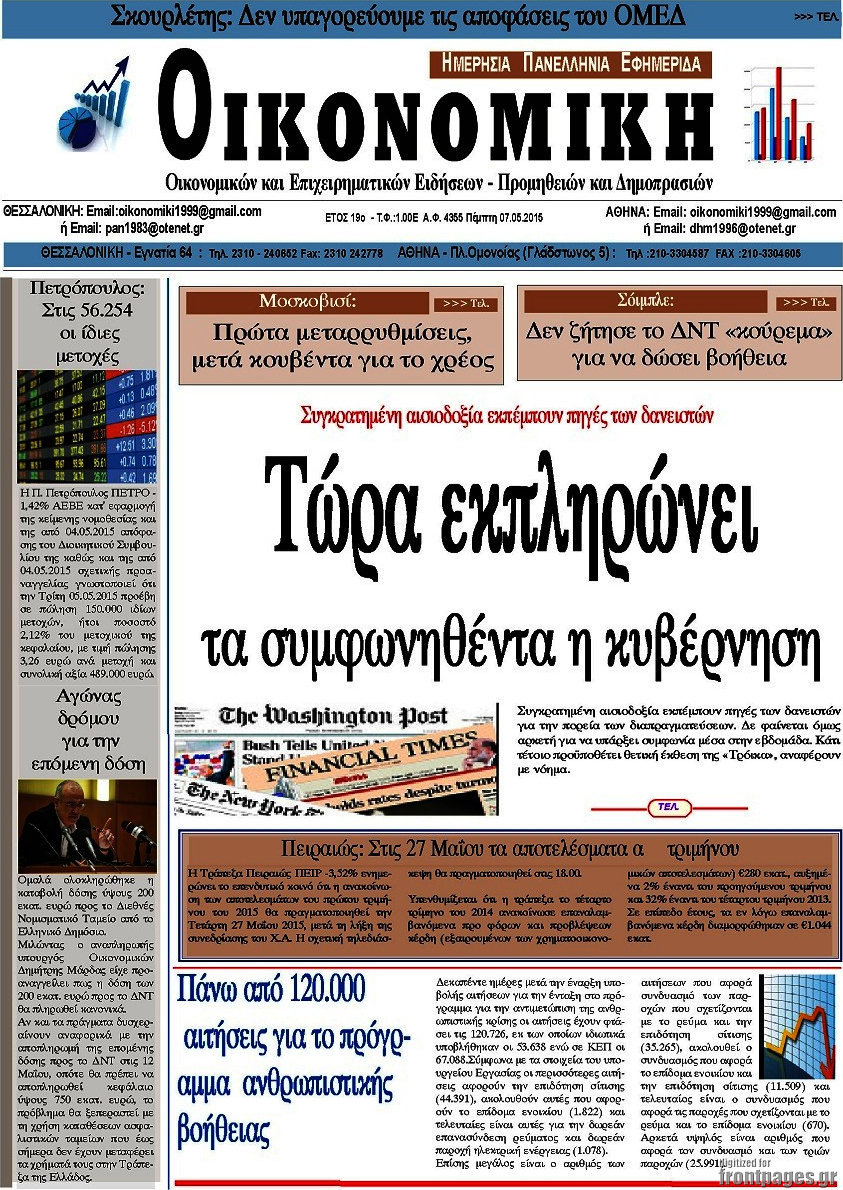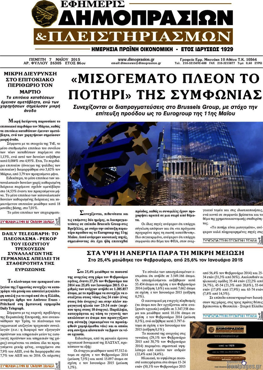 Οι οικονομικές εφημερίδες 7/5/2015 Enikos Newsroom 07:23, Πέμπτη 07 Μαΐου 2015 Media Διαβάστε τα σημερινά πρωτοσέλιδα των οικονομικών εφημερίδων: ΟΙΚΟΝΟΜΙΚΕΣ ΕΦΗΜΕΡΙΔΕΣ ΠΡΩΤΟΣΕΛΙΔΑ Μοιράσου το: σχολίασε κι εσύ (0 σχόλια) Ακολουθήστε το enikos.gr στο Google News και μάθετε πρώτοι όλες τις ειδήσεις Δείτε όλες τις τελευταίες ειδήσεις από την Ελλάδα και τον Κόσμο στο enikos.gr Ειδήσεις Ροή Ειδήσεων 2 ώρες πριν Μητσοτάκης για αγρότες: Ελπίζω πως θα απομακρυνθούν σύντομα από τα μπλόκα 3 ώρες πριν Έρευνα MRB: Η πρόθεση ψήφου και τα σημαντικότερα προβλήματα – Οι «λέξεις» που εκφράζουν τους πολίτες 12 λεπτά πριν Αμοργός: «Θα προσπαθήσω να το κάνω κάθε μέρα» – Ποιος είναι ο αγρότης που έστησε μόνος του το πρώτο μπλόκο στο νησί 48 λεπτά πριν Μισέλ Ομπάμα: Εμφανώς αδυνατισμένη στην εκπομπή του Τζίμι Κίμελ – Οι φήμες για τη χρήση Ozempic και η «φιλία» της με τον Ρομπ Ράινερ 42 λεπτά πριν Αγρότες: Επ’ αόριστον μπλόκο στον σταθμό στον Προμαχώνα για τα φορτηγά – Κλείνει το ρεύμα εισόδου στα Μάλγαρα 3 ώρες πριν Τα 4 ζώδια που ξαναβρίσκουν τον εαυτό τους – «Μπαίνετε επιτέλους στην ουσία των πραγμάτων» 4 ώρες πριν 20 χρόνια τα Χριστούγεννα ξεκινούν στα Public με μεγάλη ποικιλία σε δώρα! 2 ώρες πριν «Δεν είχα κλάψει από τότε που διαγνώστηκα με καρκίνο, ώσπου ένα τηλεφώνημα με έκανε να λυγίσω» – Η συγκλονιστική εξομολόγηση ενός άνδρα 1 ώρα πριν Τα 7 σπάνια χαρακτηριστικά που κάνουν κάποιους ανθρώπους ακαταμάχητους 4 λεπτά πριν Αγρίνιο: Συνελήφθη μαθητής που απείλησε τον διευθυντή και εκπαιδευτικούς – Χειροπέδες και στη μητέρα του 9 λεπτά πριν Bloomberg: Οι ΗΠΑ ετοιμάζουν νέες κυρώσεις σε βάρος της Ρωσίας εάν ο Πούτιν απορρίψει μια ειρηνευτική συμφωνία 12 λεπτά πριν Αμοργός: «Θα προσπαθήσω να το κάνω κάθε μέρα» – Ποιος είναι ο αγρότης που έστησε μόνος του το πρώτο μπλόκο στο νησί 15 λεπτά πριν Βίντεο: Με γερανό απομακρύνθηκε αυτοκίνητο στο Μαρούσι – Η οδηγός… είχε αργήσει σε ραντεβού 21 λεπτά πριν ΟΠΕΚΕΠΕ: Κανονικά οι πληρωμές των αγροτών μετά το νέο αλαλούμ – «Το τεχνικό πρόβλημα επιλύθηκε» ENIKOS NETWORK Ανησυχητική αύξηση της υπέρτασης στα παιδιά – Πώς θα τα προστατέψουμε; Αδενώματα Υπόφυσης: Μια πάθηση καλοήθης, αλλά όχι αθώα Διεθνής Οργανισμός Ενέργειας (ΔΟΕ, IEA): Τι δείχνουν τα νέα στοιχεία για την παγκόσμια κατανάλωση άνθρακα Διευκρινίσεις από το ΥΠΑΑΤ και τον ΟΠΕΚΕΠΕ για την εξόφληση της βασικής ενίσχυσης στους αγρότες Σύγχρονος Νοστράδαμος: Προειδοποιεί για «μεγάλο γεγονός» τους επόμενους μήνες που θα συγκλονίσει τη Βρετανία και τον κόσμο Τεστ παρατηρητικότητας: Μπορείτε να βρείτε τις 3 διαφορές στις εικόνες με έναν πιγκουίνο σε 14 δευτερόλεπτα περισσότερα 12:35 , Τετάρτη 17 Δεκεμβρίου 2025 Μίρκα Παπακωνσταντίνου: «Δεν ήμουν αισιόδοξη για τα νούμερα – Είμαι ρεαλίστρια» Στα γυρίσματα του εορταστικού επεισοδίου της αγαπημένης σειράς “Το Σόι Σου”, βρέθηκε η κάμερα ... 12:12 , Τετάρτη 17 Δεκεμβρίου 2025 Ακούστε την εκπομπή του Νίκου Χατζηνικολάου 17/12/2025 Ακούστε την εκπομπή του Νίκου Χατζηνικολάου στον ραδιοφωνικό σταθμό RealFm 97,8, την Τετάρτη 1... 11:35 , Τετάρτη 17 Δεκεμβρίου 2025 Home Alone: Το σπίτι της ταινίας θα ανακαινιστεί – Επιστροφή στην αισθητική της δεκαετίας του ’90 Οι νέοι ιδιοκτήτες του πραγματικού σπιτιού που παρουσιάζεται στην κλασική ταινία του 1990 «Hom... 11:25 , Τετάρτη 17 Δεκεμβρίου 2025 Grand Hotel: Απόψε το τελευταίο επεισόδιο της χρονιάς – Όλα τα μυστικά μένουν εδώ Το τελευταίο επεισόδιο της χρονιάς της σειράς «Grand Hotel» θ