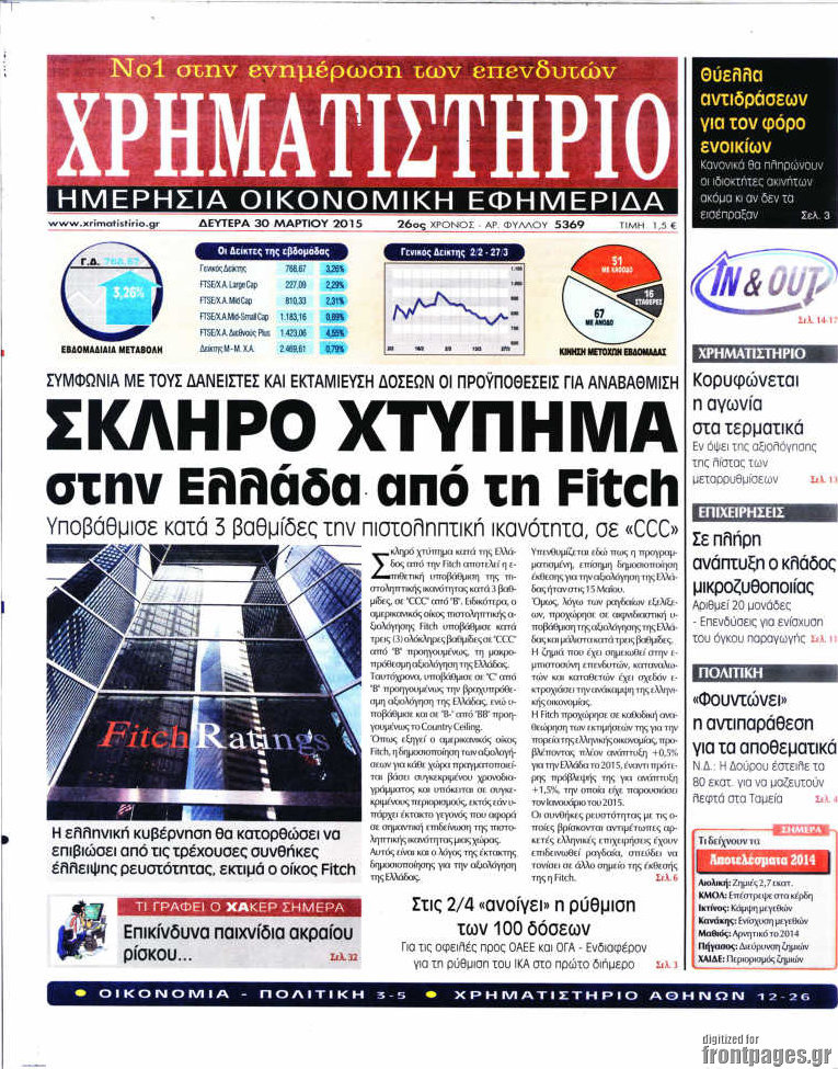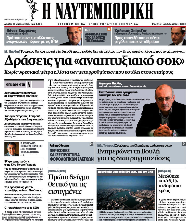 Οι οικονομικές εφημερίδες Enikos Newsroom 07:49, Δευτέρα 30 Μαρτίου 2015 Media Διαβάστε τα σημερινά πρωτοσέλιδα των οικονομικών εφημερίδων: ΟΙΚΟΝΟΜΙΚΕΣ ΕΦΗΜΕΡΙΔΕΣ ΠΡΩΤΟΣΕΛΙΔΑ Μοιράσου το: σχολίασε κι εσύ (0 σχόλια) Ακολουθήστε το enikos.gr στο Google News και μάθετε πρώτοι όλες τις ειδήσεις Δείτε όλες τις τελευταίες ειδήσεις από την Ελλάδα και τον Κόσμο στο enikos.gr Ειδήσεις Ροή Ειδήσεων 8 ώρες πριν Μητσοτάκης: Αναγκαία η μεταρρύθμιση του πρωτογενούς τομέα – Τα 6 νέα μέτρα για το στεγαστικό και οι αναφορές σε «Ιθάκη» και «πολιτικούς του καναπέ» 8 ώρες πριν Δάνεια σε ελβετικό φράγκο: Τα βασικά σημεία της ρύθμισης – ανάσας για 40.000 δανειολήπτες – Αναλυτικός οδηγός με ερωτήσεις και απαντήσεις 7 ώρες πριν Κυψέλη: Εξιτήριο πήρε η 14χρονη μαθήτρια που μαχαιρώθηκε από την 16χρονη σε σχολείο – «Θέλω να βοηθήσω το παιδί, έχει μπλέξει με κακές παρέες» 7 ώρες πριν Τραμπ: Γιατί κατέθεσε τώρα την αγωγή κατά του BBC – Πώς η κίνησή του εξυπηρετεί το νέο δόγμα του για «αντίσταση» στην Ευρώπη, υπέρ των συντηρητικών 8 ώρες πριν ΟΠΕΚΕΠΕ – Παράνομες επιδοτήσεις: Ελεύθεροι με περιοριστικούς όρους και οι 7 κατηγορούμενοι που απολογήθηκαν σήμερα 7 ώρες πριν Ανακαλύφθηκε βυθισμένη πέτρινη κατασκευή ανοιχτά της Κριμαίας – Αποτελεί μέρος αρχαίας ελληνικής αποικίας 8 ώρες πριν Ύπνος: Αυτό μπορεί να είναι το χειρότερο λάθος για το βιολογικό ρολόι σας, σύμφωνα με ειδικό 9 ώρες πριν Αριθμολογία: Οι άνθρωποι που έχουν γεννηθεί αυτές τις 3 ημερομηνίες, προσελκύουν μεγάλη τύχη πριν από το τέλος του 2025 11 ώρες πριν Οι 7 συμπεριφορές που μαρτυρούν ότι ένας άνδρας επενδύει μακροπρόθεσμα σε μια σχέση 53 δευτερόλεπτα πριν Υγεία του εντέρου: Προσθέστε 1 superfood στα scrambled eggs για καλύτερη πέψη και ευεξία 8 λεπτά πριν Σαν σήμερα 17 Δεκεμβρίου: Τα σημαντικότερα γεγονότα της ημέρας 13 λεπτά πριν Οι οικονομικές εφημερίδες 17/12/2025 18 λεπτά πριν Οι αθλητικές εφημερίδες 17/12/2025 23 λεπτά πριν Οι πολιτικές εφημερίδες 17/12/2025 ENIKOS NETWORK Αίτημα ΙΣΑ για την εξαίρεση των προσωπικών γιατρών από τις κατ’ οίκον επισκέψεις Η σκανδιναβική μέθοδος στον ύπνο που μπορεί να σώσει έναν γάμο Πιερρακάκης: Ο προϋπολογισμός συμβάλλει ουσιαστικά στην ενίσχυση της αγοραστικής δύναμης της πλειονότητας των εργαζομένων e-ΕΦΚΑ: Παρατείνεται η προθεσμία για την υποβολή ΑΠΔ – Ποιους αφορά Σύγχρονος Νοστράδαμος: Προειδοποιεί για «μεγάλο γεγονός» τους επόμενους μήνες που θα συγκλονίσει τη Βρετανία και τον κόσμο Τεστ παρατηρητικότητας: Μπορείτε να βρείτε τις 3 διαφορές στις εικόνες με έναν πιγκουίνο σε 14 δευτερόλεπτα περισσότερα 05:48 , Τετάρτη 17 Δεκεμβρίου 2025 Οι οικονομικές εφημερίδες 17/12/2025 Διαβάστε τα πρωτοσέλιδα από τις οικονομικές εφημερίδες, σήμερα 17/12/2025. 05:43 , Τετάρτη 17 Δεκεμβρίου 2025 Οι αθλητικές εφημερίδες 17/12/2025 Διαβάστε τα πρωτοσέλιδα από τις αθλητικές εφημερίδες, σήμερα 17/12/2025. 05:38 , Τετάρτη 17 Δεκεμβρίου 2025 Οι πολιτικές εφημερίδες 17/12/2025 Διαβάστε τα πρωτοσέλιδα από τις πολιτικές εφημερίδες, σήμερα 17/12/2025. 20:06 , Τρίτη 16 Δεκεμβρίου 2025 Ο ΣΚΑΙ καταγγέλλει τον ΕΚΚΟΜΕΔ Επιστολή με την οποία καταγράφει την έντονη διαμαρτυρία του προς τον διευθύνοντα σύμβουλο του... ΤΕΛΕΥΤΑΙΕΣ ΕΙΔΗΣΕΙΣ 53 δευτερόλεπτα πριν Υγεία του εντέρου: Προσθέστε 1 superfood στα scrambled eggs για... 8 λεπτά πριν Σαν σήμερα 17 Δεκεμβρίου: Τα σημαντικότερα γεγονότα... 13 λεπτά πριν Οι οικονομικές εφημερίδες 17/12/2025 18 λεπτά πριν Οι αθλητικές εφημερίδες 17/12/2025 23 λεπτά πριν Οι πολιτικές εφημερίδες 17/12/2025 31 λε