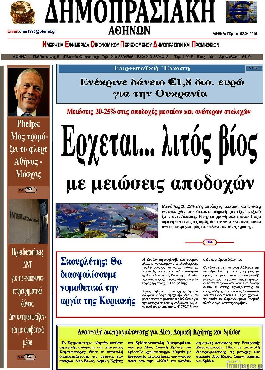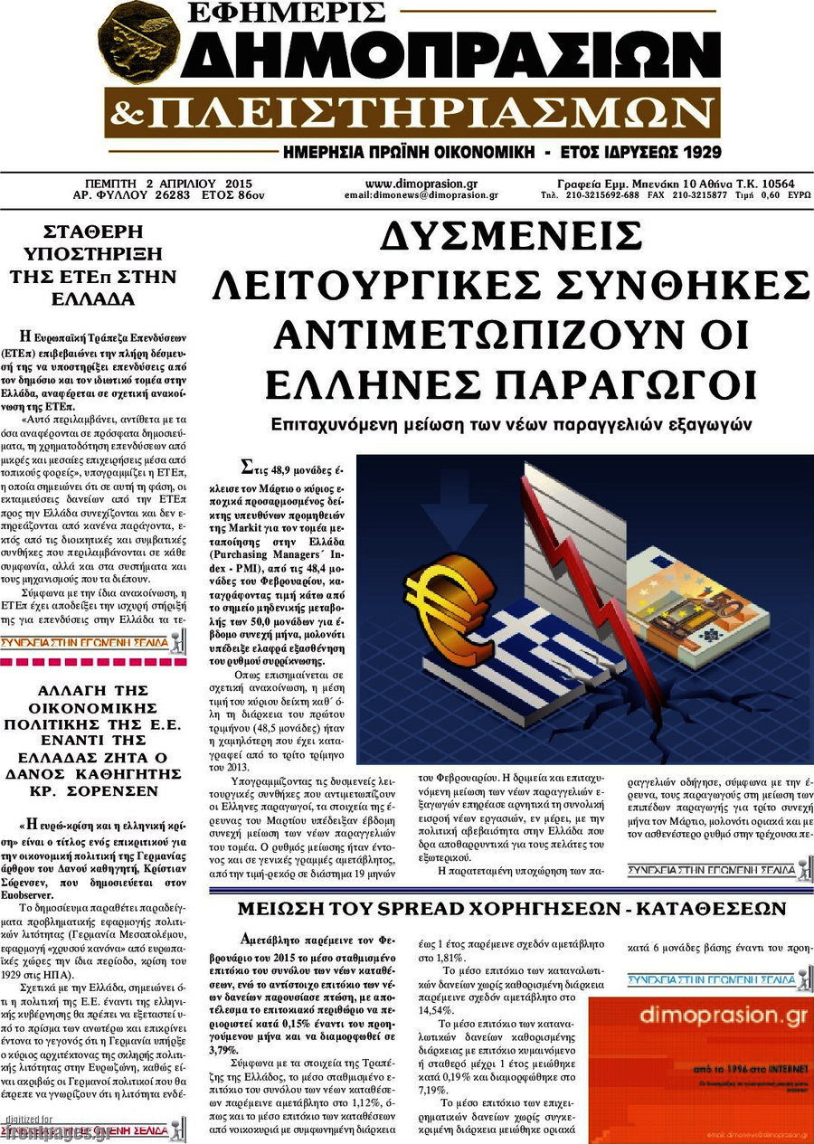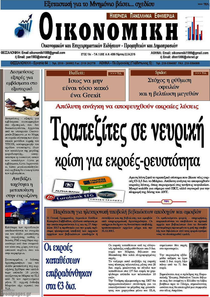 Οι οικονομικές εφημερίδες Enikos Newsroom 07:33, Πέμπτη 02 Απριλίου 2015 Media Διαβάστε τα σημερινά πρωτοσέλιδα των οικονομικών εφημερίδων: ΟΙΚΟΝΟΜΙΚΕΣ ΕΦΗΜΕΡΙΔΕΣ ΠΡΩΤΟΣΕΛΙΔΑ Μοιράσου το: σχολίασε κι εσύ (0 σχόλια) Ακολουθήστε το enikos.gr στο Google News και μάθετε πρώτοι όλες τις ειδήσεις Δείτε όλες τις τελευταίες ειδήσεις από την Ελλάδα και τον Κόσμο στο enikos.gr Ειδήσεις Ροή Ειδήσεων 3 ώρες πριν Εκτός ευρωομάδας ΣΥΡΙΖΑ ο Νίκος Παππάς μετά την επίθεση στον δημοσιογράφο Νίκο Γιαννόπουλο – Η μήνυση και οι νέες δηλώσεις 3 ώρες πριν «Αγριεύουν» οι αγρότες: «Δεν συντρέχει λόγος συνάντησης με τον πρωθυπουργό» – Ώρα αποφάσεων στη σύσκεψη της Πέμπτης 3 ώρες πριν Κυψέλη: Χωρίς την οικογένειά της δίπλα της απολογήθηκε η 16χρονη – «Της είχε επιτεθεί κάποιος για να την βιάσει, φοβήθηκε και κυκλοφορούσε με μαχαίρι» 3 ώρες πριν Politico: Το πρόβλημα της Ευρώπης δεν είναι το Βέλγιο αλλά ο Ντόναλντ Τραμπ 5 ώρες πριν Αλεξανδρούπολη: Πολυοργανική ανεπάρκεια λόγω υποσιτισμού η αιτία θανάτου του 3χρονου αγοριού 3 ώρες πριν Μυστήριο με τεράστιες κυκλικές πέτρες 200 κιλών – Ανακαλύφθηκαν τυχαία κατά τη διάρκεια οδικών έργων και κανείς δεν ξέρει από πού προέρχονται 4 ώρες πριν Ύπνος: Ειδικός εξηγεί τον πραγματικό λόγο που ξυπνάτε στις 4 τα ξημερώματα – Ο ρόλος των ορμονών και του κιρκάδιου ρυθμού 5 ώρες πριν Αριθμολογία: Οι άνθρωποι που έχουν γεννηθεί αυτές τις 4 ημερομηνίες, είναι τρυφεροί και αγαπούν ανιδιοτελώς 17 ώρες πριν 20 χρόνια τα Χριστούγεννα ξεκινούν στα Public με μεγάλη ποικιλία σε δώρα! 10 λεπτά πριν Βρυξέλλες: Νυχτερινό… μπλόκο αγροτών μπροστά από το κτίριο της Ευρωπαϊκής Επιτροπής – Πάνω από 100 τρακτέρ απέκλεισαν την λεωφόρο 25 λεπτά πριν Euroleague: Απρόσμενη ήττα για την Μονακό του Βασίλη Σπανούλη – Η βαθμολογία μετά το τέλος της 16ης αγωνιστικής 41 λεπτά πριν Μουντιάλ 2026: Η νέα ταξιδιωτική απαγόρευση του Ντόναλντ Τραμπ πλήττει (και) τους οπαδούς Σενεγάλης – Ακτής Ελεφαντοστού 52 λεπτά πριν Κυριάκος Μητσοτάκης: Στις Βρυξέλλες για την Σύνοδο Κορυφής ΕΕ και Δυτικών Βαλκανίων – Δείτε φωτογραφίες 1 ώρα πριν Σάρα Εσκενάζυ: Η πρώτη ανάρτηση για το θάνατο του πατέρα της, Αλμπέρτο Εσκενάζυ και η επιθυμία της οικογένειας ENIKOS NETWORK Αϋπνία: Το κόλπο που θα σας βοηθήσει να κοιμηθείτε απόψε – Είναι απλό και έχει αποτέλεσμα 2,6 εκατομμύρια πολίτες έχουν ήδη εμβολιαστεί κατά της γρίπης ΕΛΣΤΑΤ: Τι δείχνουν τα νέα στοιχεία για τις ηλεκτρονικές παραγγελίες των επιχειρήσεων ΚΕΠΕ: Οι 3 διακριτές συμβολές των ΜμΕ και της μεταποίησης στην ελληνική οικονομία Χαρτογραφώντας το «σημείο χωρίς επιστροφή»: Για πρώτη φορά αποκαλύπτεται με λεπτομέρεια το ακανθώδες όριο της ατμόσφαιρας τ... Η Google καταργεί τη λειτουργία «dark web report» – Πώς θα μπορούν οι χρήστες να διαγράφουν τα δεδομένα τους περισσότερα 22:24 , Τετάρτη 17 Δεκεμβρίου 2025 Το Σπίτι Δίπλα Στο Ποτάμι: Σε κίνδυνο η υγεία του Απόστολου – Τι θα δούμε απόψε “Το Σπίτι Δίπλα στο Ποτάμι” ξετυλίγει το νήμα της ζωής των πέντε αδελφών με καταισ... 21:14 , Τετάρτη 17 Δεκεμβρίου 2025 Παιχνίδια Εκδίκησης: Θα καταφέρει ο Χρήστος να κλονίσει την εμπιστοσύνη της Μάγιας απέναντι στον Άγη; Τα «Παιχνίδια Εκδίκησης» έρχονται απόψε στις 22:30, στον Αντ1, με το τελευταίο επεισόδιο της χ... 20:57 , Τετάρτη 17 Δεκεμβρίου 2025 Άγιος Έρωτας: Η Χλόη καταθέτει εναντίον του πατέρα της και ο Χάρης αποκαλύπτει στον Κλεάνθη ότι δεν είναι ο βιολογικός του πατέρας. Γεμάτο αποκαλύψεις είναι το νέο επεισόδιο τη