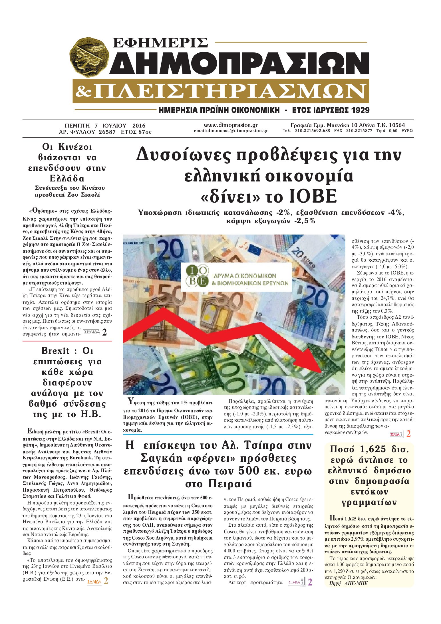 Οι οικονομικές εφημερίδες 7/7/2016 Enikos Newsroom 05:19, Πέμπτη 07 Ιουλίου 2016 Media Διαβάστε τα σημερινά πρωτοσέλιδα των οικονομικών εφημερίδων: ΟΙΚΟΝΟΜΙΚΕΣ ΕΦΗΜΕΡΙΔΕΣ ΠΡΩΤΟΣΕΛΙΔΑ Μοιράσου το: σχολίασε κι εσύ (0 σχόλια) Ακολουθήστε το enikos.gr στο Google News και μάθετε πρώτοι όλες τις ειδήσεις Δείτε όλες τις τελευταίες ειδήσεις από την Ελλάδα και τον Κόσμο στο enikos.gr Ειδήσεις Ροή Ειδήσεων 1 ώρα πριν Σύνοδος Κορυφής: Συνεχίζεται το θρίλερ στις Βρυξέλλες για την χρηματοδότηση της Ουκρανίας 4 ώρες πριν ΟΠΕΚΕΠΕ: Προφυλακιστέος ο φερόμενος αρχηγός και ο λογιστής της εγκληματικής οργάνωσης 6 ώρες πριν Αυξάνουν την πίεση προς την κυβέρνηση οι αγρότες: Κλείνουν παρακαμπτήριους και ανοίγουν διόδια – Τι θα γίνει τις γιορτές 5 ώρες πριν Φοινικούντα: Το Σάββατο απολογείται ο 30χρονος γιος γνωστού επιχειρηματία της Πλάκας που παραδόθηκε – Όσα είπε στους αστυνομικούς και ο ρόλος του στο έγκλημα 4 ώρες πριν ΑΕΚ – Κραϊόβα 3-2: Επική ανατροπή και πρόκριση στους «16» του Conference League η Ένωση 5 ώρες πριν Αρχαιολόγοι ανακάλυψαν ρωμαϊκά τεχνουργήματα από μια πόλη που δεν υπήρξε ποτέ – Τα τρία εντυπωσιακά κτίρια και ο αμφορέας με τις… σαρδέλες 6 ώρες πριν Ύπνος: Η απλή βραδινή ρουτίνα για να προστατεύσετε τα μαλλιά σας από το κρύο κατά τη διάρκεια του χειμώνα 7 ώρες πριν Manifesting: Πώς να συναντήσετε τον σύντροφο της ζωής σας, ανάλογα με τον μήνα γέννησής σας 2 ημέρες πριν 20 χρόνια τα Χριστούγεννα ξεκινούν στα Public με μεγάλη ποικιλία σε δώρα! 20 λεπτά πριν Αιματηρή βομβιστική επίθεση στην Υεμένη: Τουλάχιστον τρεις νεκροί και 13 τραυματίες 24 λεπτά πριν Στη Φλόριντα σήμερα οι διαβουλεύσεις σχετικά με τα επόμενα στάδια για τη Λωρίδα της Γάζας 28 λεπτά πριν Σίσσυ Τουμάση: «Είμαι ασθενοφοβική πάρα πολύ και με πιάνει μια παράνοια μ’ αυτό» 52 λεπτά πριν Ντόναλντ Τραμπ: Δεν χρειάζομαι την έγκριση του Κογκρέσου για να διατάξω στρατιωτικά πλήγματα στη Βενεζουέλα 1 ώρα πριν Σύνοδος Κορυφής: Συνεχίζεται το θρίλερ στις Βρυξέλλες για την χρηματοδότηση της Ουκρανίας ENIKOS NETWORK Σε περίοδο αυξημένης δραστηριότητας η γρίπη στην Ελλάδα-Μέτρα προστασίας από τον ΕΟΔΥ Σκέφτεστε συνέχεια συζητήσεις που έχετε κάνει; Τι σημαίνει αυτό, σύμφωνα με ειδικό Στεγαστικό: Τι λέει η ΠΟΜΙΔΑ για τα νέα μέτρα που ανακοίνωσε ο Κυριάκος Μητσοτάκης Λαγκάρντ: Αισιόδοξη για την ανάπτυξη της Ευρωζώνης, αβέβαιη για τον πληθωρισμό Χαρτογραφώντας το «σημείο χωρίς επιστροφή»: Για πρώτη φορά αποκαλύπτεται με λεπτομέρεια το ακανθώδες όριο της ατμόσφαιρας τ... Η Google καταργεί τη λειτουργία «dark web report» – Πώς θα μπορούν οι χρήστες να διαγράφουν τα δεδομένα τους περισσότερα 02:50 , Παρασκευή 19 Δεκεμβρίου 2025 GNTM: «Κλείδωσαν» οι τέσσερις φιναλίστ – Μεγάλη ανατροπή στις τελευταίες αποχωρήσεις Για προτελευταία φορά εμφανίστηκαν στο πλατό του GNTM οι φιναλίστ του φετινού κύκλου, το βράδυ... 17:45 , Πέμπτη 18 Δεκεμβρίου 2025 ROUK ZOUK: Εορταστικό επεισόδιο με καλεσμένους τους πρωταγωνιστές του «Γιατί ρε πατέρα» Το Σάββατο 20 Δεκεμβρίου στις 21:00, η Ζέτα Μακρυπούλια υποδέχεται εκλεκτούς ηθοποιούς που όλο... 17:20 , Πέμπτη 18 Δεκεμβρίου 2025 Άγιος έρωτας: Η Χριστίνα εξομολογείται στον πατέρα Νικόλαο, απόψε στις 21:00 στον Alpha Η Νότα αποφασίζει να εκδικηθεί τον Πέτρο και τον Στέφανο, για χάρη του Λούη, όμως τα πράγματα ... 16:50 , Πέμπτη 18 Δεκεμβρίου 2025 Να μ’ αγαπάς: Ζωή και Φωτεινή συμφιλιώνονται ως μάνα με κόρη, απόψε στις 20:00 Η ταυτότητα του Άγγελου αποκαλύπτεται στο νέο επεισόδιο τη