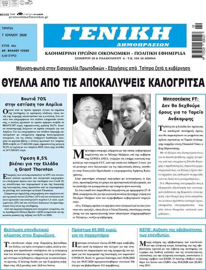 Οι οικονομικές εφημερίδες 7/7/2020 Διονύσης Νίκκας 06:34, Τρίτη 07 Ιουλίου 2020 Media Διαβάστε τα πρωτοσέλιδα των οικονομικών εφημερίδων… ΟΙΚΟΝΟΜΙΚΕΣ ΕΦΗΜΕΡΙΔΕΣ Μοιράσου το: σχολίασε κι εσύ (0 σχόλια) Ακολουθήστε το enikos.gr στο Google News και μάθετε πρώτοι όλες τις ειδήσεις Δείτε όλες τις τελευταίες ειδήσεις από την Ελλάδα και τον Κόσμο στο enikos.gr Ειδήσεις Ροή Ειδήσεων 8 ώρες πριν Χριστούγεννα στα μπλόκα: Επιμένουν στις κινητοποιήσεις τους οι αγρότες – Ανοίγουν τα διόδια το Σαββατοκύριακο 8 ώρες πριν Ουκρανία: Η άνευ προηγουμένου επίθεση σε ρωσικό τάνκερ στη Μεσόγειο και το μήνυμα προς στον Πούτιν – Το «μακρύ χέρι» του Κιέβου 7 ώρες πριν Πούτιν: Τα μηνύματα σε Ευρώπη και ΝΑΤΟ από το μαραθώνιο «σόου» του – Η απαίτηση για «σεβασμό» και η ειρήνη «με τους όρους» της Μόσχας 6 ώρες πριν ΗΠΑ: Η κυβέρνηση του Ντόναλντ Τραμπ άρχισε να δημοσιοποιεί τα αρχεία Έπσταϊν 7 ώρες πριν Άνω Λιόσια: Πυροβολισμοί σε επιχείρηση με χαλιά – Εντοπίστηκαν 10 κάλυκες 14 λεπτά πριν Αυγά: Πόσα μπορείτε να τρώτε την ημέρα με ασφάλεια για μέγιστη πρόσληψη πρωτεΐνης 44 λεπτά πριν Τα ζώδια σήμερα, Σάββατο 20 Δεκεμβρίου: Παρθένοι, το σύμπαν σας δίνει το κλειδί 7 ώρες πριν Ανακαλύφθηκαν αρχαία χρυσά νομίσματα 2.200 ετών που απεικονίζουν τον θεό Απόλλωνα – Η άγνωστη σύνδεση με τον Φίλιππο Β΄ της Μακεδονίας 8 ώρες πριν Ύπνος: Μια κρυφή κατάσταση του εγκεφάλου πριν από τον ύπνο μπορεί να είναι το “κλειδί” για υψηλή ευφυΐα και δημιουργικότητα 5 λεπτά πριν Σαρωτικοί οι έλεγχοι στους δρόμους ενόψει εορτών – Μπλόκα της τροχαίας σε κεντρικές αρτηρίες της Αττικής 14 λεπτά πριν Αυγά: Πόσα μπορείτε να τρώτε την ημέρα με ασφάλεια για μέγιστη πρόσληψη πρωτεΐνης 20 λεπτά πριν Σαν σήμερα 20 Δεκεμβρίου: Τα σημαντικότερα γεγονότα της ημέρας 25 λεπτά πριν Οι οικονομικές εφημερίδες 20/12/2025 30 λεπτά πριν Οι αθλητικές εφημερίδες 20/12/2025 ENIKOS NETWORK Το ΕΚΑΒ τιμήθηκε από την Ακαδημία Αθηνών για τα 40 χρόνια προσφοράς του Έχετε πραγματικά μεγάλη καρδιά; 10 χαρακτηριστικά όσων έχουν καλοσύνη Αναστολή μέτρων αναγκαστικής εκτέλεσης για κτηνοτρόφους που πλήττονται από την ευλογιά των αιγοπροβάτων Πλήρης επάρκεια προϊόντων στις λαϊκές της Αττικής, παρά τις αγροτικές κινητοποιήσεις – Τι απαντούν οι πωλητές Χαρτογραφώντας το «σημείο χωρίς επιστροφή»: Για πρώτη φορά αποκαλύπτεται με λεπτομέρεια το ακανθώδες όριο της ατμόσφαιρας τ... Η Google καταργεί τη λειτουργία «dark web report» – Πώς θα μπορούν οι χρήστες να διαγράφουν τα δεδομένα τους περισσότερα 05:48 , Σάββατο 20 Δεκεμβρίου 2025 Οι οικονομικές εφημερίδες 20/12/2025 Διαβάστε τα πρωτοσέλιδα από τις οικονομικές εφημερίδες, σήμερα 20/12/2025. 05:43 , Σάββατο 20 Δεκεμβρίου 2025 Οι αθλητικές εφημερίδες 20/12/2025 Διαβάστε τα πρωτοσέλιδα από τις αθλητικές εφημερίδες, σήμερα 20/12/2025. 05:38 , Σάββατο 20 Δεκεμβρίου 2025 Οι πολιτικές εφημερίδες 20/12/2025 Διαβάστε τα πρωτοσέλιδα από τις πολιτικές εφημερίδες, σήμερα 20/12/2025. 04:20 , Σάββατο 20 Δεκεμβρίου 2025 Αγγελική Νικολούλη: Τα συλλυπητήρια για την απώλεια της Ειρήνης Μαρινάκη Τα συλληπητήρια στον πρόεδρο του Mega, τον Βαγγέλη Μαρινάκη, για την απώλεια της μητέρας του Ε... ΤΕΛΕΥΤΑΙΕΣ ΕΙΔΗΣΕΙΣ 5 λεπτά πριν Σαρωτικοί οι έλεγχοι στους δρόμους ενόψει εορτών –... 14 λεπτά πριν Αυγά: Πόσα μπορείτε να τρώτε την ημέρα με ασφάλεια για... 20 λεπτά πριν Σαν σήμερα 20 Δεκεμβρίου: Τα σημαντικότερα γεγονότα... 25 λεπτά πριν Οι οικονομικές εφημερίδες 20/12/2025 30 λεπτά πριν Οι αθλητικές εφημερίδες 20/12/2025 35 λεπτά πρ