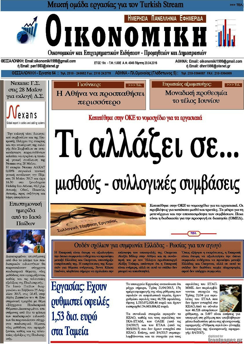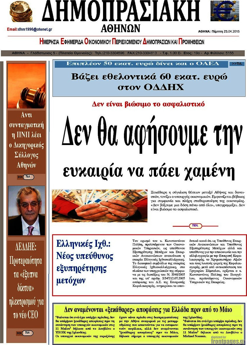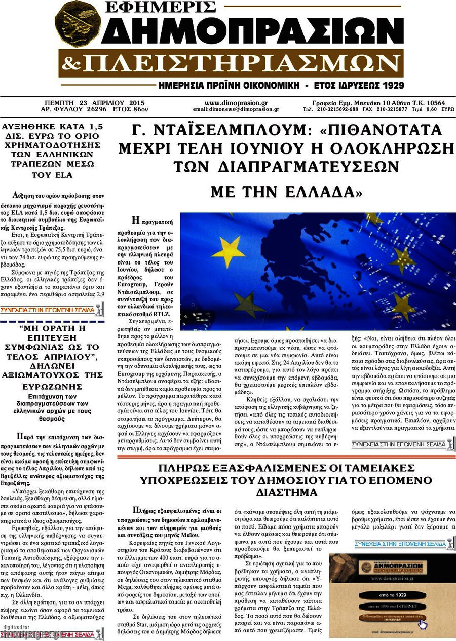 Οι οικονομικές εφημερίδες Enikos Newsroom 07:40, Πέμπτη 23 Απριλίου 2015 Media Διαβάστε τα σημερινά πρωτοσέλιδα των οικονομικών εφημερίδων: ΟΙΚΟΝΟΜΙΚΕΣ ΕΦΗΜΕΡΙΔΕΣ ΠΡΩΤΟΣΕΛΙΔΑ Μοιράσου το: σχολίασε κι εσύ (0 σχόλια) Ακολουθήστε το enikos.gr στο Google News και μάθετε πρώτοι όλες τις ειδήσεις Δείτε όλες τις τελευταίες ειδήσεις από την Ελλάδα και τον Κόσμο στο enikos.gr Ειδήσεις Ροή Ειδήσεων 2 ώρες πριν Αγρότες: Πολύωροι αποκλεισμοί στα τελωνεία Προμαχώνα, Εξοχής, Ευζώνων και Νίκης – Κλείνουν τον κόμβο Φιλώτα οι παραγωγοί στη Δυτική Μακεδονία 2 ώρες πριν Νίκος Παππάς: Ζητώ συγγνώμη για αυτό το επεισόδιο – Δεν τον γρονθοκόπησα 4 ώρες πριν Ευρωπαϊκό Συμβούλιο: Όλες οι λεπτομέρειες για το δάνειο των 90 δισ. ευρώ στην Ουκρανία – Τα συμπεράσματα της Συνόδου Κορυφής 3 ώρες πριν Αίγιο: 22χρονη κατήγγειλε ότι έπεσε θύμα βιασμού και ληστείας από συγγενικά της πρόσωπα 2 ώρες πριν Τρομακτικό βίντεο: Η στιγμή της έκρηξης στο τζετ που μετέφερε τον οδηγό του NASCAR, Γκρεγκ Μπιφλ και την οικογένειά του 2 ώρες πριν Αλλαγή σελίδας για 3 ζώδια – «Μία δύσκολη περίοδος φτάνει στο τέλος της» 2 ημέρες πριν 20 χρόνια τα Χριστούγεννα ξεκινούν στα Public με μεγάλη ποικιλία σε δώρα! 3 ώρες πριν Ο σύζυγός της συμπεριφέρεται όπως το παιδί τους – «Χρησιμοποιεί αστείες δικαιολογίες για να μην κάνει δουλειές και να ξοδεύει λεφτά» 1 ώρα πριν Γεμάτος νεροχύτης; 5 σοβαρές ευθύνες που «φοβίζουν» όσους αφήνουν άπλυτα πιάτα 3 λεπτά πριν ΕΥΔΑΠ: 17 ερωτήσεις και απαντήσεις για τις αλλαγές στα τιμολόγια του νερού 9 λεπτά πριν Οδοντιατρικός Σύλλογος Αττικής: Προσοχή στις παραπλανητικές διαφημίσεις οδοντικών εμφυτευμάτων 15 λεπτά πριν Αλεξάνδρα Νίκα για Κωνσταντίνο Αργυρό: «Τον συμβουλεύομαι για όλα» – Πώς θα περάσουν τις γιορτές 21 λεπτά πριν Κρήτη: Στο Ρέθυμνο μεταφέρονται οι εκατοντάδες μετανάστες που διασώθηκαν ανοιχτά της Γαύδου 27 λεπτά πριν Ειδικός μοιράζεται 6 κόλπα για να διατηρείστε σε φόρμα με πάνω από 40 ώρες εργασίας την εβδομάδα: «Προπονηθείτε πριν από τη δουλειά, όχι μετά» ENIKOS NETWORK Κίνδυνος παραπλάνησης από διαφημίσεις οδοντικών εμφυτευμάτων Καρκίνος του πνεύμονα: Έως 8.000 ζωές μπορούν να σωθούν με την έγκαιρη διάγνωση ΕΥΔΑΠ: Στο τραπέζι αλλαγές στους λογαριασμούς του νερού – Τι θα ισχύσει για ευάλωτα νοικοκυριά και επιχειρήσεις Επιδόματα και παροχές από τον ΟΠΕΚΑ: Τι πιστώνεται σήμερα στους τραπεζικούς λογαριασμούς Χαρτογραφώντας το «σημείο χωρίς επιστροφή»: Για πρώτη φορά αποκαλύπτεται με λεπτομέρεια το ακανθώδες όριο της ατμόσφαιρας τ... Η Google καταργεί τη λειτουργία «dark web report» – Πώς θα μπορούν οι χρήστες να διαγράφουν τα δεδομένα τους περισσότερα 08:00 , Παρασκευή 19 Δεκεμβρίου 2025 Την Κυριακή με τη Realnews: Δωροεπιταγή 10€ Δωροεπιταγή αξίας 10€ για αγορές άνω των 60€ από τα πολυκαταστήματα FactoryOutlet H προσφορά ι... 05:48 , Παρασκευή 19 Δεκεμβρίου 2025 Οι οικονομικές εφημερίδες 19/12/2025 Διαβάστε τα πρωτοσέλιδα από τις οικονομικές εφημερίδες, σήμερα 19/12/2025. 05:43 , Παρασκευή 19 Δεκεμβρίου 2025 Οι αθλητικές εφημερίδες 19/12/2025 Διαβάστε τα πρωτοσέλιδα από τις αθλητικές εφημερίδες, σήμερα 19/12/2025. 05:38 , Παρασκευή 19 Δεκεμβρίου 2025 Οι πολιτικές εφημερίδες 19/12/2025 Διαβάστε τα πρωτοσέλιδα από τις πολιτικές εφημερίδες, σήμερα 19/12/2025. ΤΕΛΕΥΤΑΙΕΣ ΕΙΔΗΣΕΙΣ 9 λεπτά πριν Οδοντιατρικός Σύλλογος Αττικής: Προσοχή στις... 15 λεπτά πριν Αλεξάνδρα Νίκα για Κωνσταντίνο Αργυρό: «Τον... 21 λεπτά πριν Κρήτη: Στο Ρέθυμνο μεταφέρονται οι εκατοντάδες... 27 λεπτά π