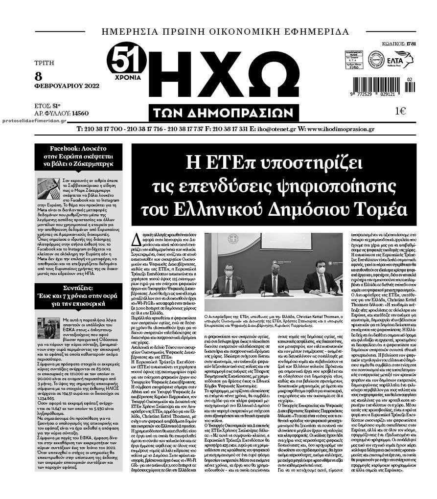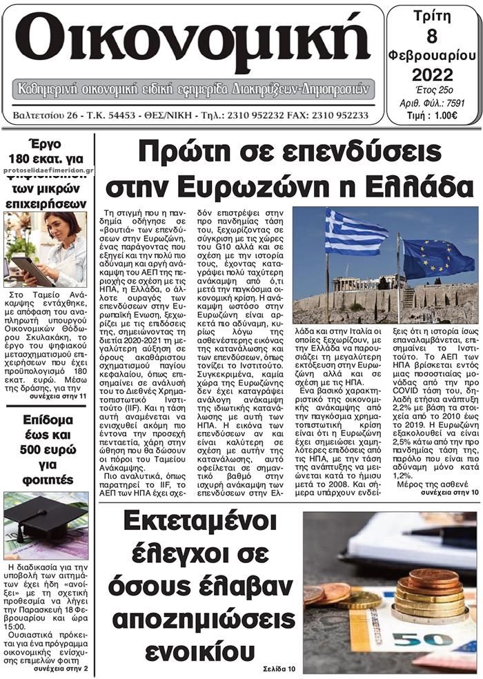 Οι οικονομικές εφημερίδες 8/2/2022 Διονύσης Νίκκας 06:56, Τρίτη 08 Φεβρουαρίου 2022 Media Διαβάστε τα πρωτοσέλιδα από τις οικονομικές εφημερίδες… ΟΙΚΟΝΟΜΙΚΕΣ ΕΦΗΜΕΡΙΔΕΣ Μοιράσου το: σχολίασε κι εσύ (0 σχόλια) Ακολουθήστε το enikos.gr στο Google News και μάθετε πρώτοι όλες τις ειδήσεις Δείτε όλες τις τελευταίες ειδήσεις από την Ελλάδα και τον Κόσμο στο enikos.gr Ειδήσεις Ροή Ειδήσεων 1 ώρα πριν Δημοσκόπηση Metron Analysis: Στις 10 μονάδες η διαφορά ΝΔ-ΠΑΣΟΚ, στην 3η θέση η Πλεύση Ελευθερίας – 8 στους 10 στηρίζουν τον αγώνα των αγροτών 5 ώρες πριν Αγρότες: «Όχι στον διάλογο, μας εμπαίζει η κυβέρνηση» – Αποφάσισαν κλιμάκωση των κινητοποιήσεων, τι θα γίνει τα Χριστούγεννα 48 λεπτά πριν Νίκος Παππάς στον ΑΝΤ1: «Δεν κρύβομαι – Μετά το συμβάν ακολούθησα κανονικά το πρόγραμμά μου» – ΒΙΝΤΕΟ 2 ώρες πριν Αθήνα: Εξαρθρώθηκε εγκληματική οργάνωση που διακινούσε ναρκωτικά σε μορφή σοκολάτας – Δύο τράπερ ανάμεσα στους 4 συλληφθέντες – ΒΙΝΤΕΟ 41 λεπτά πριν Διαμαντής Καραναστάσης: Οδηγούσε υπό την επήρεια αλκοόλ – Του αφαιρέθηκε το δίπλωμα και του επιβλήθηκε πρόστιμο 350 ευρώ 1 ώρα πριν Manifesting: Πώς να συναντήσετε τον σύντροφο της ζωής σας, ανάλογα με τον μήνα γέννησής σας 3 ώρες πριν Γάμος: 11 ψυχρές αλλά ευγενικές φράσεις, που λέει ένας άνδρας όταν σκέφτεται τον χωρισμό 2 ώρες πριν Σφουγγάρισμα: Η συνήθεια που θα σας βοηθήσει να διατηρήσετε το σπίτι σας καθαρό και τακτοποιημένο 2 ημέρες πριν 20 χρόνια τα Χριστούγεννα ξεκινούν στα Public με μεγάλη ποικιλία σε δώρα! 4 λεπτά πριν Κλήρωση ΤΖΟΚΕΡ 18/12/2025: Αυτοί είναι οι τυχεροί αριθμοί 6 λεπτά πριν Τραμπ: Ζητεί από την Ουκρανία να “κινηθεί γρήγορα” στις διαπραγματεύσεις για το τέλος της σύγκρουσης 12 λεπτά πριν Ύπνος: Η απλή βραδινή ρουτίνα για να προστατεύσετε τα μαλλιά σας από το κρύο κατά τη διάρκεια του χειμώνα 20 λεπτά πριν Κατερίνα Καινούργιου: «Δεν θα αφήσω κανέναν να χαλάσει τη ζαχαρένια μου στην ομορφότερη περίοδο της ζωής μου» 26 λεπτά πριν Θεσσαλονίκη: Προθεσμία για την επόμενη εβδομάδα έλαβαν οι συλληφθέντες για το κύκλωμα trafficking – Οι οίκοι ανοχής, τα «φρουτάκια» και οι ρόλοι ENIKOS NETWORK Σε περίοδο αυξημένης δραστηριότητας η γρίπη στην Ελλάδα-Μέτρα προστασίας από τον ΕΟΔΥ Σκέφτεστε συνέχεια συζητήσεις που έχετε κάνει; Τι σημαίνει αυτό, σύμφωνα με ειδικό ΕΛΤΑ: Αυτό είναι το νέο σχέδιο μετασχηματισμού του Οργανισμού- Τι δήλωσαν Πιερρακάκης και Παπαστεργίου ΕΛΣΤΑΤ: Τι δείχνουν τα νέα στοιχεία για τον μόνιμο πληθυσμό στην Ελλάδα Χαρτογραφώντας το «σημείο χωρίς επιστροφή»: Για πρώτη φορά αποκαλύπτεται με λεπτομέρεια το ακανθώδες όριο της ατμόσφαιρας τ... Η Google καταργεί τη λειτουργία «dark web report» – Πώς θα μπορούν οι χρήστες να διαγράφουν τα δεδομένα τους περισσότερα 17:45 , Πέμπτη 18 Δεκεμβρίου 2025 ROUK ZOUK: Εορταστικό επεισόδιο με καλεσμένους τους πρωταγωνιστές του «Γιατί ρε πατέρα» Το Σάββατο 20 Δεκεμβρίου στις 21:00, η Ζέτα Μακρυπούλια υποδέχεται εκλεκτούς ηθοποιούς που όλο... 17:20 , Πέμπτη 18 Δεκεμβρίου 2025 Άγιος έρωτας: Η Χριστίνα εξομολογείται στον πατέρα Νικόλαο, απόψε στις 21:00 στον Alpha Η Νότα αποφασίζει να εκδικηθεί τον Πέτρο και τον Στέφανο, για χάρη του Λούη, όμως τα πράγματα ... 16:50 , Πέμπτη 18 Δεκεμβρίου 2025 Να μ’ αγαπάς: Ζωή και Φωτεινή συμφιλιώνονται ως μάνα με κόρη, απόψε στις 20:00 Η ταυτότητα του Άγγελου αποκαλύπτεται στο νέο επεισόδιο της σειράς “Να μ’ αγαπάς... 15:52 , Πέμπτη 18 Δεκεμβρίου 2025 Το Σπίτι Δίπλα Στο Ποτάμι: Το καθηλωτικό τελευταίο επεισόδιο για το 2025