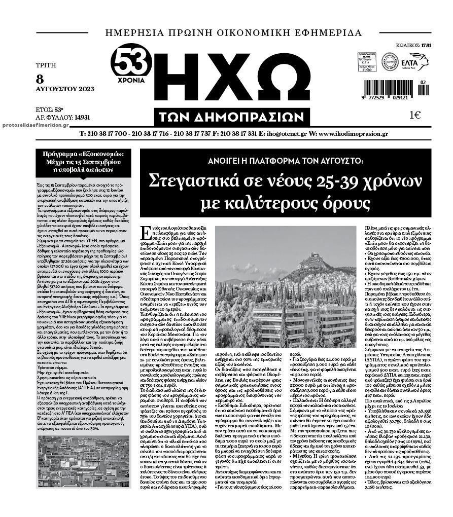 Οι οικονομικές εφημερίδες 8/8/2023 Σήφης Γαρυφαλάκης 06:19, Τρίτη 08 Αυγούστου 2023 Media Διαβάστε τα πρωτοσέλιδα από τις οικονομικές εφημερίδες, σήμερα 08/08/2023.Οι οικονομικές εφημερίδες 7/8/2023 Σχετικά Άρθρα Οι οικονομικές εφημερίδες 5/8/2023Οι οικονομικές εφημερίδες 4/8/2023 ΟΙΚΟΝΟΜΙΚΕΣ ΕΦΗΜΕΡΙΔΕΣ Μοιράσου το: σχολίασε κι εσύ (0 σχόλια) Ακολουθήστε το enikos.gr στο Google News και μάθετε πρώτοι όλες τις ειδήσεις Δείτε όλες τις τελευταίες ειδήσεις από την Ελλάδα και τον Κόσμο στο enikos.gr Ειδήσεις Ροή Ειδήσεων 2 ώρες πριν Νίκος Παππάς: Άφαντος παραμένει ο ευρωβουλευτής μετά την επίθεση στον Νίκο Γιαννόπουλο 20 λεπτά πριν Βρυξέλλες: Ένταση με τους αγρότες – Πέταξαν πατάτες και κροτίδες 2 ώρες πριν Συναγερμός και στην Ελλάδα για τη «σούπερ γρίπη»: Πόσο σοβαρή είναι και ποιοι θεωρούνται πιο ευάλωτοι – 3 ειδικοί μιλούν στο enikos.gr 1 ώρα πριν Μητσοτάκης: Η Ελλάδα στηρίζει την Ουκρανία και θα υποστηρίξει οποιαδήποτε λύση της παρέχει χρηματοδοτική σταθερότητα 22 λεπτά πριν Γαλλία: Το δικαστήριο έκρινε ένοχο τον «διεστραμμένο» αναισθησιολόγο για τη δολοφονία 12 ασθενών – Είχε το παρατσούκλι «Δρ. Θάνατος» 3 ώρες πριν Τα 4 ζώδια που λαμβάνουν ένα ισχυρό σημάδι από το σύμπαν – «Αποκαλύπτεται κάτι που μπορεί να αλλάξει τη ζωή μας» 4 ώρες πριν Η σύζυγός του παραπονιέται για τα χρήματα που της δίνει για ψώνια κάθε μήνα – «Λέει ότι νιώθει φτωχή και της είπα να βρει δουλειά» 2 ώρες πριν Αν κάνετε συνεχώς αυτά τα 8 πράγματα με τα κατοικίδιά σας, σας λείπει η ανθρώπινη επαφή 1 ημέρα πριν 20 χρόνια τα Χριστούγεννα ξεκινούν στα Public με μεγάλη ποικιλία σε δώρα! 2 λεπτά πριν ΑΠΕΥΘΕΙΑΣ – Η ενημέρωση από τον Κυβερνητικό Εκπρόσωπο 2 λεπτά πριν Ανδρουλάκης: Απαράδεκτη η πρόταση της Κομισιόν για μείωση των κονδυλίων της ΚΑΠ – Τι είπε για τις αγροτικές κινητοποιήσεις 7 λεπτά πριν Ιράν: Η θάλασσα «βάφτηκε» κόκκινη στο νησί Χορμούζ – Η εξήγηση Κολυδά για το εντυπωσιακό φαινόμενο 12 λεπτά πριν Άρης Μαλιαγρός: Το βίντεο – αφιέρωμα στον ηθοποιό από την Finos Film: – «Τιμάμε τον γλυκύτατο κύριο με το μονόκλ» 15 λεπτά πριν Ο Π.Σ.Α.Ε. ΜΜΕ τιμάει την ημέρα Αλληλεγγύης ENIKOS NETWORK Τι περιλαμβάνει το σχέδιο της ΕΕ για την καρδιαγγειακή υγεία-Οι προτάσεις της Ελληνικής Καρδιολογικής Εταιρείας Σύγχρονες τεχνικές αποκατάστασης χόνδρινων βλαβών & διατήρησης της άρθρωσης Ειδικό επιδοτούμενο πρόγραμμα κατάρτισης από ΔΥΠΑ και ΕΛΓΟ – ΔΗΜΗΤΡΑ: Έως αύριο οι ενστάσεις – Όσα πρέπει να γνωρίζετε Συντάξεις Ιανουαρίου 2026: Ποια ταμεία πιστώνουν σήμερα τα ποσά Χαρτογραφώντας το «σημείο χωρίς επιστροφή»: Για πρώτη φορά αποκαλύπτεται με λεπτομέρεια το ακανθώδες όριο της ατμόσφαιρας τ... Η Google καταργεί τη λειτουργία «dark web report» – Πώς θα μπορούν οι χρήστες να διαγράφουν τα δεδομένα τους περισσότερα 08:00 , Πέμπτη 18 Δεκεμβρίου 2025 Την Κυριακή με τη Realnews: Δωροεπιταγή 10€ Δωροεπιταγή αξίας 10€ για αγορές άνω των 60€ από τα πολυκαταστήματα FactoryOutlet H προσφορά ι... 07:50 , Πέμπτη 18 Δεκεμβρίου 2025 «Το σόι σου»: Backstage στα γυρίσματα για το εορταστικό επεισόδιο «Το σόι σου» φορά τα γιορτινά του για τα Χριστούγεννα και η Όλγα Λαφαζάνη, με την κάμερα του «... 07:36 , Πέμπτη 18 Δεκεμβρίου 2025 Οι αθλητικές μεταδόσεις 18/12/2025 – Πού θα δείτε τον αγώνα της ΑΕΚ με την Κραϊόβα για το Conference League Τα ματς ΑΕΚ – Ουνιβερσιτάτεα Κραϊόβα για το Conference League και Παναθηναϊκός – Χάποελ Τελ Αβ... 05:48 , Πέμπτη 18 Δεκεμβρίου 2025 Οι οικονομικές εφημερίδες 18/12/2025 Διαβάστε τα πρωτοσέλιδα από τις οικονομικ