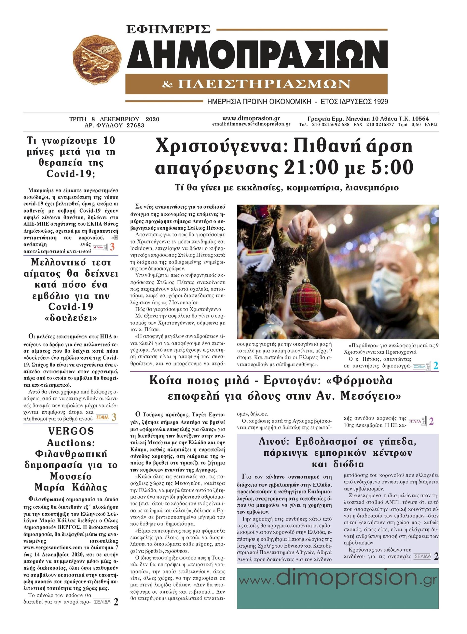 Οι οικονομικές εφημερίδες 8/12/2020 Διονύσης Νίκκας 06:37, Τρίτη 08 Δεκεμβρίου 2020 Media Διαβάστε τα πρωτοσέλιδα των οικονομικών εφημερίδων… ΟΙΚΟΝΟΜΙΚΕΣ ΕΦΗΜΕΡΙΔΕΣ ΠΡΩΤΟΣΕΛΙΔΑ Μοιράσου το: σχολίασε κι εσύ (0 σχόλια) Ακολουθήστε το enikos.gr στο Google News και μάθετε πρώτοι όλες τις ειδήσεις Δείτε όλες τις τελευταίες ειδήσεις από την Ελλάδα και τον Κόσμο στο enikos.gr Ειδήσεις Ροή Ειδήσεων 1 ώρα πριν Κύκλωμα διακίνησης ναρκωτικών σε σχολεία: Βίντεο ντοκουμέντο από τα βασανιστήρια στους ανήλικους – Συζητούσαν για το πώς θα κάνουν «ξέπλυμα χρήματος» 20 λεπτά πριν Κλιμακώνουν τις κινητοποιήσεις τους οι αγρότες: Κλείνουν τη Δευτέρα τις σήραγγες των Τεμπών για τα φορτηγά – Ανοίγουν την Τρίτη τους δρόμους για τους εκδρομείς 1 ώρα πριν Αιματηρό επεισόδιο στον Άγιο Παντελεήμονα – Δύο τραυματίες, αναζητείται ο δράστης 29 λεπτά πριν ΗΠΑ: Αυξάνουν την πίεση στην Βενεζουέλα – Το νέο ρεσάλτο σε τάνκερ και ο στόχος του Τραμπ 1 ώρα πριν Κασσελάκης για παραίτηση Μάλαμα: «Η πορεία μας δεν θα καθοριστεί από μεμονωμένα πρόσωπα, μηχανισμούς και προσωπικές ατζέντες» 1 ώρα πριν Ύπνος: Τι είναι ο «κανόνας 3-3-3» που χρησιμοποιεί ένας γιατρός για να ξεχωρίσει την κόπωση από την αϋπνία 2 ώρες πριν Αριθμολογία: Οι άνθρωποι που έχουν γεννηθεί αυτές τις 4 ημερομηνίες, είναι οι πιο πιστοί και αφοσιωμένοι σύντροφοι 16 λεπτά πριν Αρχαιολογικό θρίλερ στην καρδιά της Ευρώπης: Παράξενο θραύσμα με ανάγλυφα και σφηνοειδή γραφή ανακαλύφθηκε σε μέρος που δεν περίμενε κανείς 2 ημέρες πριν Enerwave: Το νέο «ρεύμα» στη λιανική ενέργειας που αλλάζει την εμπειρία του καταναλωτή 12 λεπτά πριν ΑΕΚ – ΟΦΗ 2-1: Γιορτές στην κορυφή με… ανατροπή 16 λεπτά πριν Αρχαιολογικό θρίλερ στην καρδιά της Ευρώπης: Παράξενο θραύσμα με ανάγλυφα και σφηνοειδή γραφή ανακαλύφθηκε σε μέρος που δεν περίμενε κανείς 20 λεπτά πριν Κλιμακώνουν τις κινητοποιήσεις τους οι αγρότες: Κλείνουν τη Δευτέρα τις σήραγγες των Τεμπών για τα φορτηγά – Ανοίγουν την Τρίτη τους δρόμους για τους εκδρομείς 21 λεπτά πριν Γουίτκοφ: «Εποικοδομητικές και παραγωγικές» οι συνομιλίες στο Μαϊάμι 29 λεπτά πριν ΗΠΑ: Αυξάνουν την πίεση στην Βενεζουέλα – Το νέο ρεσάλτο σε τάνκερ και ο στόχος του Τραμπ ENIKOS NETWORK Οι γυναίκες έχουν βρει μια νέα απόλαυση στην κρεβατοκάμαρα που οι περισσότεροι άνδρες αγνοούν Christmas glow: 5 χρυσές συμβουλές για επιδερμίδα που λάμπει από ομορφιά τα Χριστούγεννα Νέο έτος ρεκόρ για τον ελληνικό τουρισμό το 2025: «Είμαστε μέσα στους 10 πλέον επισκέψιμους προορισμούς παγκοσμίως» λέει η ... Τιμές καυσίμων: Πόσο θα πληρώσουν οι εκδρομείς των Χριστουγέννων – Το κόστος μετακινήσεων σε δημοφιλείς προορισμούς Χαρτογραφώντας το «σημείο χωρίς επιστροφή»: Για πρώτη φορά αποκαλύπτεται με λεπτομέρεια το ακανθώδες όριο της ατμόσφαιρας τ... Η Google καταργεί τη λειτουργία «dark web report» – Πώς θα μπορούν οι χρήστες να διαγράφουν τα δεδομένα τους περισσότερα 21:30 , Κυριακή 21 Δεκεμβρίου 2025 Ο Δικαστής: Στα χέρια της Αστυνομίας βίντεο, που ανατρέπει όλα τα δεδομένα – Στενεύει ο κλοιός γύρω από τον Δικαστή Καταιγιστικές εξελίξεις στο τελευταίο επεισόδιο της χρονιάς της σειράς “Ο Δικαστής”... 17:18 , Κυριακή 21 Δεκεμβρίου 2025 «Η Μεγάλη Χίμαιρα»: Μάγεψε το κοινό κατά την avant-première της προβολής της Την Πρωτοχρονιά (Πέμπτη 1η Ιανουαρίου 2026) στο ERTFLIX θα γίνει η πρεμιέρα της πολυαναμενόμεν... 15:08 , Κυριακή 21 Δεκεμβρίου 2025 Μια νύχτα μόνο: Η Αρετή και ο Οδυσσέας έρχονται και πάλι κοντά Το νέ