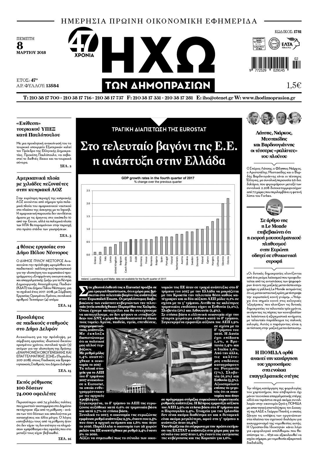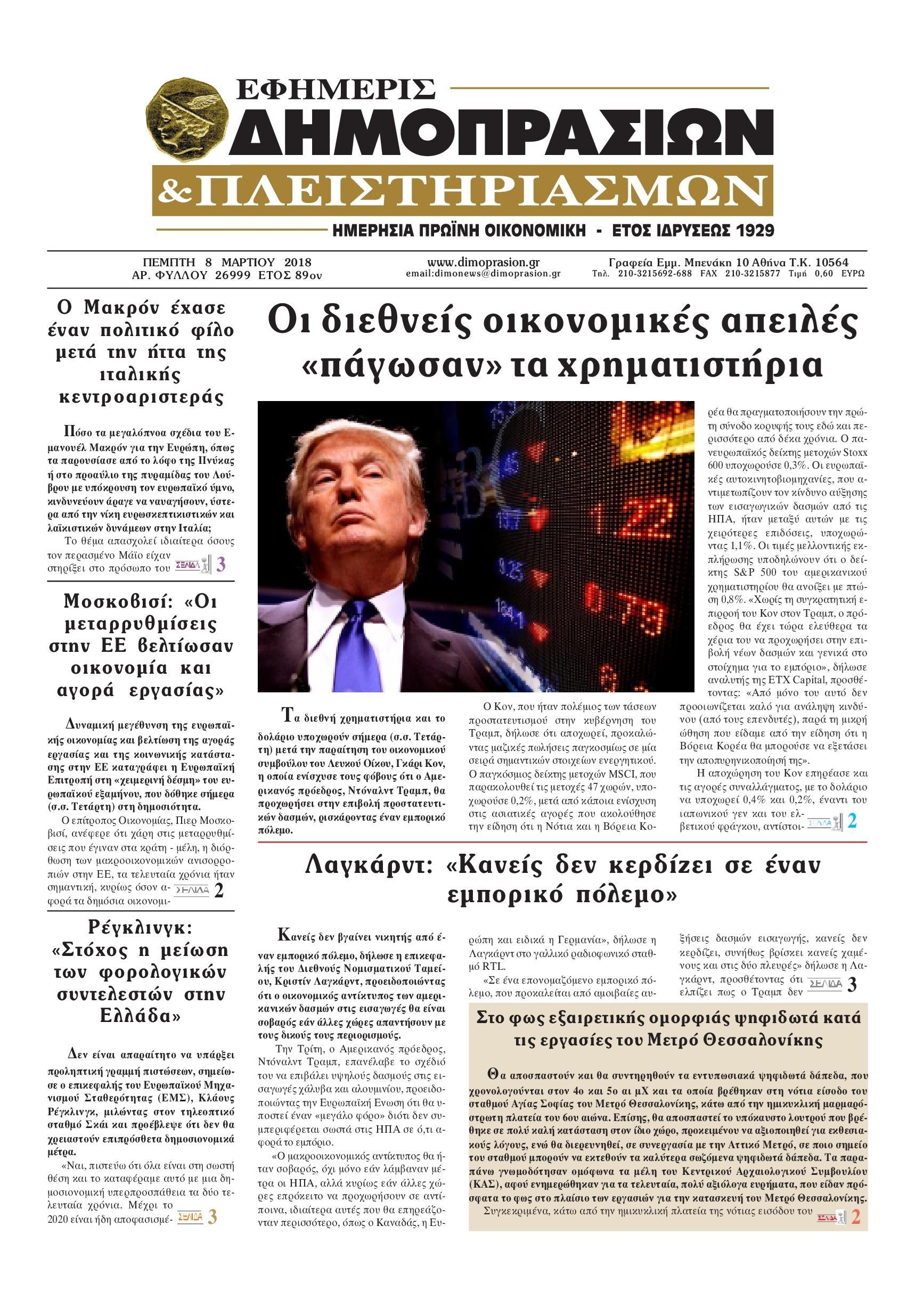 Οι οικονομικές εφημερίδες 8/3/2018 Κώστας Τεό 06:42, Πέμπτη 08 Μαρτίου 2018 Media Διαβάστε τα σημερινά πρωτοσέλιδα των οικονομικών εφημερίδων: ΟΙΚΟΝΟΜΙΚΕΣ ΕΦΗΜΕΡΙΔΕΣ ΠΡΩΤΟΣΕΛΙΔΑ Μοιράσου το: σχολίασε κι εσύ (0 σχόλια) Ακολουθήστε το enikos.gr στο Google News και μάθετε πρώτοι όλες τις ειδήσεις Δείτε όλες τις τελευταίες ειδήσεις από την Ελλάδα και τον Κόσμο στο enikos.gr Ειδήσεις Ροή Ειδήσεων 3 ώρες πριν Αυξάνουν την πίεση προς την κυβέρνηση οι αγρότες: Κλείνουν παρακαμπτήριους και ανοίγουν διόδια – Τι θα γίνει τις γιορτές 2 ώρες πριν ΟΠΕΚΕΠΕ: Προφυλακιστέος ο φερόμενος αρχηγός και ο λογιστής της εγκληματικής οργάνωσης 3 ώρες πριν Φοινικούντα: Το Σάββατο απολογείται ο 30χρονος γιος γνωστού επιχειρηματία της Πλάκας που παραδόθηκε – Όσα είπε στους αστυνομικούς και ο ρόλος του στο έγκλημα 3 ώρες πριν Μπορεί ο Μαδούρο να αντέξει τον αποκλεισμό του Τραμπ; Τι θα χρειαστεί η Ουάσινγκτον για να τον ανατρέψει 4 ώρες πριν Πρίγκιπας Ουίλιαμ – Κέιτ: Η νέα οικογενειακή φωτογραφία για τις Χριστουγεννιάτικες κάρτες του 2025 4 ώρες πριν Ύπνος: Η απλή βραδινή ρουτίνα για να προστατεύσετε τα μαλλιά σας από το κρύο κατά τη διάρκεια του χειμώνα 5 ώρες πριν Manifesting: Πώς να συναντήσετε τον σύντροφο της ζωής σας, ανάλογα με τον μήνα γέννησής σας 2 ημέρες πριν 20 χρόνια τα Χριστούγεννα ξεκινούν στα Public με μεγάλη ποικιλία σε δώρα! 3 ώρες πριν Αρχαιολόγοι ανακάλυψαν ρωμαϊκά τεχνουργήματα από μια πόλη που δεν υπήρξε ποτέ – Τα τρία εντυπωσιακά κτίρια και ο αμφορέας με τις… σαρδέλες 5 λεπτά πριν Μιχάλης Χρυσοχοΐδης από την Κωνσταντινούπολη: Κοινές επιχειρήσεις Ελλάδας – Τουρκίας ενάντια στο οργανωμένο έγκλημα 27 λεπτά πριν Μάρκο Νίκολιτς: «Είμαι περήφανος για τους παίκτες μου, όποιος αντίπαλος και να έρθει θα προετοιμαστούμε» 36 λεπτά πριν ΟΗΕ: Την εκλογή του νέου ύπατου αρμοστή για τους Πρόσφυγες Μπαρχάμ Άχμεντ Σαλίχ χαιρέτησε ο Αντόνιο Γκουτέρες 41 λεπτά πριν Σύνοδος Κορυφής στις Βρυξέλλες: Ακόμη πιο κοντά σε διέξοδο για τη χρηματοδότηση της Ουκρανίας 49 λεπτά πριν ΟΗΕ: Iστορική επίσκεψη του Συμβουλίου Ασφαλείας στη Δαμασκό – Mήνυμα Ελλάδας για συμπερίληψη και λογοδοσία ENIKOS NETWORK Σε περίοδο αυξημένης δραστηριότητας η γρίπη στην Ελλάδα-Μέτρα προστασίας από τον ΕΟΔΥ Σκέφτεστε συνέχεια συζητήσεις που έχετε κάνει; Τι σημαίνει αυτό, σύμφωνα με ειδικό Στεγαστικό: Τι λέει η ΠΟΜΙΔΑ για τα νέα μέτρα που ανακοίνωσε ο Κυριάκος Μητσοτάκης Λαγκάρντ: Αισιόδοξη για την ανάπτυξη της Ευρωζώνης, αβέβαιη για τον πληθωρισμό Χαρτογραφώντας το «σημείο χωρίς επιστροφή»: Για πρώτη φορά αποκαλύπτεται με λεπτομέρεια το ακανθώδες όριο της ατμόσφαιρας τ... Η Google καταργεί τη λειτουργία «dark web report» – Πώς θα μπορούν οι χρήστες να διαγράφουν τα δεδομένα τους περισσότερα 17:45 , Πέμπτη 18 Δεκεμβρίου 2025 ROUK ZOUK: Εορταστικό επεισόδιο με καλεσμένους τους πρωταγωνιστές του «Γιατί ρε πατέρα» Το Σάββατο 20 Δεκεμβρίου στις 21:00, η Ζέτα Μακρυπούλια υποδέχεται εκλεκτούς ηθοποιούς που όλο... 17:20 , Πέμπτη 18 Δεκεμβρίου 2025 Άγιος έρωτας: Η Χριστίνα εξομολογείται στον πατέρα Νικόλαο, απόψε στις 21:00 στον Alpha Η Νότα αποφασίζει να εκδικηθεί τον Πέτρο και τον Στέφανο, για χάρη του Λούη, όμως τα πράγματα ... 16:50 , Πέμπτη 18 Δεκεμβρίου 2025 Να μ’ αγαπάς: Ζωή και Φωτεινή συμφιλιώνονται ως μάνα με κόρη, απόψε στις 20:00 Η ταυτότητα του Άγγελου αποκαλύπτεται στο νέο επεισόδιο της σειράς “Να μ’ αγαπάς... 15:52 , Πέμπτη 18 Δεκεμβρίου 2025 Το Σπίτι Δίπλα Στο Ποτάμι: Το καθηλω