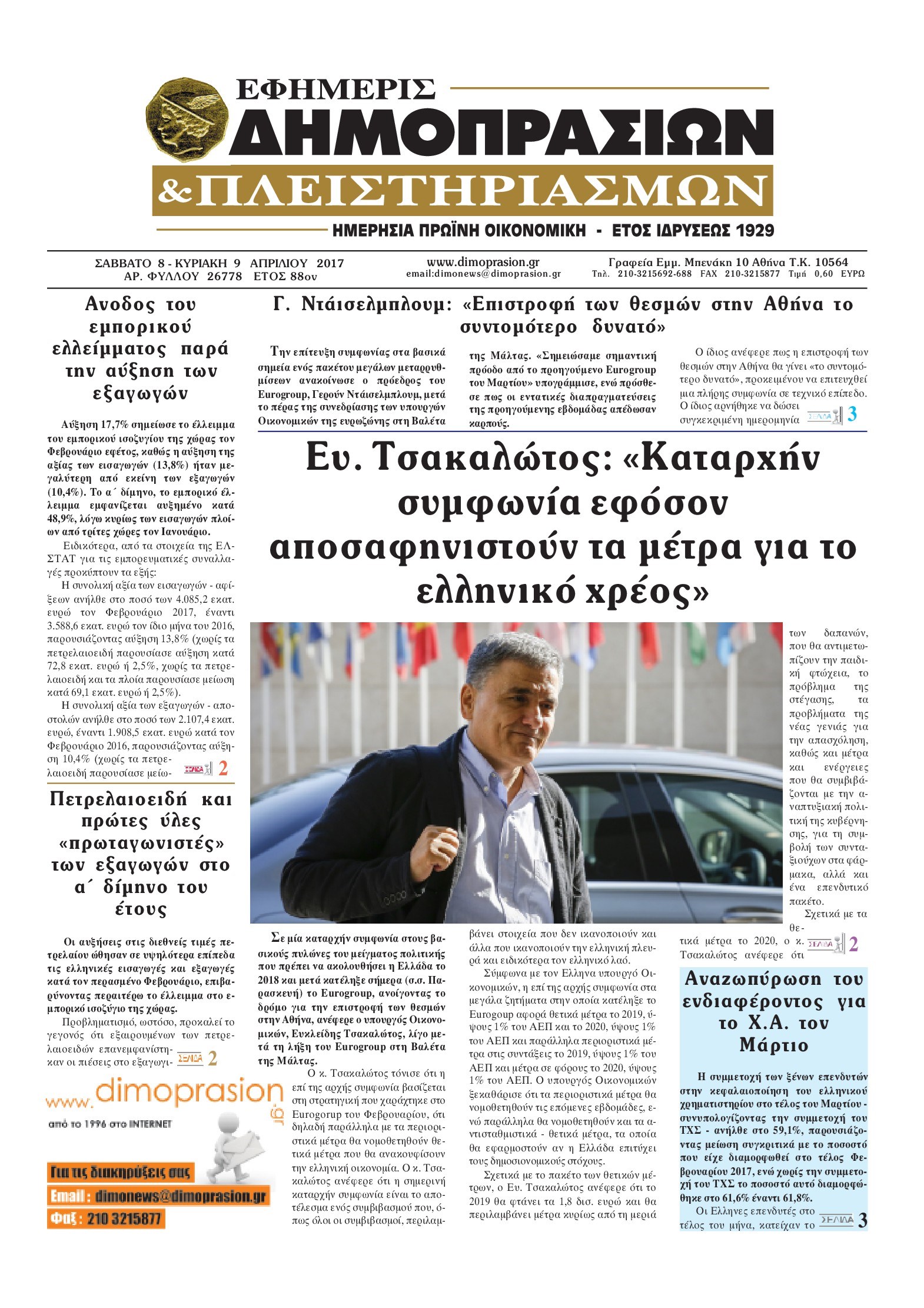 Οι οικονομικές εφημερίδες 8/4/2017 Enikos Newsroom 07:15, Σάββατο 08 Απριλίου 2017 Media Διαβάστε τα σημερινά πρωτοσέλιδα των οικονομικών εφημερίδων: ΟΙΚΟΝΟΜΙΚΕΣ ΕΦΗΜΕΡΙΔΕΣ ΠΡΩΤΟΣΕΛΙΔΑ Μοιράσου το: σχολίασε κι εσύ (0 σχόλια) Ακολουθήστε το enikos.gr στο Google News και μάθετε πρώτοι όλες τις ειδήσεις Δείτε όλες τις τελευταίες ειδήσεις από την Ελλάδα και τον Κόσμο στο enikos.gr Ειδήσεις Ροή Ειδήσεων 3 ώρες πριν ΣΥΡΙΖΑ: Διαγράφεται ο ευρωβουλευτής Νίκος Παππάς μετά την μήνυση δημοσιογράφου για ξυλοδαρμό 8 λεπτά πριν Δημοσκόπηση Opinion Poll: Στις 12,9 μονάδες η διαφορά ΝΔ-ΠΑΣΟΚ – Τι λένε οι πολίτες για αγρότες, ΟΠΕΚΕΠΕ, Τσίπρα και Σαμαρά 2 ώρες πριν ΟΠΕΚΕΠΕ: Ελεύθερες με όρους η σύζυγος και η αδελφή του φερόμενου αρχηγού – Τι υποστήριξαν 4 ώρες πριν Πώς στήθηκε η επιχείρηση «Ίπαλλος» που οδήγησε στη σύλληψη του «Έλληνα Εσκομπάρ» – «Ο πόλεμος ενάντια στους εμπόρους ναρκωτικών θα συνεχιστεί» 4 ώρες πριν Κυψέλη: Στη φυλακή η 16χρονη που μαχαίρωσε συμμαθήτριά της 1 ώρα πριν Οι άνθρωποι που θυμούνται τα όνειρά τους, συνήθως μοιράζονται αυτά τα 6 σπάνια χαρακτηριστικά 4 ώρες πριν Τα 3 ζώδια που θα δουν τη ζωή τους να αλλάζει ριζικά το 2026 – «Όλα γίνονται καλύτερα σταδιακά» 5 ώρες πριν Ο σπάνιος σεισμός που έλυσε τα χέρια των επιστημόνων – Αποκάλυψε ακριβώς όσα αναζητούσαν 11 ώρες πριν 20 χρόνια τα Χριστούγεννα ξεκινούν στα Public με μεγάλη ποικιλία σε δώρα! 4 λεπτά πριν Στη ΜΕΘ του νοσοκομείου Ζακύνθου ο Μητροπολίτης Δωδώνης 8 λεπτά πριν Δημοσκόπηση Opinion Poll: Στις 12,9 μονάδες η διαφορά ΝΔ-ΠΑΣΟΚ – Τι λένε οι πολίτες για αγρότες, ΟΠΕΚΕΠΕ, Τσίπρα και Σαμαρά 15 λεπτά πριν ΠΑΣΟΚ: Καταδικάζουμε τον ξυλοδαρμό και την τραμπούκικη συμπεριφορά του ευρωβουλευτή Νίκου Παππά σε βάρος του δημοσιογράφου Νίκου Γιαννόπουλου 20 λεπτά πριν Εξεταστική για ΟΠΕΚΕΠΕ – Σκέρτσος: Διαχρονικά τα θέματα του οργανισμού – Δεν έγινε καμία αναφορά μου σε ποινικές διαδικασίες 26 λεπτά πριν Συγκλονιστικό βίντεο: Τρόμος για τουρίστες που σώθηκαν την τελευταία στιγμή από λεωφορείο που κατρακυλούσε σε φαράγγι ENIKOS NETWORK Αϋπνία: Το κόλπο που θα σας βοηθήσει να κοιμηθείτε απόψε – Είναι απλό και έχει αποτέλεσμα 2,6 εκατομμύρια πολίτες έχουν ήδη εμβολιαστεί κατά της γρίπης Ελληνικά ομόλογα: Τι λέει η S&P Global Προκήρυξη ΑΣΕΠ για 4.276 μόνιμες προσλήψεις στο Δημόσιο: Βγήκαν τα προσωρινά αποτελέσματα – Ποιοι μπορούν να υποβάλουν ένσ... Χαρτογραφώντας το «σημείο χωρίς επιστροφή»: Για πρώτη φορά αποκαλύπτεται με λεπτομέρεια το ακανθώδες όριο της ατμόσφαιρας τ... Η Google καταργεί τη λειτουργία «dark web report» – Πώς θα μπορούν οι χρήστες να διαγράφουν τα δεδομένα τους περισσότερα 12:35 , Τετάρτη 17 Δεκεμβρίου 2025 Μίρκα Παπακωνσταντίνου: «Δεν ήμουν αισιόδοξη για τα νούμερα – Είμαι ρεαλίστρια» Στα γυρίσματα του εορταστικού επεισοδίου της αγαπημένης σειράς “Το Σόι Σου”, βρέθηκε η κάμερα ... 12:12 , Τετάρτη 17 Δεκεμβρίου 2025 Ακούστε την εκπομπή του Νίκου Χατζηνικολάου 17/12/2025 Ακούστε την εκπομπή του Νίκου Χατζηνικολάου στον ραδιοφωνικό σταθμό RealFm 97,8, την Τετάρτη 1... 11:35 , Τετάρτη 17 Δεκεμβρίου 2025 Home Alone: Το σπίτι της ταινίας θα ανακαινιστεί – Επιστροφή στην αισθητική της δεκαετίας του ’90 Οι νέοι ιδιοκτήτες του πραγματικού σπιτιού που παρουσιάζεται στην κλασική ταινία του 1990 «Hom... 11:25 , Τετάρτη 17 Δεκεμβρίου 2025 Grand Hotel: Απόψε το τελευταίο επεισόδιο της χρονιάς – Όλα τα μυστικά μένουν εδώ Το τελευταίο επεισόδιο της χρονιάς της σειράς «Grand Hotel» θα προβληθεί απόψε στις 21:00. Ο 