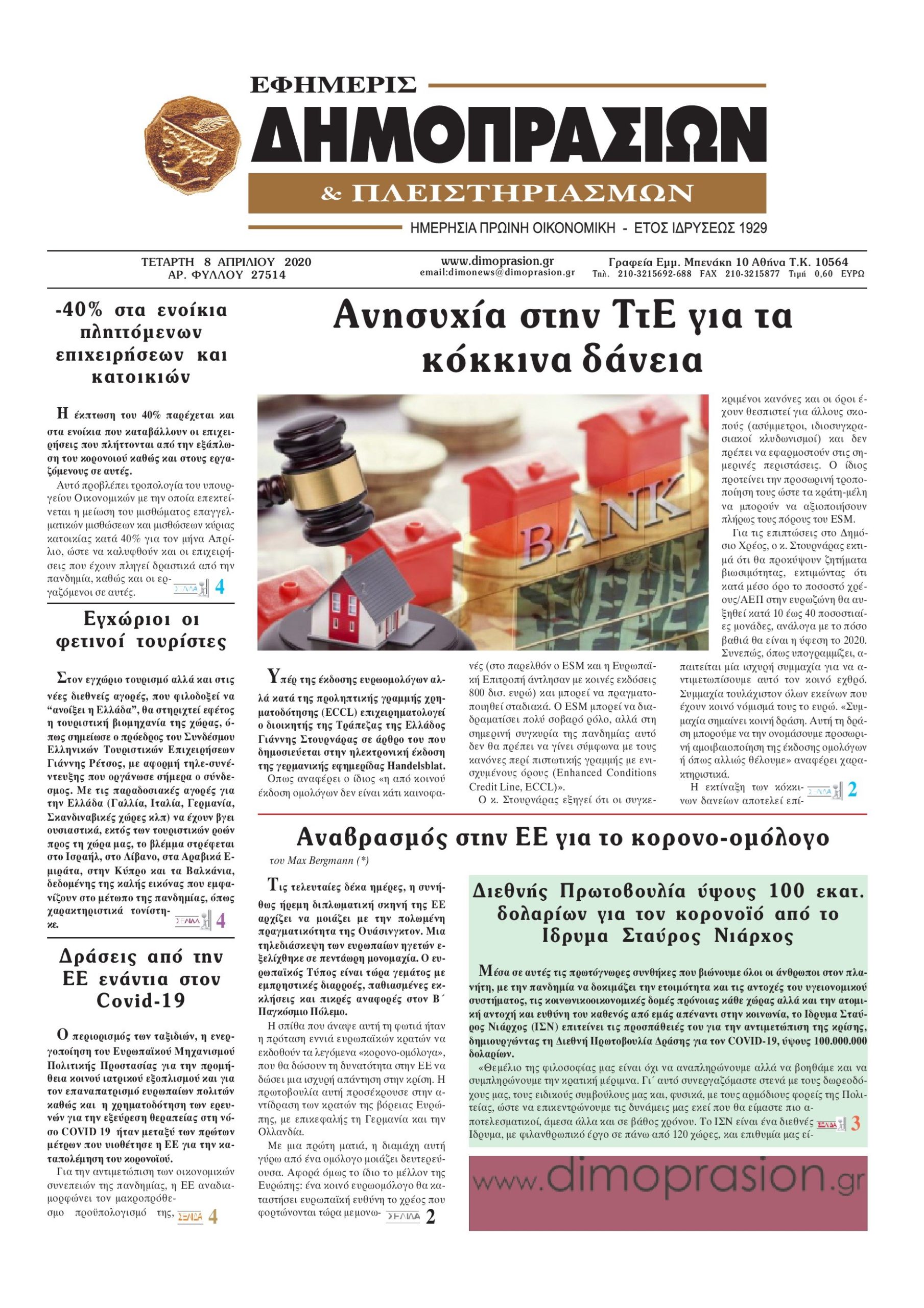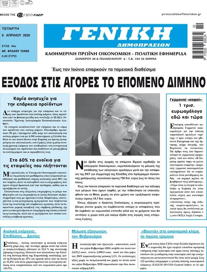 Οι οικονομικές εφημερίδες 8/4/2020 Διονύσης Νίκκας 06:25, Τετάρτη 08 Απριλίου 2020 Media Διαβάστε τα πρωτοσέλιδα των οικονομικών εφημερίδων… ΟΙΚΟΝΟΜΙΚΕΣ ΕΦΗΜΕΡΙΔΕΣ ΠΡΩΤΟΣΕΛΙΔΑ Μοιράσου το: σχολίασε κι εσύ (0 σχόλια) Ακολουθήστε το enikos.gr στο Google News και μάθετε πρώτοι όλες τις ειδήσεις Δείτε όλες τις τελευταίες ειδήσεις από την Ελλάδα και τον Κόσμο στο enikos.gr Ειδήσεις Ροή Ειδήσεων 5 ώρες πριν Χριστούγεννα στα μπλόκα: Επιμένουν στις κινητοποιήσεις τους οι αγρότες – Ανοίγουν τα διόδια το Σαββατοκύριακο 6 ώρες πριν Ουκρανία: Η άνευ προηγουμένου επίθεση σε ρωσικό τάνκερ στη Μεσόγειο και το μήνυμα προς στον Πούτιν – Το «μακρύ χέρι» του Κιέβου 5 ώρες πριν Πούτιν: Τα μηνύματα σε Ευρώπη και ΝΑΤΟ από το μαραθώνιο «σόου» του – Η απαίτηση για «σεβασμό» και η ειρήνη «με τους όρους» της Μόσχας 6 ώρες πριν Τραμπ: Δεν αποκλείει την πιθανότητα ενός πολέμου στη Βενεζουέλα – «Ο Μαδούρο ξέρει καλύτερα από τον καθένα τι ακριβώς θέλω» 7 ώρες πριν Συνεχίζει να προκαλεί ο Μίτσκοσκι: «Για μένα το όνομα Μακεδονία είναι ιερό» 5 ώρες πριν Ανακαλύφθηκαν αρχαία χρυσά νομίσματα 2.200 ετών που απεικονίζουν τον θεό Απόλλωνα – Η άγνωστη σύνδεση με τον Φίλιππο Β΄ της Μακεδονίας 6 ώρες πριν Ύπνος: Μια κρυφή κατάσταση του εγκεφάλου πριν από τον ύπνο μπορεί να είναι το “κλειδί” για υψηλή ευφυΐα και δημιουργικότητα 7 ώρες πριν Αριθμολογία: Οι άνθρωποι που έχουν γεννηθεί αυτές τις 4 ημερομηνίες, συχνά παρεξηγούνται – «Η καλοσύνη τους κρύβει τεράστια δύναμη» 8 ώρες πριν Ξεχάστε το καθάρισμα το Σαββατοκύριακο: Ο «κανόνας των 20 λεπτών» που θα σας λύσει τα χέρια 2 λεπτά πριν Βολιβία: Μαζική διαδηλώσεις εναντίον της κατάργησης των επιδοτήσεων των τιμών των καυσίμων 17 λεπτά πριν Φως στο Τούνελ: Έφτασε η ώρα της αλήθειας για την δολοφονία της χήρας του πρώην υπουργού στο Κολωνάκι 32 λεπτά πριν Ντόναλντ Τραμπ: Προστέθηκε το όνομά του στην πρόσοψη του Κέντρου Κένεντι – Οργισμένη αντίδραση των συγγενών του JFK 47 λεπτά πριν Ταμίλα Κουλίεβα: «Δεν θέλω να είμαι κάποια που πορεύεται συνεχώς με τις ίδιες αναφορές» 1 ώρα πριν Η Ελλάδα προσχωρεί στη Διεθνή Επιτροπή Αποζημιώσεων για την Ουκρανία ENIKOS NETWORK Το ΕΚΑΒ τιμήθηκε από την Ακαδημία Αθηνών για τα 40 χρόνια προσφοράς του Έχετε πραγματικά μεγάλη καρδιά; 10 χαρακτηριστικά όσων έχουν καλοσύνη Αναστολή μέτρων αναγκαστικής εκτέλεσης για κτηνοτρόφους που πλήττονται από την ευλογιά των αιγοπροβάτων Πλήρης επάρκεια προϊόντων στις λαϊκές της Αττικής, παρά τις αγροτικές κινητοποιήσεις – Τι απαντούν οι πωλητές Χαρτογραφώντας το «σημείο χωρίς επιστροφή»: Για πρώτη φορά αποκαλύπτεται με λεπτομέρεια το ακανθώδες όριο της ατμόσφαιρας τ... Η Google καταργεί τη λειτουργία «dark web report» – Πώς θα μπορούν οι χρήστες να διαγράφουν τα δεδομένα τους περισσότερα 02:50 , Σάββατο 20 Δεκεμβρίου 2025 GNTM: Η Ξένια Τσίρκοβα αναδείχθηκε μεγάλη νικήτρια και πήρε τις 50.000 ευρώ – Ποιος βρέθηκε σε απόσταση αναπνοής; Με φαντασμαγορικό τρόπο ολοκληρώθηκε το βράδυ της Παρασκευής ο μεγάλος τελικός του GNTM, μέσα ... 22:42 , Παρασκευή 19 Δεκεμβρίου 2025 Γιώργος Γιαννόπουλος για “Το σόι σου”: “Είναι ευτυχία και ευλογία αυτή η σειρά” «Είναι ευτυχία και ευλογία η συγκυρία αυτής της σειράς», θα πει ο Γιώργος Γιαννόπουλος -ο αγαπ... 20:37 , Παρασκευή 19 Δεκεμβρίου 2025 Don’t Forget The Lyrics: Η Έλλη Κοκκίνου υποδέχεται 4 παίκτες που θα κάνουν τα πάντα για να μη χάσουν ούτε… μισή λέξη από τους στίχους Το «Don’t Forget The Lyrics» επιστρέφει 