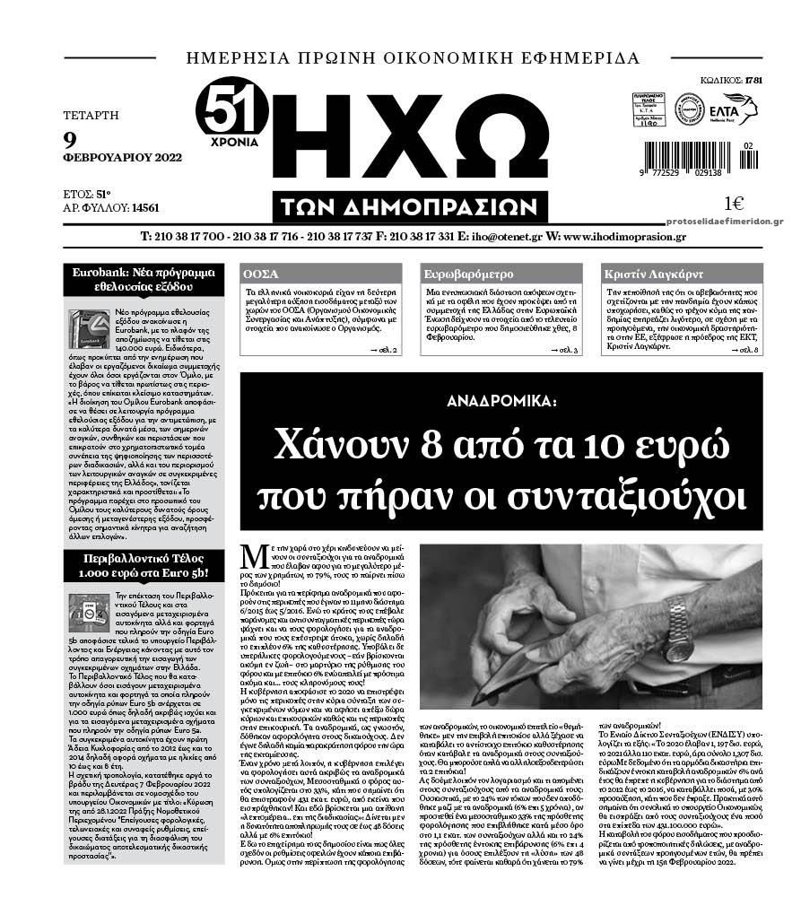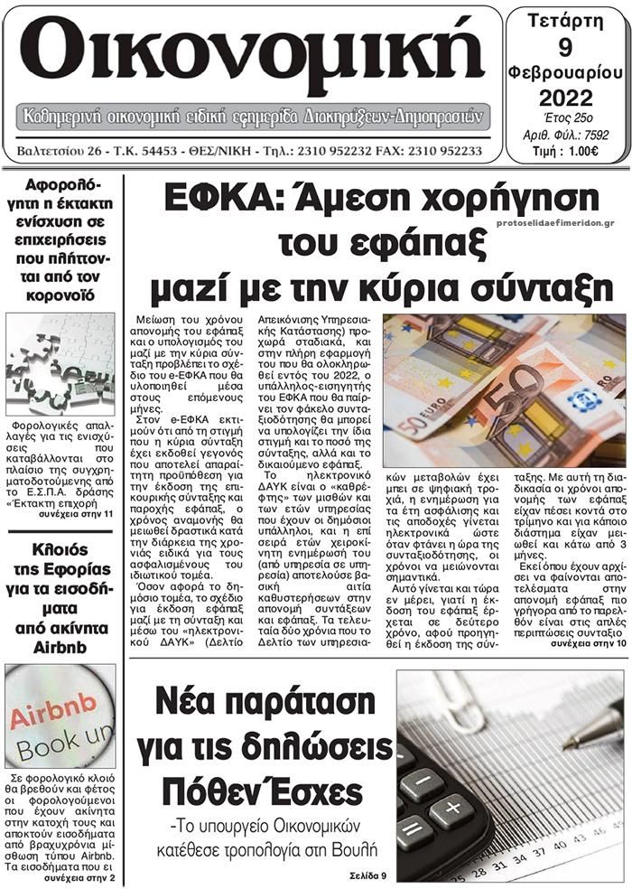 Οι οικονομικές εφημερίδες 9/2/2022 Διονύσης Νίκκας 06:50, Τετάρτη 09 Φεβρουαρίου 2022 Media Διαβάστε τα πρωτοσέλιδα από τις οικονομικές εφημερίδες… ΟΙΚΟΝΟΜΙΚΕΣ ΕΦΗΜΕΡΙΔΕΣ Μοιράσου το: ΥΠΟΙΚ: Η Αξιωματική Αντιπολίτευση συνεχίζει να πολιτεύεται με ψέματα ΕΕ-Κομισιόν: Το σχέδιο για δημόσιες και ιδιωτικές επενδύσεις σε τσιπ Πάνος Νάτσης: Η φωτογραφία που ανέβασε η σύντροφός του λίγες μέρες μετά τον θάνατό του σχολίασε κι εσύ (0 σχόλια) Ακολουθήστε το enikos.gr στο Google News και μάθετε πρώτοι όλες τις ειδήσεις Δείτε όλες τις τελευταίες ειδήσεις από την Ελλάδα και τον Κόσμο στο enikos.gr Ειδήσεις Ροή Ειδήσεων 1 ώρα πριν Νίκος Παππάς: Άφαντος παραμένει ο ευρωβουλευτής μετά την επίθεση στον Νίκο Γιαννόπουλο 44 λεπτά πριν Μητσοτάκης: Η Ελλάδα στηρίζει την Ουκρανία και θα υποστηρίξει οποιαδήποτε λύση της παρέχει χρηματοδοτική σταθερότητα 1 ώρα πριν Συναγερμός και στην Ελλάδα για τη «σούπερ γρίπη»: Πόσο σοβαρή είναι και ποιοι θεωρούνται πιο ευάλωτοι – 3 ειδικοί μιλούν στο enikos.gr 1 ώρα πριν Με το βλέμμα στραμμένο στις Σέρρες οι αγρότες – Ο χάρτης των μπλόκων στη Βόρεια Ελλάδα 3 ώρες πριν Ντόναλντ Τραμπ: Το διάγγελμα, η πτώση στις δημοσκοπήσεις και το… χάος που κληρονόμησε από τον Μπάιντεν 2 ώρες πριν Τα 4 ζώδια που λαμβάνουν ένα ισχυρό σημάδι από το σύμπαν – «Αποκαλύπτεται κάτι που μπορεί να αλλάξει τη ζωή μας» 3 ώρες πριν Η σύζυγός του παραπονιέται για τα χρήματα που της δίνει για ψώνια κάθε μήνα – «Λέει ότι νιώθει φτωχή και της είπα να βρει δουλειά» 1 ώρα πριν Αν κάνετε συνεχώς αυτά τα 8 πράγματα με τα κατοικίδιά σας, σας λείπει η ανθρώπινη επαφή 1 ημέρα πριν 20 χρόνια τα Χριστούγεννα ξεκινούν στα Public με μεγάλη ποικιλία σε δώρα! 17 δευτερόλεπτα πριν Καμμένος σε Καρυστιανού: Σας πολεμάνε, γιατί σας φοβούνται – Η ανάγκη για Οξυγόνο θα επικρατήσει 4 λεπτά πριν Σύνοδος Κορυφής: Δεν θα φύγουμε χωρίς απόφαση, λένε Κόστα και Φον Ντερ Λάιεν – «Καμπανάκι» Ζελένσκι για τη χρηματοδότηση της Ουκρανίας 9 λεπτά πριν Άνδρας 30 ετών αποκαλύπτει πώς έχασε 45 κιλά σε 1 χρόνο: «Ήμουν νωθρός και ανασφαλής – Πλέον νιώθω ικανός για οτιδήποτε» 16 λεπτά πριν Ανατροπή για τα ενοίκια: Παράταση 3 μηνών για την υποχρεωτική πληρωμή μέσω τράπεζας 22 λεπτά πριν Φωκίδα: «Τώρα θα πάω στους αγγέλους»: Τα τελευταία λόγια του άνδρα που βρέθηκε απανθρακωμένος στο αυτοκίνητό του ENIKOS NETWORK Τι περιλαμβάνει το σχέδιο της ΕΕ για την καρδιαγγειακή υγεία-Οι προτάσεις της Ελληνικής Καρδιολογικής Εταιρείας Σύγχρονες τεχνικές αποκατάστασης χόνδρινων βλαβών & διατήρησης της άρθρωσης Ειδικό επιδοτούμενο πρόγραμμα κατάρτισης από ΔΥΠΑ και ΕΛΓΟ – ΔΗΜΗΤΡΑ: Έως αύριο οι ενστάσεις – Όσα πρέπει να γνωρίζετε Συντάξεις Ιανουαρίου 2026: Ποια ταμεία πιστώνουν σήμερα τα ποσά Χαρτογραφώντας το «σημείο χωρίς επιστροφή»: Για πρώτη φορά αποκαλύπτεται με λεπτομέρεια το ακανθώδες όριο της ατμόσφαιρας τ... Η Google καταργεί τη λειτουργία «dark web report» – Πώς θα μπορούν οι χρήστες να διαγράφουν τα δεδομένα τους περισσότερα 08:00 , Πέμπτη 18 Δεκεμβρίου 2025 Την Κυριακή με τη Realnews: Δωροεπιταγή 10€ Δωροεπιταγή αξίας 10€ για αγορές άνω των 60€ από τα πολυκαταστήματα FactoryOutlet H προσφορά ι... 07:50 , Πέμπτη 18 Δεκεμβρίου 2025 «Το σόι σου»: Backstage στα γυρίσματα για το εορταστικό επεισόδιο «Το σόι σου» φορά τα γιορτινά του για τα Χριστούγεννα και η Όλγα Λαφαζάνη, με την κάμερα του «... 07:36 , Πέμπτη 18 Δεκεμβρίου 2025 Οι αθλητικές μεταδόσεις 18/12/2025 – Πού θα δείτε τον αγώνα της ΑΕΚ με 