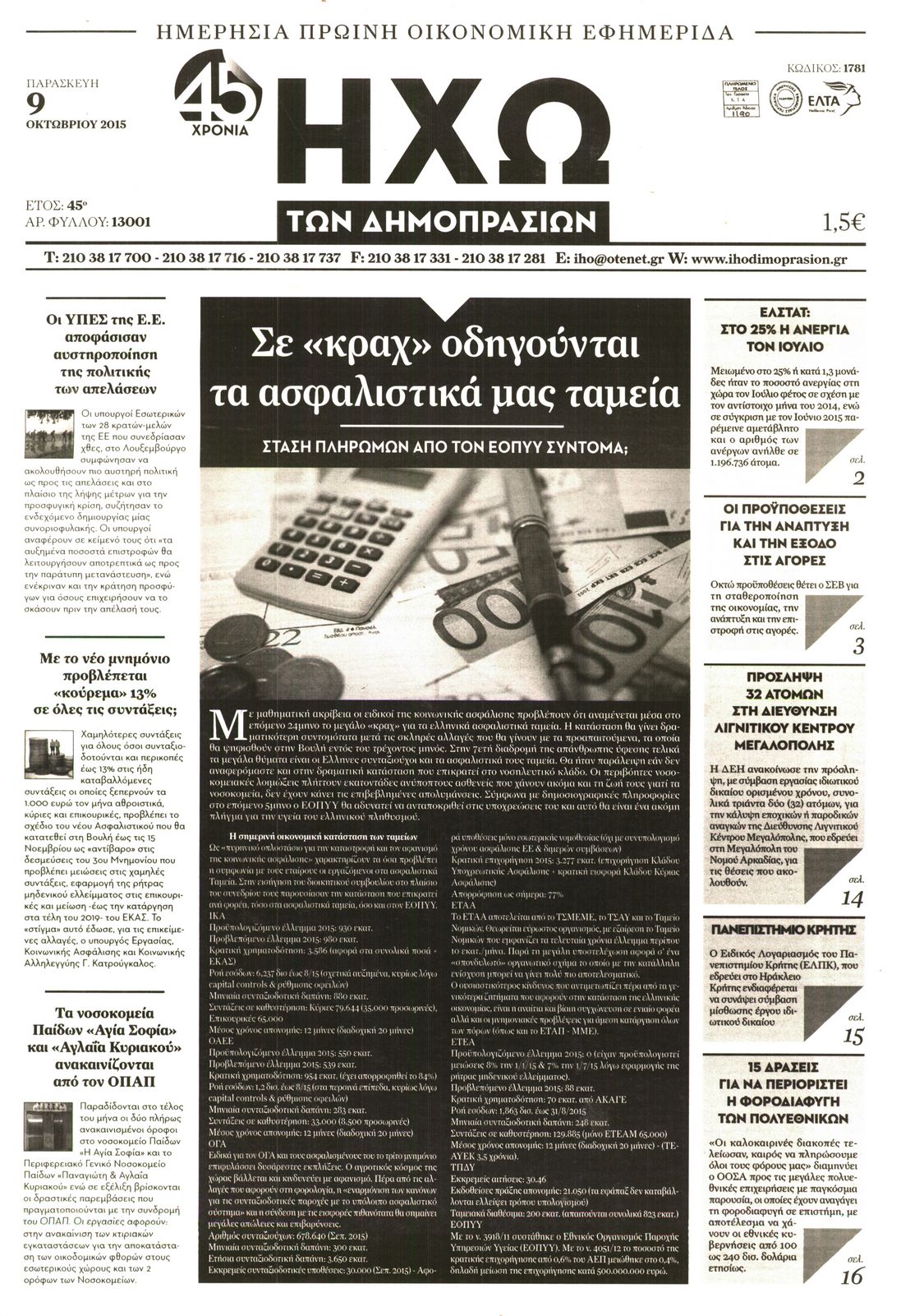 Οι οικονομικές εφημερίδες 9/10/2015 Enikos Newsroom 07:59, Παρασκευή 09 Οκτωβρίου 2015 Media Διαβάστε τα σημερινά πρωτοσέλιδα των οικονομικών εφημερίδων. ΕΞΩΦΥΛΛΑ ΕΦΗΜΕΡΙΔΕΣ ΟΙΚΟΝΟΜΙΚΕΣ ΕΦΗΜΕΡΙΔΕΣ ΠΡΩΤΟΣΕΛΙΔΑ Μοιράσου το: σχολίασε κι εσύ (0 σχόλια) Ακολουθήστε το enikos.gr στο Google News και μάθετε πρώτοι όλες τις ειδήσεις Δείτε όλες τις τελευταίες ειδήσεις από την Ελλάδα και τον Κόσμο στο enikos.gr Ειδήσεις Ροή Ειδήσεων 3 ώρες πριν Μακελειό στο Σίδνεϊ: Πατέρας και γιος οι δράστες της τρομοκρατικής επίθεσης – Γιατί η Αυστραλία βάζει στο στόχαστρο το Ιράν 3 ώρες πριν Μακελειό στην Αυστραλία: «Πέρασαν οι σφαίρες πάνω από το αυτοκίνητο» – Συγκλονίζει η μαρτυρία Έλληνα που ζει στο Σίδνεϊ 2 ώρες πριν Όλα τα αιτήματα αγροτών, κτηνοτρόφων και μελισσοκόμων προς την κυβέρνηση – Παραμένουν στα μπλόκα και προαναγγέλλουν κλιμάκωση 7 ώρες πριν Τραγική εξέλιξη στο Αίγιο: Πέθανε ο 43χρονος που γρονθοκόπησε γιατρό στο νοσοκομείο 5 ώρες πριν Λακωνία: Βίντεο ντοκουμέντο από την επιχείρηση διάσωσης της 13χρονης που έπεσε σε πηγάδι – Ποια ήταν τα πρώτα λόγια της 4 ώρες πριν Ύπνος: 5 λόγοι για τους οποίους ξυπνάτε κουρασμένοι το πρωί κατά τη διάρκεια του χειμώνα 7 ώρες πριν Οι 7 βραδινές συνήθειες που μαρτυρούν ότι κάποιος υποφέρει από βαθιά μοναξιά, σύμφωνα με την ψυχολογία 15 ώρες πριν Τα 8 πράγματα που τα ευτυχισμένα ζευγάρια δεν κάνουν ποτέ μπροστά στα παιδιά τους 6 ώρες πριν Κουζίνα: Η καθημερινή συνήθεια των ανθρώπων που την διατηρούν πάντα καθαρή 12 λεπτά πριν Ολυμπιακός: Στο ΣΕΦ για προπόνηση το νέο απόκτημα των «ερυθρόλευκων», Μόντε Μόρις – Δείτε βίντεο 27 λεπτά πριν Φονικές πλημμύρες στο Μαρόκο – Τουλάχιστον 14 νεκροί στην επαρχία Σάφι 41 λεπτά πριν Τρομοκρατική επίθεση στην Αυστραλία: Συγκλονίζουν οι Έλληνες που έζησαν το μακελειό του Σίδνεϊ – «Τρέχαμε και βλέπαμε πτώματα» 59 λεπτά πριν La Liga: «Ζωντανή» η Ρεάλ Μαδρίτης με «τρίποντο» ψυχολογίας στη Βιτόρια, ξέσπασε στην Οβιέδο η Σεβίλλη – Τα αποτελέσματα και η βαθμολογία 1 ώρα πριν Γερμανία: Προστασία σε δύο ηγετικά στελέχη της λευκορωσικής αντιπολίτευσης προσφέρει το Βερολίνο ENIKOS NETWORK 8 κορυφαίες συμβουλές για άνδρες που θέλουν φλογερή σεξουαλική ζωή, σύμφωνα με ειδικό Baby botox: Ποια τα οφέλη και οι κίνδυνοι του να ξεκινήσει κάποιος τις ενέσεις πριν εμφανιστούν ρυτίδες Τέλος οι διώξεις για χρέη σε Εφορία και ΕΦΚΑ – Τι προβλέπει νέα διάταξη μετά την πτώχευση Υπουργείο Αγροτικής Ανάπτυξης: Ενισχύσεις de minimis ύψους 2,1 εκατ. ευρώ – Οι δικαιούχοι Σύγχρονος Νοστράδαμος: Προειδοποιεί για «μεγάλο γεγονός» τους επόμενους μήνες που θα συγκλονίσει τη Βρετανία και τον κόσμο Τεστ παρατηρητικότητας: Μπορείτε να βρείτε τις 3 διαφορές στις εικόνες με έναν πιγκουίνο σε 14 δευτερόλεπτα περισσότερα 21:34 , Κυριακή 14 Δεκεμβρίου 2025 Ο Δικαστής: Η Λέττα είναι αποφασισμένη να αποκαλύψει την αλήθεια για το τροχαίο, απόψε στις 21:45 στον ΑΝΤ1 Ραγδαίες οι εξελίξεις στο νέο επεισόδιο της σειράς “Ο Δικαστής” απόψε στις 21:45 σ... 17:38 , Κυριακή 14 Δεκεμβρίου 2025 Τηλεθέαση (13/12): Τα ποσοστά για το βράδυ του Σαββάτου Η «μάχη» της prime time για την τηλεθέαση, συνεχίστηκε δυναμικά το βράδυ του Σαββάτου (13/12).... 16:32 , Κυριακή 14 Δεκεμβρίου 2025 Τηλεθέαση (13/12): Πώς κινήθηκαν οι εκπομπές στην πρωινή ζώνη το Σάββατο Με αμείωτη ένταση συνεχίστηκε η μάχη για την τηλεθέαση στην πρωινή ζώνη των τηλεοπτικών καναλι... 15:07 , Κυριακή 14 Δεκεμβρίου 2025 IQ160: Η Μαρίνα στέλνει το φούτερ του Τηλέμαχου για το τε
