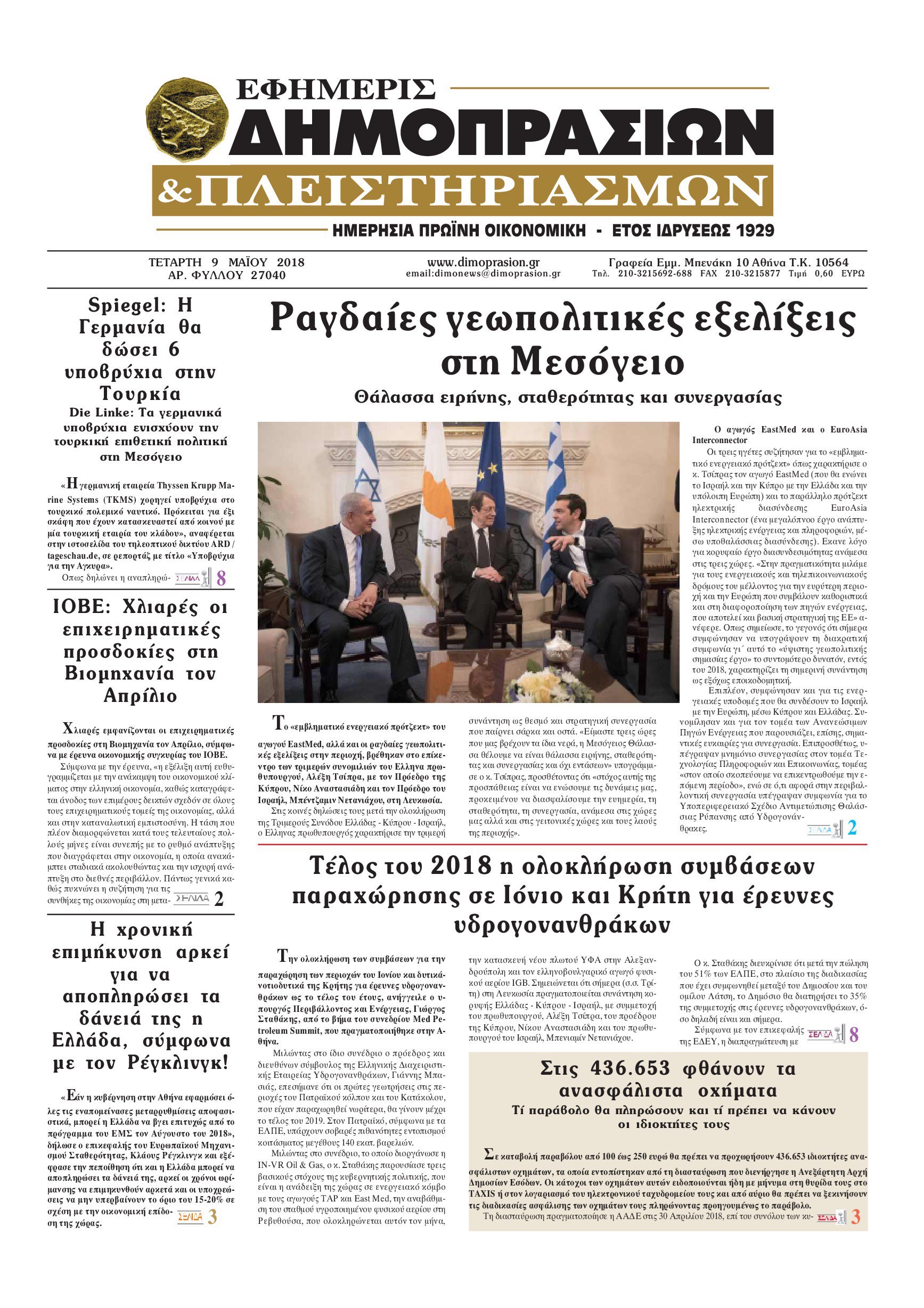 Οι οικονομικές εφημερίδες 9/5/2018 Enikos Newsroom 07:50, Τετάρτη 09 Μαΐου 2018 Media Διαβάστε τα σημερινά πρωτοσέλιδα των οικονομικών εφημερίδων: ΟΙΚΟΝΟΜΙΚΕΣ ΕΦΗΜΕΡΙΔΕΣ ΠΡΩΤΟΣΕΛΙΔΑ Μοιράσου το: σχολίασε κι εσύ (0 σχόλια) Ακολουθήστε το enikos.gr στο Google News και μάθετε πρώτοι όλες τις ειδήσεις Δείτε όλες τις τελευταίες ειδήσεις από την Ελλάδα και τον Κόσμο στο enikos.gr Ειδήσεις Ροή Ειδήσεων 1 ώρα πριν Ευρωπαϊκή Ένωση: Συμφωνία για δάνειο 90 δισ. ευρώ στην Ουκρανία τη διετία 2026-2027 6 ώρες πριν ΟΠΕΚΕΠΕ: Προφυλακιστέος ο φερόμενος αρχηγός και ο λογιστής της εγκληματικής οργάνωσης 7 ώρες πριν Αυξάνουν την πίεση προς την κυβέρνηση οι αγρότες: Κλείνουν παρακαμπτήριους και ανοίγουν διόδια – Τι θα γίνει τις γιορτές 7 ώρες πριν Φοινικούντα: Το Σάββατο απολογείται ο 30χρονος γιος γνωστού επιχειρηματία της Πλάκας που παραδόθηκε – Όσα είπε στους αστυνομικούς και ο ρόλος του στο έγκλημα 5 ώρες πριν ΑΕΚ – Κραϊόβα 3-2: Επική ανατροπή και πρόκριση στους «16» του Conference League η Ένωση 6 ώρες πριν Αρχαιολόγοι ανακάλυψαν ρωμαϊκά τεχνουργήματα από μια πόλη που δεν υπήρξε ποτέ – Τα τρία εντυπωσιακά κτίρια και ο αμφορέας με τις… σαρδέλες 7 ώρες πριν Ύπνος: Η απλή βραδινή ρουτίνα για να προστατεύσετε τα μαλλιά σας από το κρύο κατά τη διάρκεια του χειμώνα 8 ώρες πριν Manifesting: Πώς να συναντήσετε τον σύντροφο της ζωής σας, ανάλογα με τον μήνα γέννησής σας 2 ημέρες πριν 20 χρόνια τα Χριστούγεννα ξεκινούν στα Public με μεγάλη ποικιλία σε δώρα! 1 λεπτό πριν Εφημερεύοντα φαρμακεία σε Αθήνα και Θεσσαλονίκη (19/12) 8 λεπτά πριν Η TikTok στις ΗΠΑ πωλείται σε Oracle, Silver Lake και MGX – Οι λεπτομέρειες του «deal» 16 λεπτά πριν Αλεξάντερ Λουκασένκο: Η Λευκορωσία βρίσκεται κοντά στην αποκατάσταση των σχέσεών της με τις ΗΠΑ 31 λεπτά πριν Αυστραλία: Κήρυξε την Κυριακή (21/12) ημέρα εθνικού πένθους για τη φονική επίθεση στην παραλία Μπόνταϊ 41 λεπτά πριν Ρόδος: Δάσκαλος καράτε καταδικάστηκε για ασέλγεια σε ανήλικες αθλήτριες – Μαρτυρίες για αγγίγματα σε ευαίσθητα σημεία ENIKOS NETWORK Σε περίοδο αυξημένης δραστηριότητας η γρίπη στην Ελλάδα-Μέτρα προστασίας από τον ΕΟΔΥ Σκέφτεστε συνέχεια συζητήσεις που έχετε κάνει; Τι σημαίνει αυτό, σύμφωνα με ειδικό Στεγαστικό: Τι λέει η ΠΟΜΙΔΑ για τα νέα μέτρα που ανακοίνωσε ο Κυριάκος Μητσοτάκης Λαγκάρντ: Αισιόδοξη για την ανάπτυξη της Ευρωζώνης, αβέβαιη για τον πληθωρισμό Χαρτογραφώντας το «σημείο χωρίς επιστροφή»: Για πρώτη φορά αποκαλύπτεται με λεπτομέρεια το ακανθώδες όριο της ατμόσφαιρας τ... Η Google καταργεί τη λειτουργία «dark web report» – Πώς θα μπορούν οι χρήστες να διαγράφουν τα δεδομένα τους περισσότερα 02:50 , Παρασκευή 19 Δεκεμβρίου 2025 GNTM: «Κλείδωσαν» οι τέσσερις φιναλίστ – Μεγάλη ανατροπή στις τελευταίες αποχωρήσεις Για προτελευταία φορά εμφανίστηκαν στο πλατό του GNTM οι φιναλίστ του φετινού κύκλου, το βράδυ... 17:45 , Πέμπτη 18 Δεκεμβρίου 2025 ROUK ZOUK: Εορταστικό επεισόδιο με καλεσμένους τους πρωταγωνιστές του «Γιατί ρε πατέρα» Το Σάββατο 20 Δεκεμβρίου στις 21:00, η Ζέτα Μακρυπούλια υποδέχεται εκλεκτούς ηθοποιούς που όλο... 17:20 , Πέμπτη 18 Δεκεμβρίου 2025 Άγιος έρωτας: Η Χριστίνα εξομολογείται στον πατέρα Νικόλαο, απόψε στις 21:00 στον Alpha Η Νότα αποφασίζει να εκδικηθεί τον Πέτρο και τον Στέφανο, για χάρη του Λούη, όμως τα πράγματα ... 16:50 , Πέμπτη 18 Δεκεμβρίου 2025 Να μ’ αγαπάς: Ζωή και Φωτεινή συμφιλιώνονται ως μάνα με κόρη, απόψε στις 20:00 Η ταυτότητα του Άγγελου αποκαλύπτεται στο νέο επεισόδιο της σειράς “Να μ’ αγαπάς... ΤΕΛ